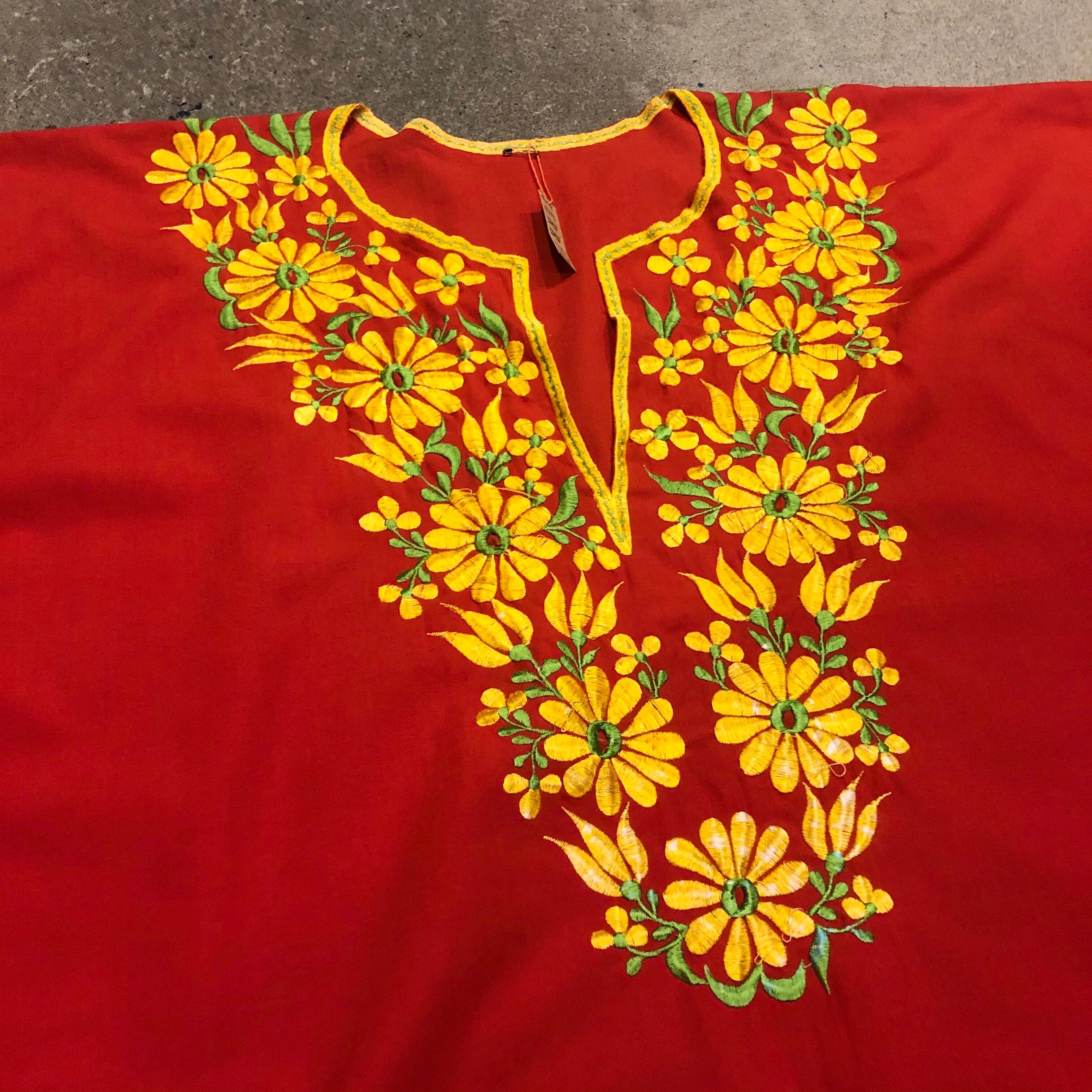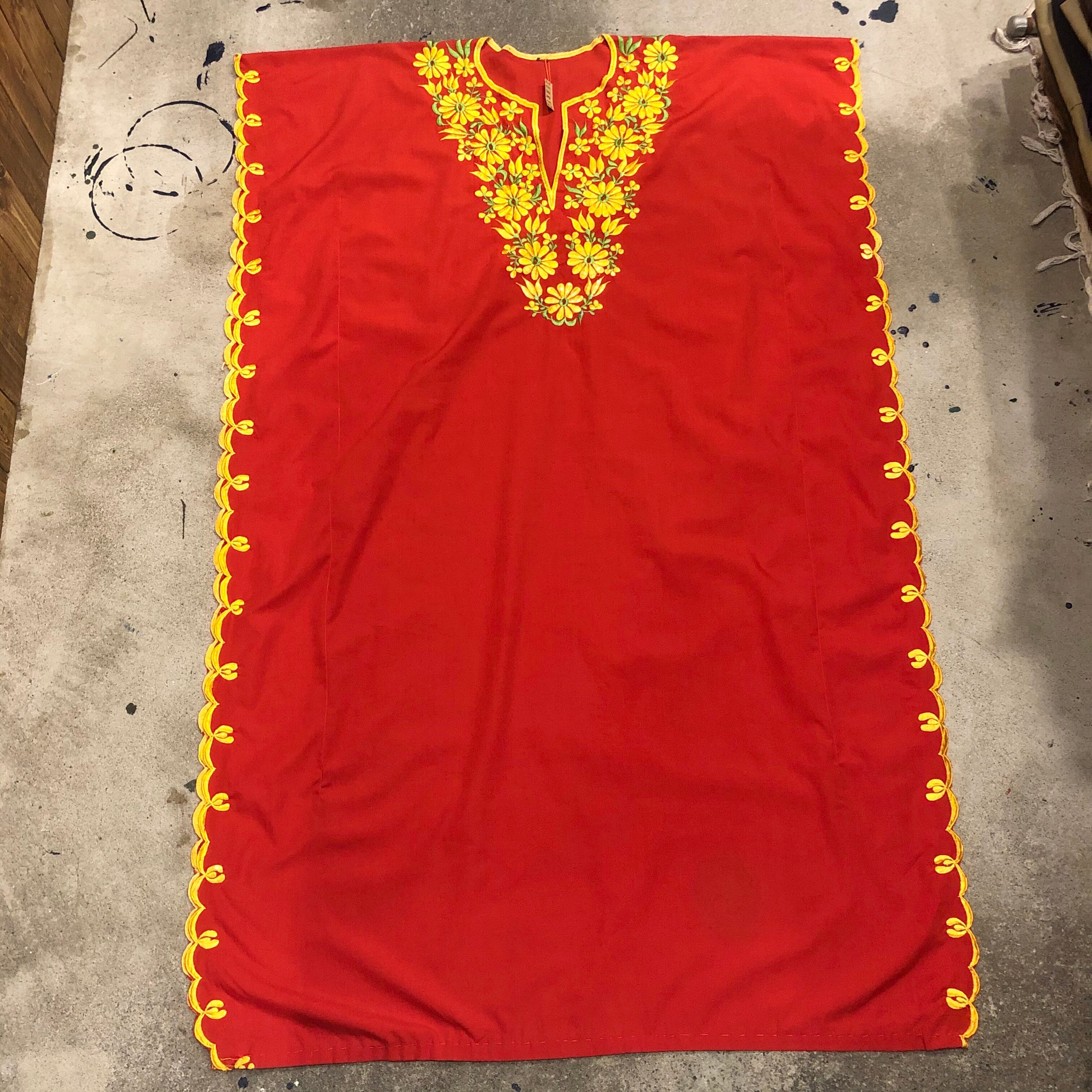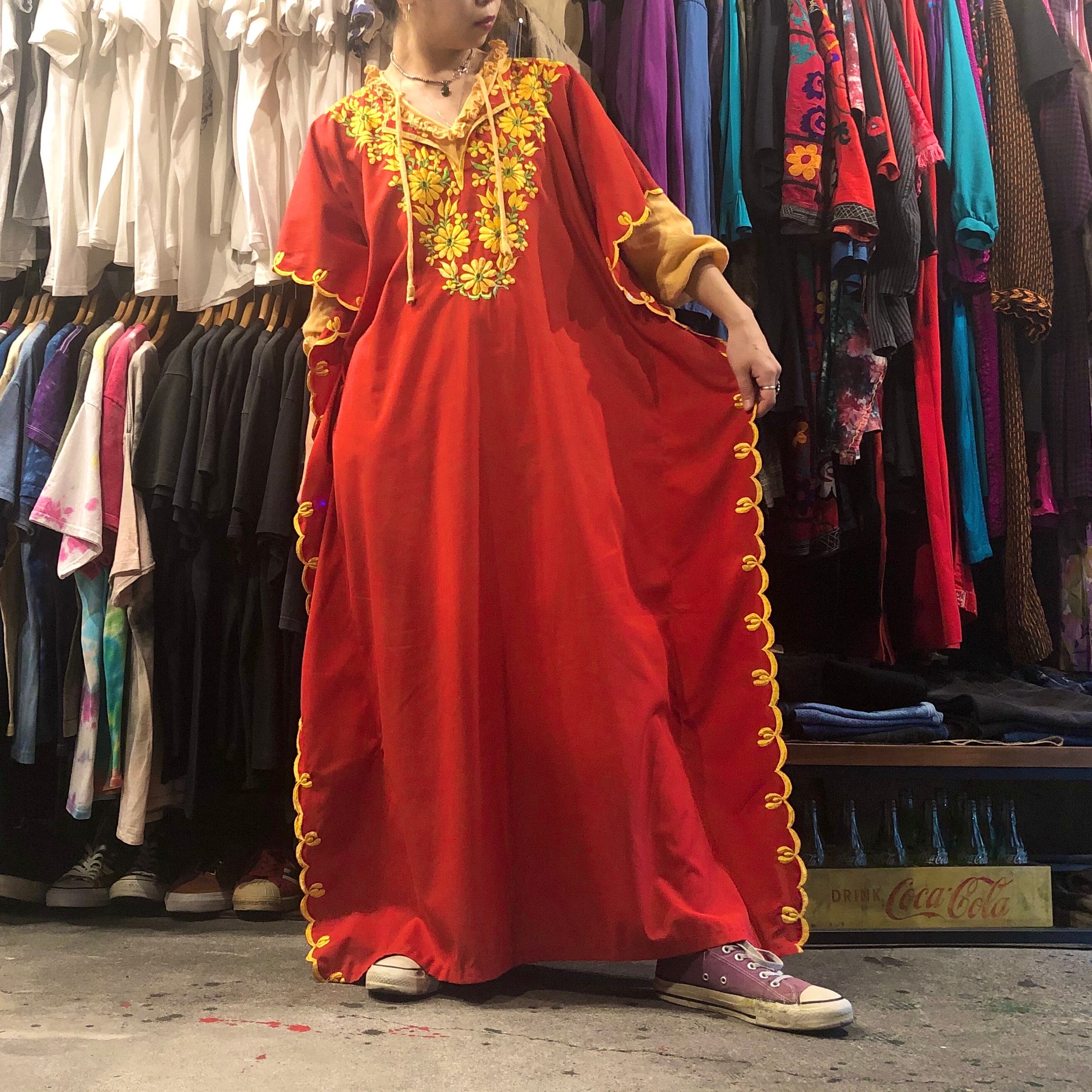 真っ赤にお花の刺繍がかわいいワンピースです。ポンチョのような作りで、脇は縫ってある感じです。サイドが刺繍でスカラップになっているところもかわいいです!夏は派手な色着たいですよね!