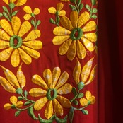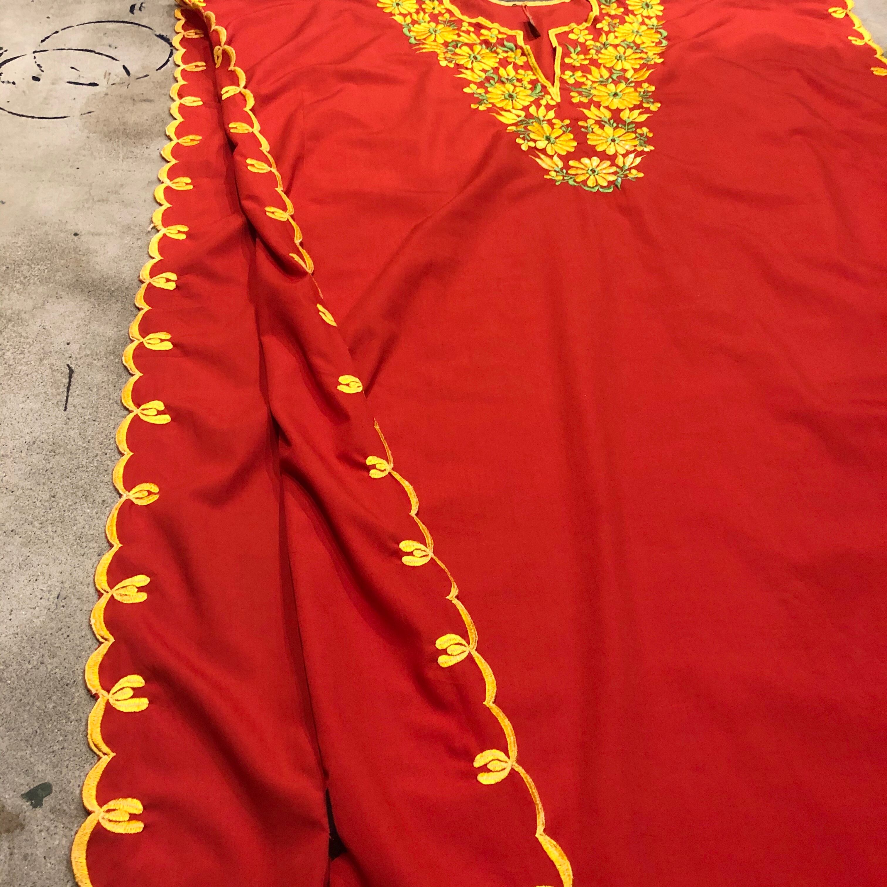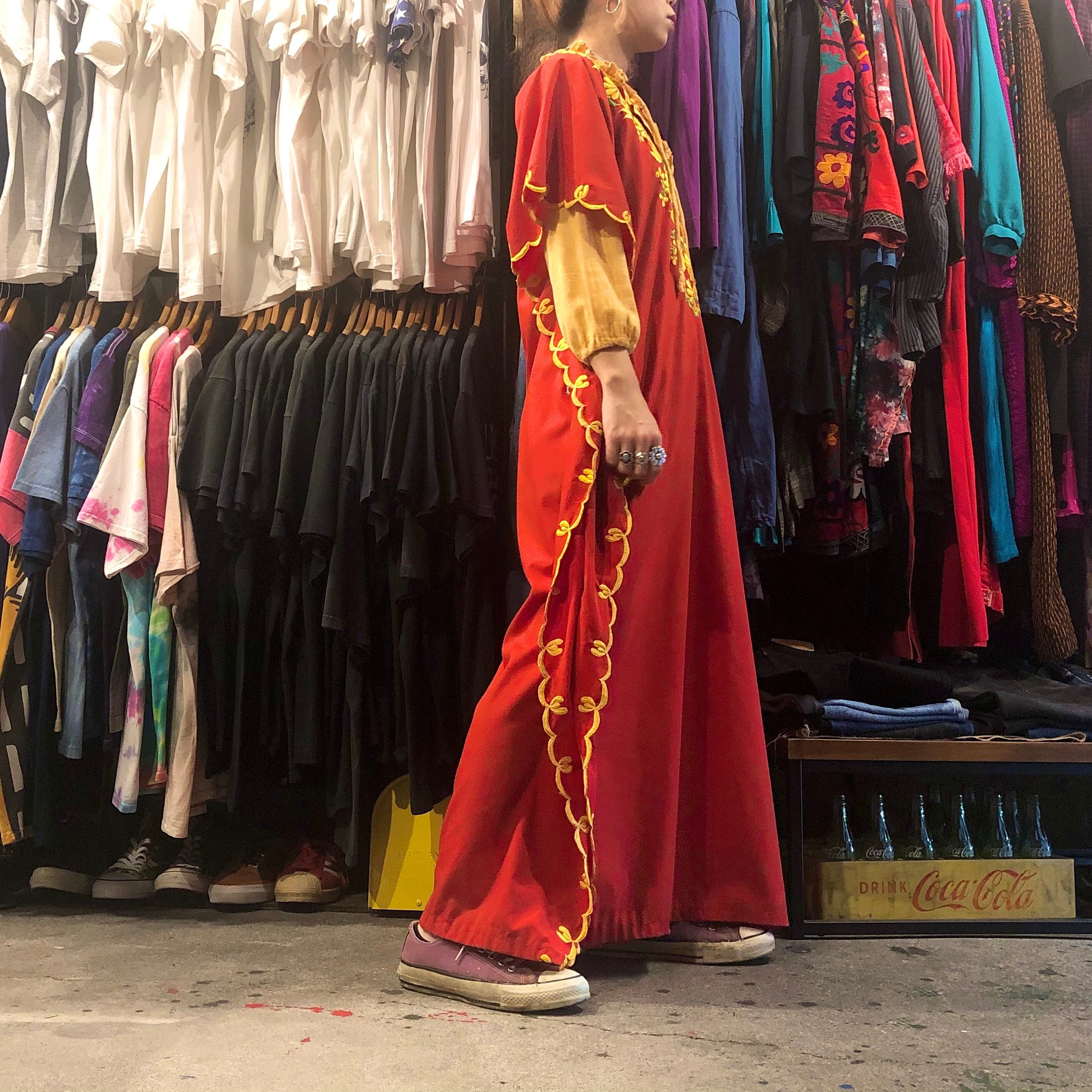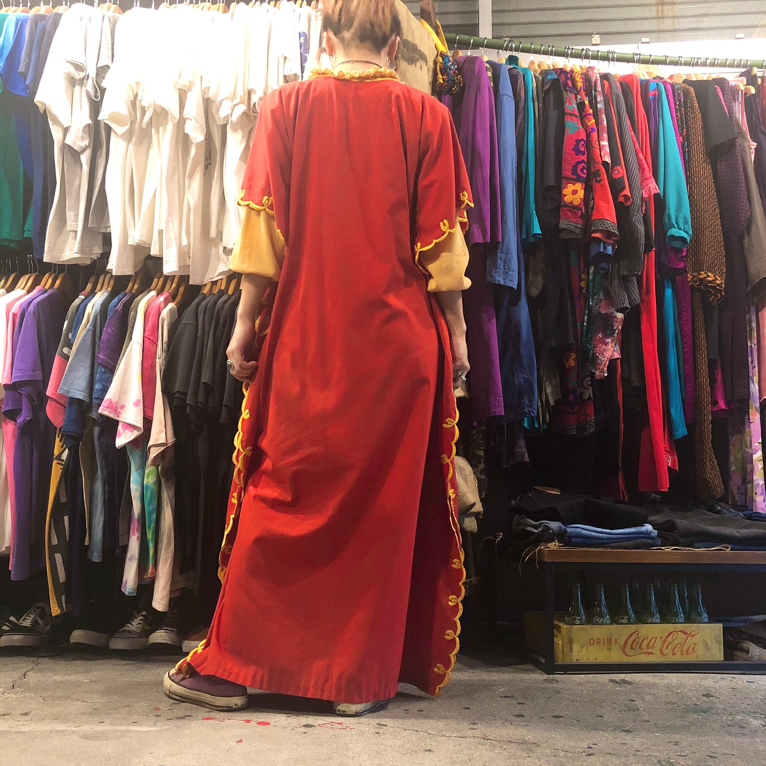 真っ赤にお花の刺繍がかわいいワンピースです。ポンチョのような作りで、脇は縫ってある感じです。サイドが刺繍でスカラップになっているところもかわいいです!夏は派手な色着たいですよね!
