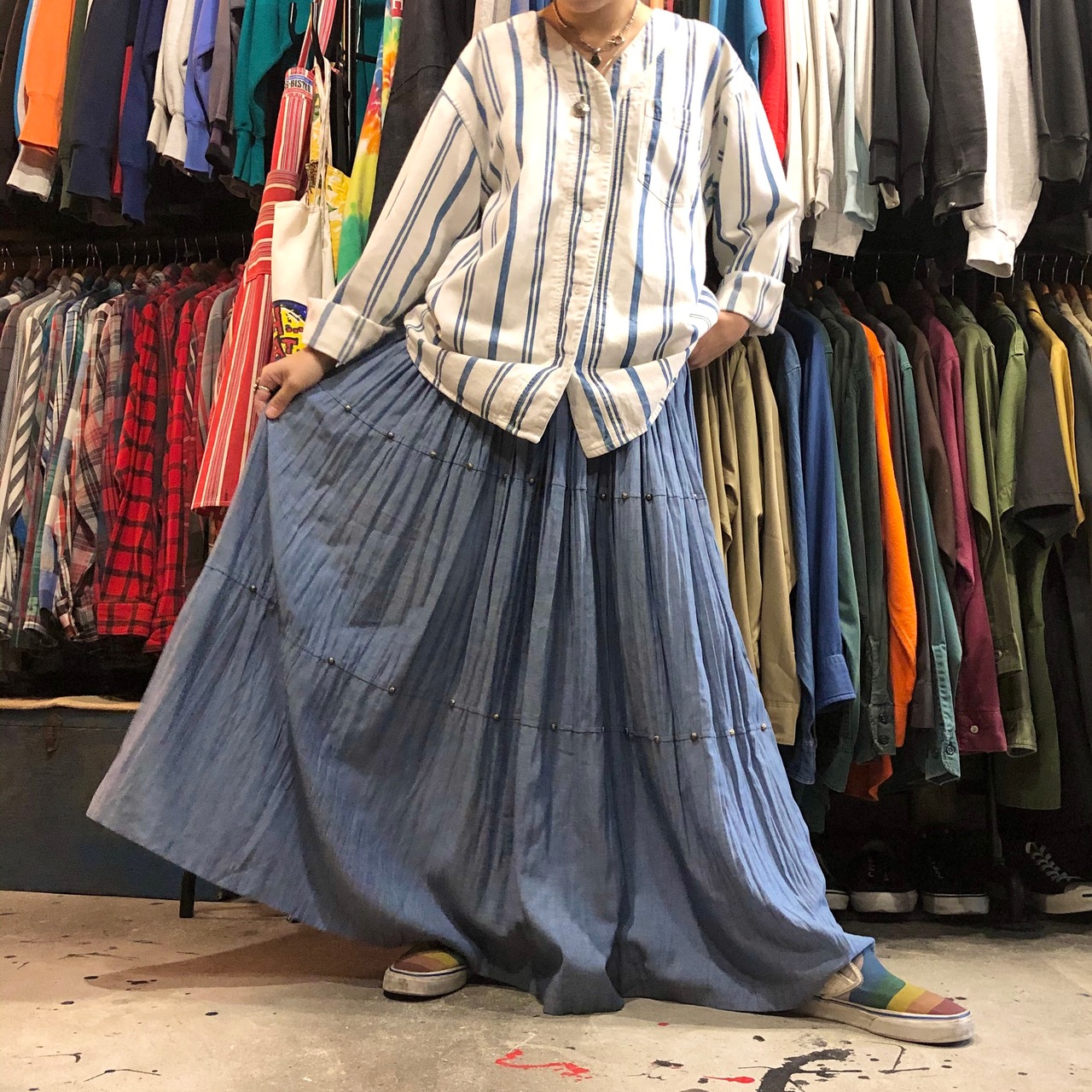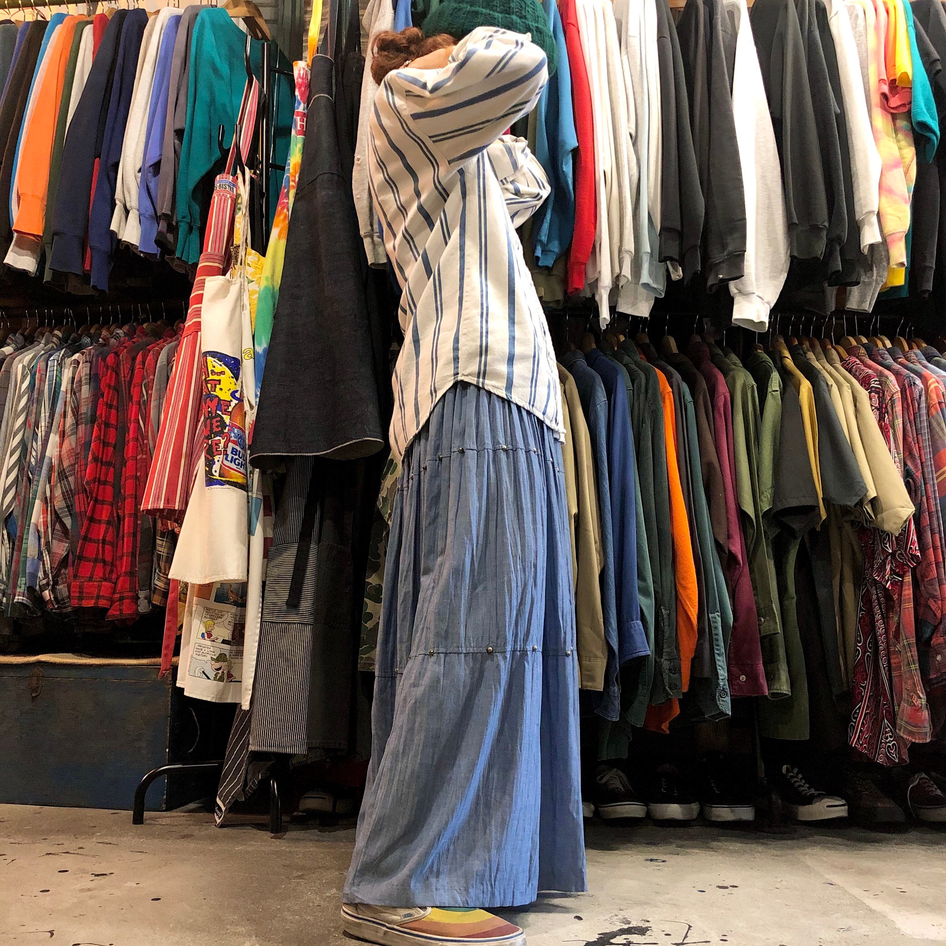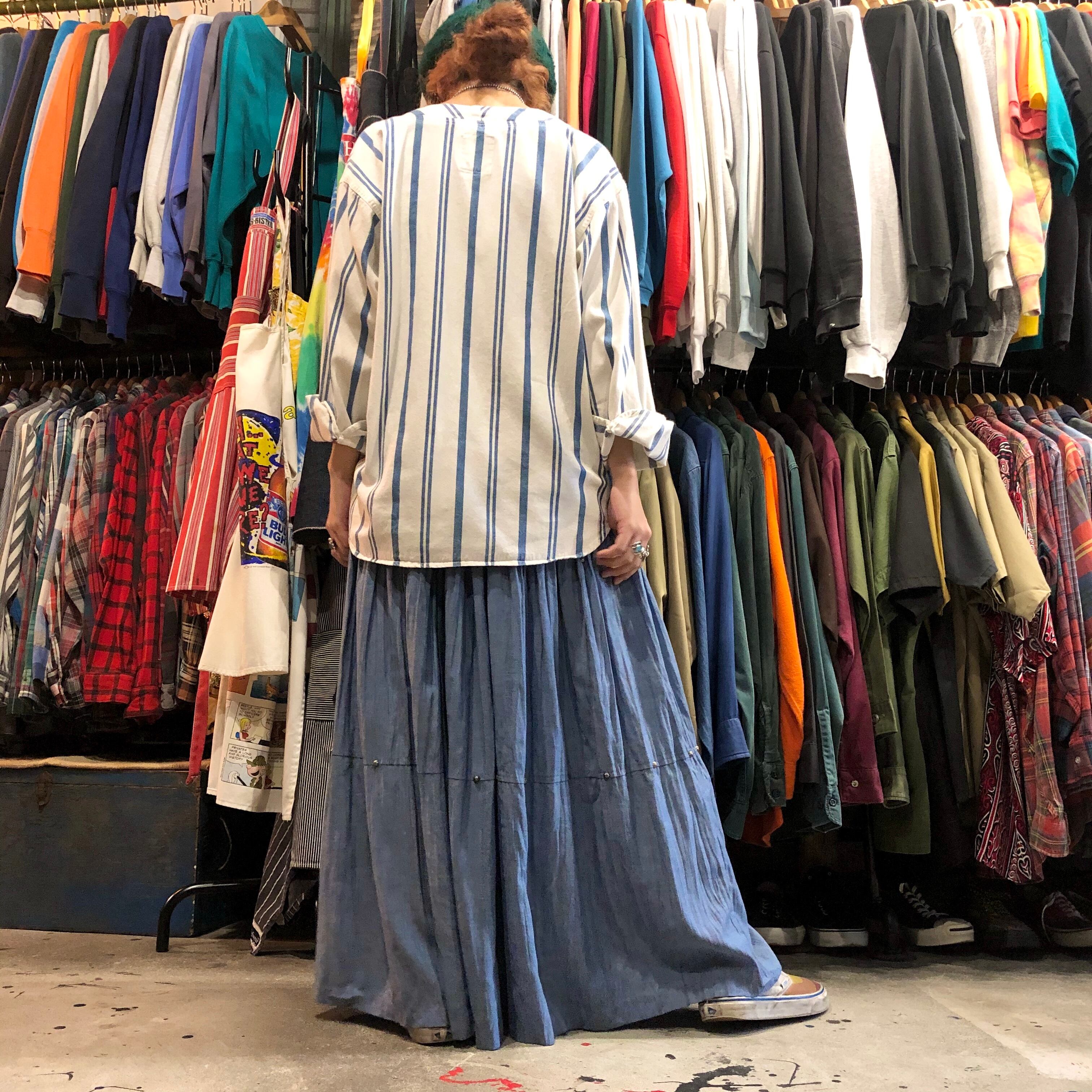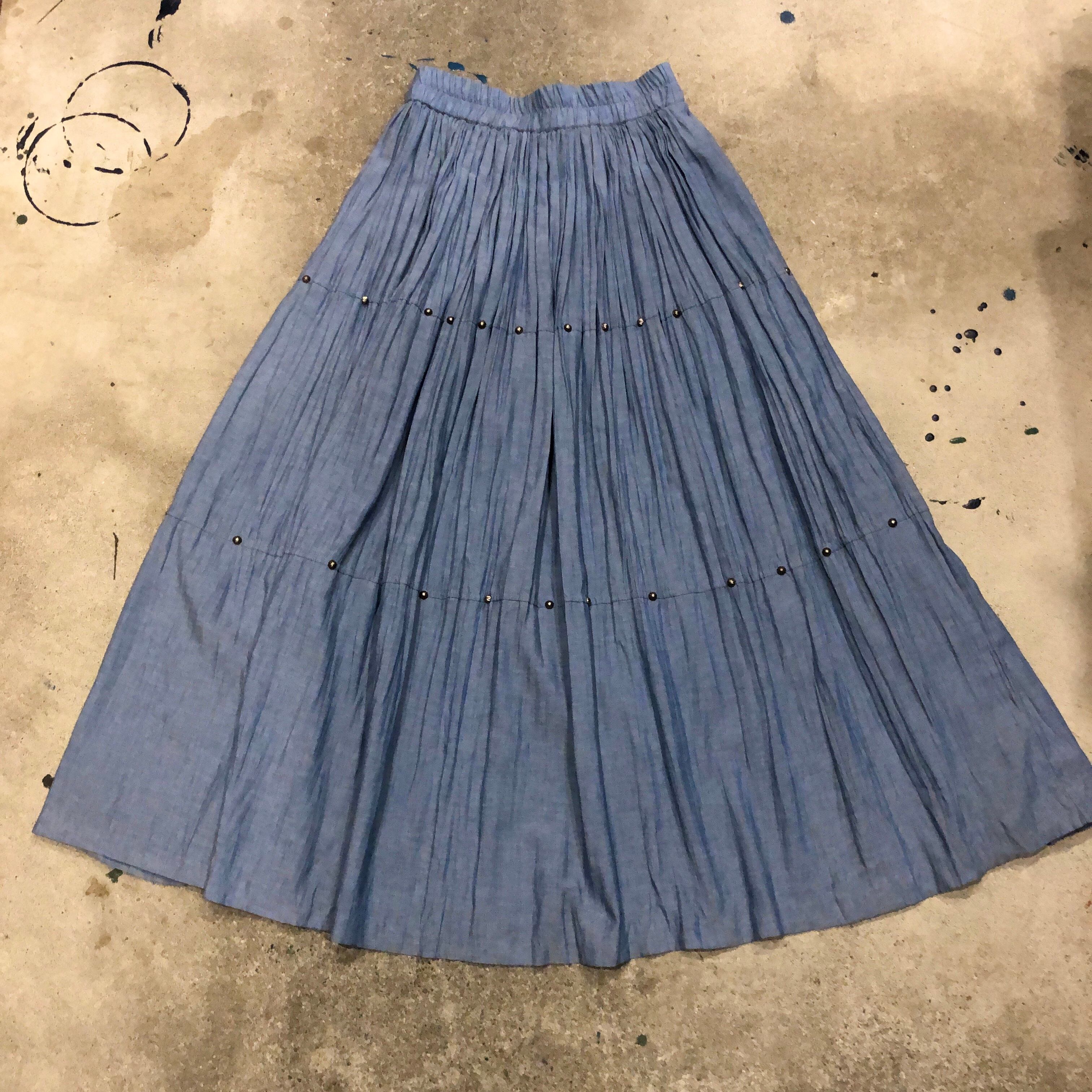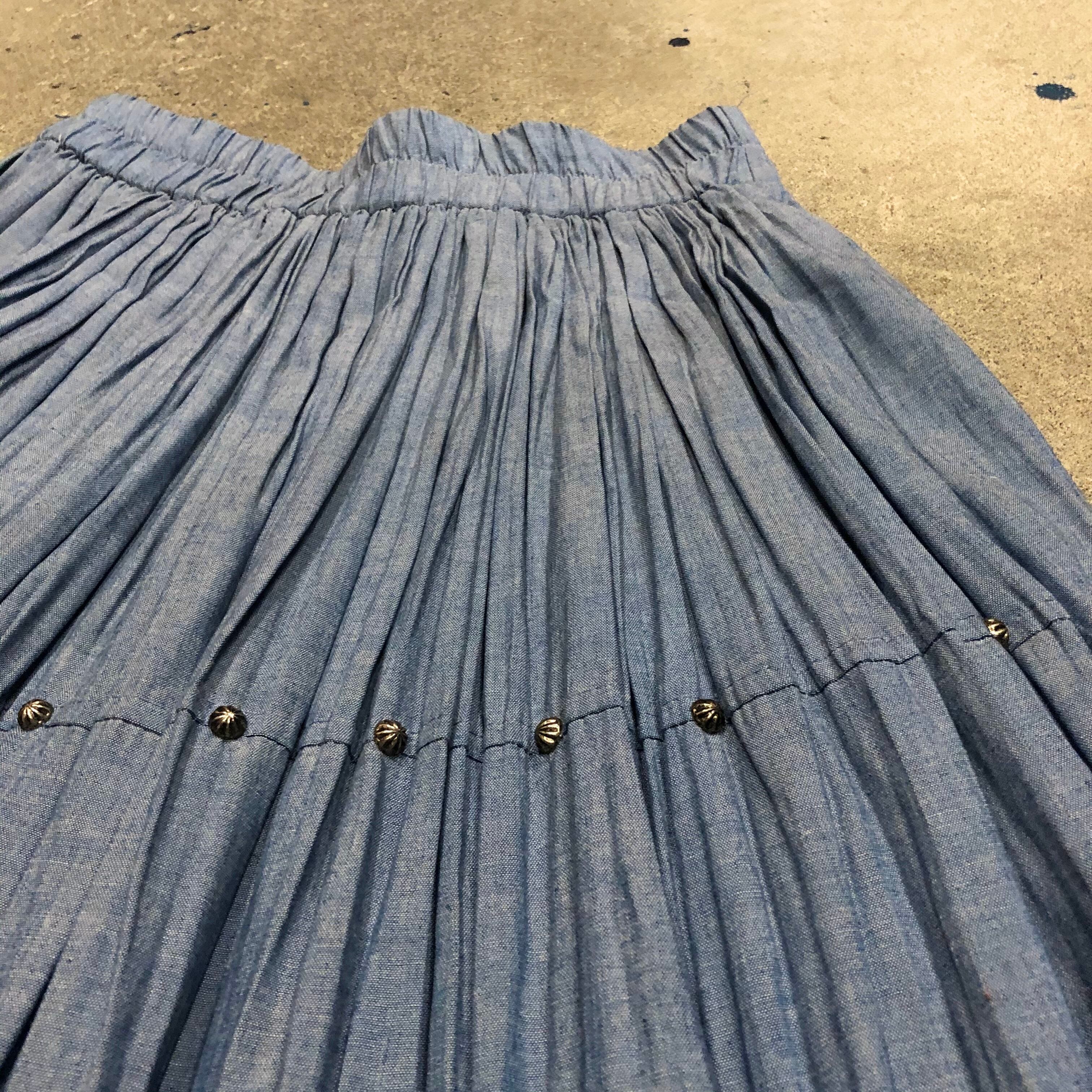 シャンブレーのような質感のレーヨン素材のスカートです。ネイティブな雰囲気のスタッズが付いていてアクセントになっています。程よいボリューム感と落ち着いた色味で合わせやすく可愛くなりすぎないので気軽に着られそうです。
