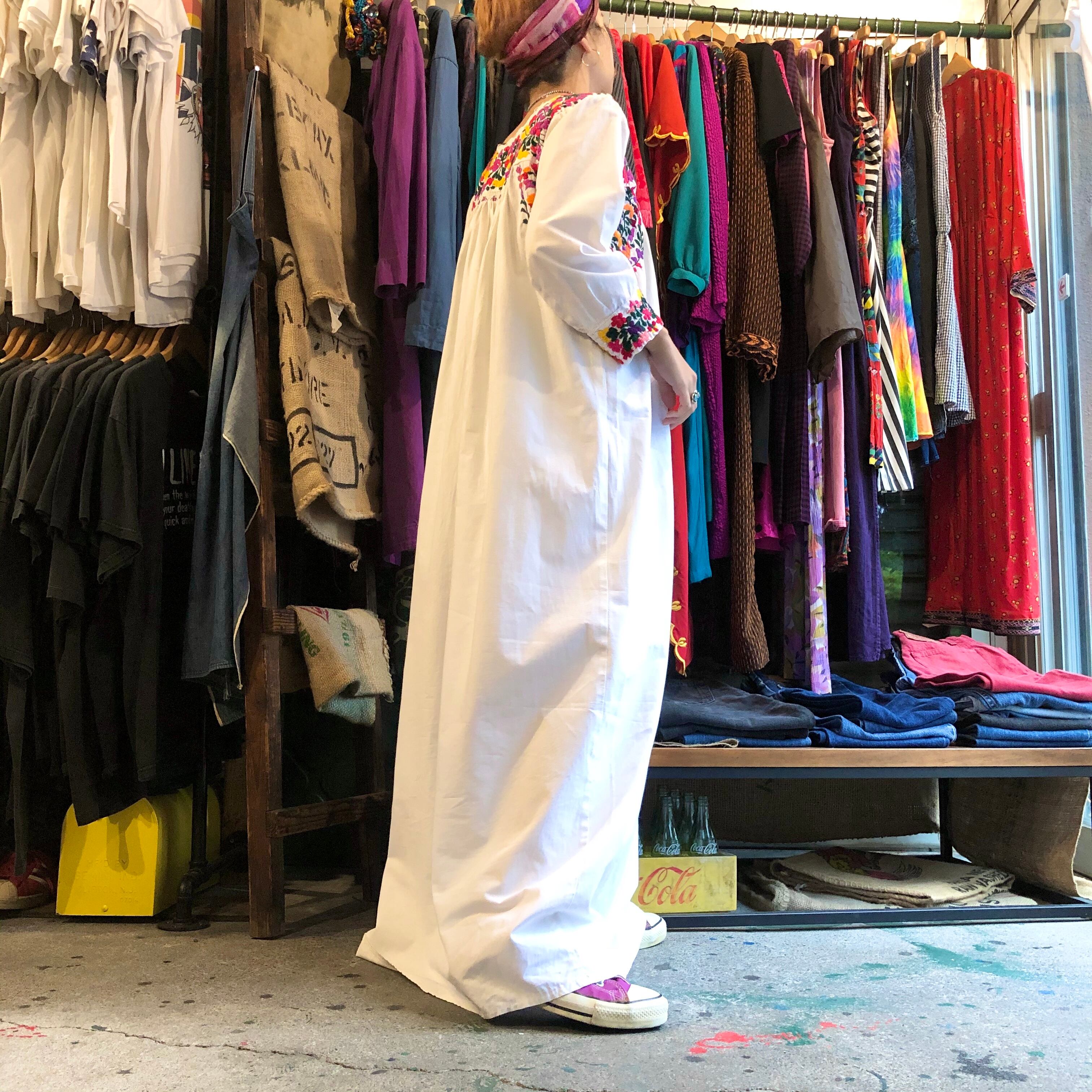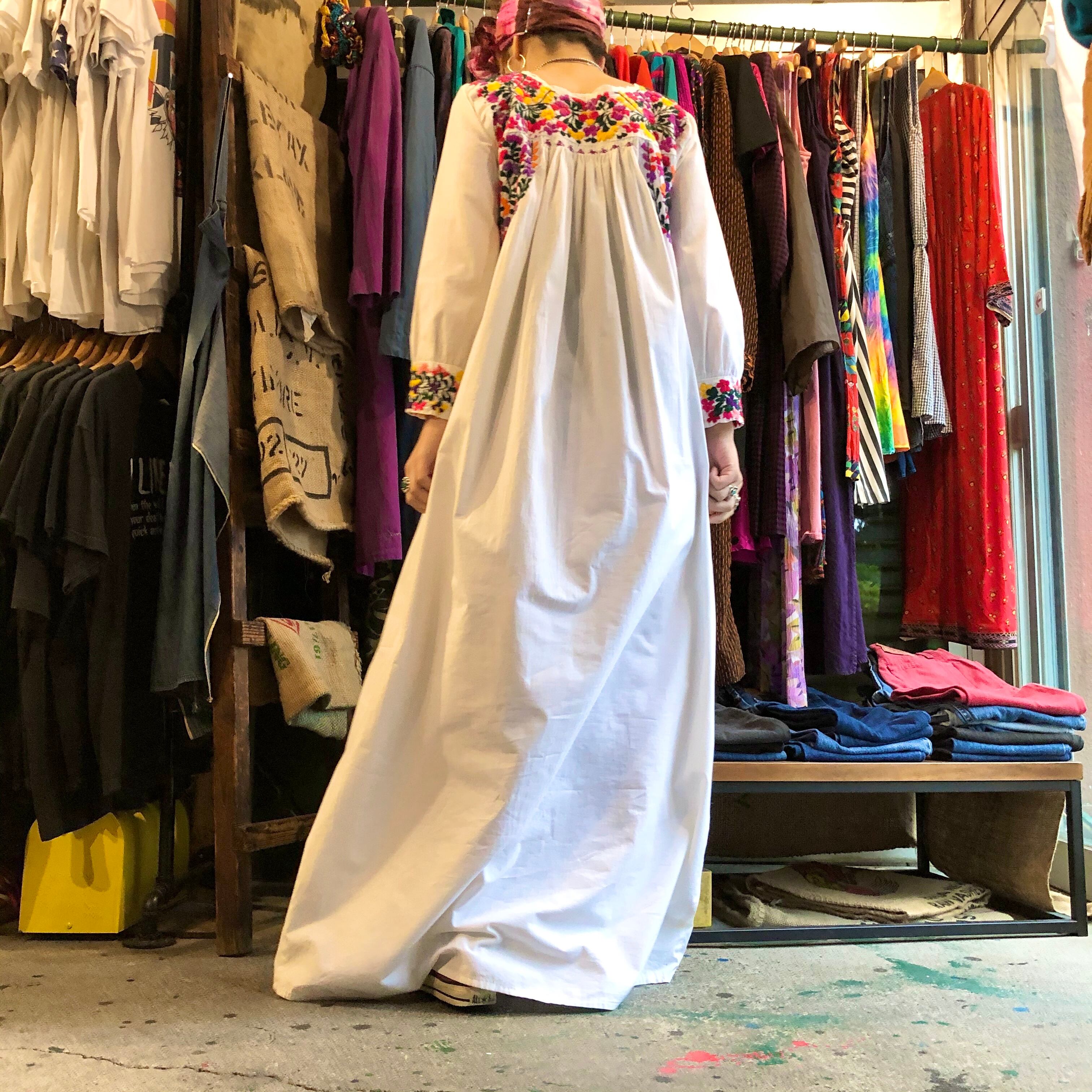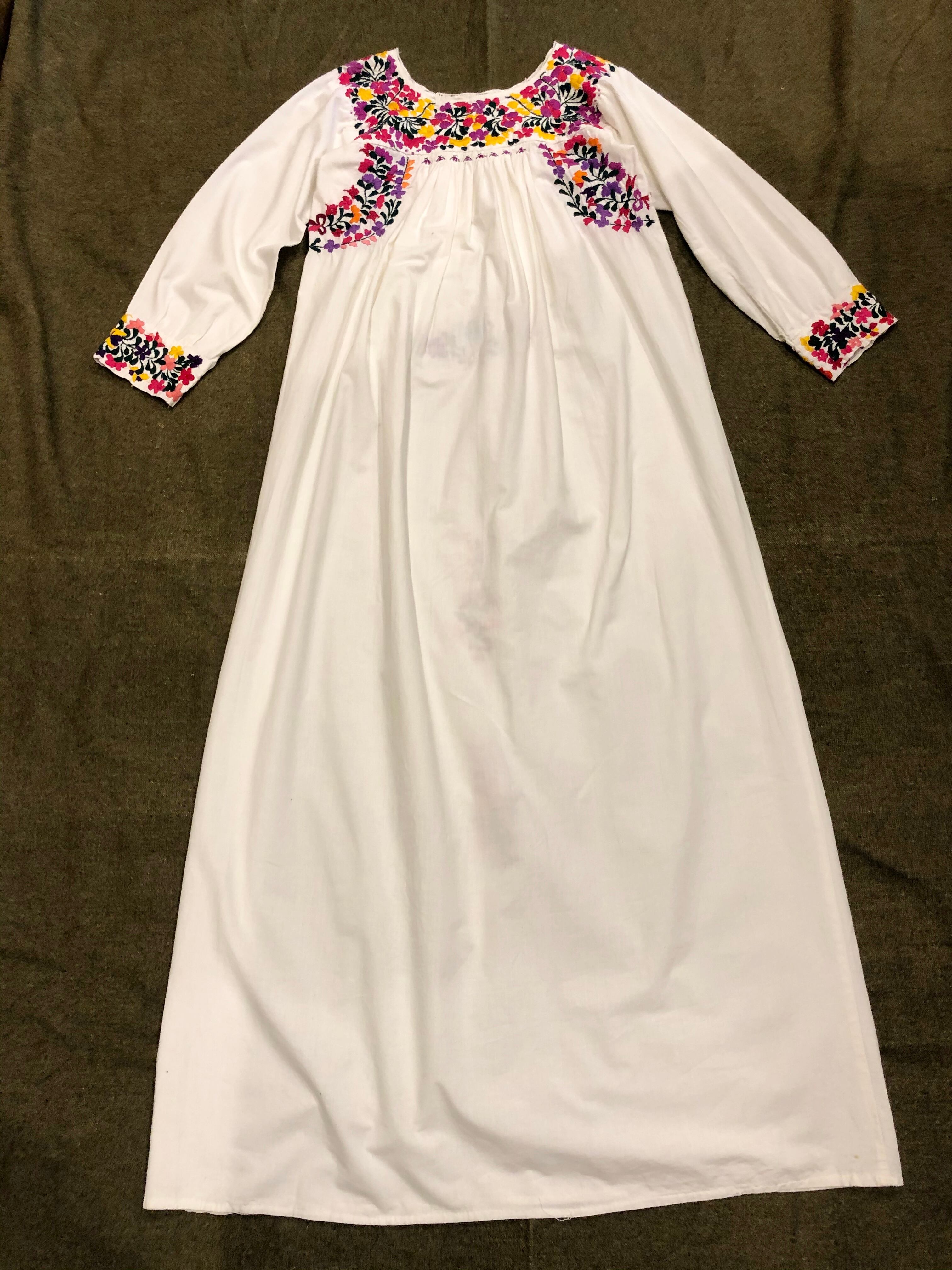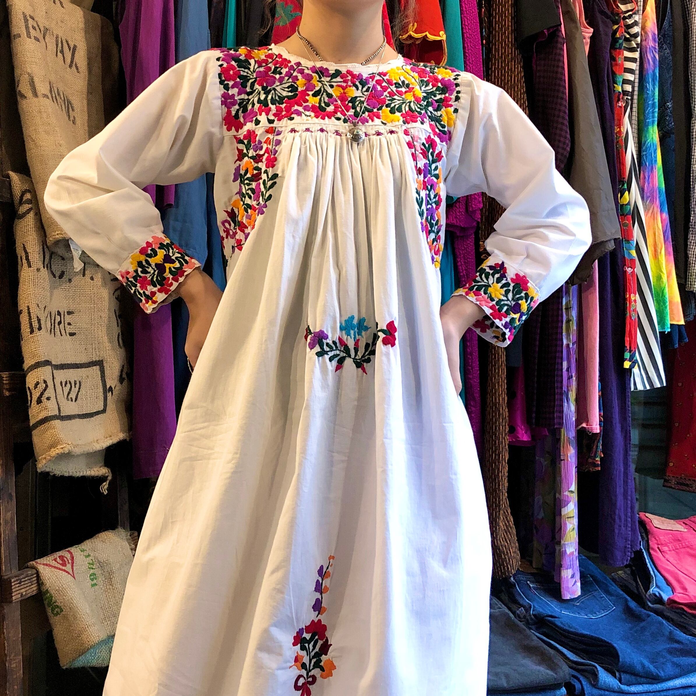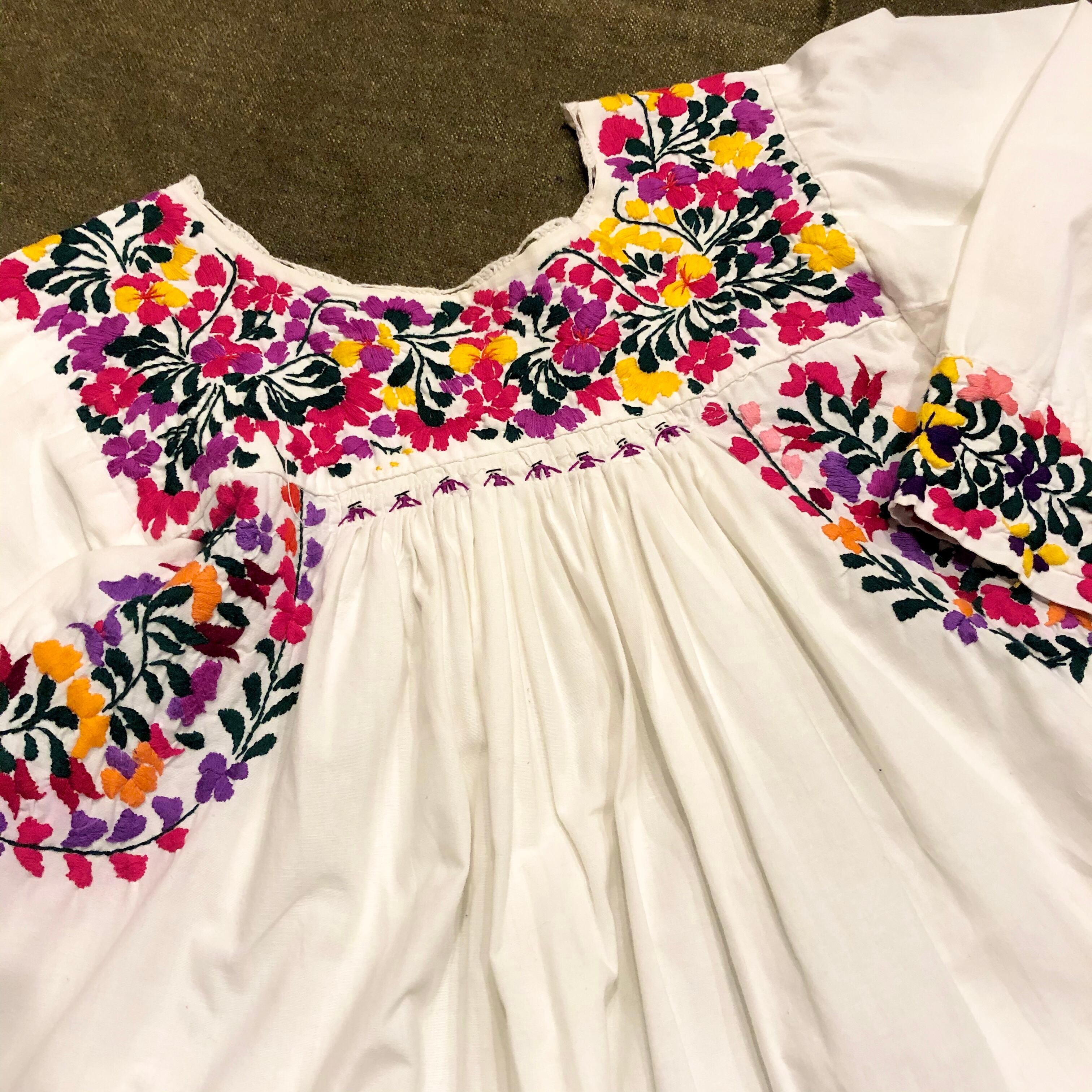 メキシコ、サンアントニーノ刺繍の長袖ワンピースです。手刺繍の美しさとバランスの良さ、胸元のギャザーなどかわいいポイントが詰まった一着です。長袖は半袖に比べると数も少なく、真っ白なのにほとんどダメージが無いのも珍しいかと思います。ジップなどは付いていないので、着脱が若干しづらい方もいらっしゃるかと思いますのでお気をつけください。