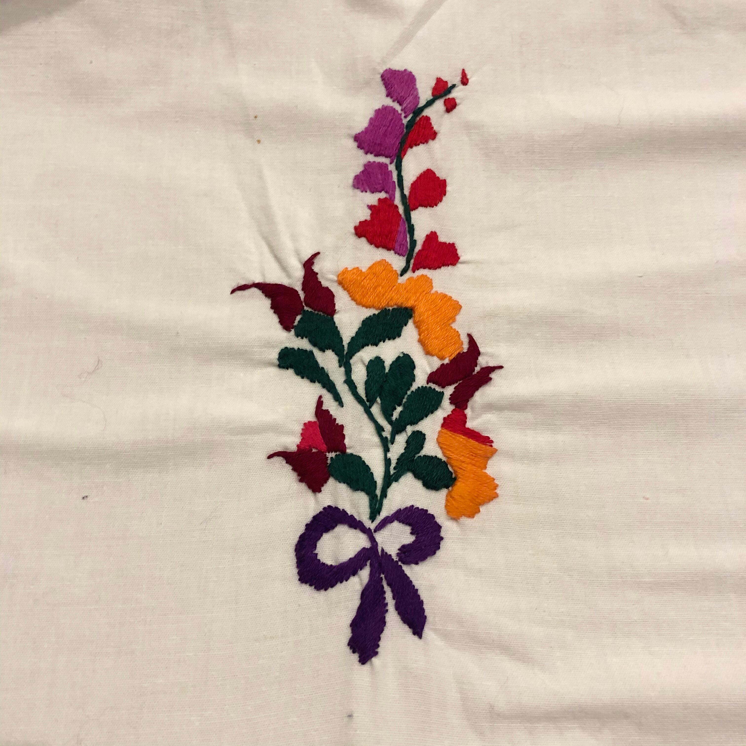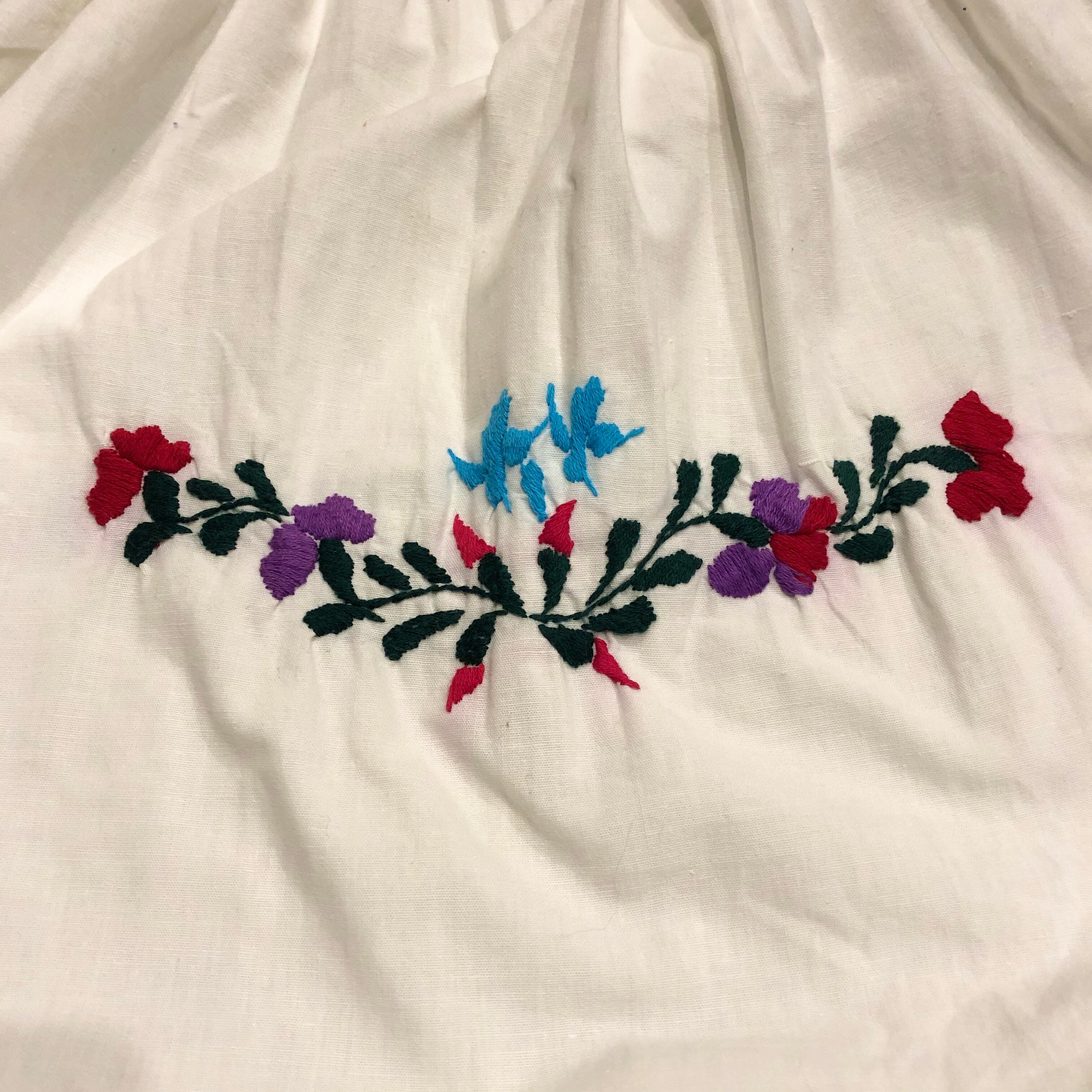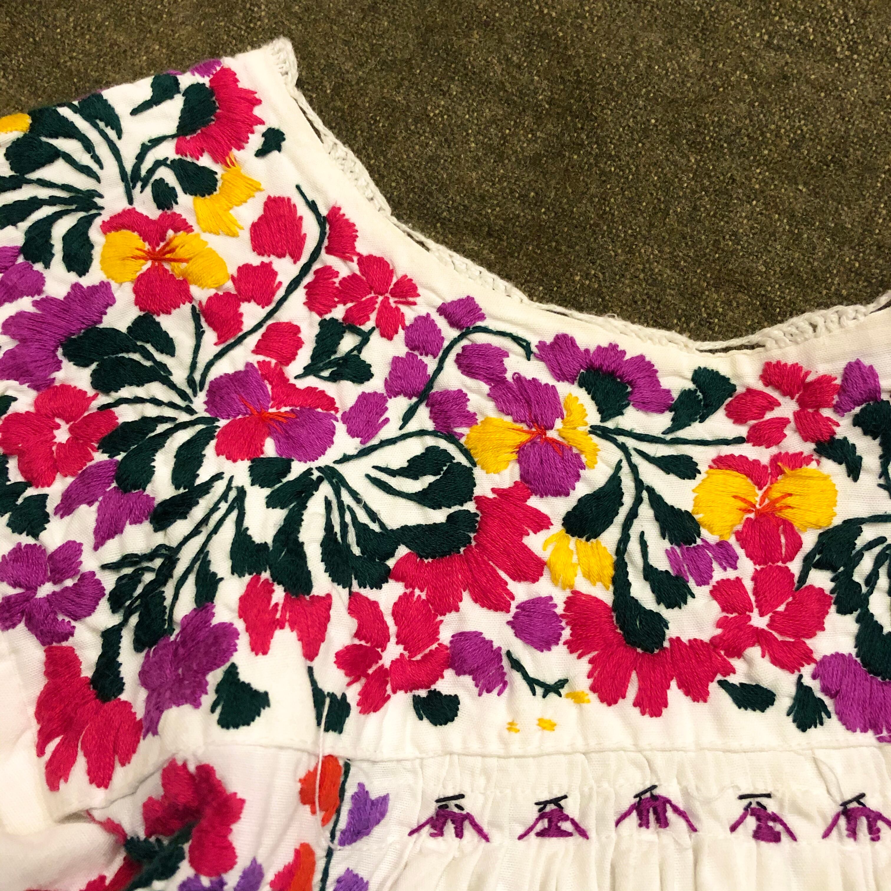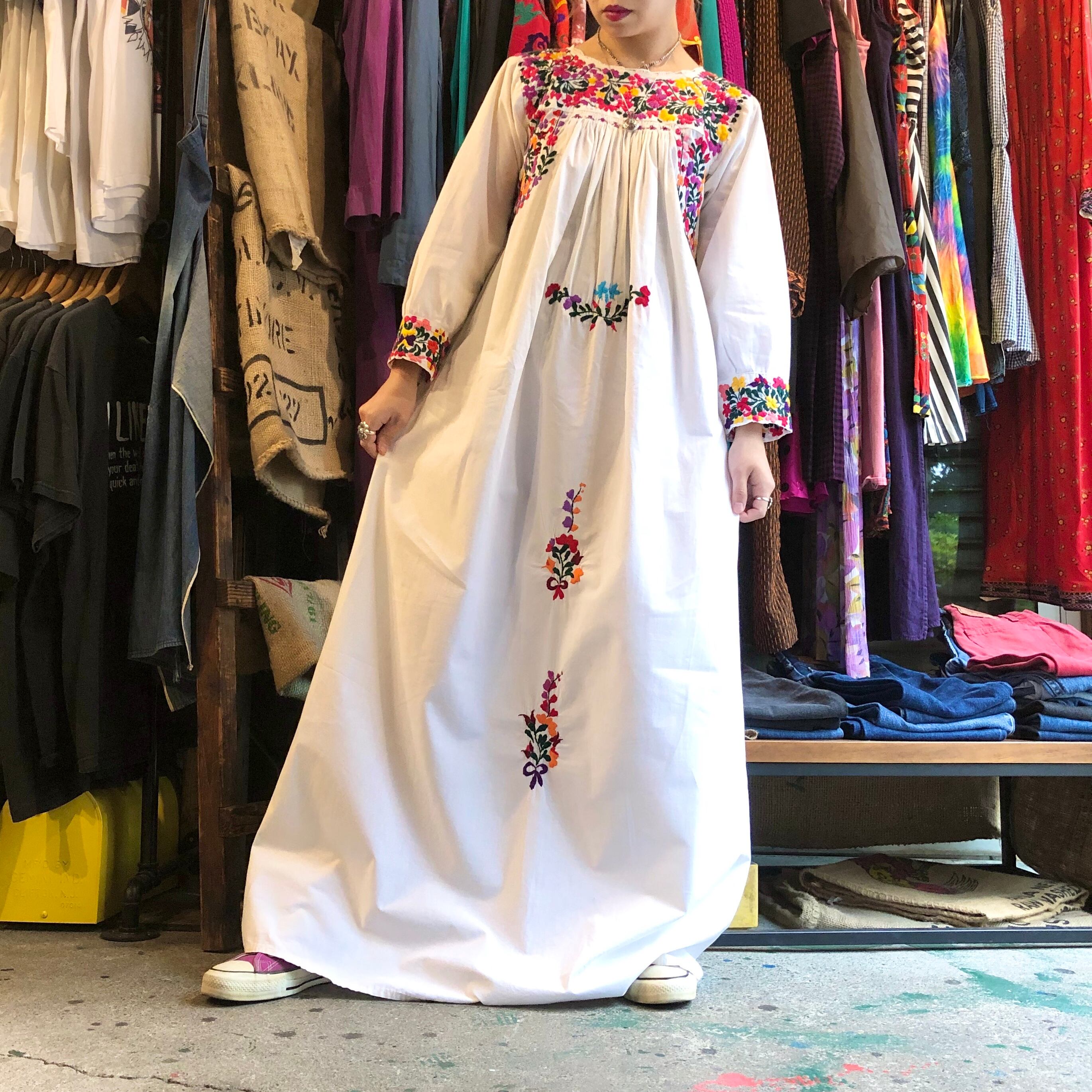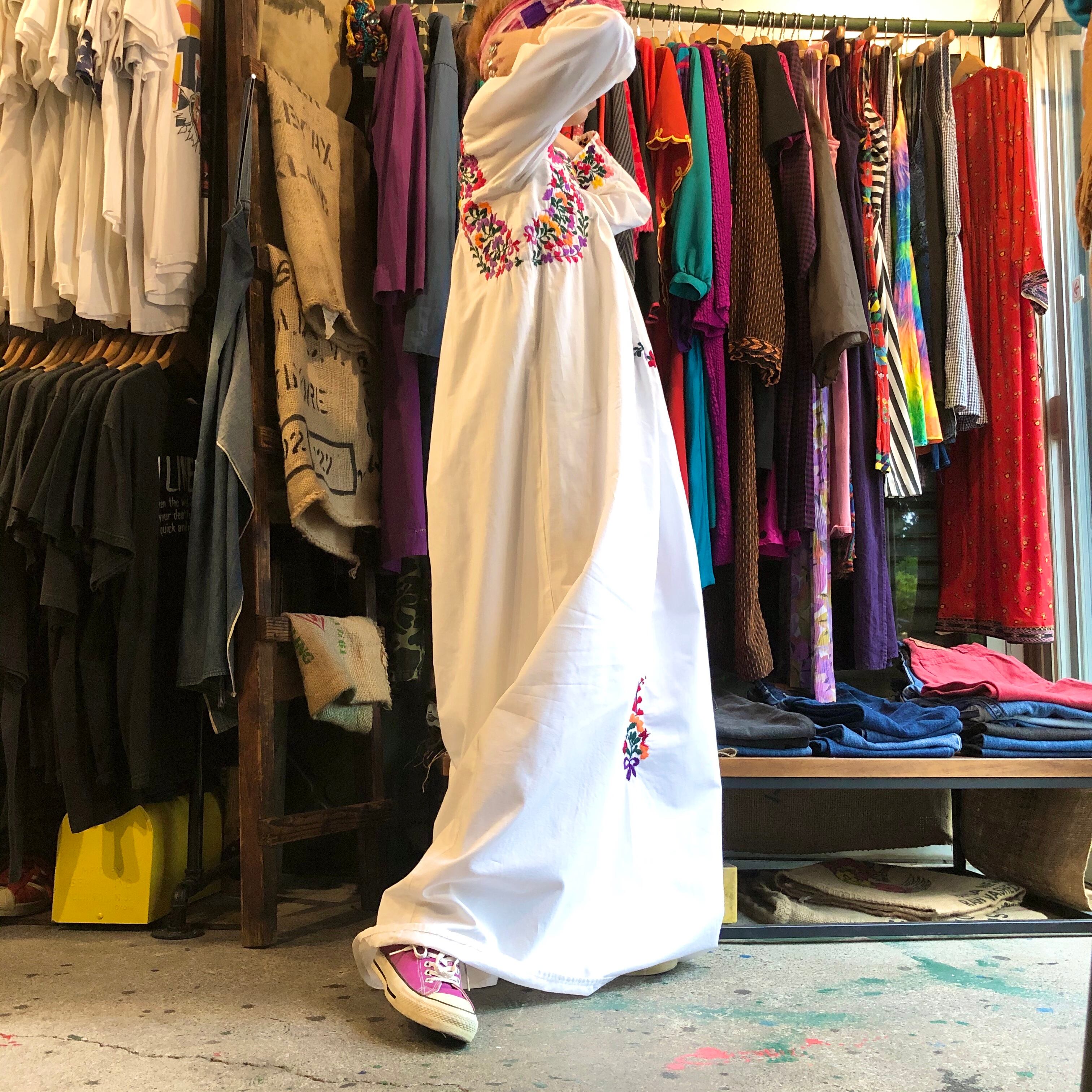 メキシコ、サンアントニーノ刺繍の長袖ワンピースです。手刺繍の美しさとバランスの良さ、胸元のギャザーなどかわいいポイントが詰まった一着です。長袖は半袖に比べると数も少なく、真っ白なのにほとんどダメージが無いのも珍しいかと思います。ジップなどは付いていないので、着脱が若干しづらい方もいらっしゃるかと思いますのでお気をつけください。
