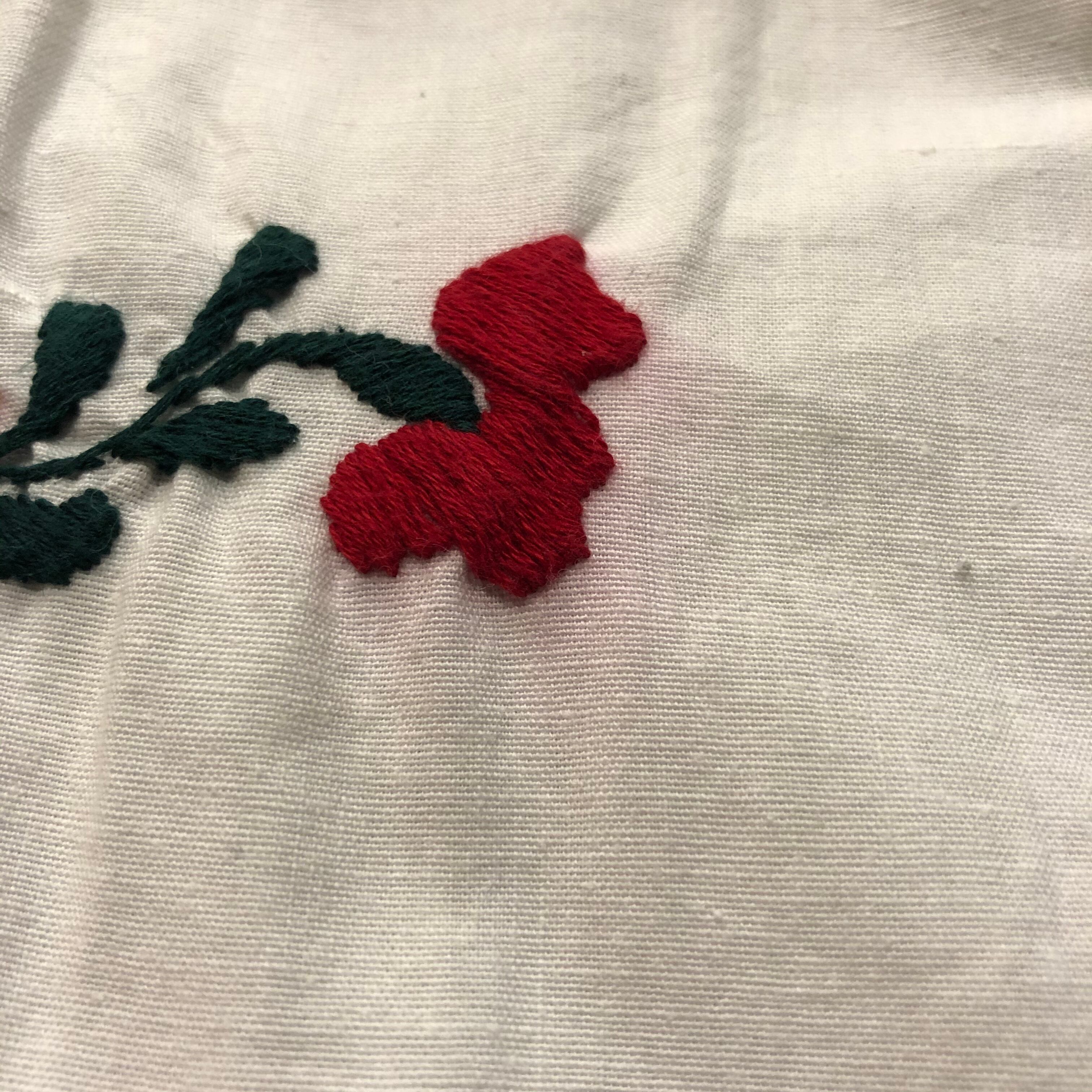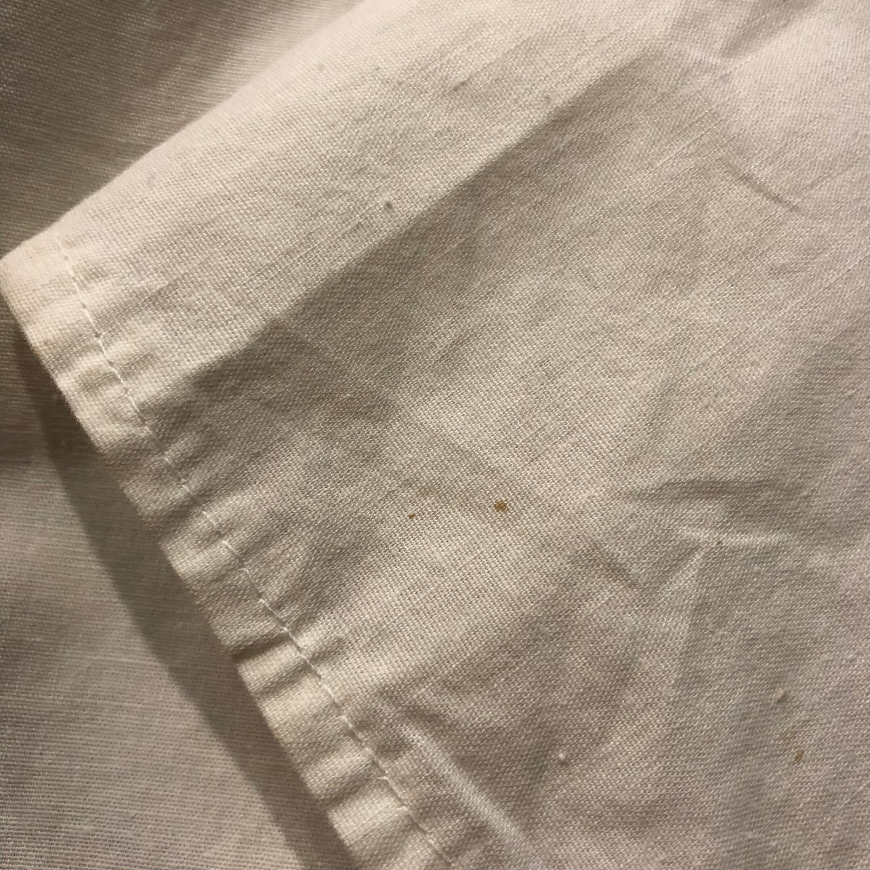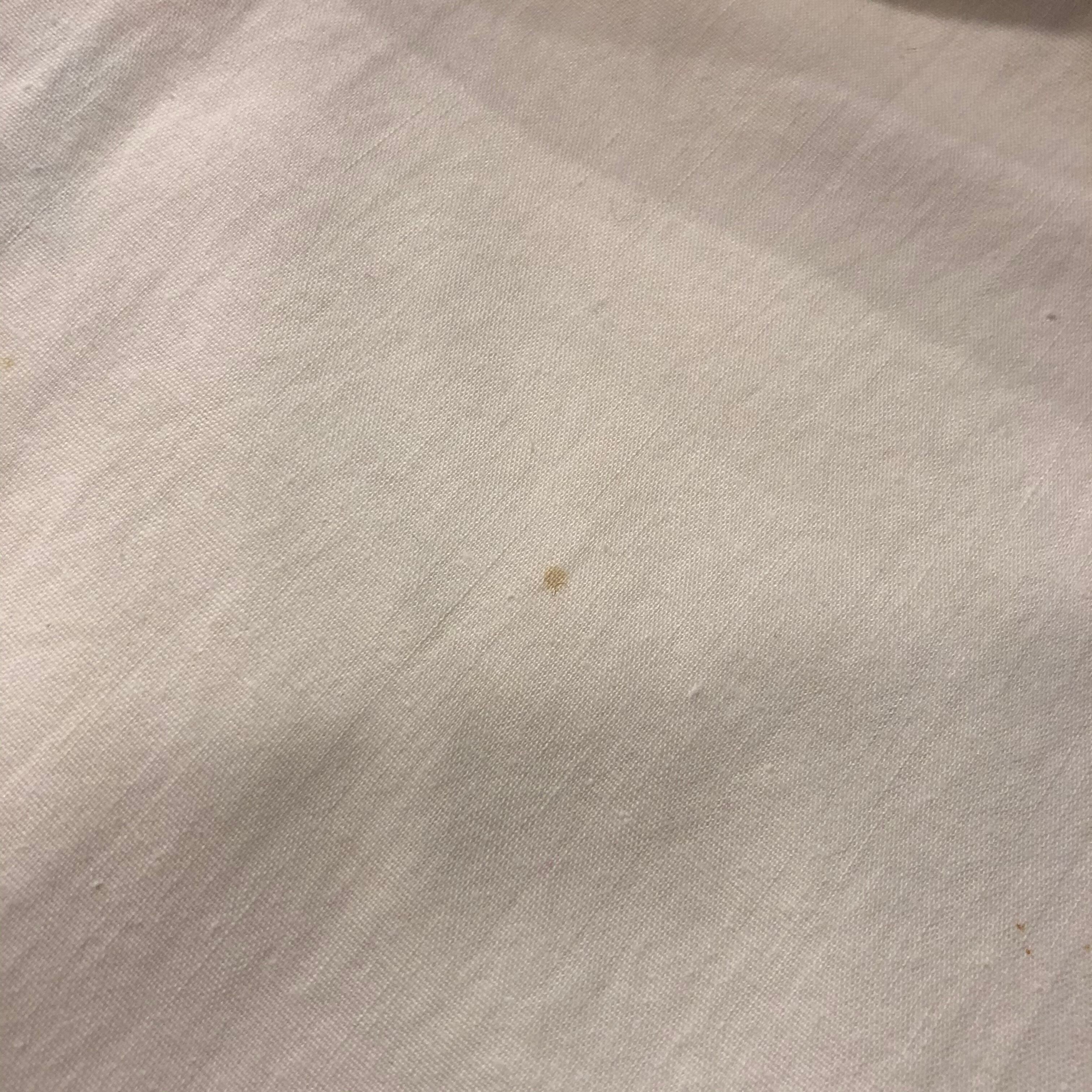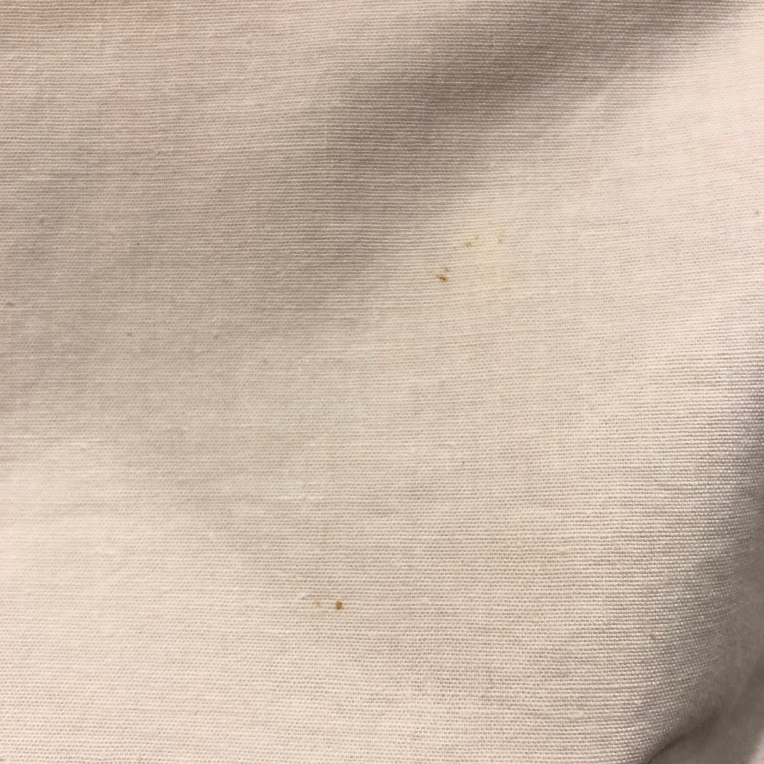 小さなシミが数カ所ありますが、よく見ないと分からない程度です。刺繍の色移りが少し見られるところがあります。