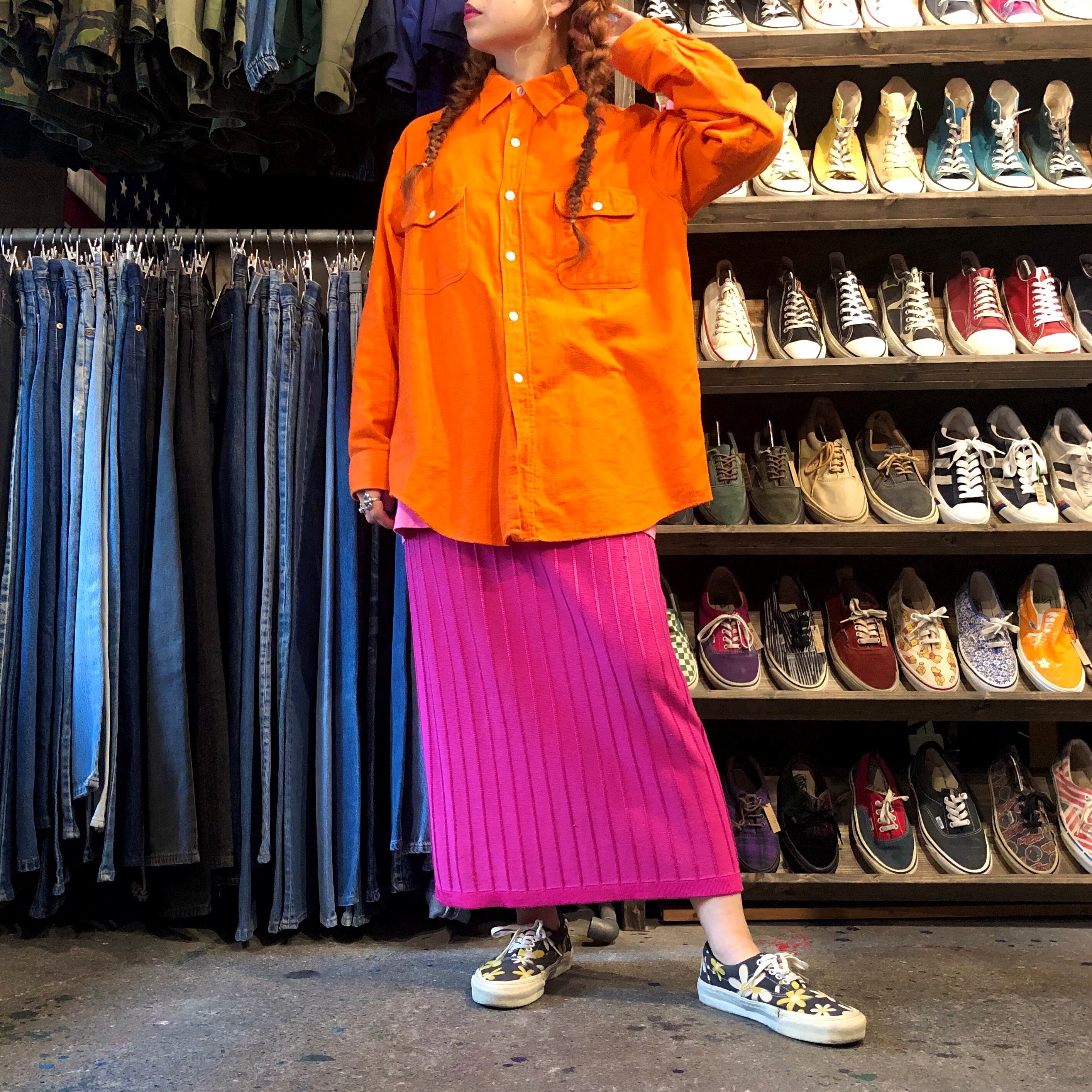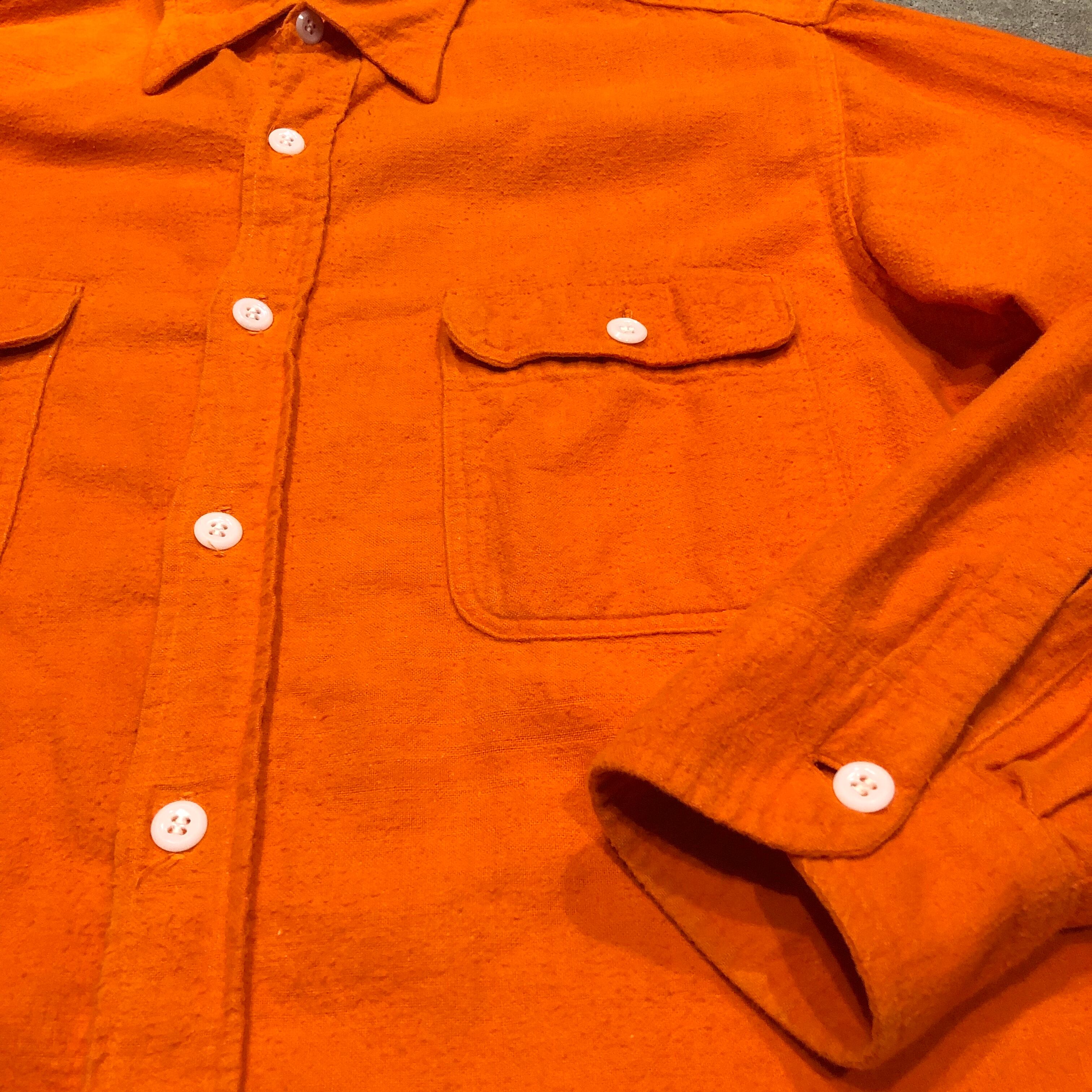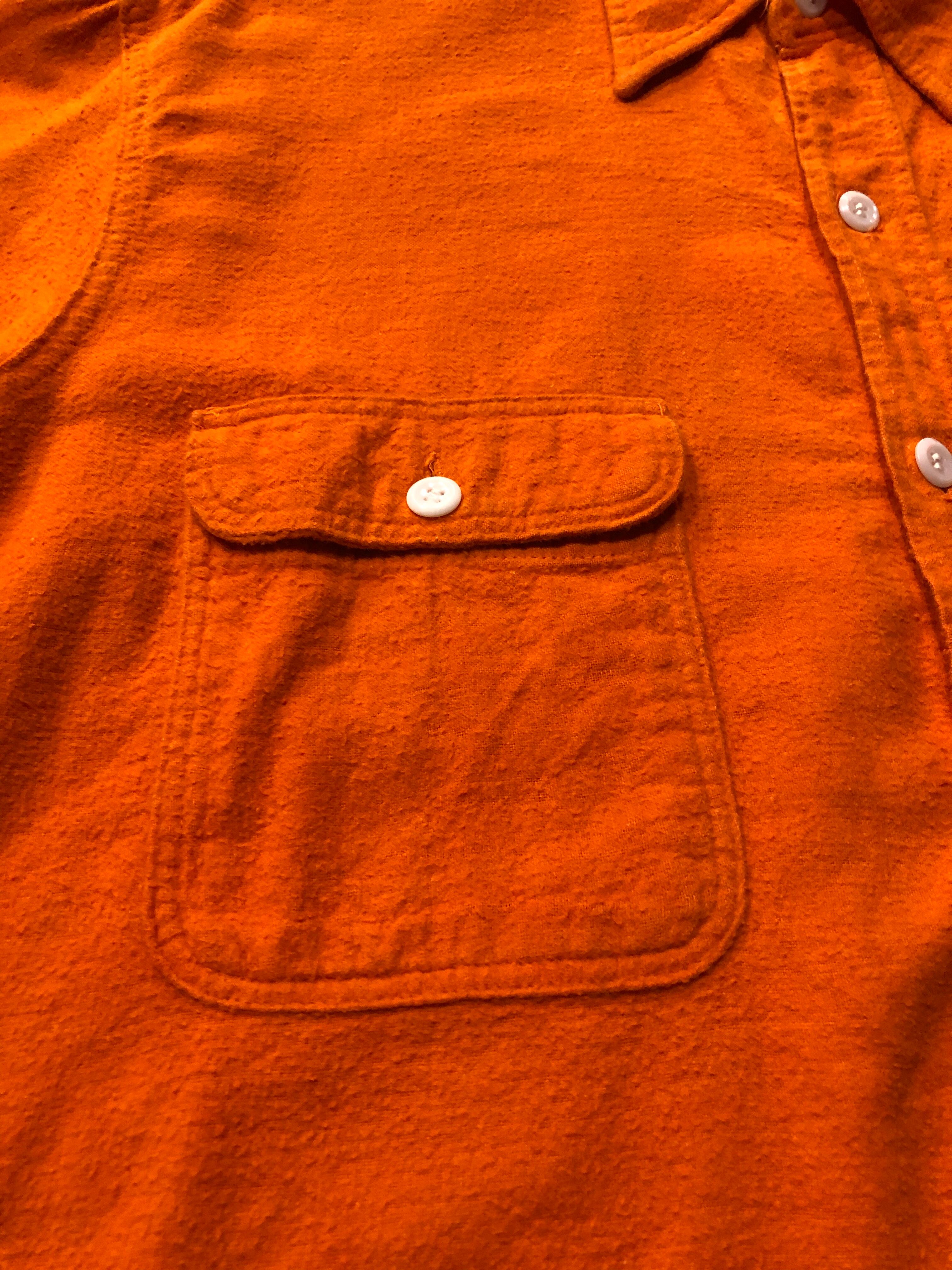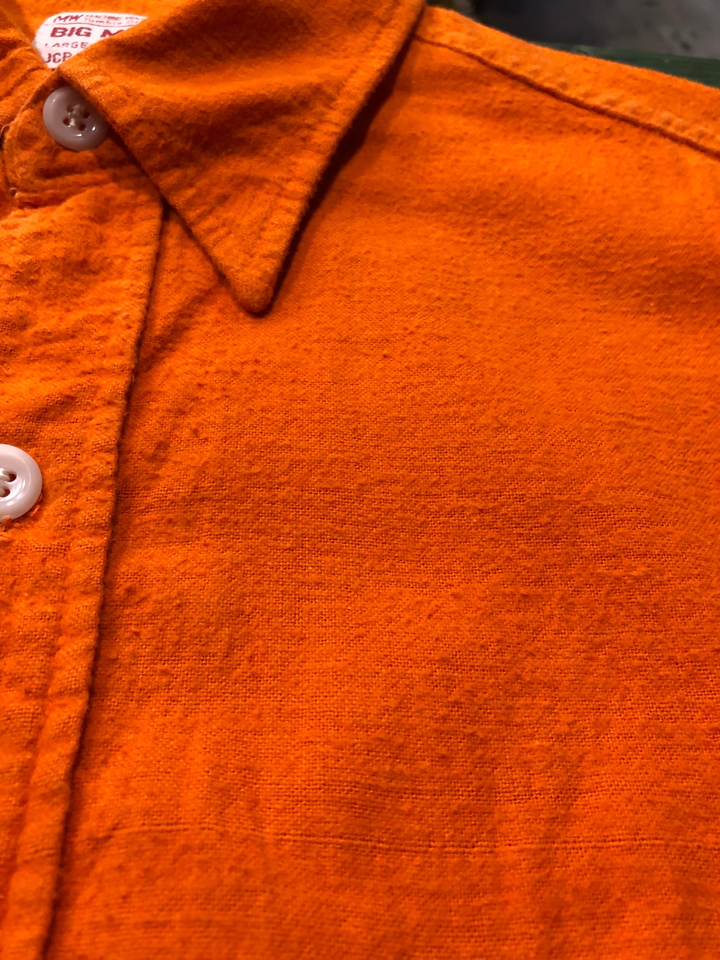 鮮やかなオレンジがとても明るい印象です。ワンピースの上に羽織ったり柄物と合わせたり、真夏以外はいろんな着こなしが楽しめると思います。少し毛羽立ったようなネルシャツのような素材で、柔らかく着ていて気持ち良いです。