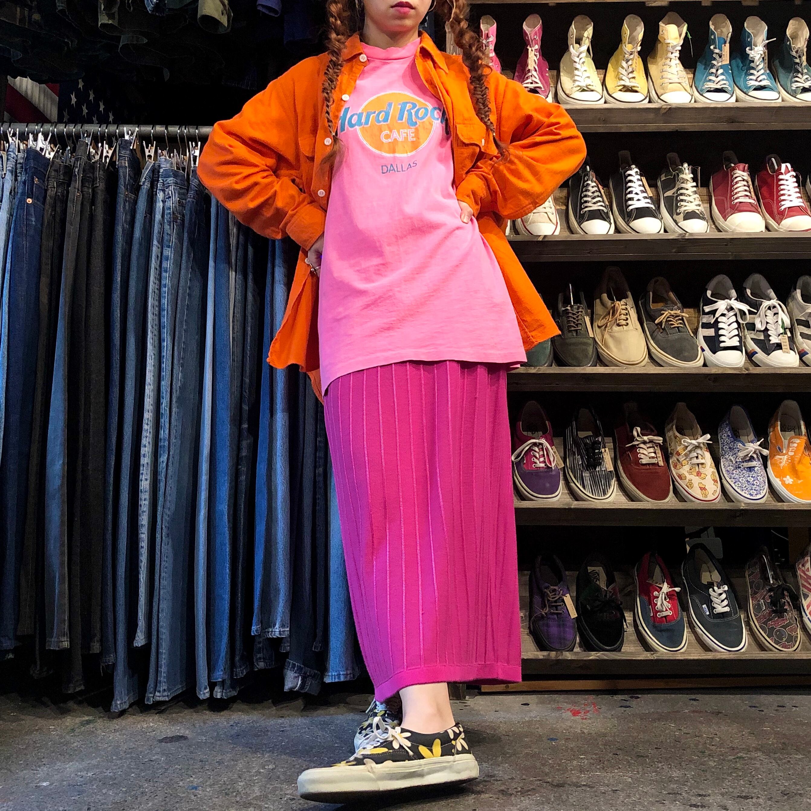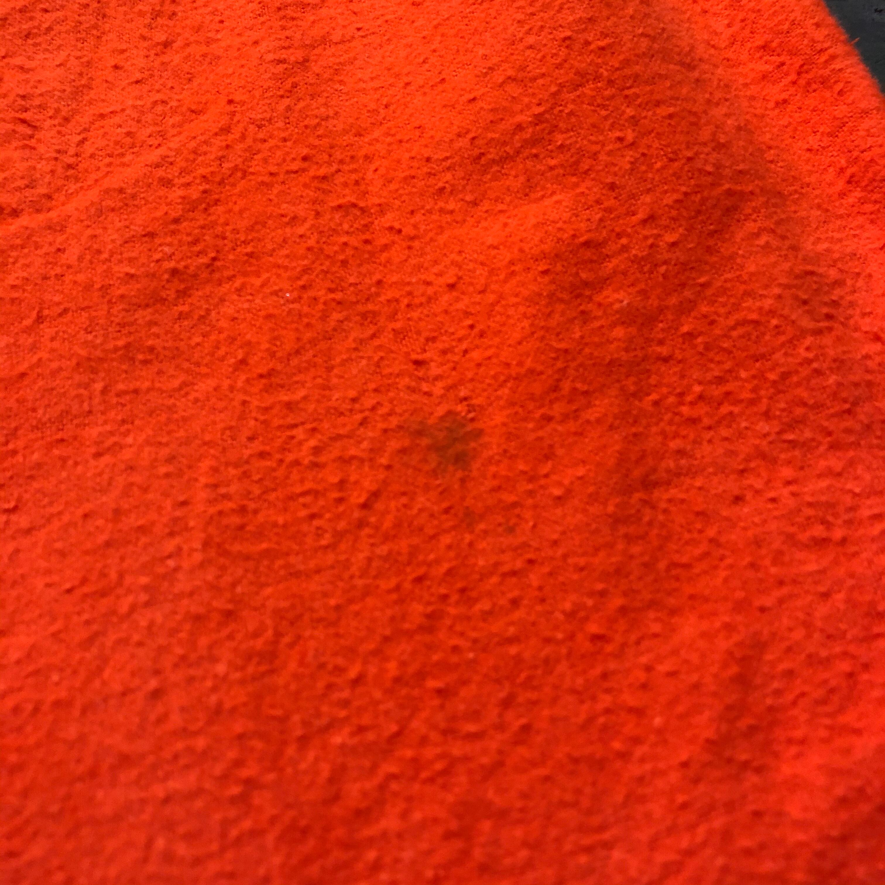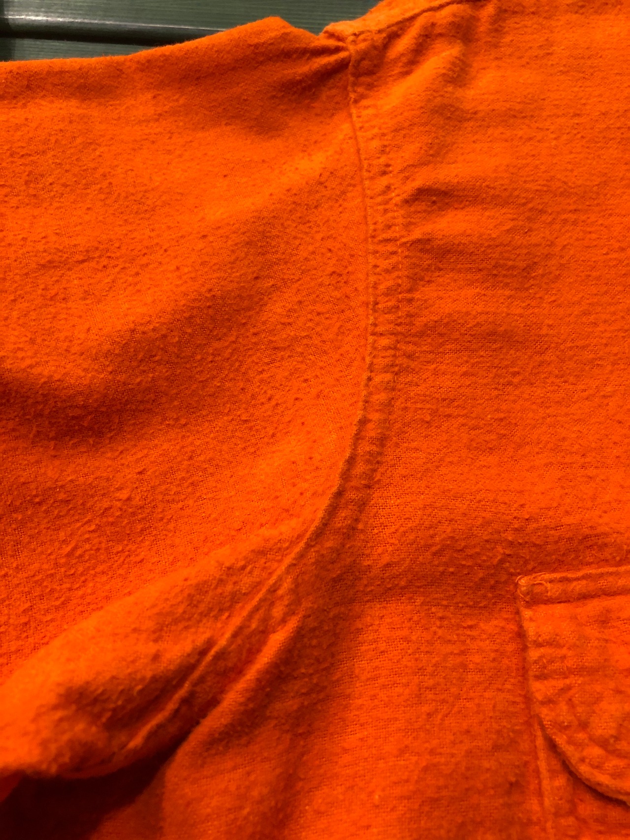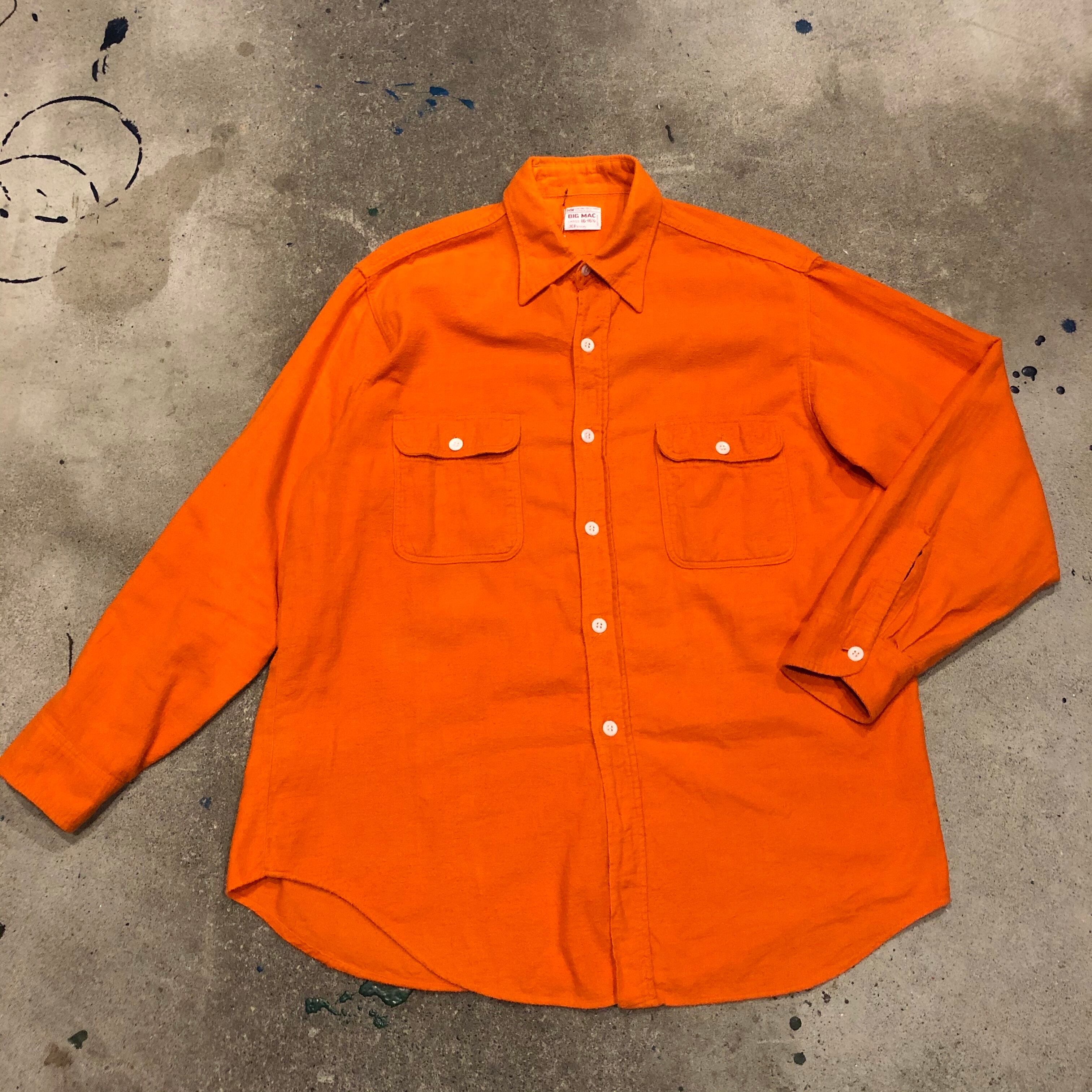 鮮やかなオレンジがとても明るい印象です。ワンピースの上に羽織ったり柄物と合わせたり、真夏以外はいろんな着こなしが楽しめると思います。少し毛羽立ったようなネルシャツのような素材で、柔らかく着ていて気持ち良いです。