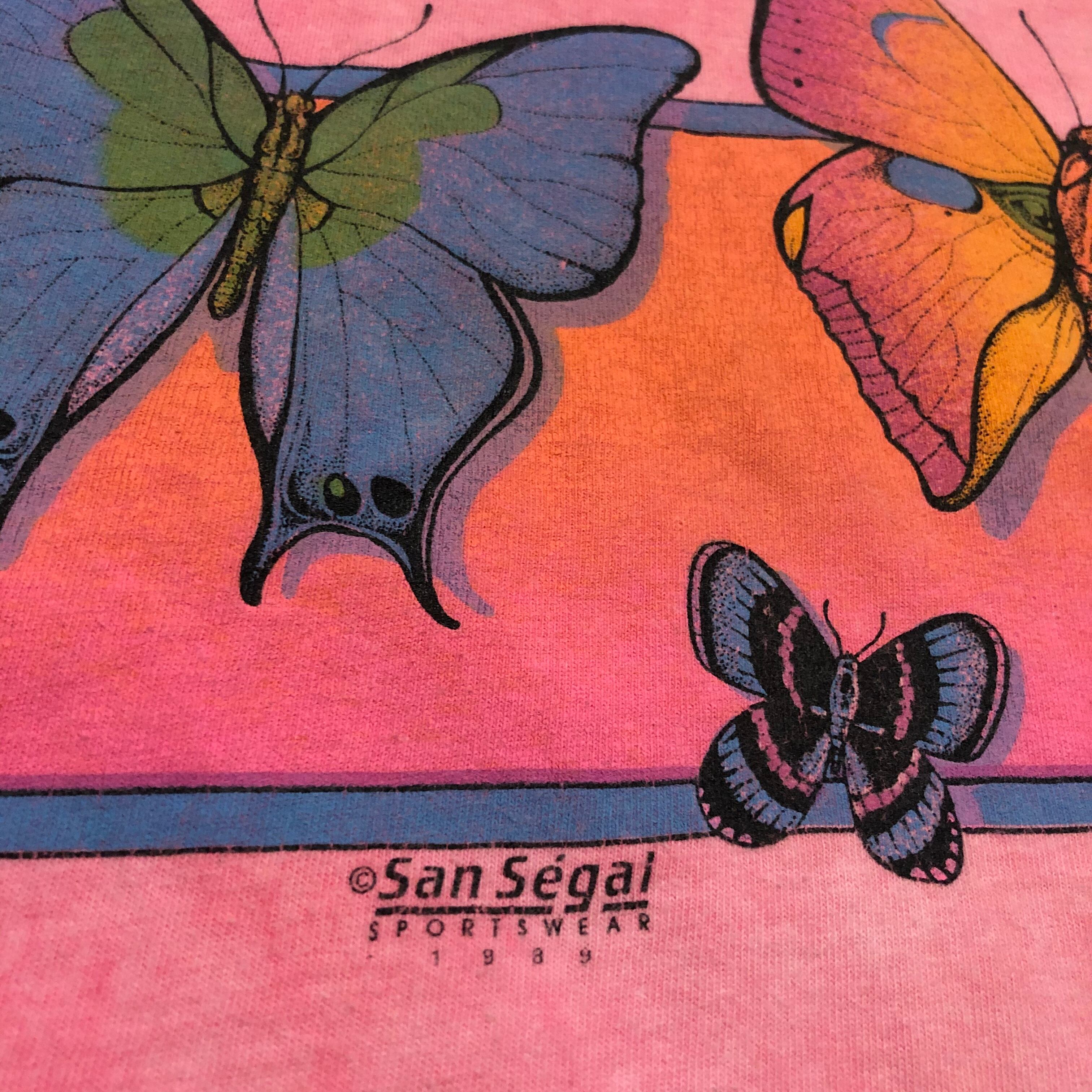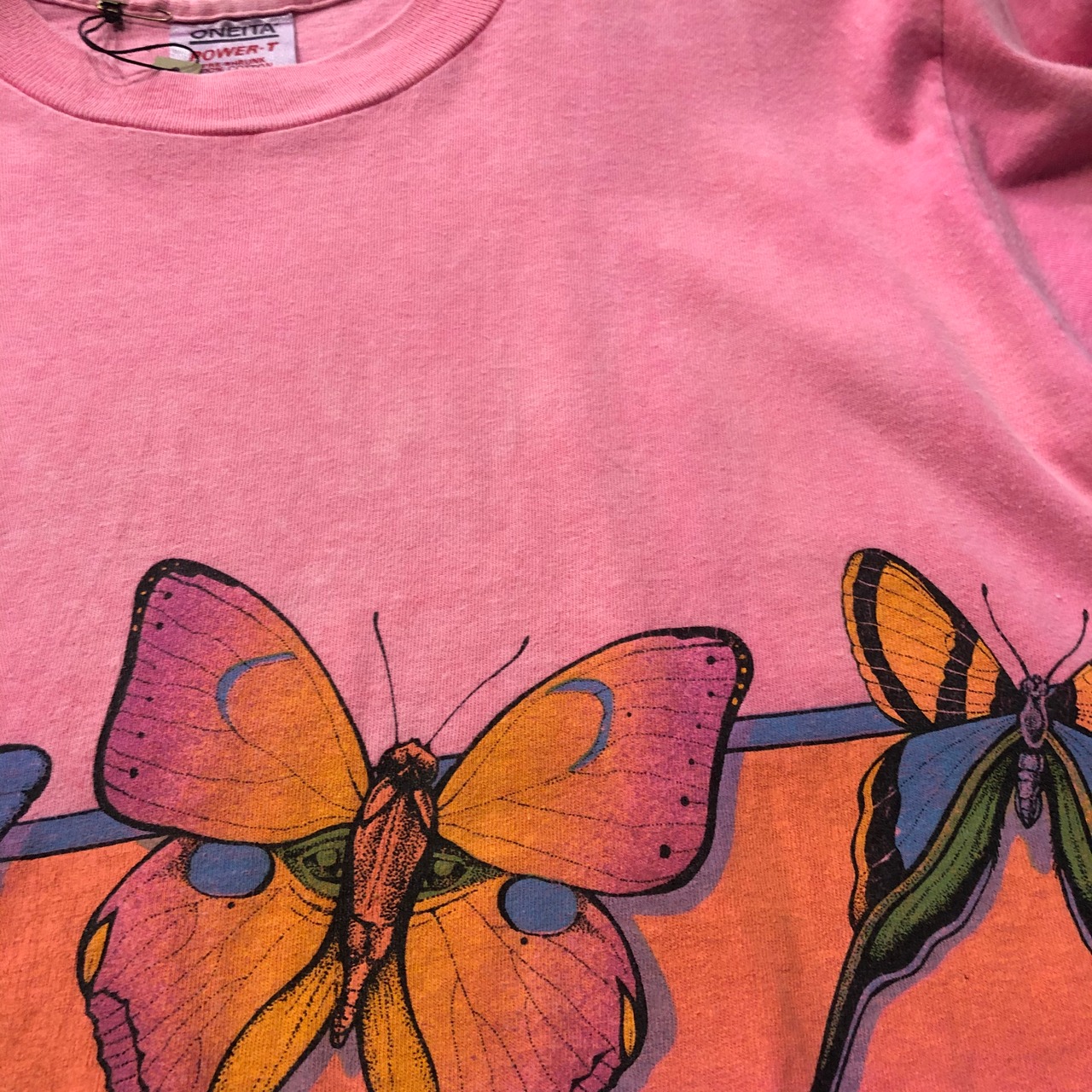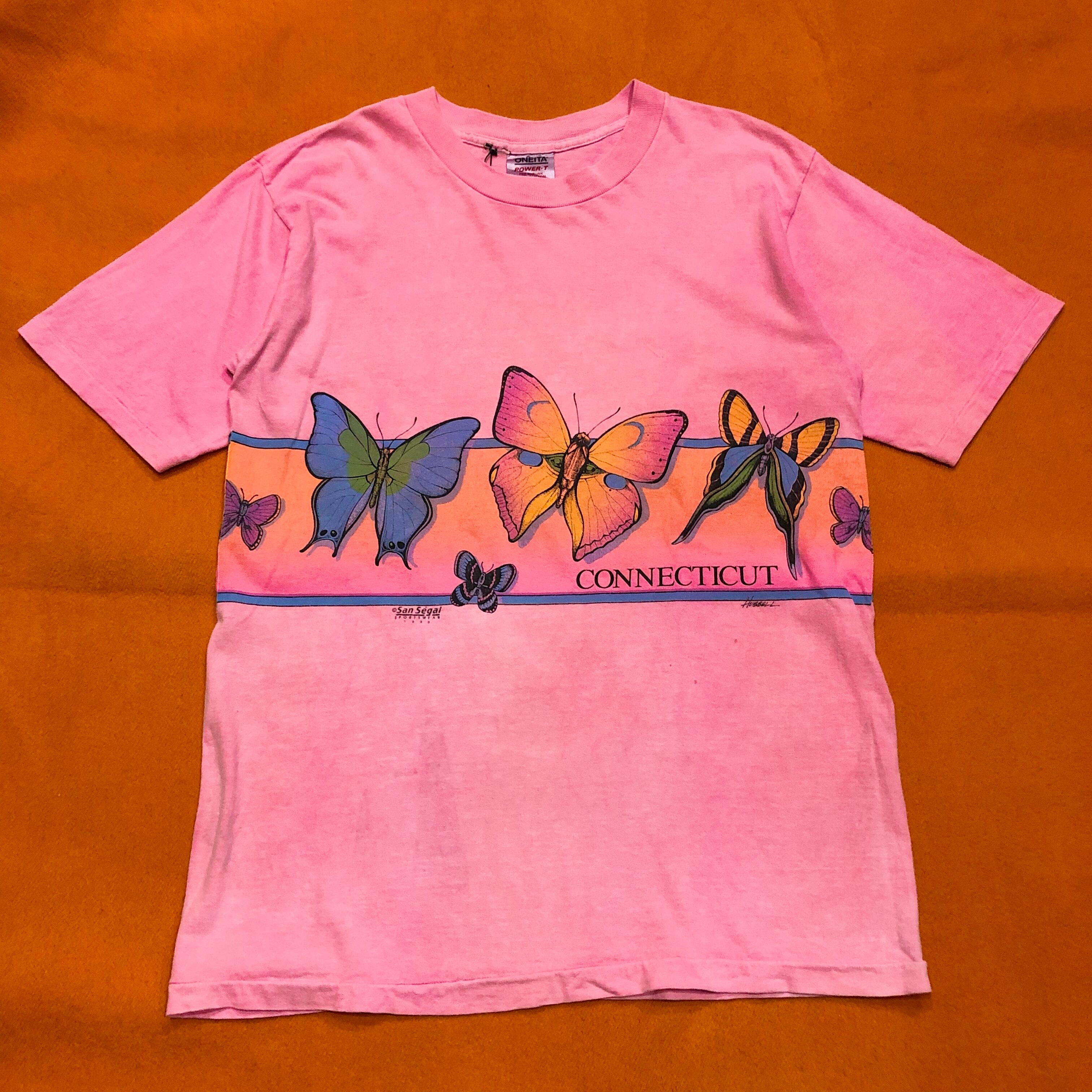 蝶か、蛾か微妙なラインのイラストのTシャツです。色合いがとても綺麗で蝶もリアルなタッチでかわいいてす。蛍光ピンクが褪せたボディも良い感じです。男性にもおすすめです!