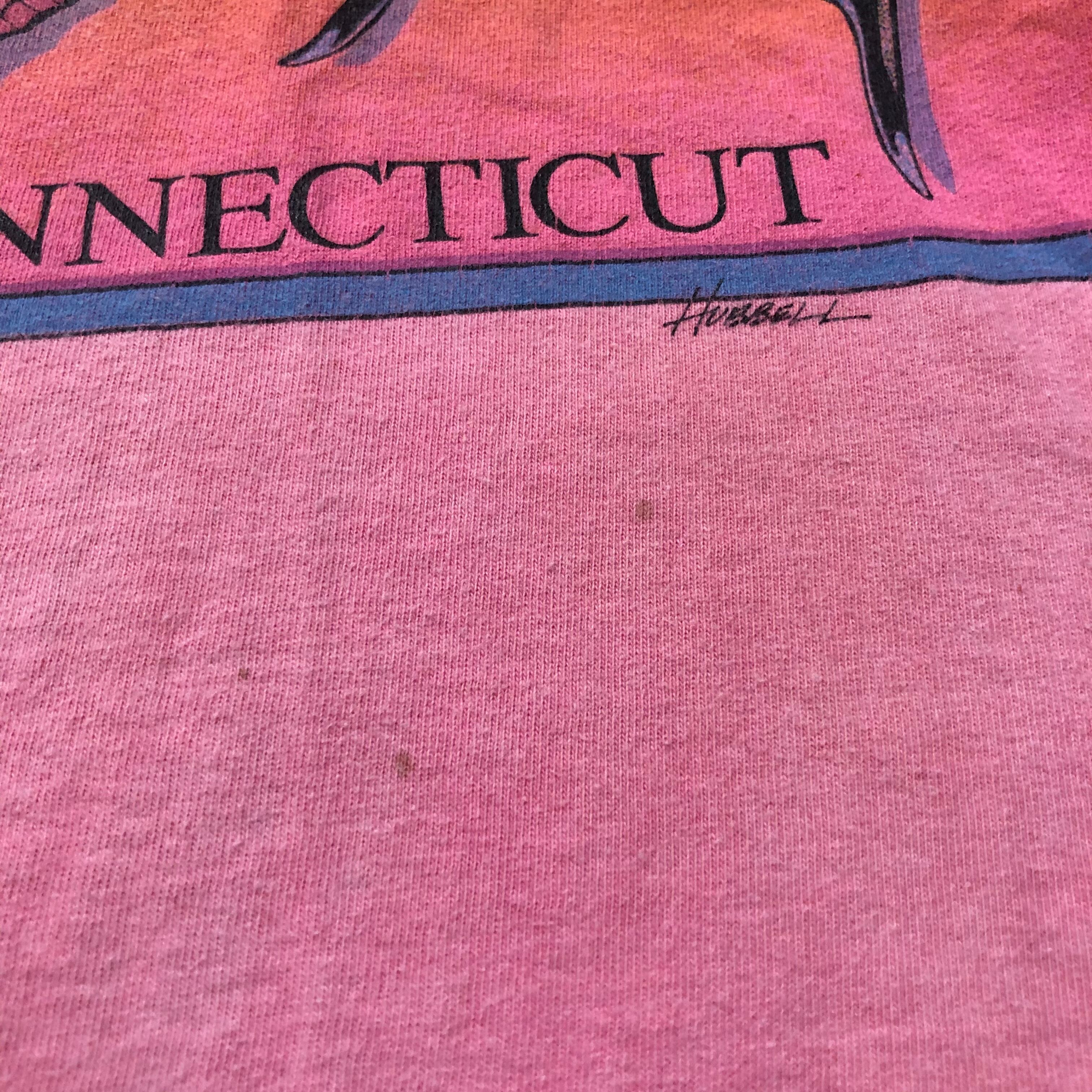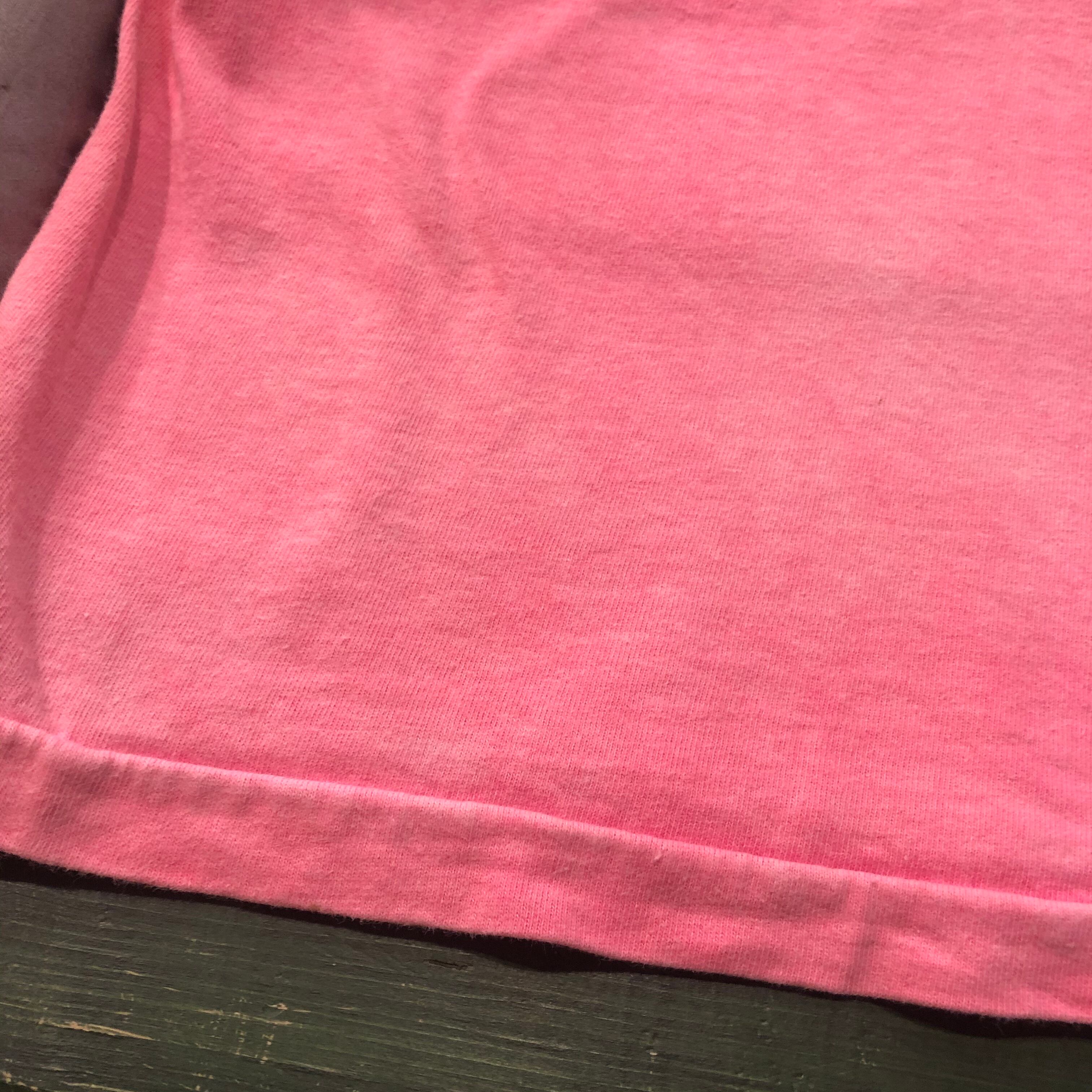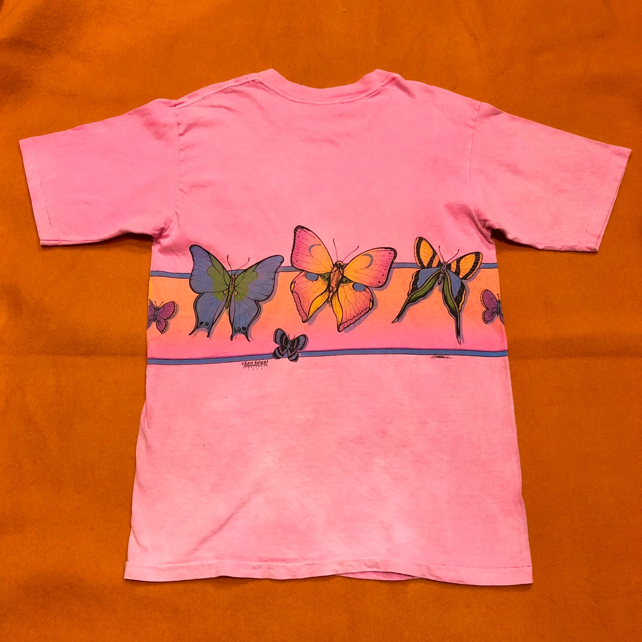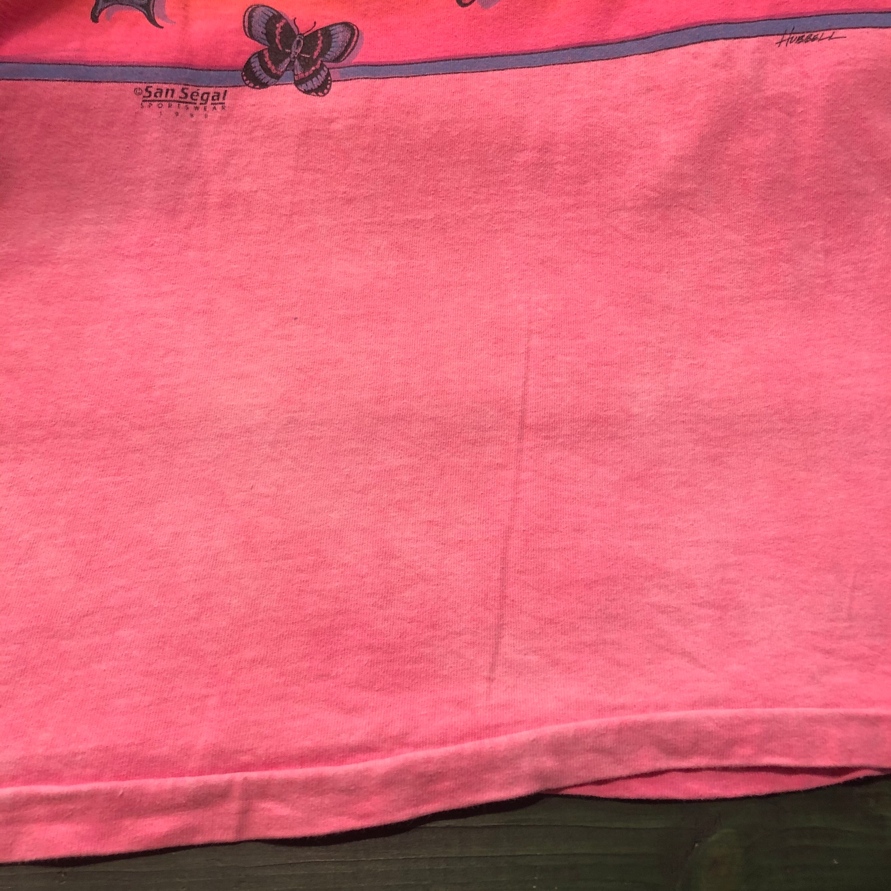 蝶か、蛾か微妙なラインのイラストのTシャツです。色合いがとても綺麗で蝶もリアルなタッチでかわいいてす。蛍光ピンクが褪せたボディも良い感じです。男性にもおすすめです!