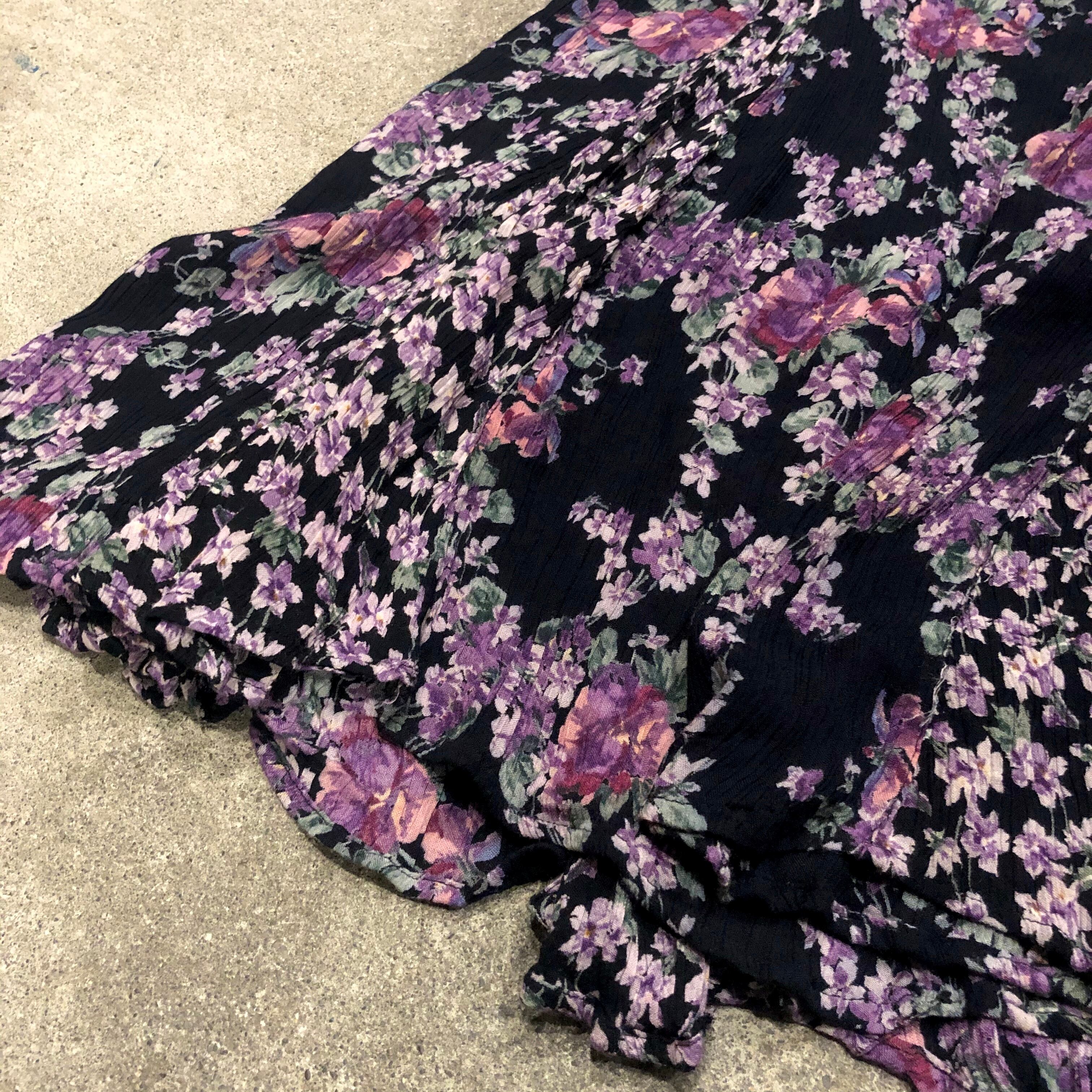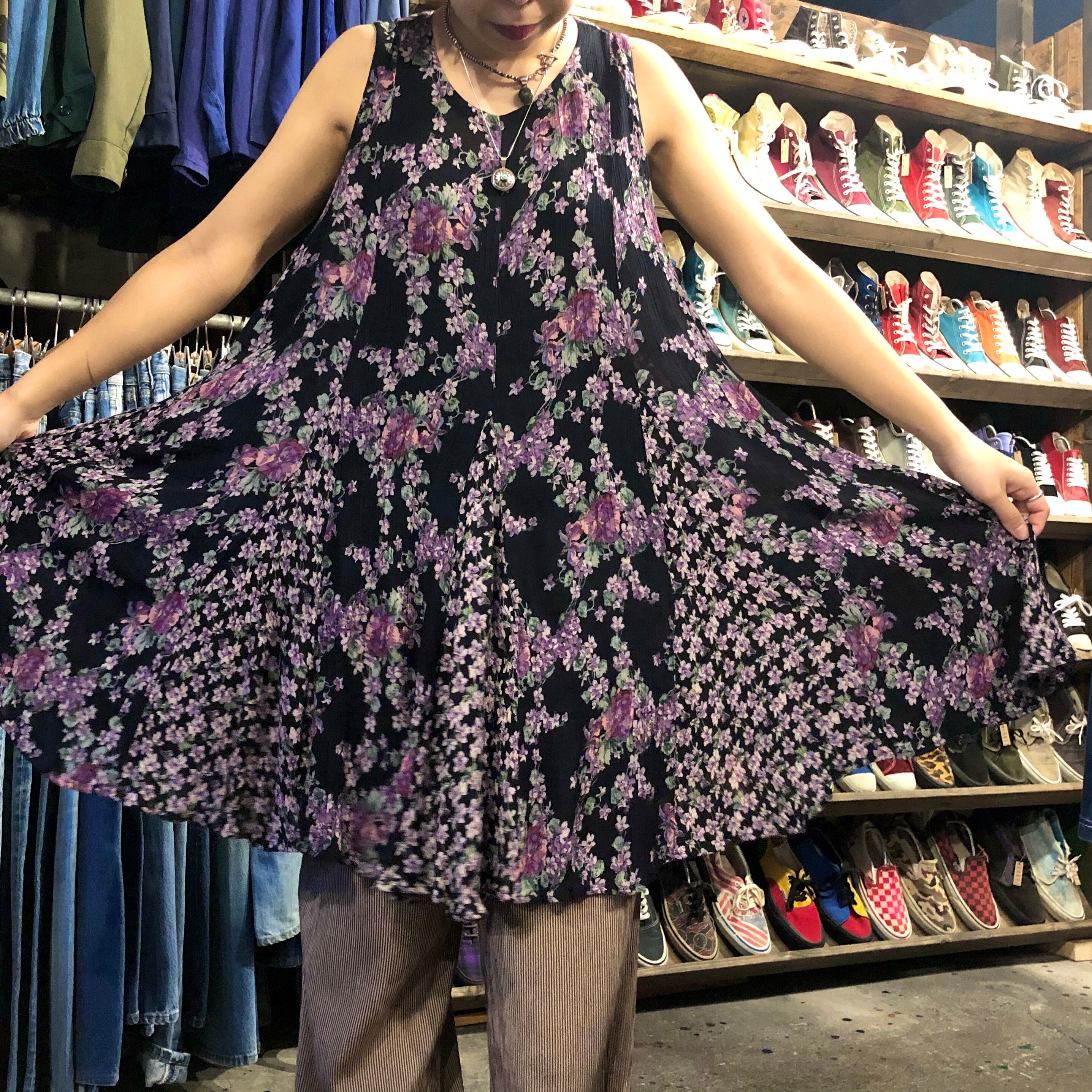 とても涼しげで、ゆったりパンツに合わせても、一枚でもいろいろ使えそうです。黒地に紫のお花が上品で年齢問わず着ていただけそうな一着です。