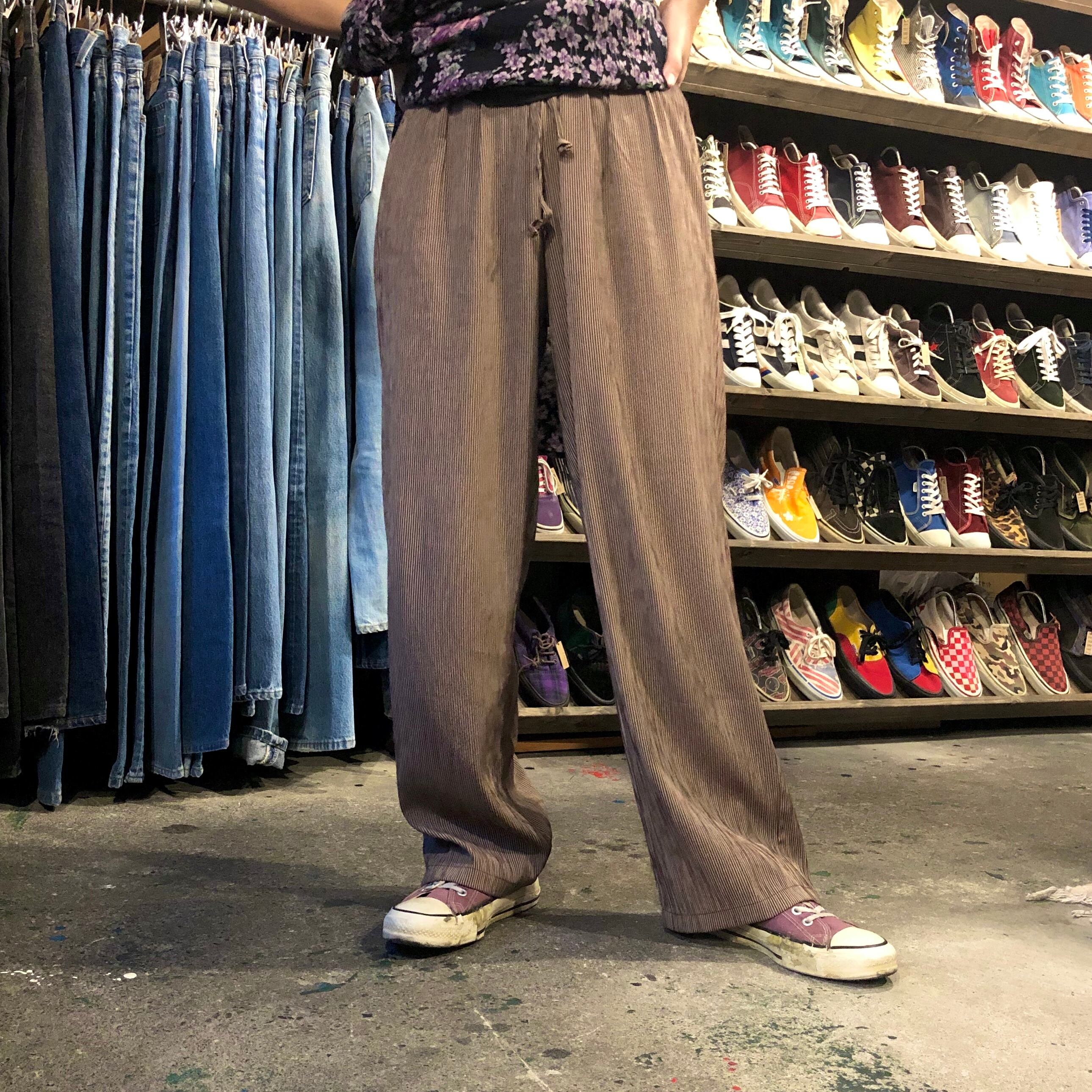 茶×ベージュの渋めなストライプのイージーパンツです。薄手でさらっとした素材が夏でも涼しく履いていただけそうです。ワンピースの下にも、一枚でも可愛いと思います。夏はやっぱり涼しくて楽な服が良いですよね!
