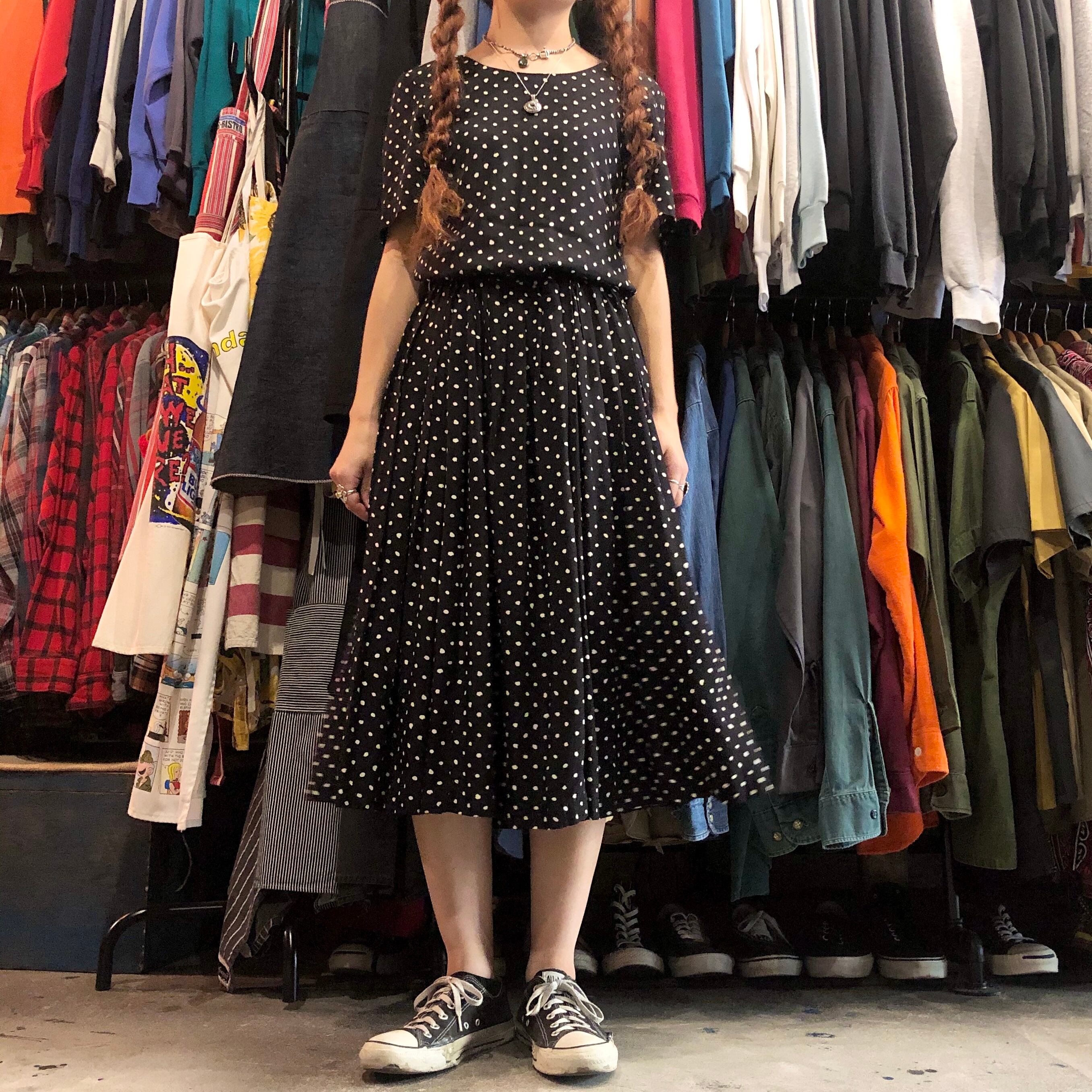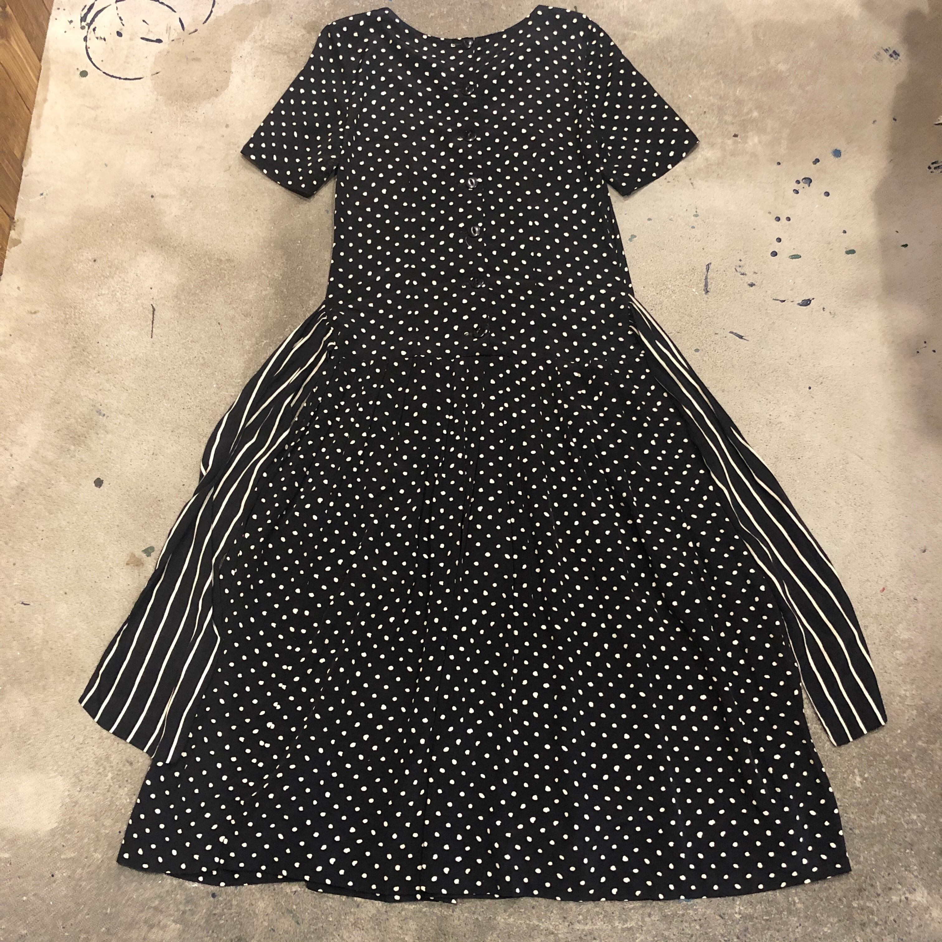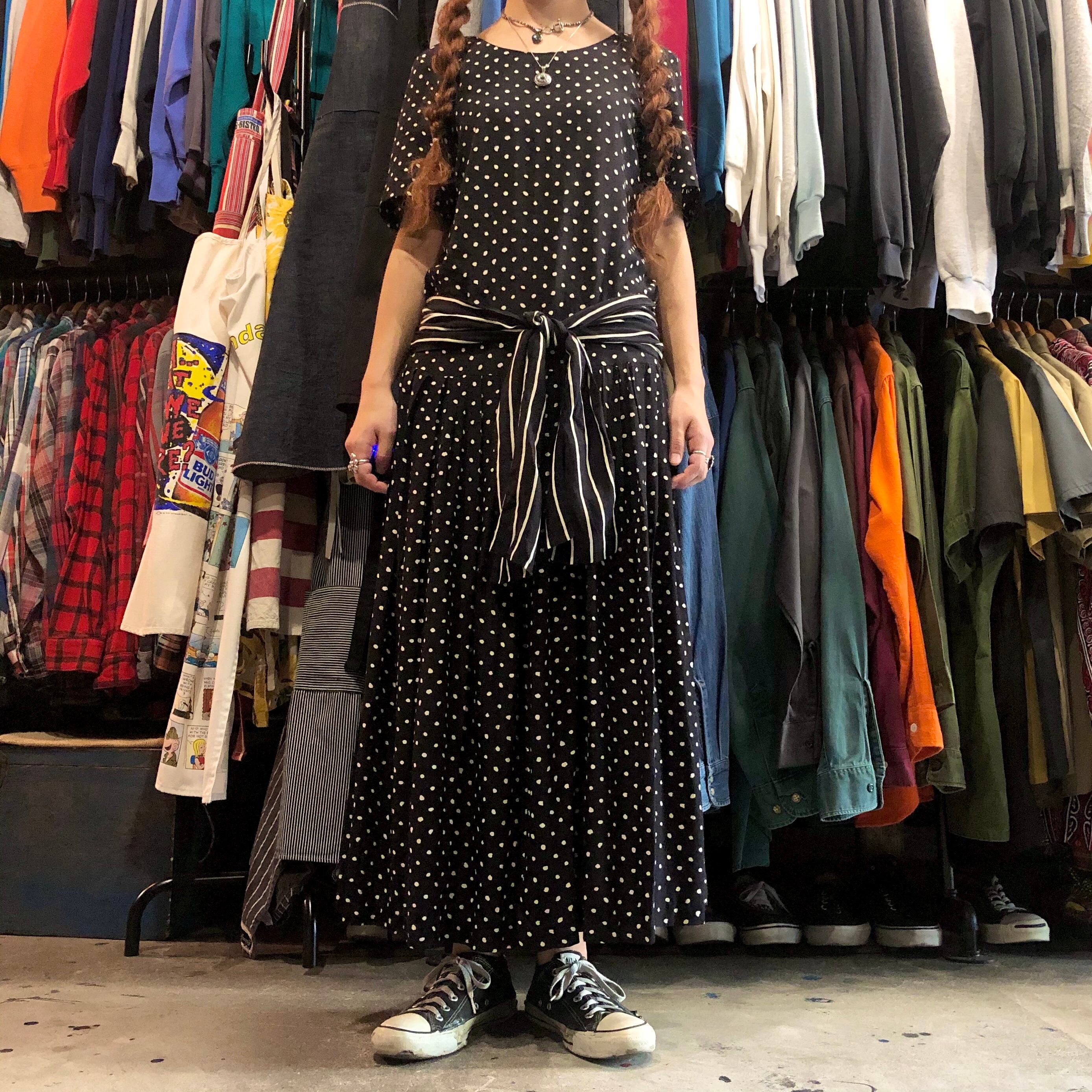 ひとつひとつ手で描いたようないびつなドットと幅広めのストライプのリボンのバランスがとてもかわいいワンピースです。