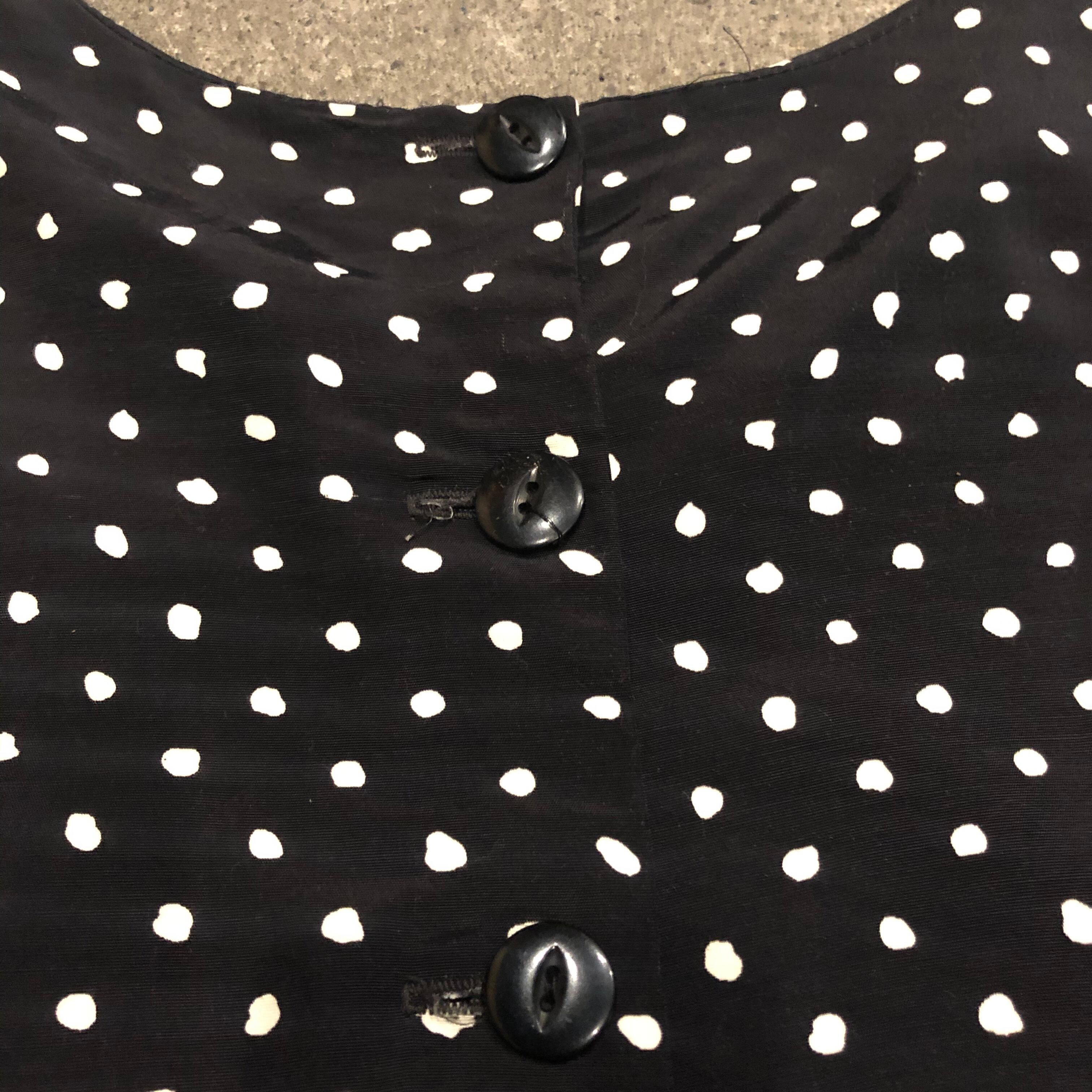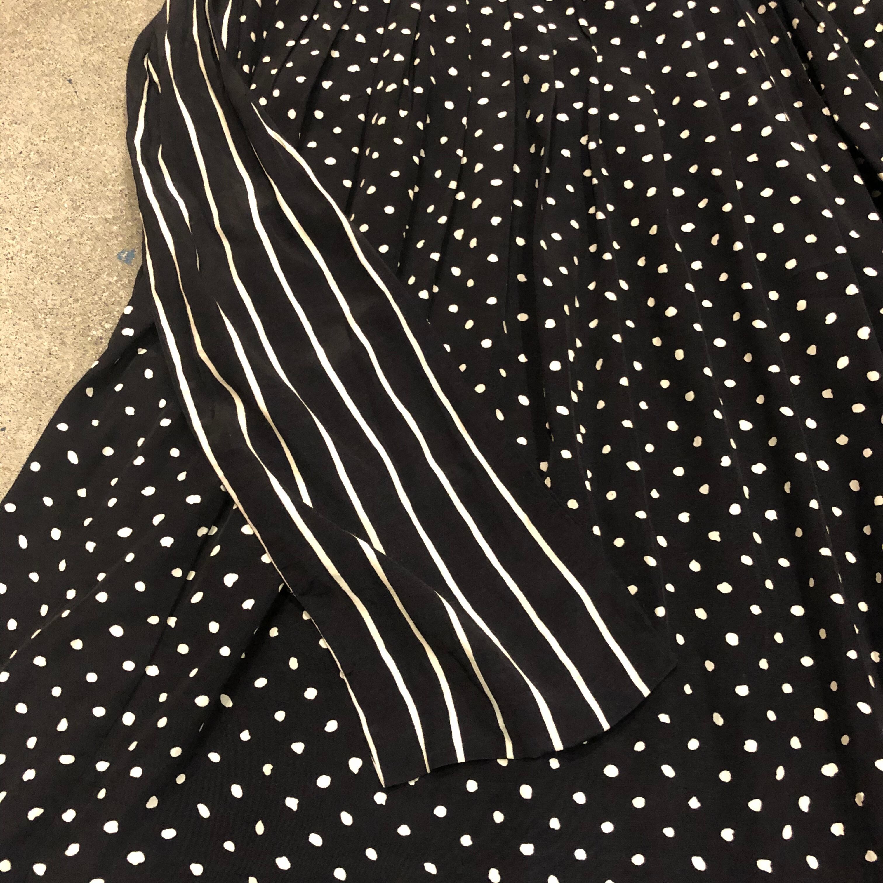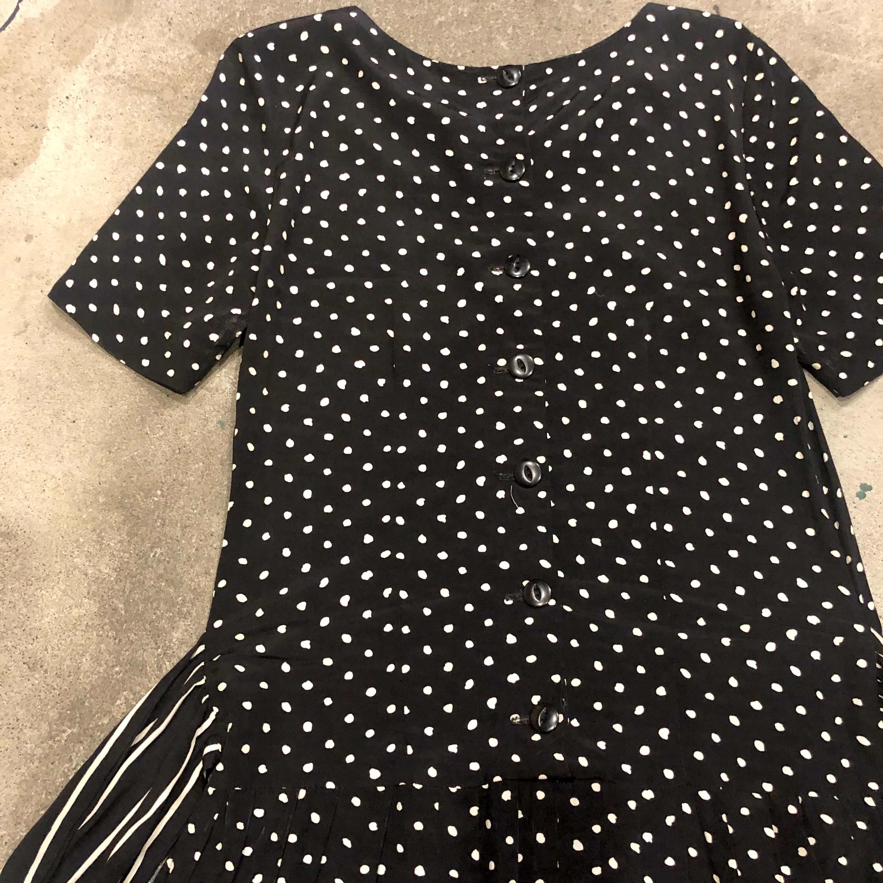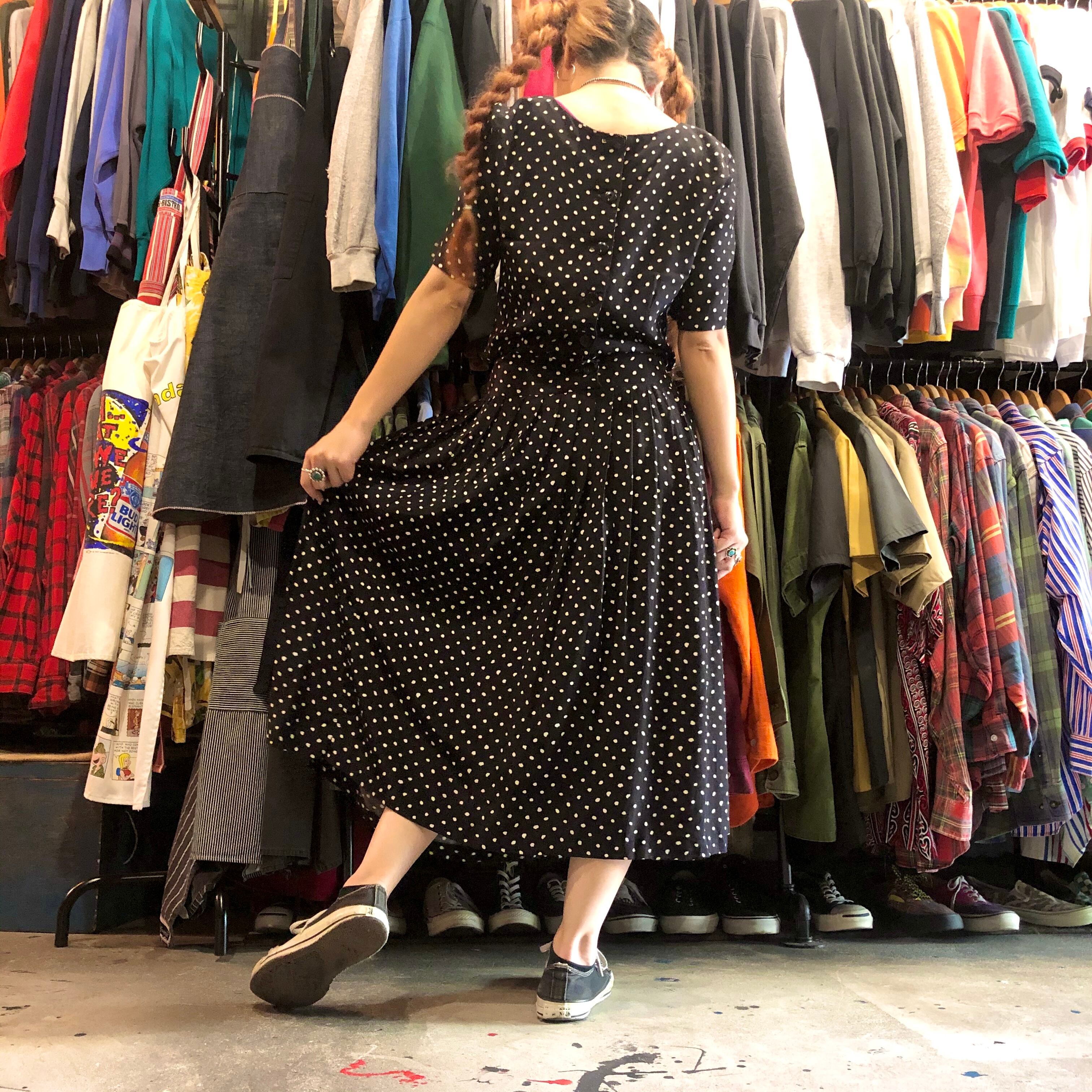 ひとつひとつ手で描いたようないびつなドットと幅広めのストライプのリボンのバランスがとてもかわいいワンピースです。