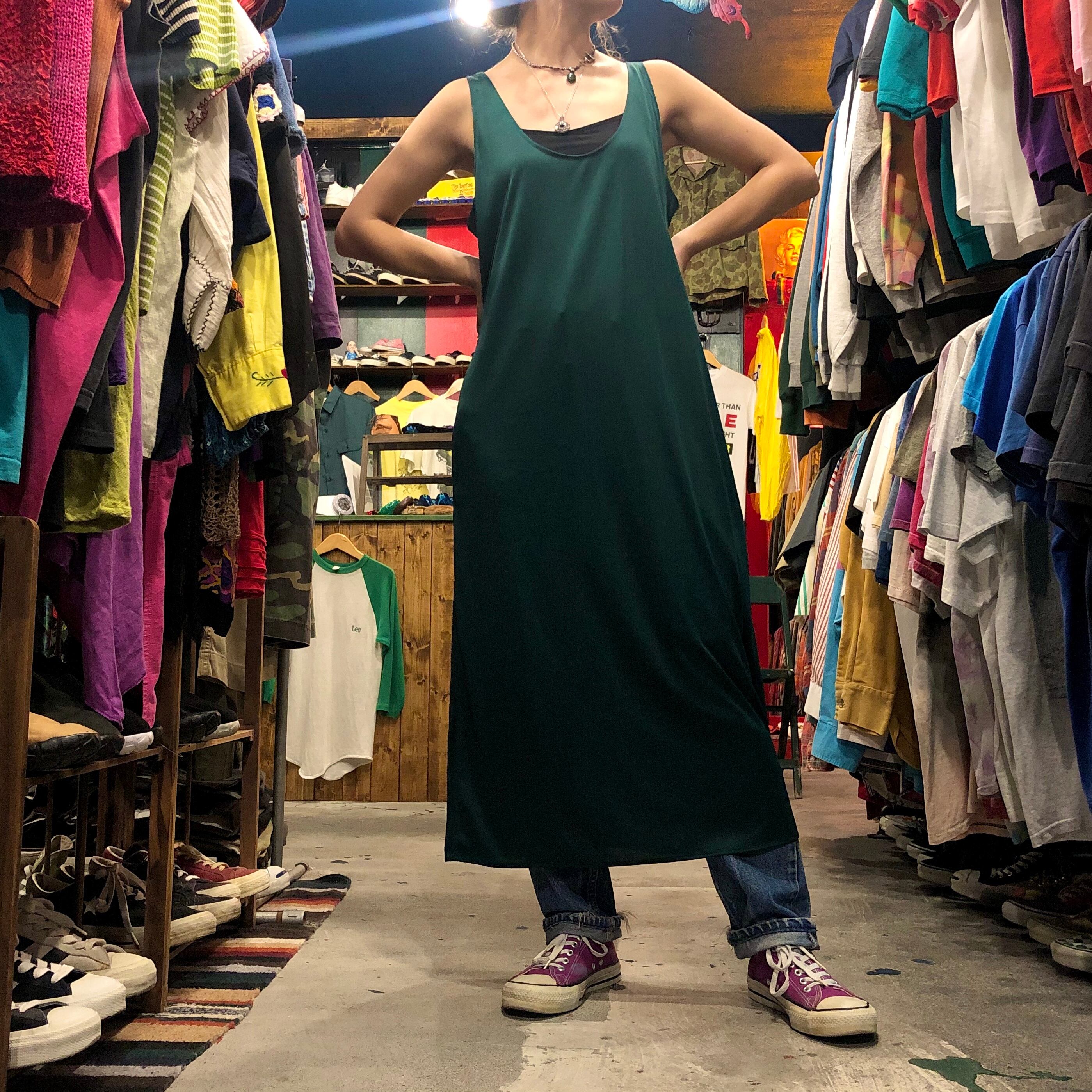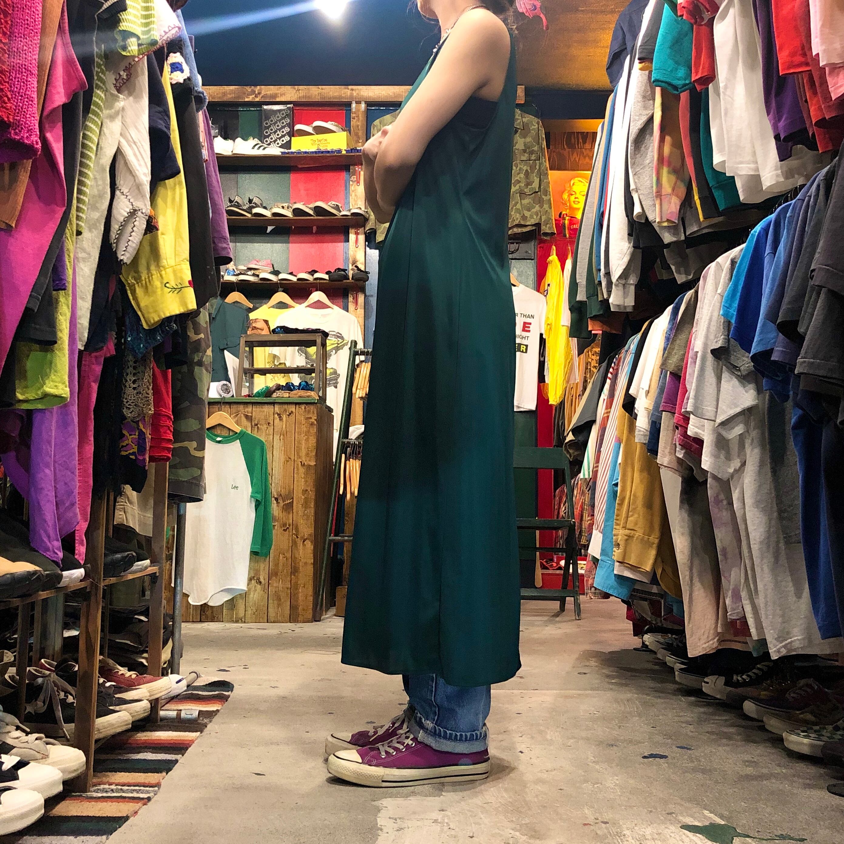 緑のシンプルなワンピースです。ランジェリーのような雰囲気ですが、カジュアルに着てもかわいいと思います!