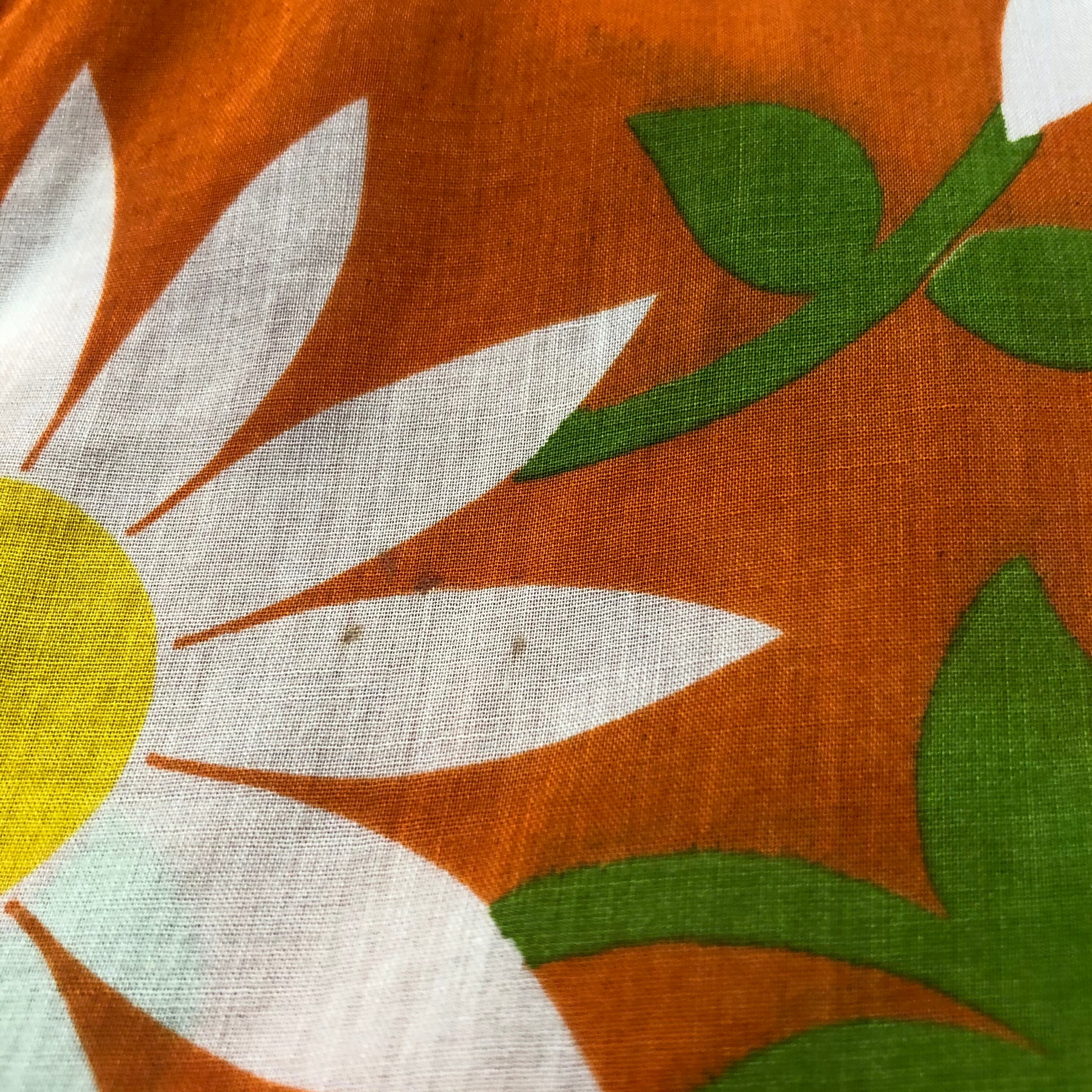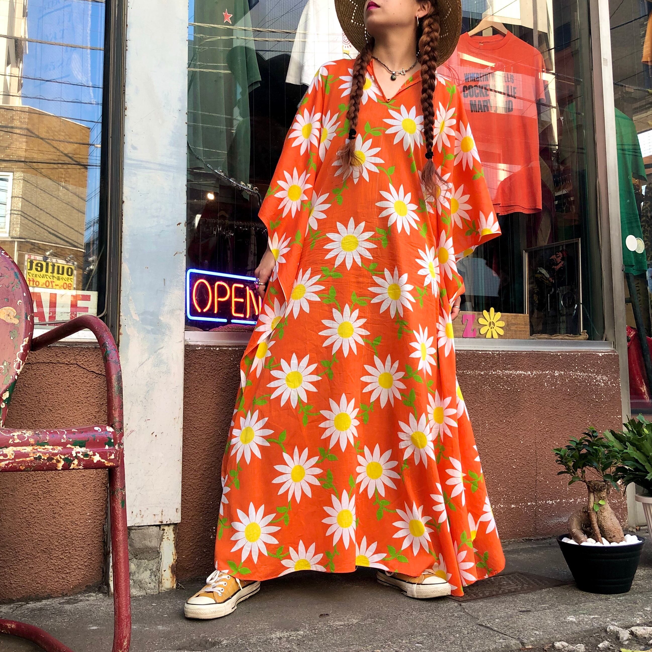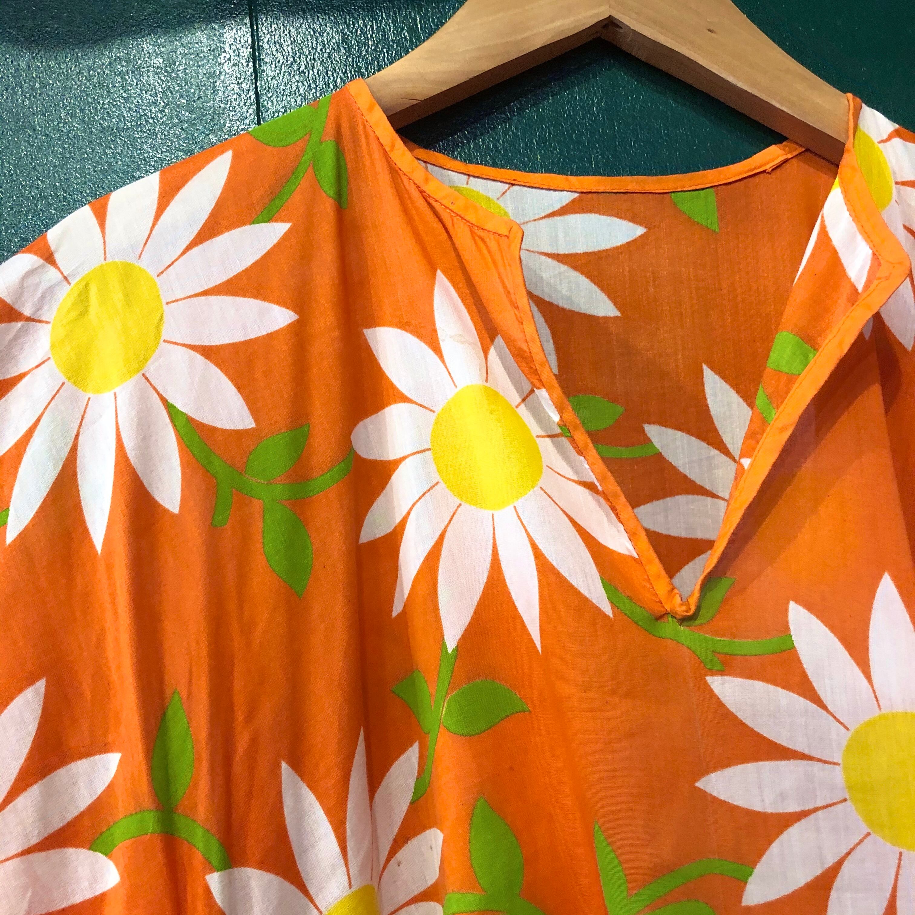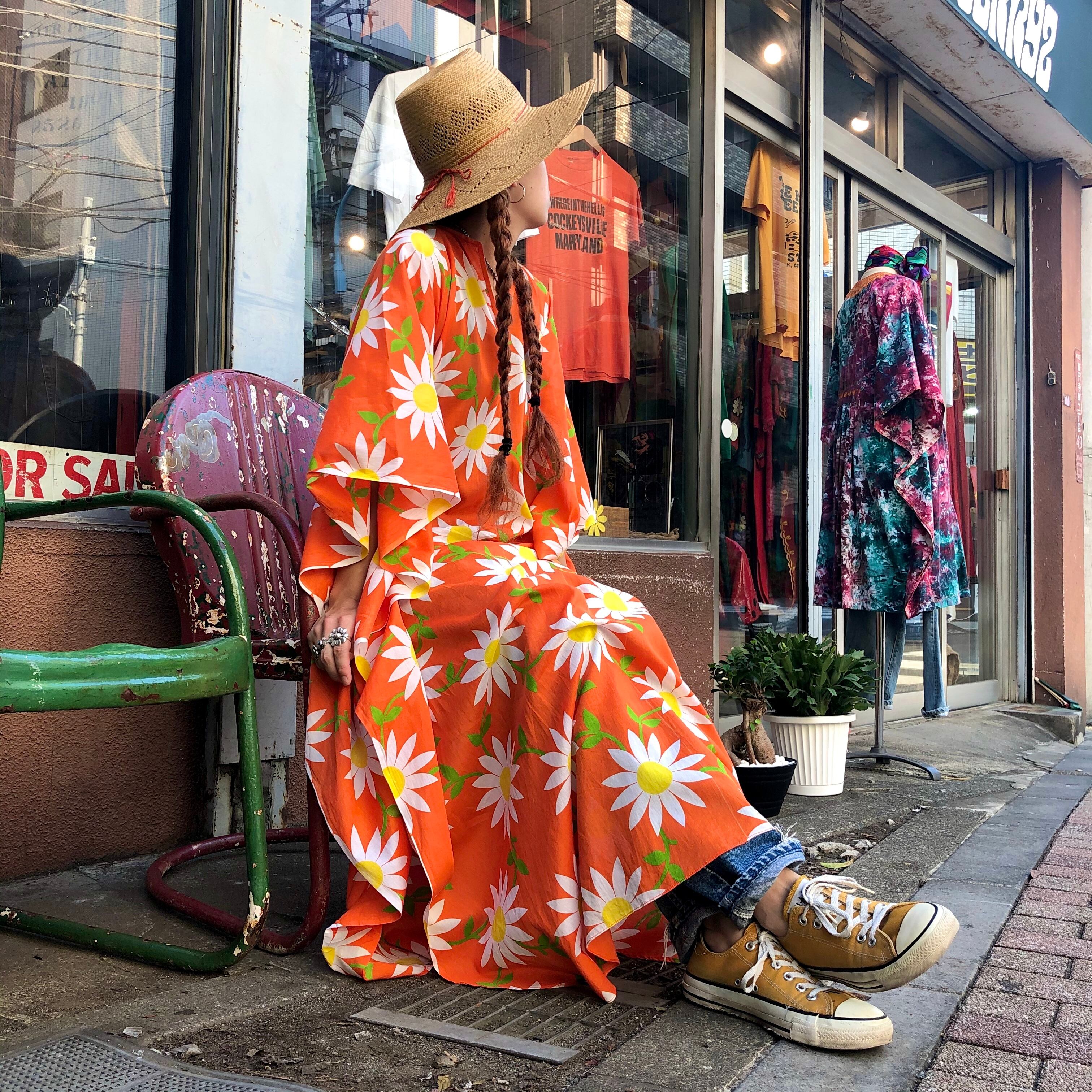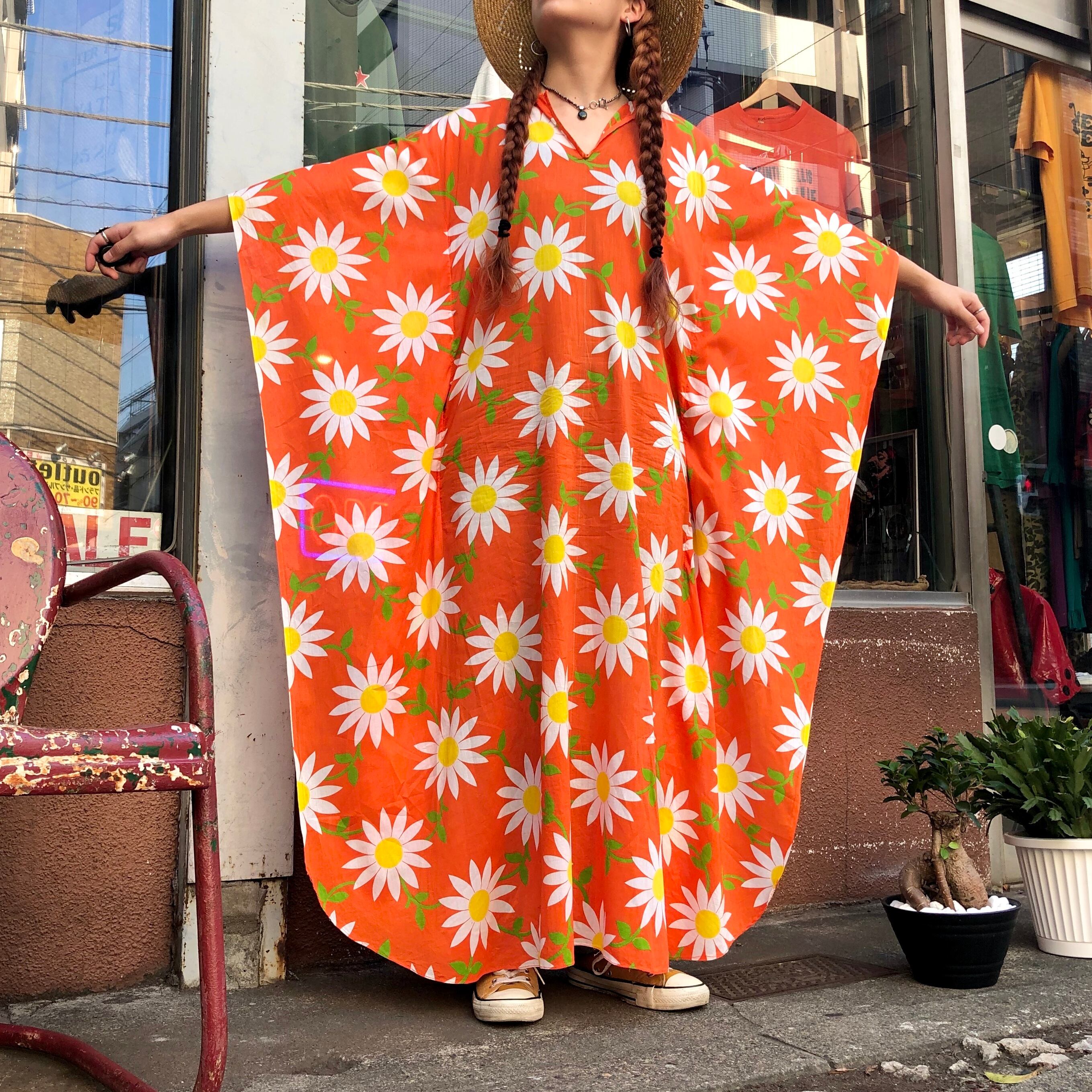 かわいい花柄のハンドメイドによるワンピースです。一枚の布に首を通す穴を開けた簡単な作りですが、ポンチョのようではなく袖を通すようになっています。見てるだけでハッピーになるデザインです。