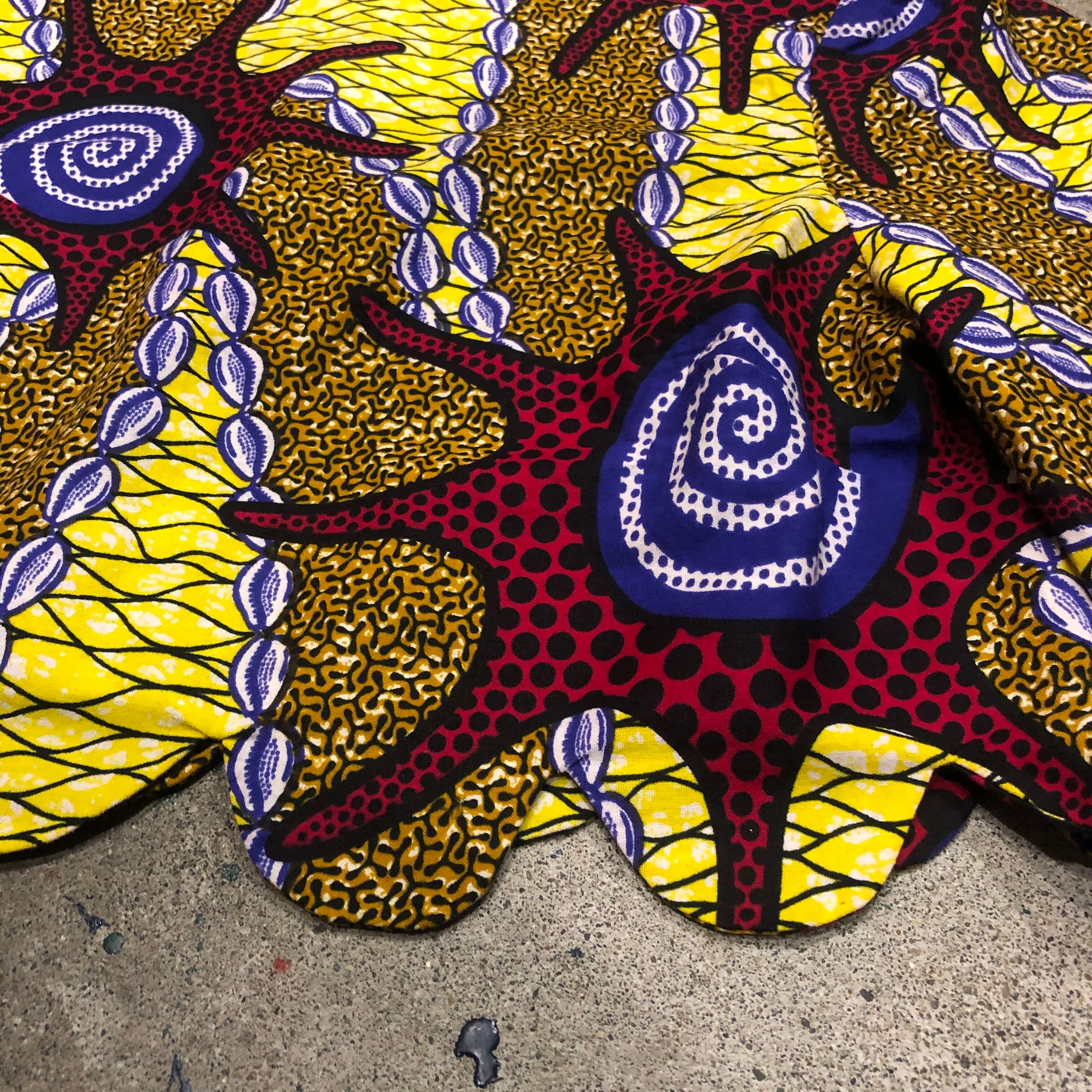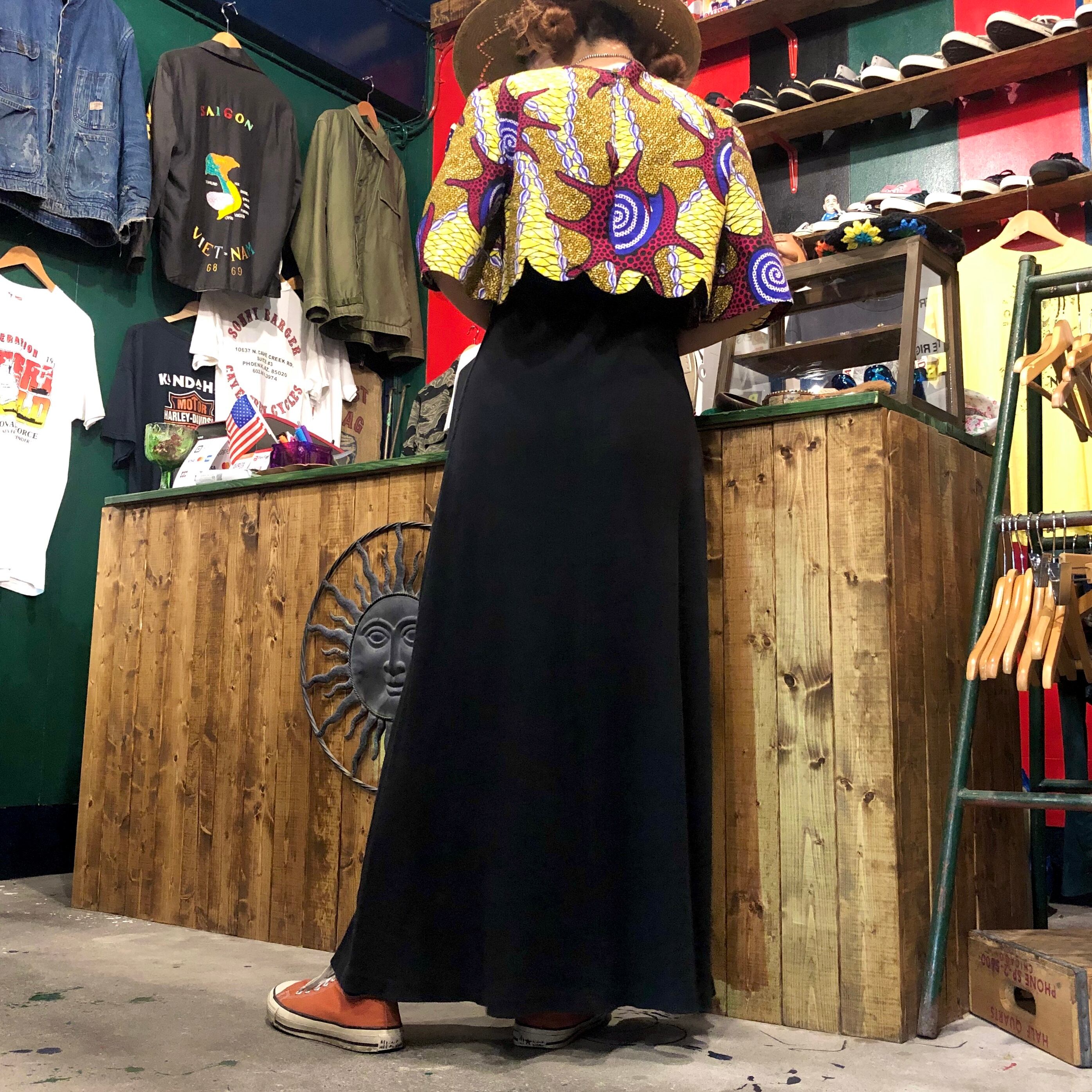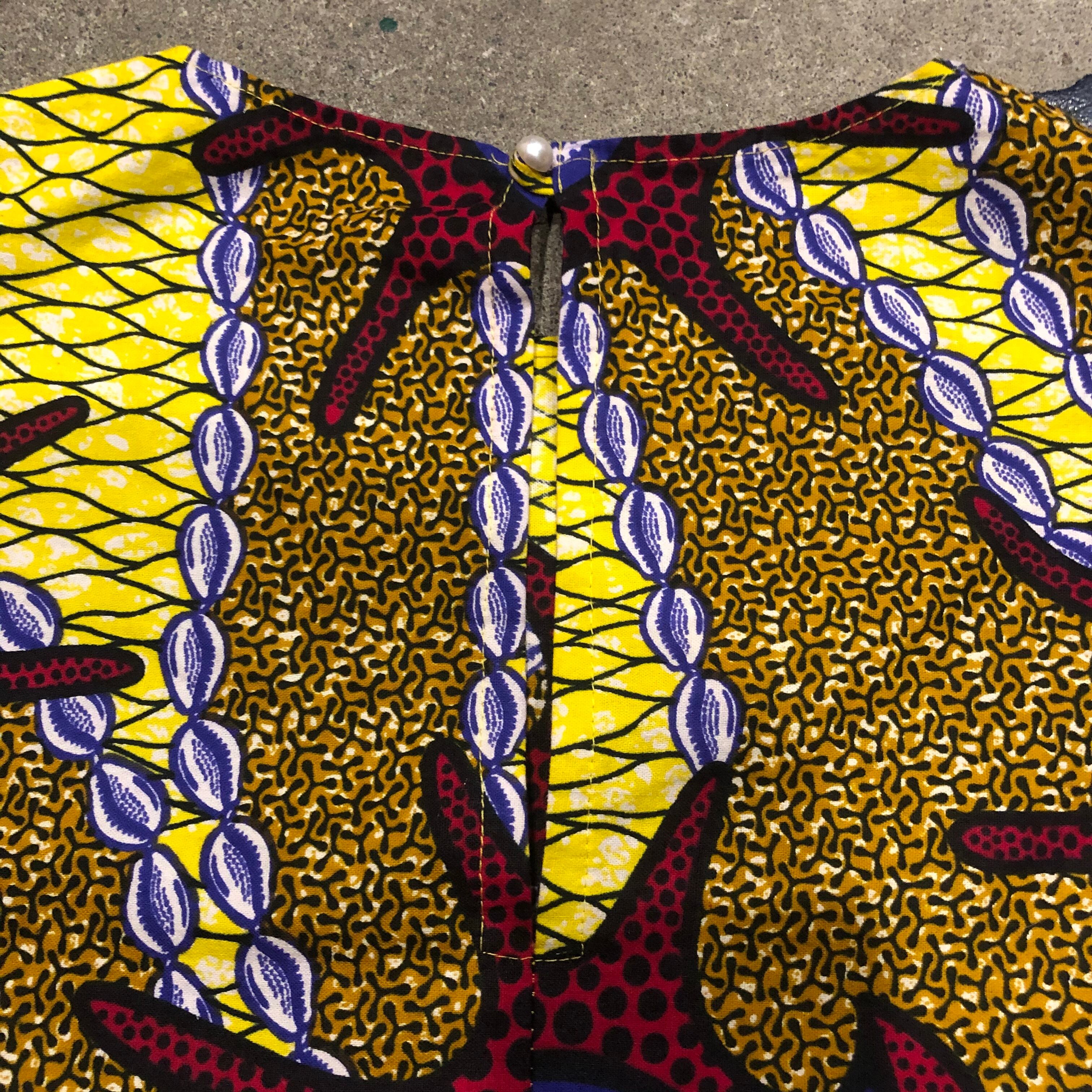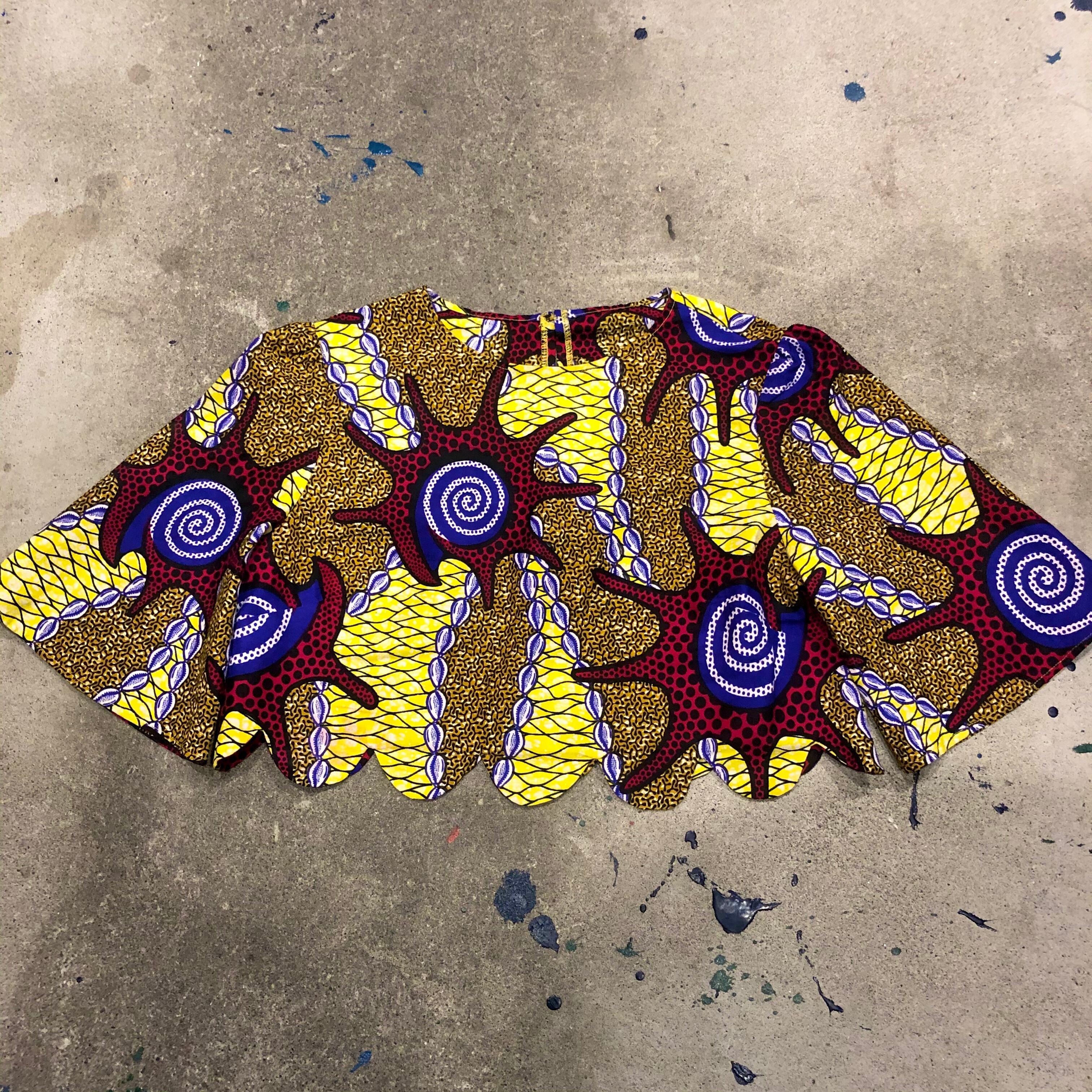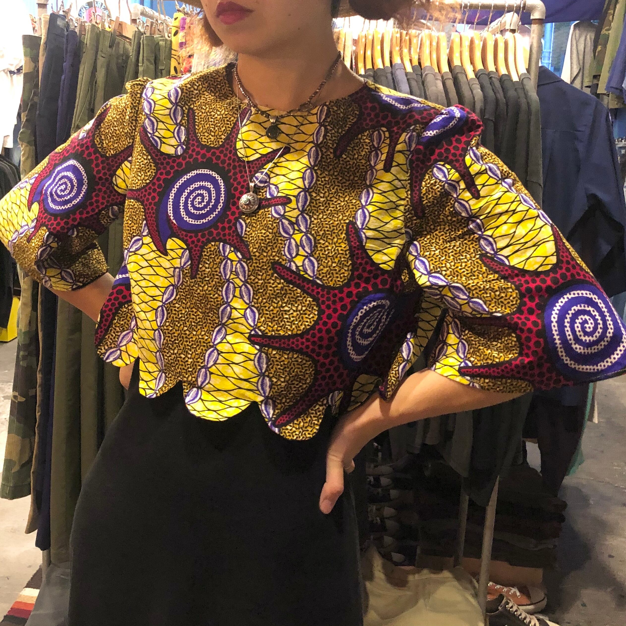 アフリカンバティック独特の色使いや柄合わせが素敵なトップスです。裾がスカラップになっていたり、若干パフスリーブになっていたり女性らしいデザインがかわいいです。