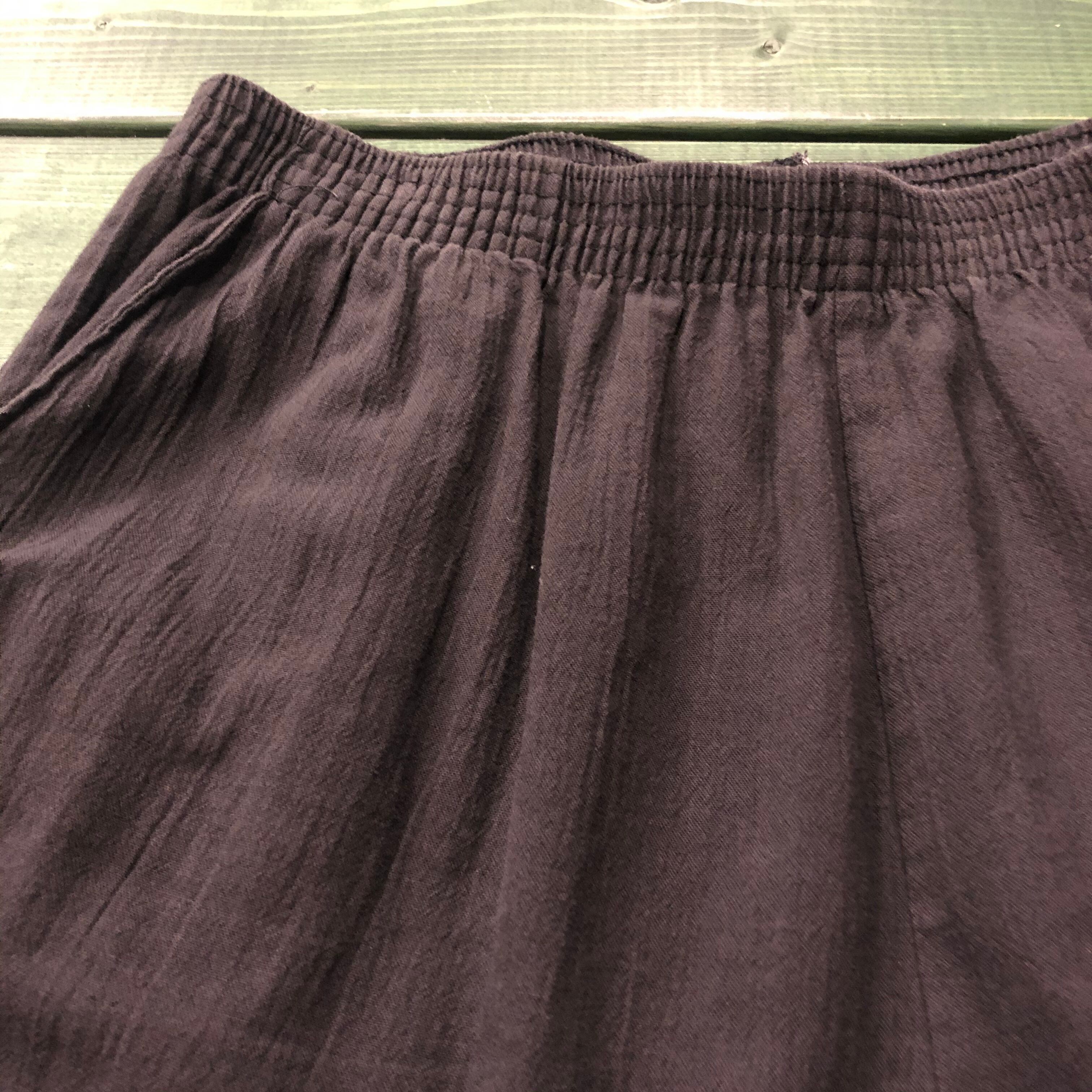 薄手のコットンが楽ちんなイージーパンツです。粗めの肌触りが涼しげで気持ち良いです。ゆったりテーパードしているのでトップスをインしてもバランス良く着ていただける形かと思います。