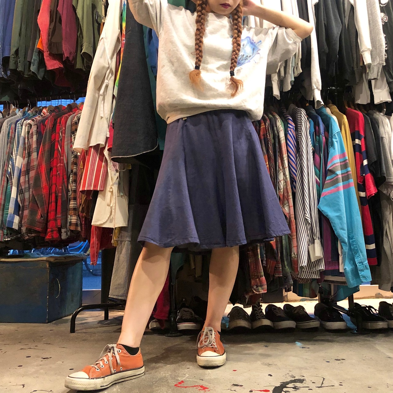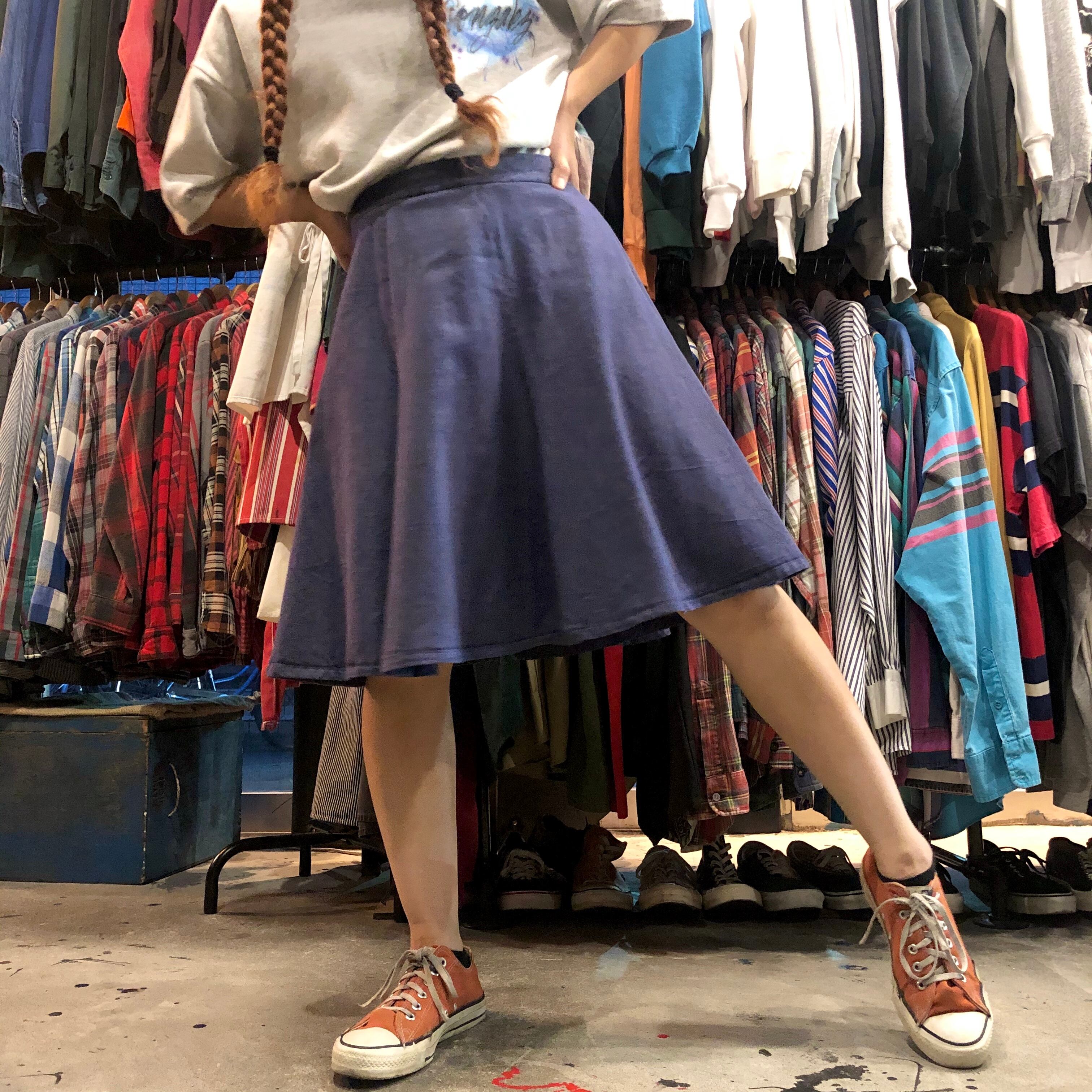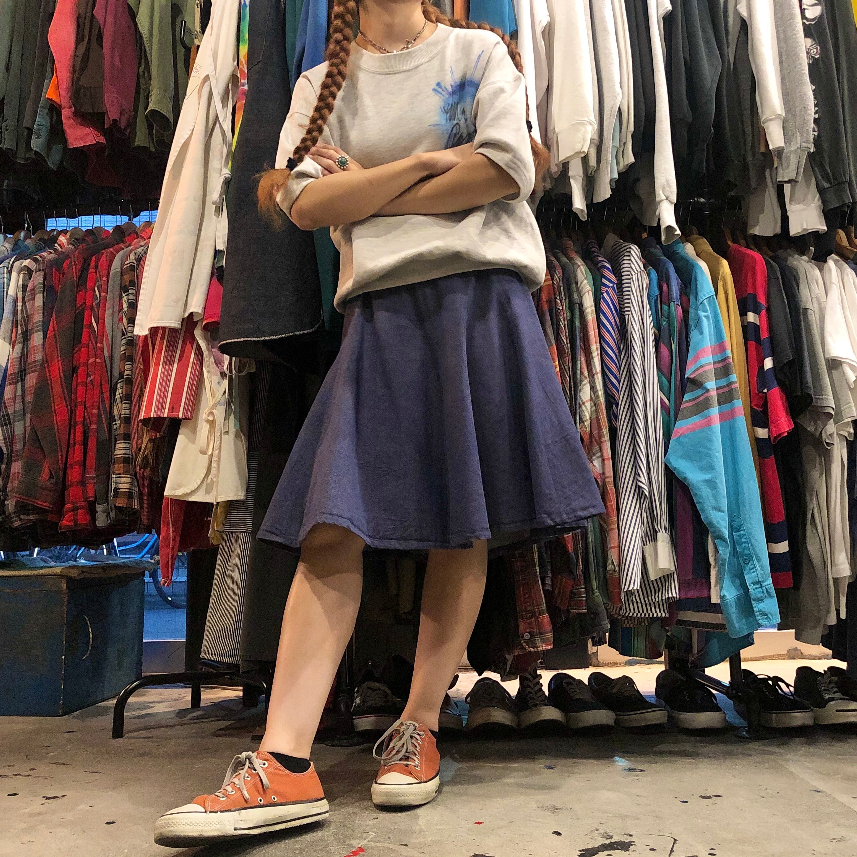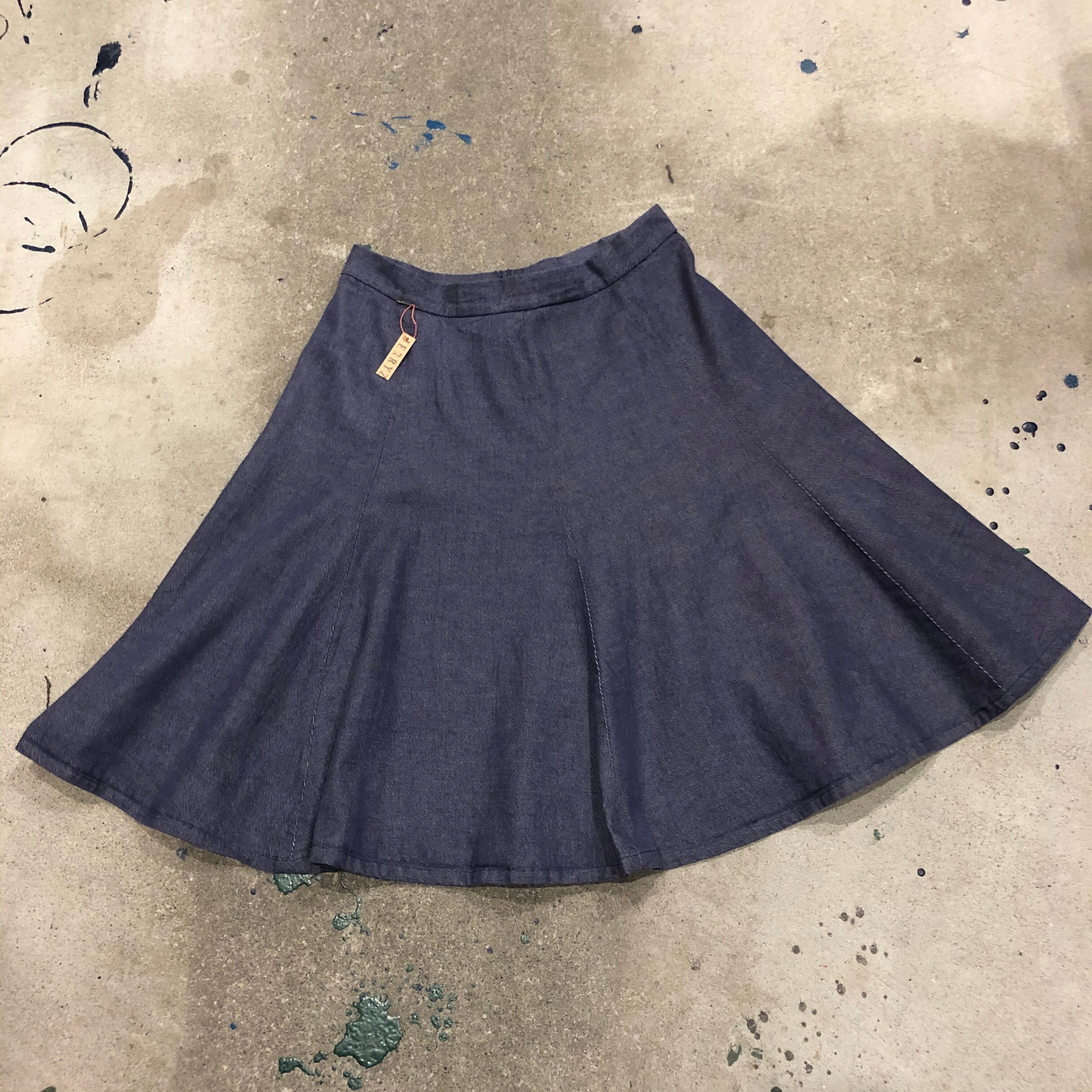 フレアがかわいいハンドメイドのデニムスカートです。紫がかった色と丈の長さが絶妙で良い雰囲気です。デニムなので一年中季節関係なく着られるのも嬉しいですね!