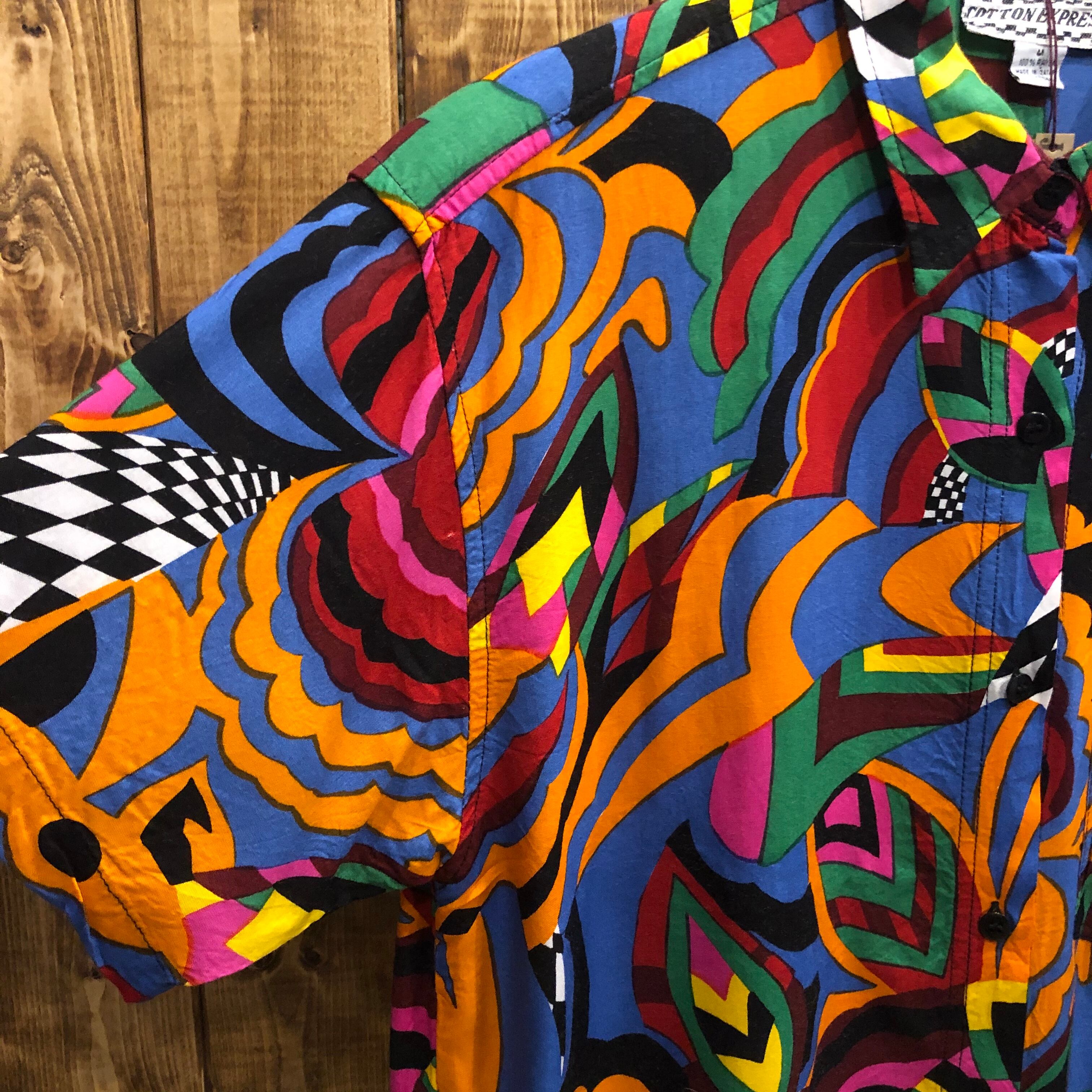 派手でポップで怪しさのある良い感じの雰囲気です。レーヨンなので夏に良い素材ですね!ボーイッシュにもヒッピーな感じに着てもかわいいと思います。