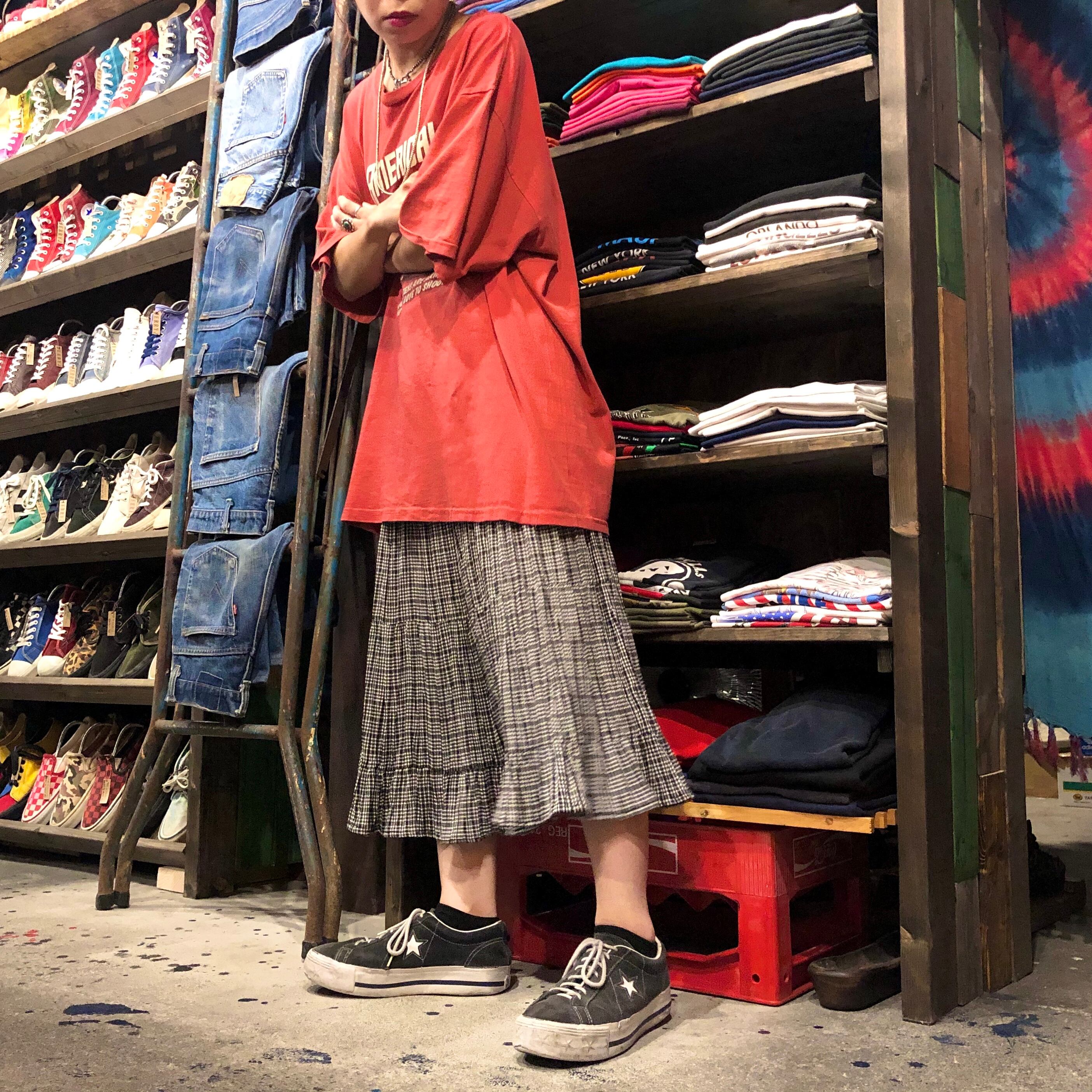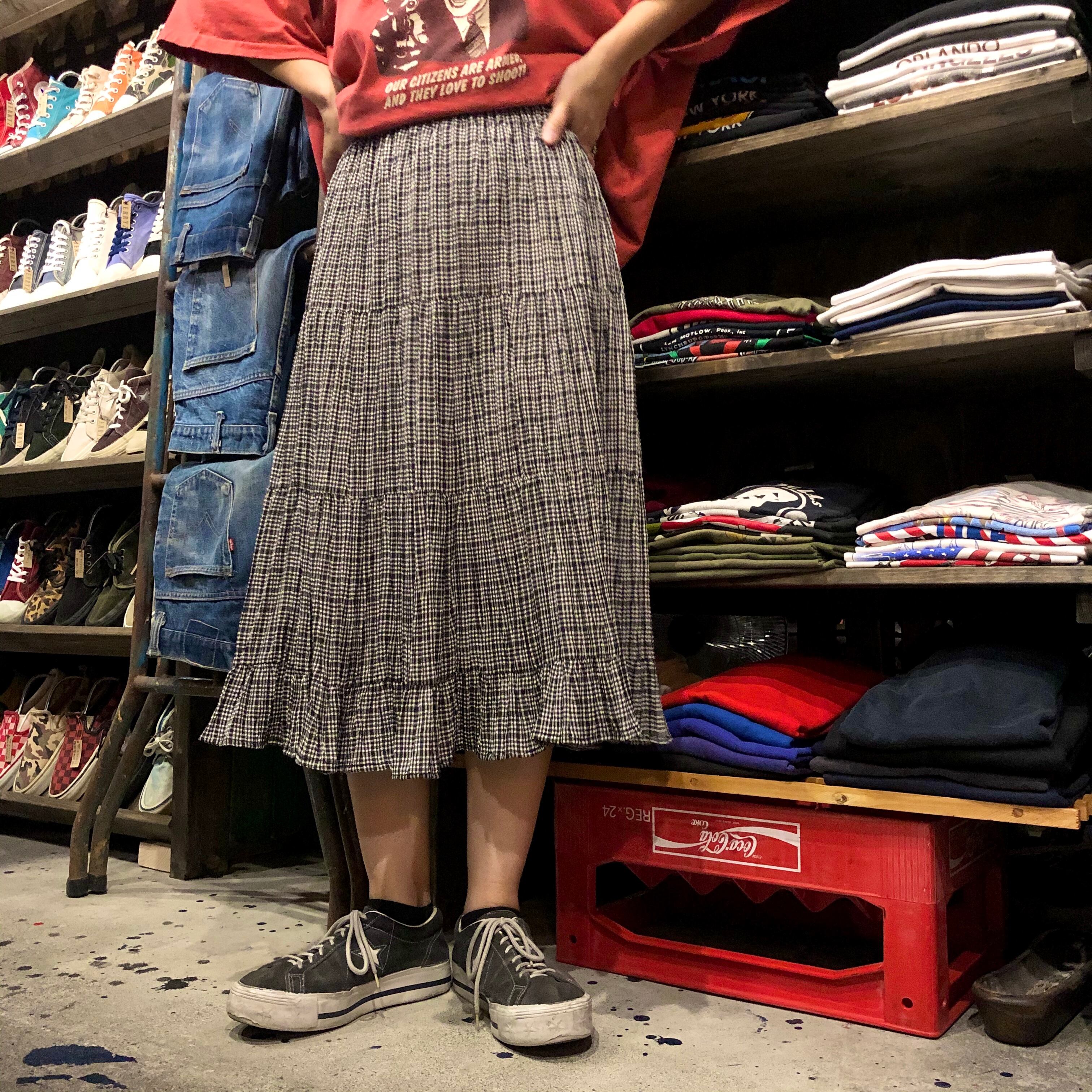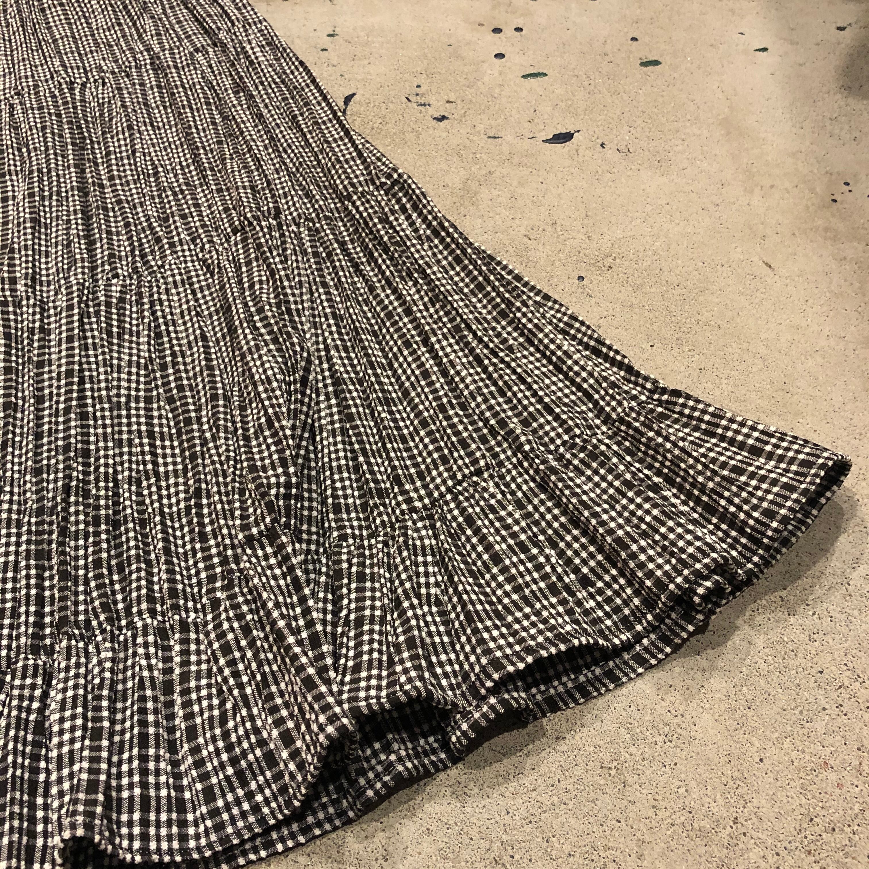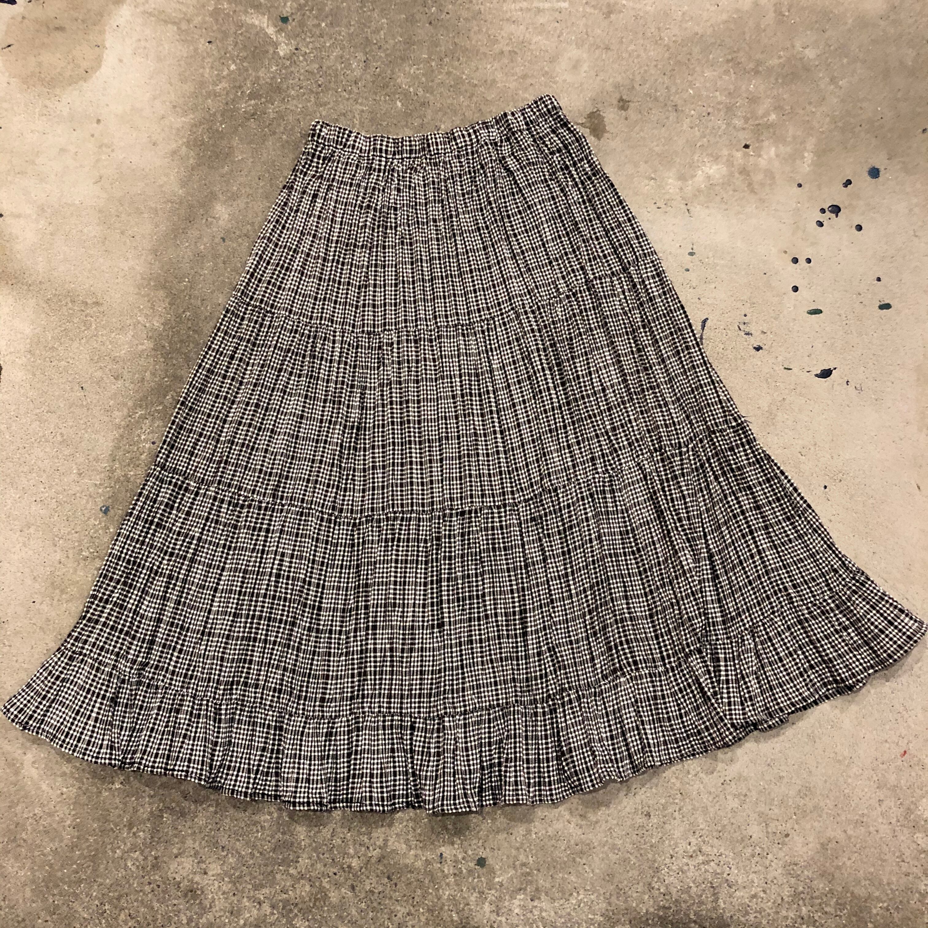白黒の細かいチェックで少し凹凸とハリのある生地感がかわいいスカートです。ティアードなっていますが、あまりボリュームのないすっきりした広がりが大人っぽいかなと思います。