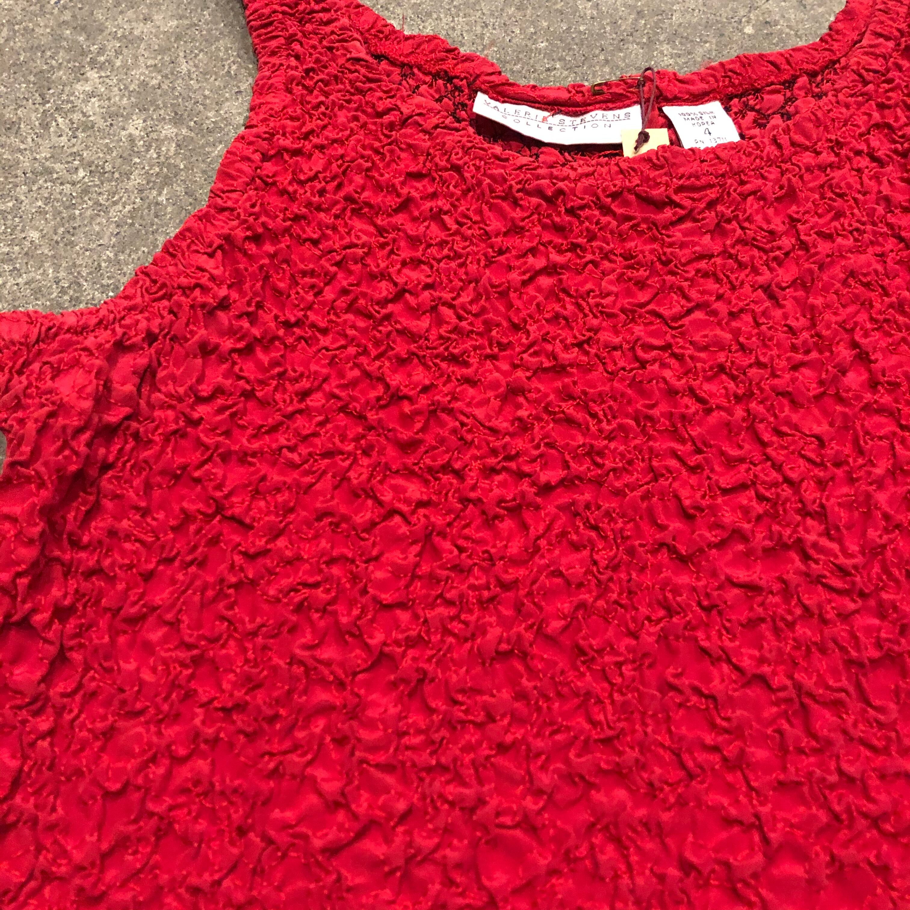 真っ赤なシワ加工がかわいいタンクトップです。ポップコーンほど伸びませんが、似た雰囲気のある感じです。インナーとしても一枚で来ても存在感がありシンプルになりすぎないところが良いですね!