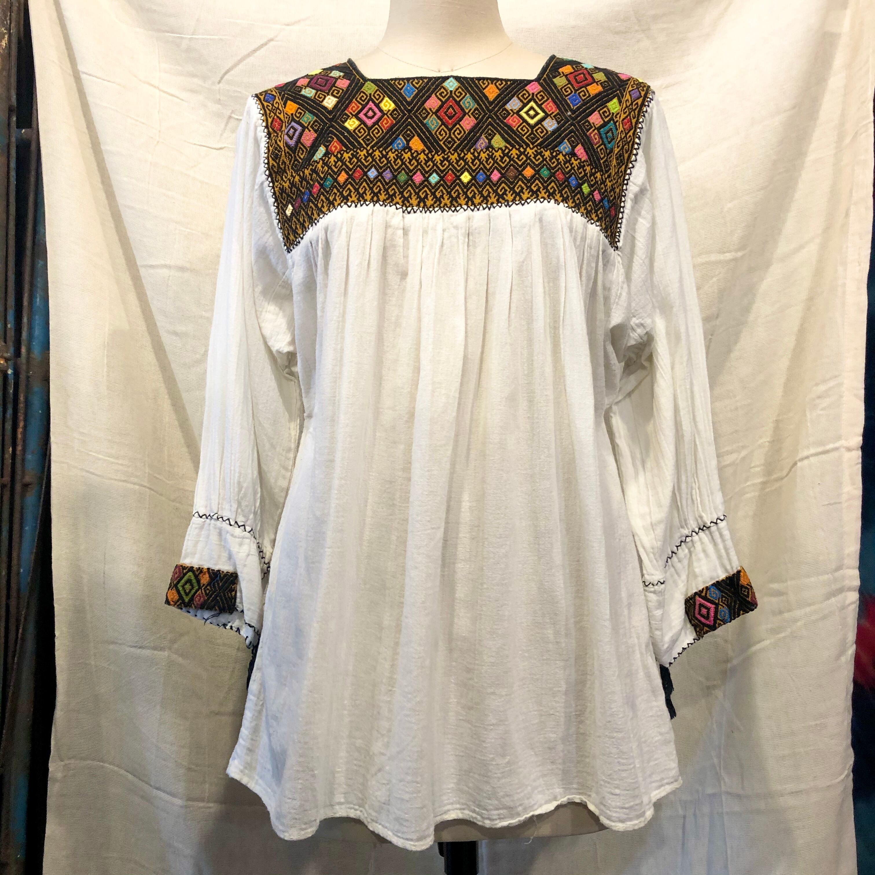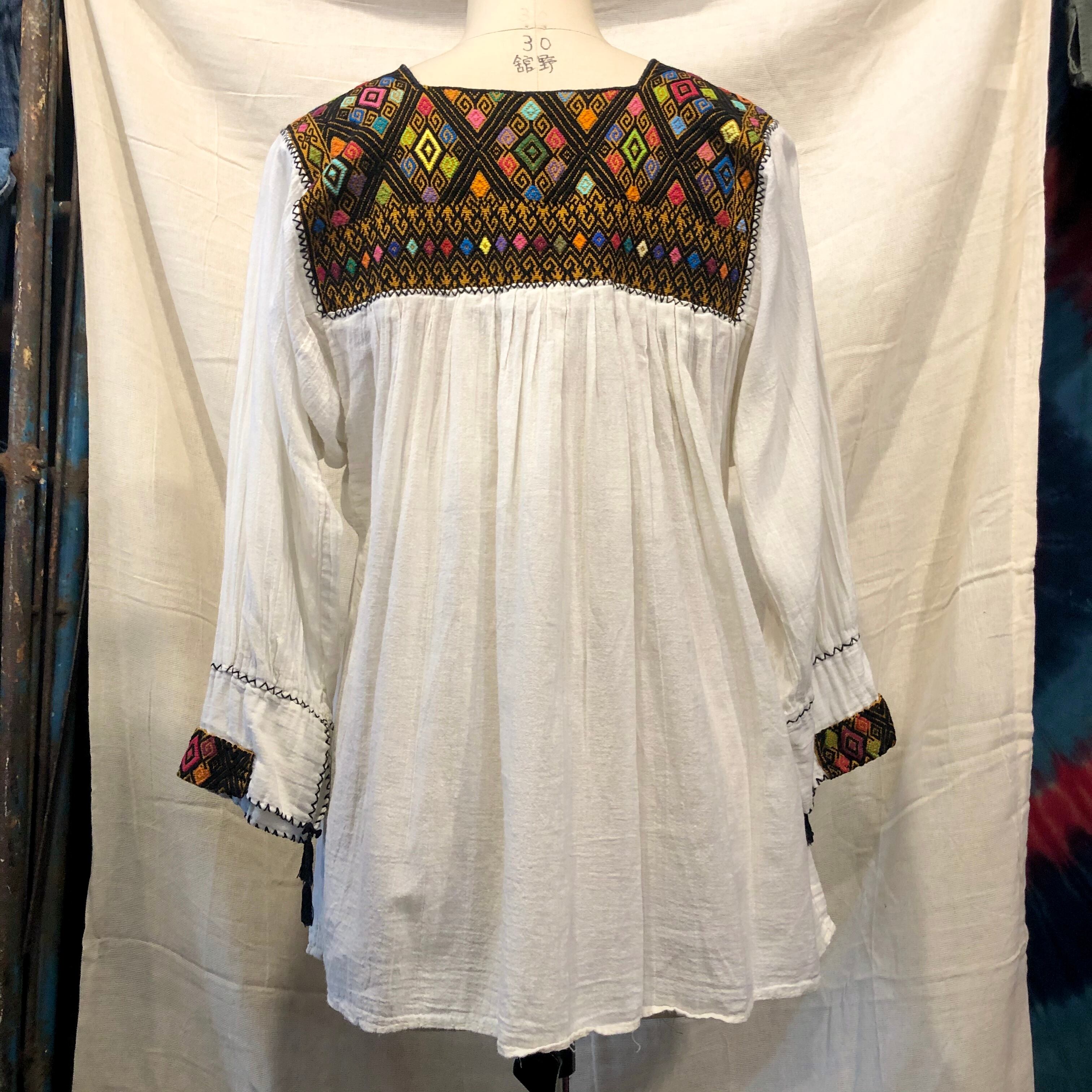 どうなっているのかわからない細かな織地と手刺繍がかっこいいチュニックです。生成りのガーゼ部分もすべて手縫いで仕立てられていて温かみを感じます。薄手でサラッと涼しいので真夏にもおすすめです!