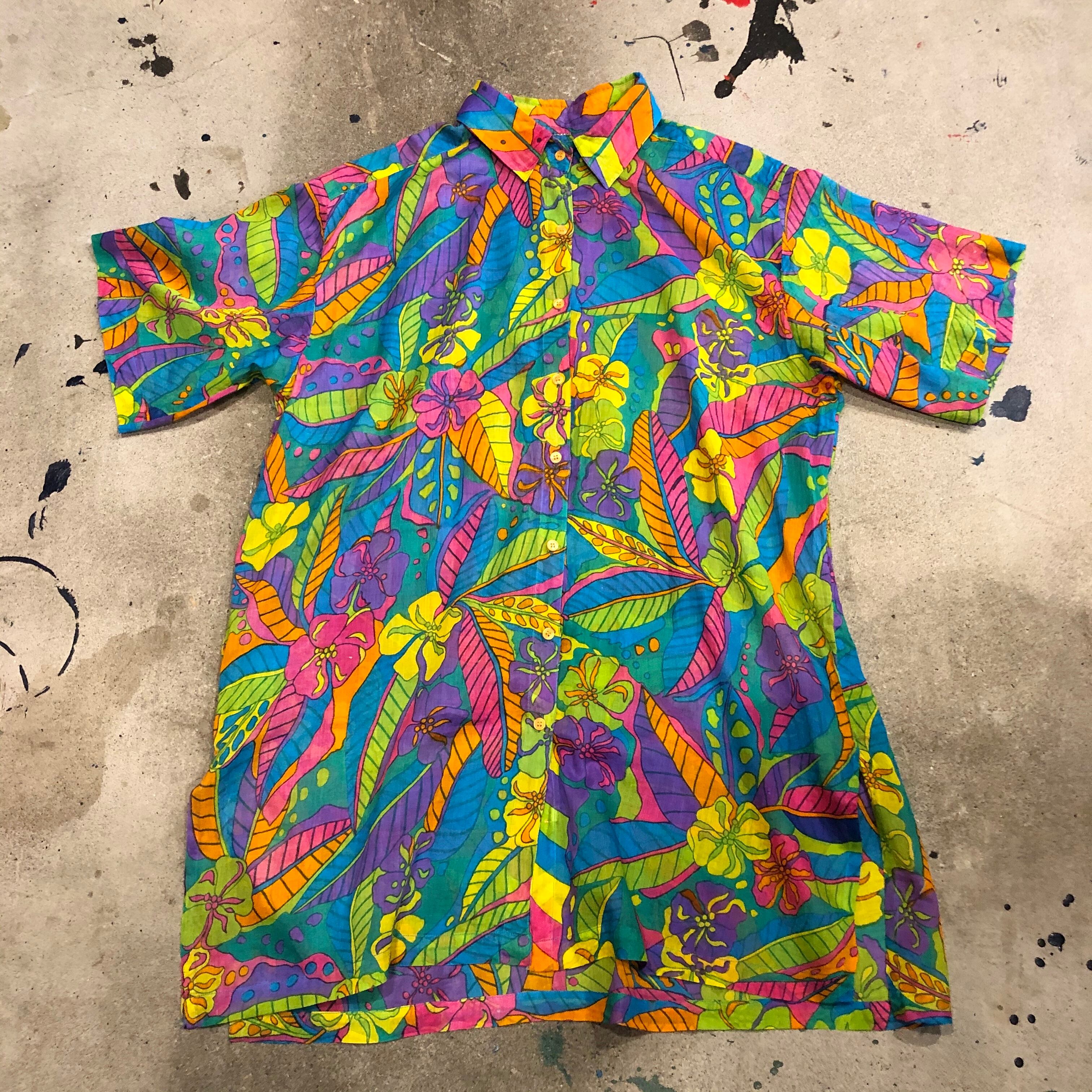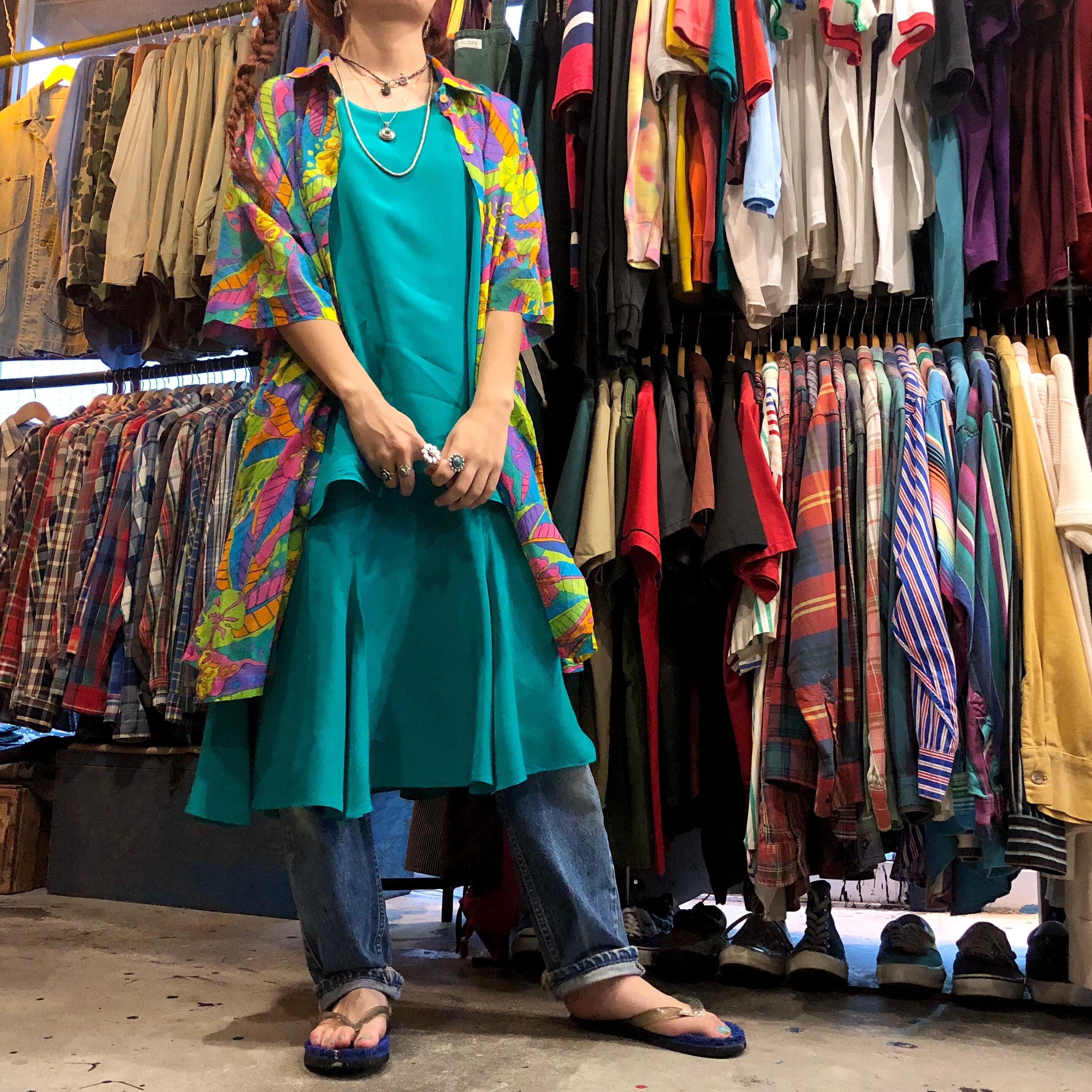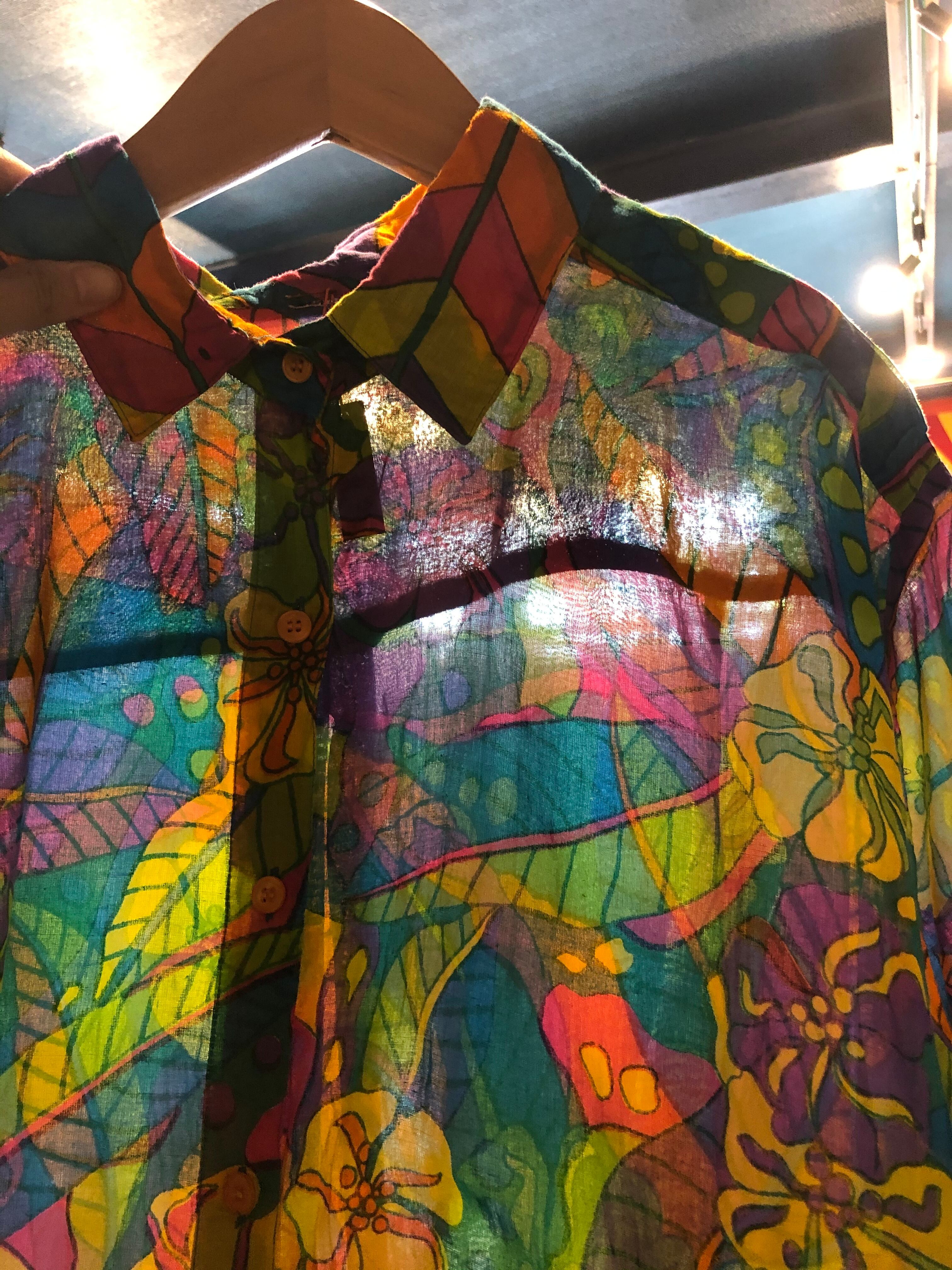 南の島感とサイケデリック感が漂うシースルーのシャツです。夏の気分にぴったりの弾けたカラーリングもかわいいです。丈がかなり長めなので中にショーパン履いてワンピースっぽく着ても良いですね!