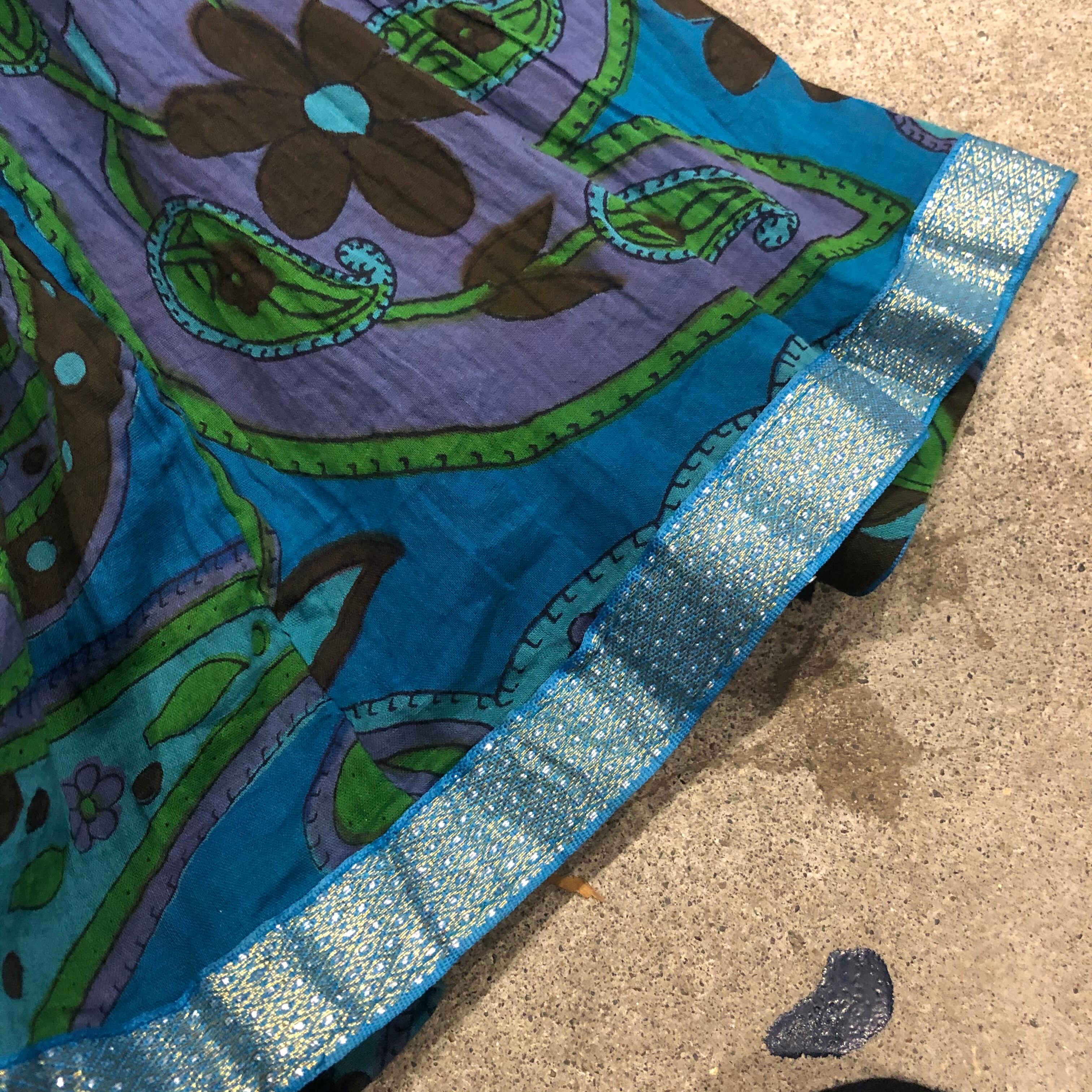 薄いコットンが夏にぴったりなロングスカートです。ゆるいペイズリーのような柄とお花がかわいいです。裾にはきらっとラメのテープがついており陽の光に当たるときれいです。薄くて軽くて涼しくて楽ちんでTシャツにあわせるだけで雰囲気の出るアイテムだと思います。