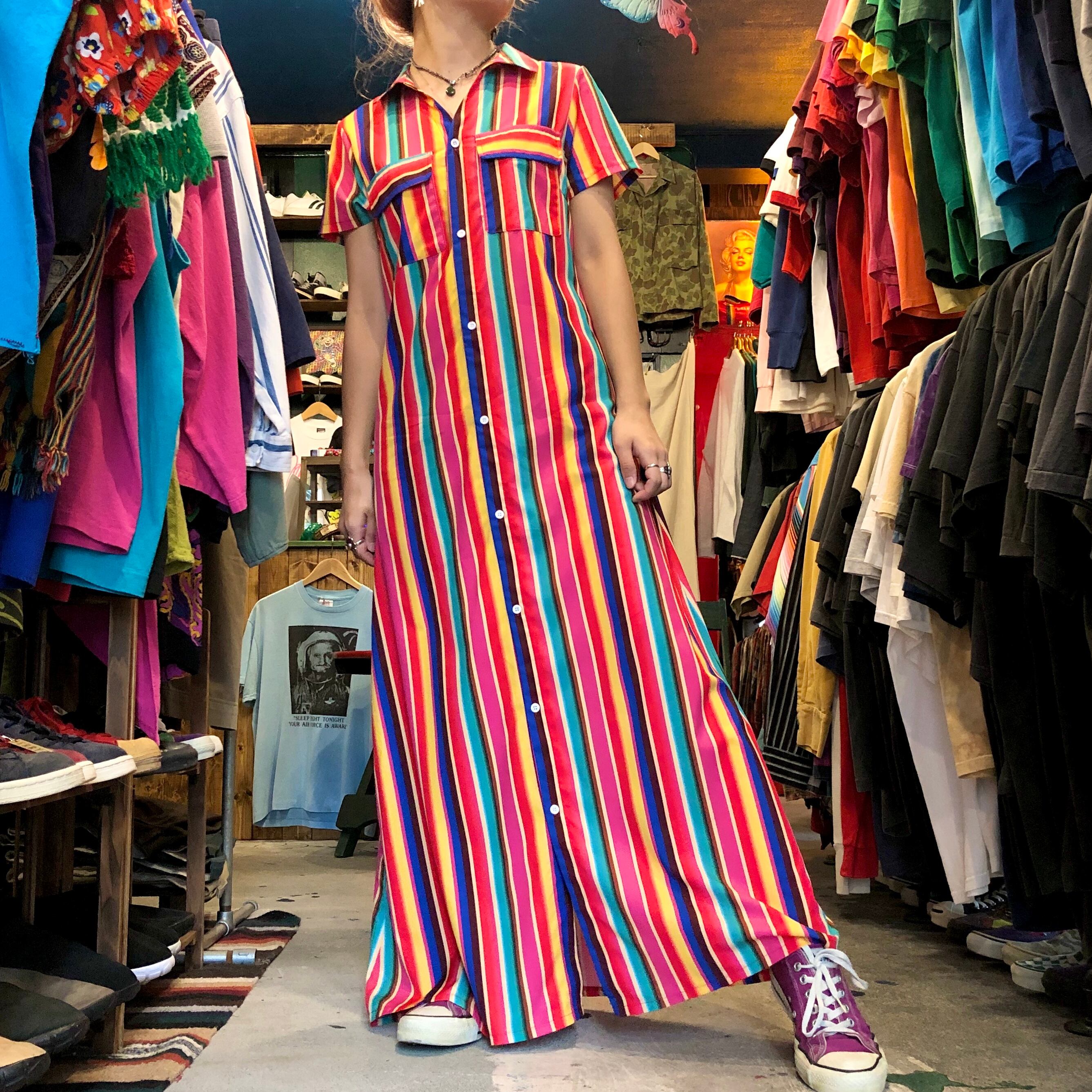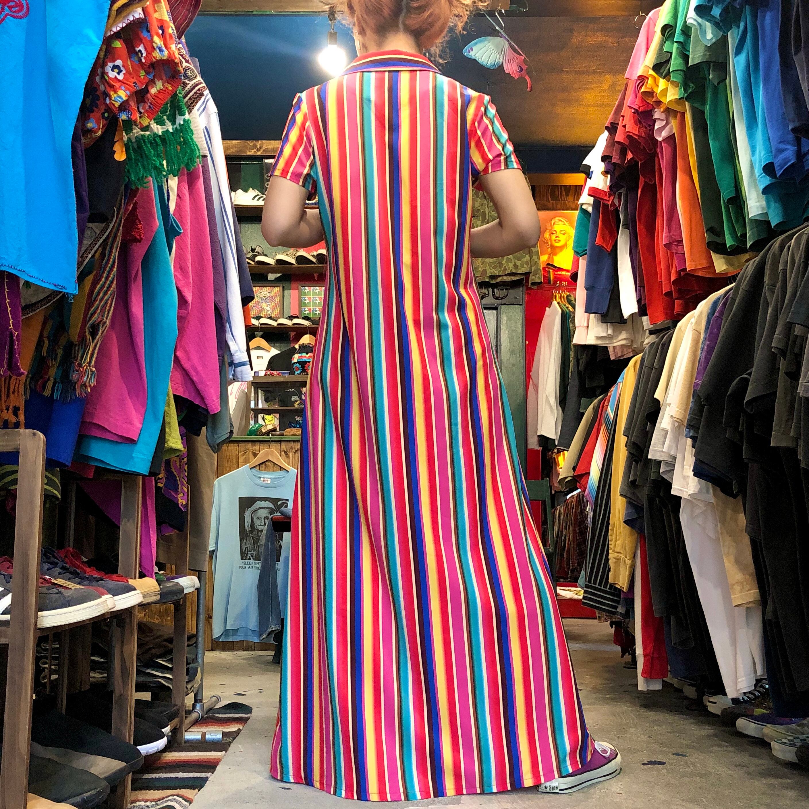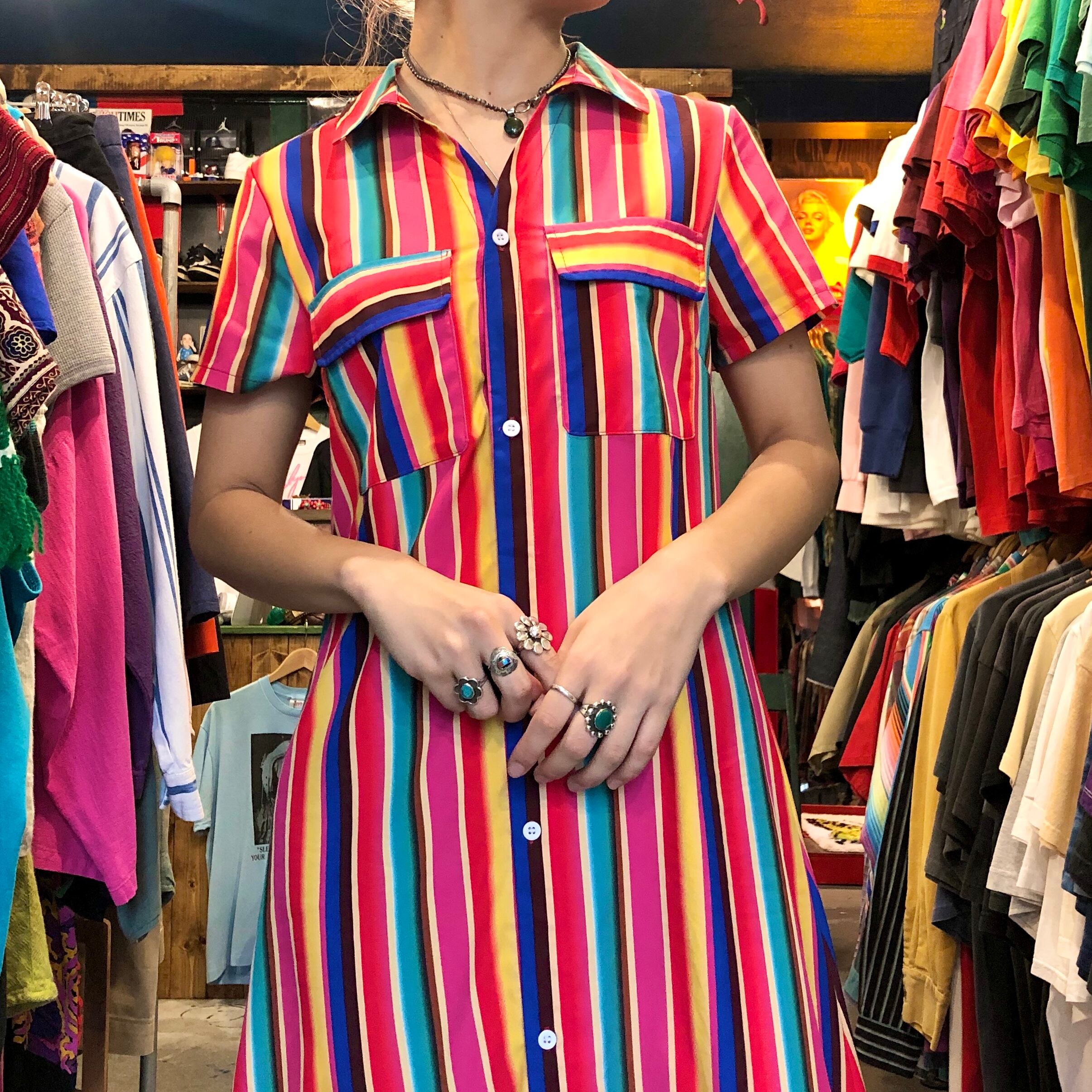 ハッピーなカラーリングがとってもかわいいワンピースです。開襟シャツで大人っぽいシルエットなので、かわいらしくなりすぎずポップな雰囲気で着られて良い感じです。前開きなので羽織のように着てもかわいいと思います!