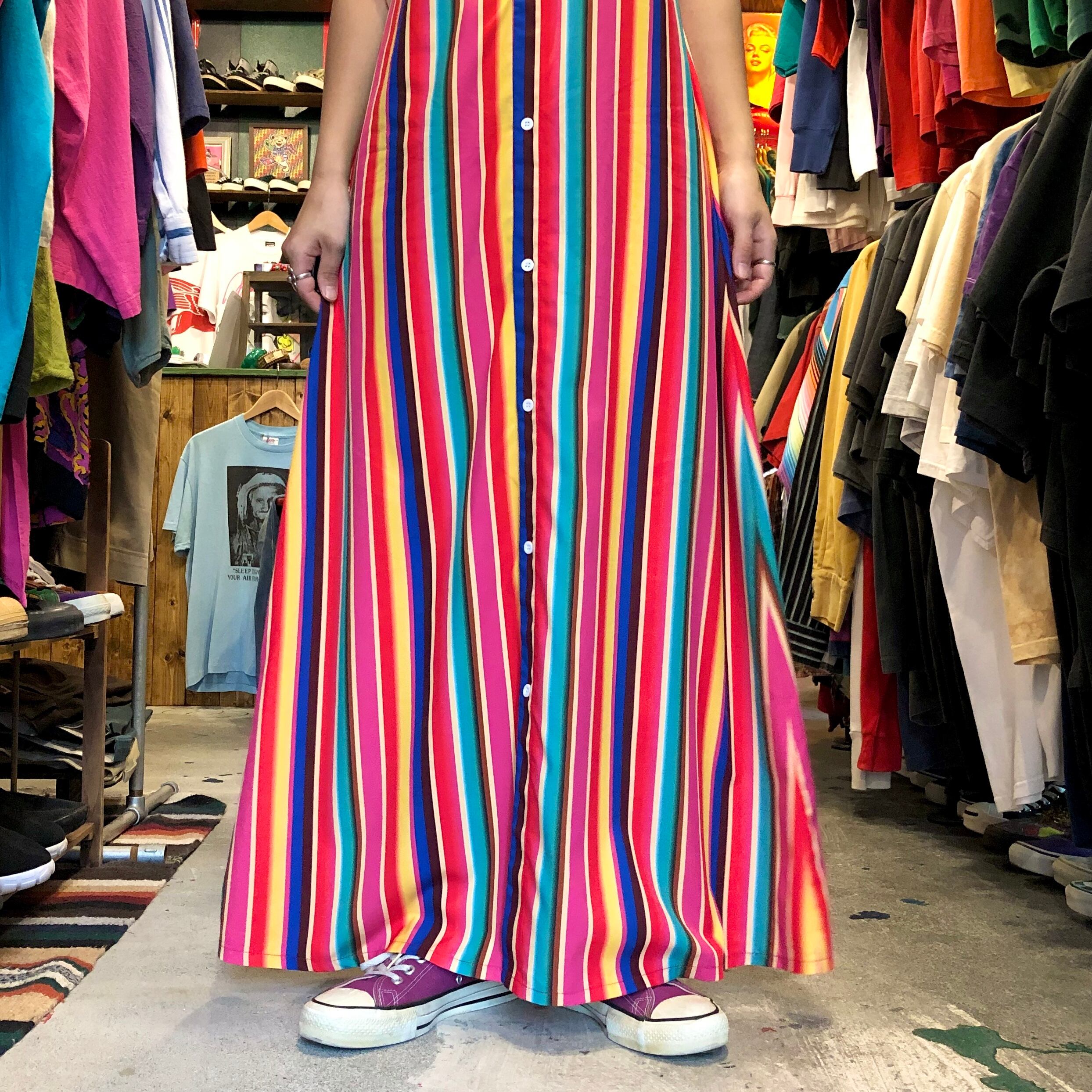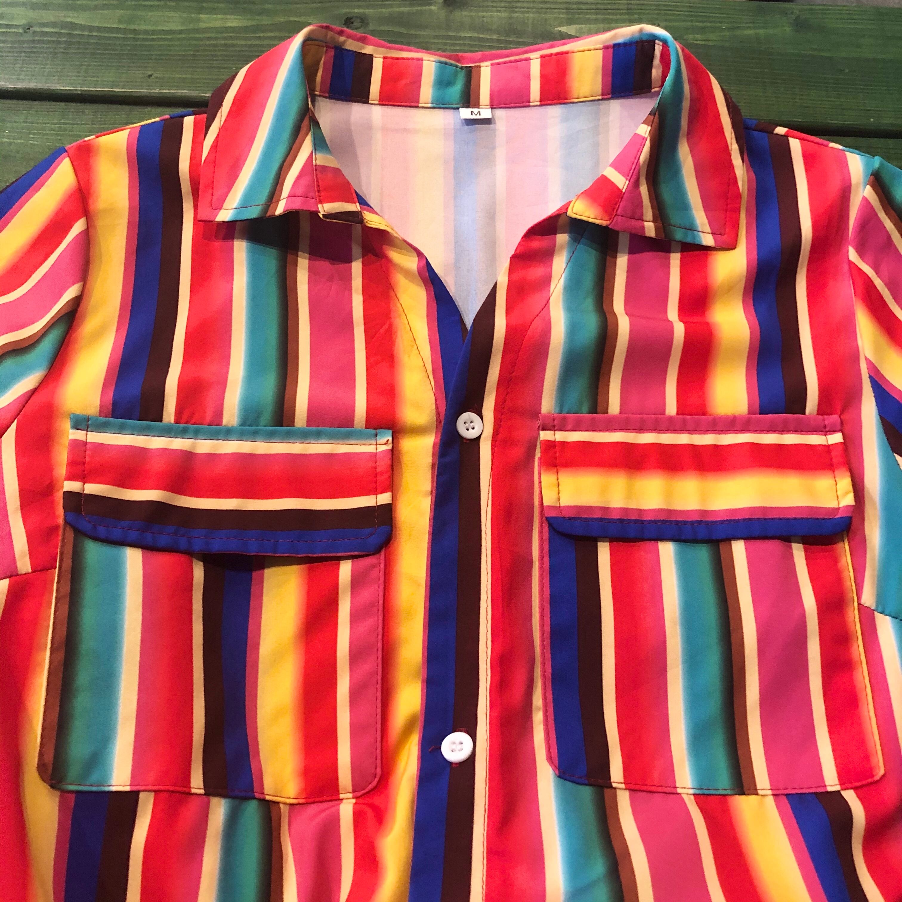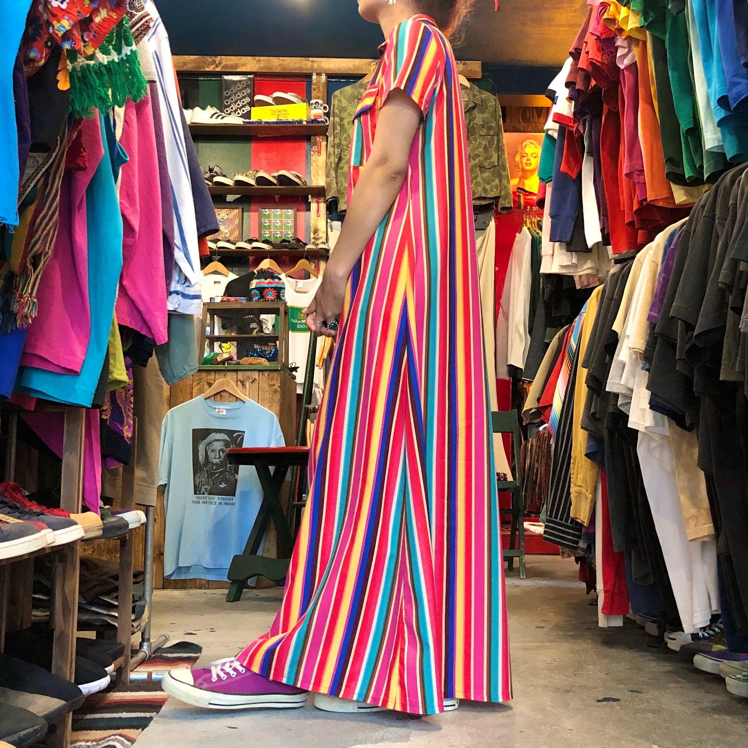ハッピーなカラーリングがとってもかわいいワンピースです。開襟シャツで大人っぽいシルエットなので、かわいらしくなりすぎずポップな雰囲気で着られて良い感じです。前開きなので羽織のように着てもかわいいと思います!