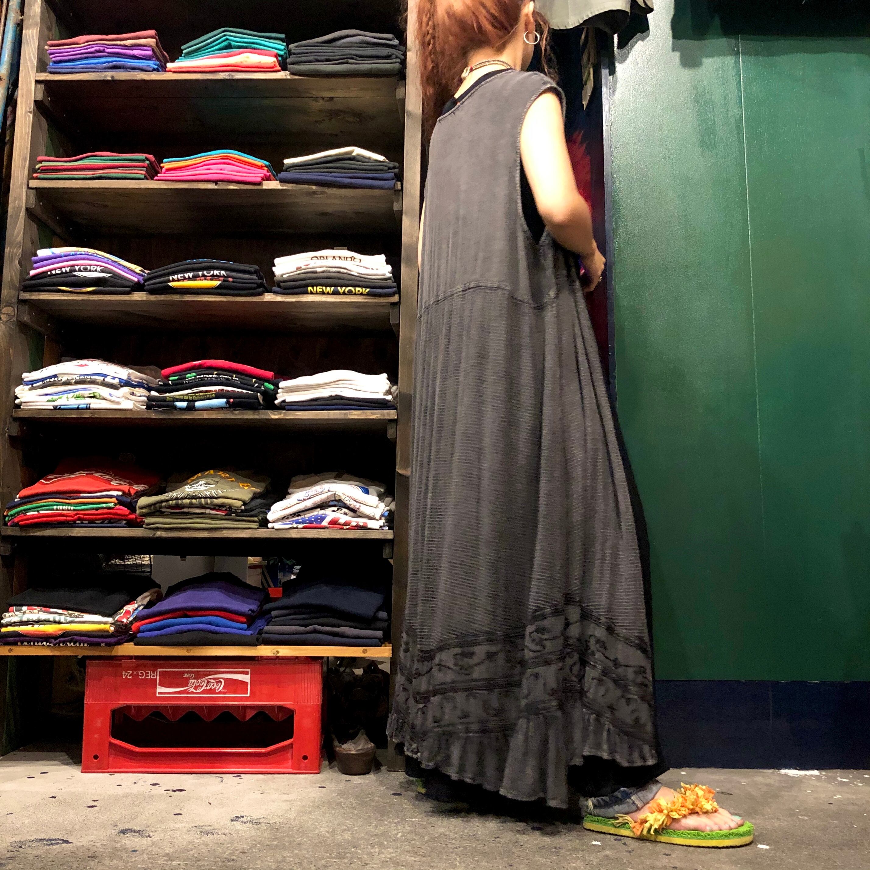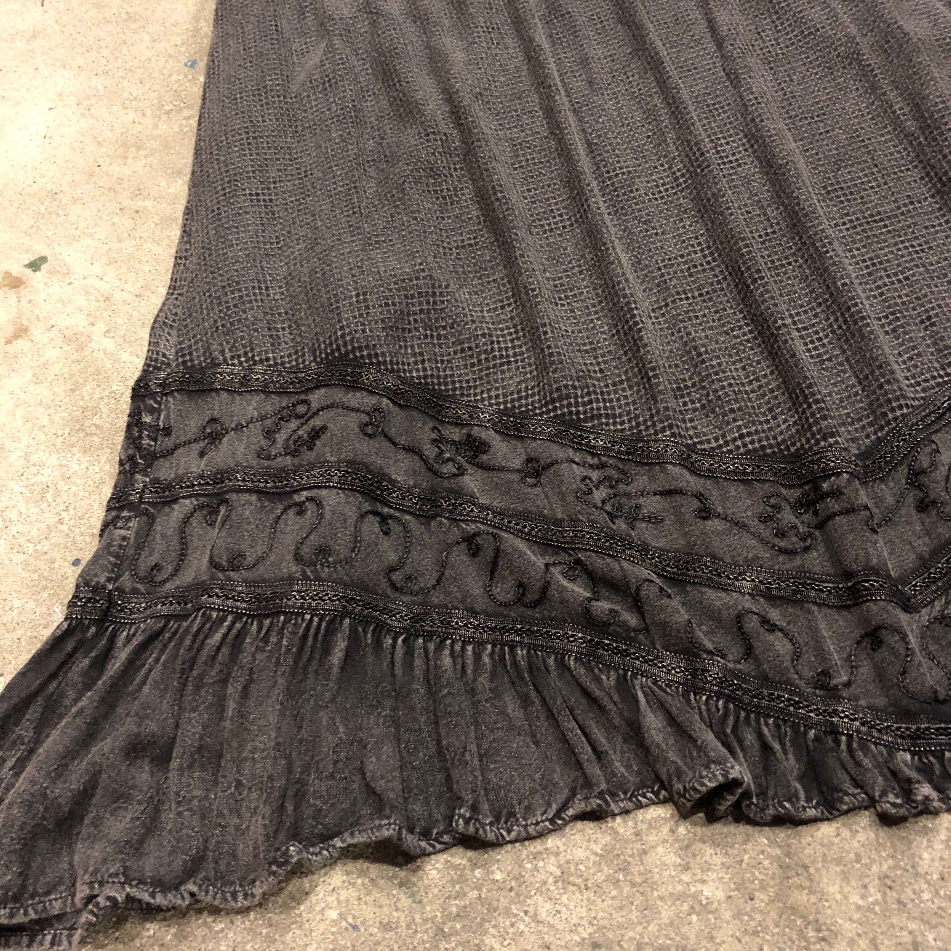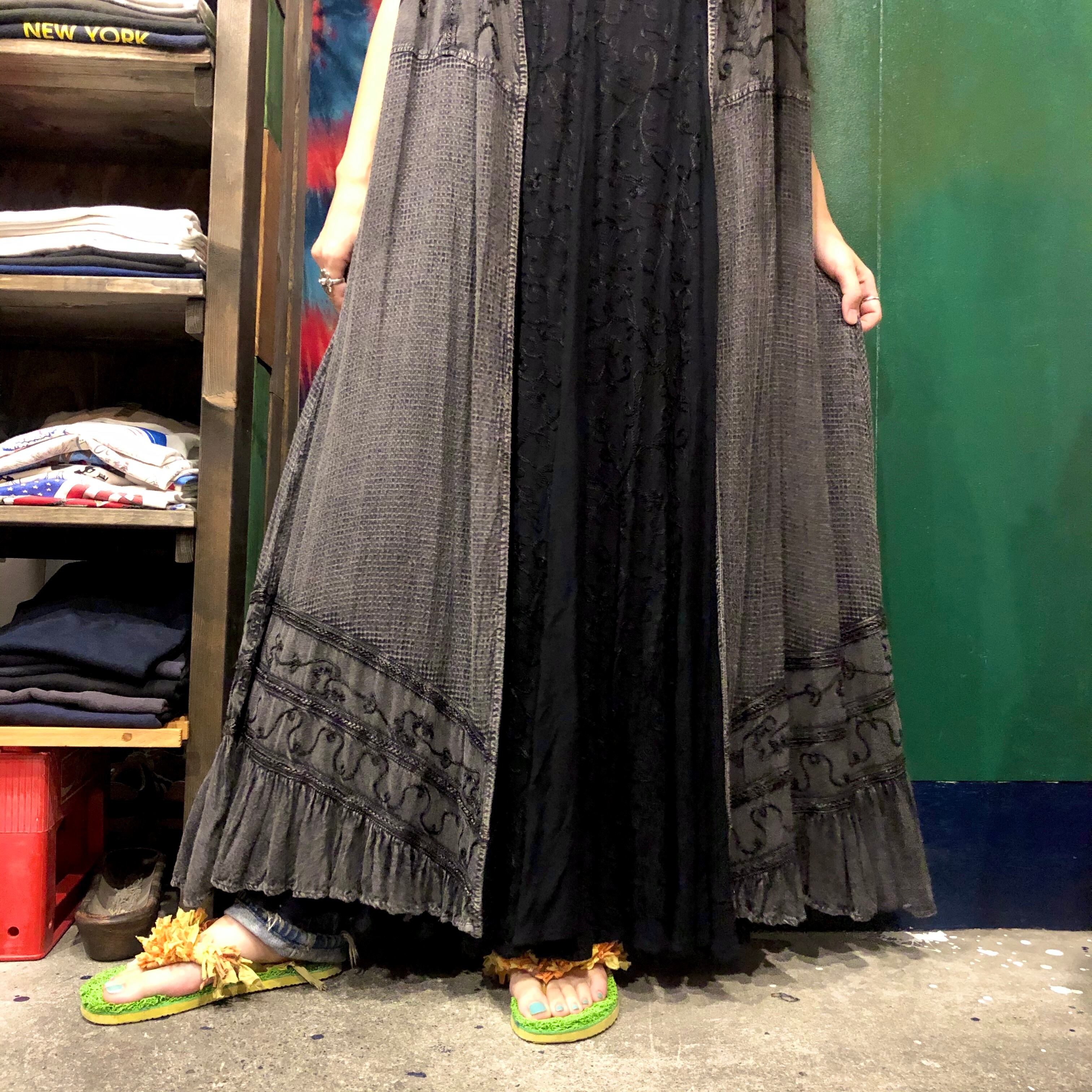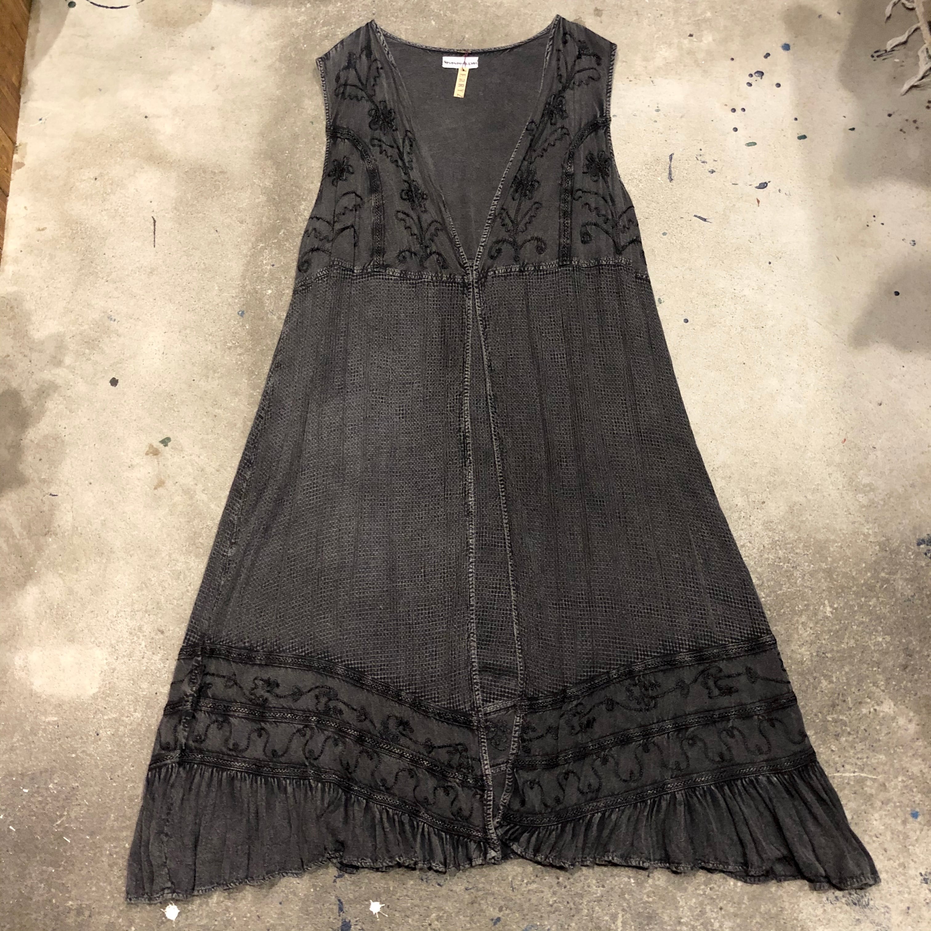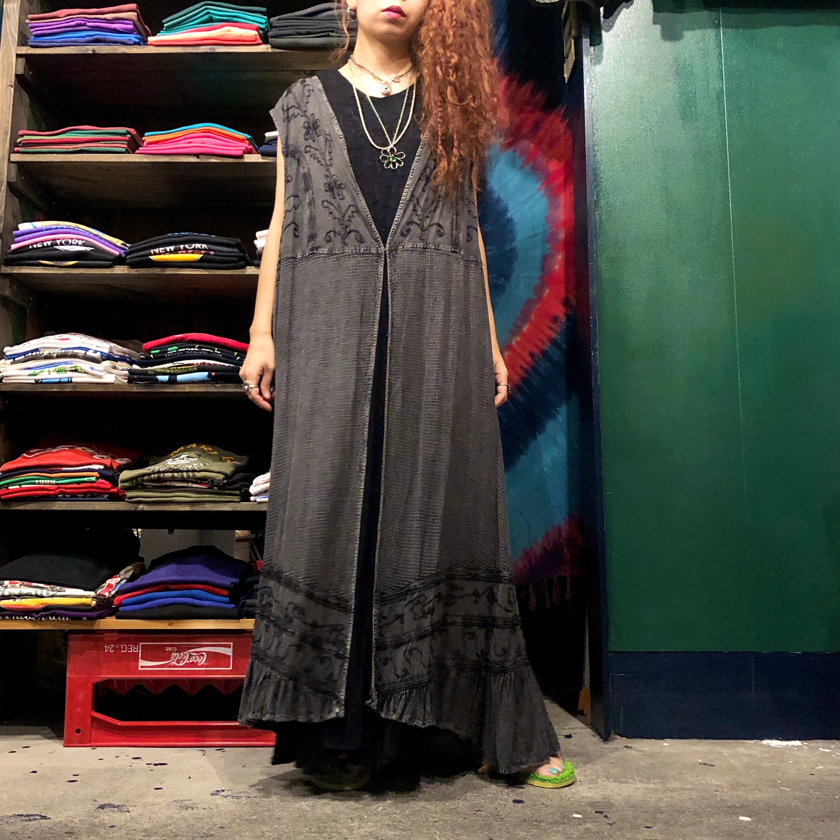 刺繍とフリルで可愛らしいデザインですが黒が色あせた良い雰囲気の色で、かわいくなりすぎず着ていただけるロングジレです。