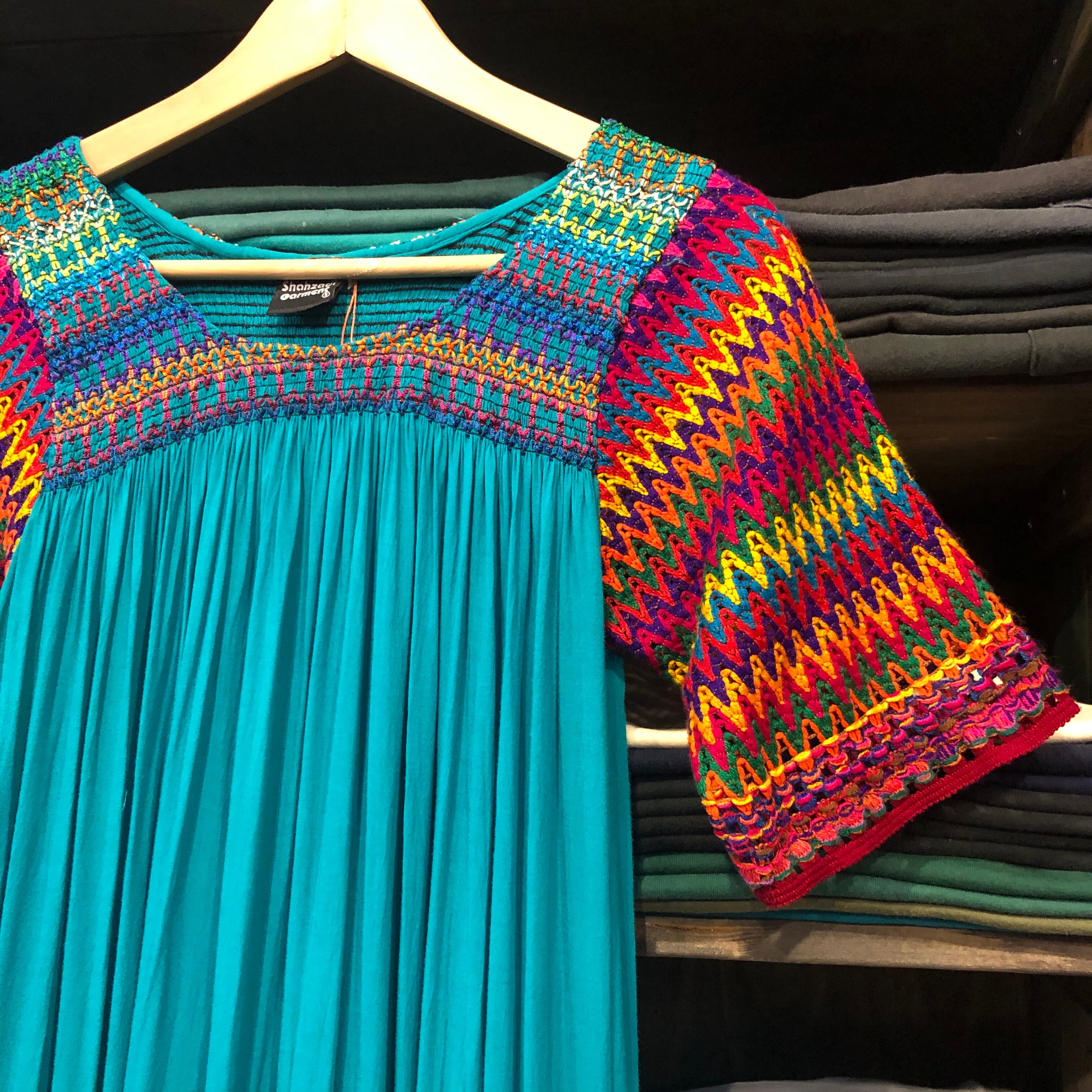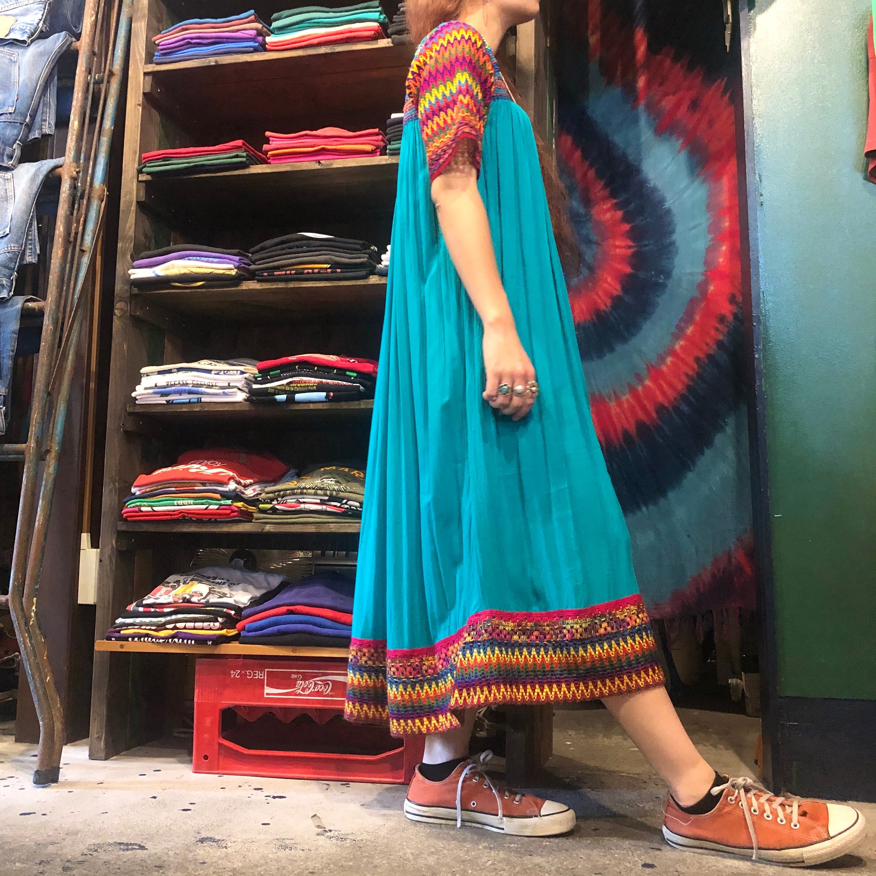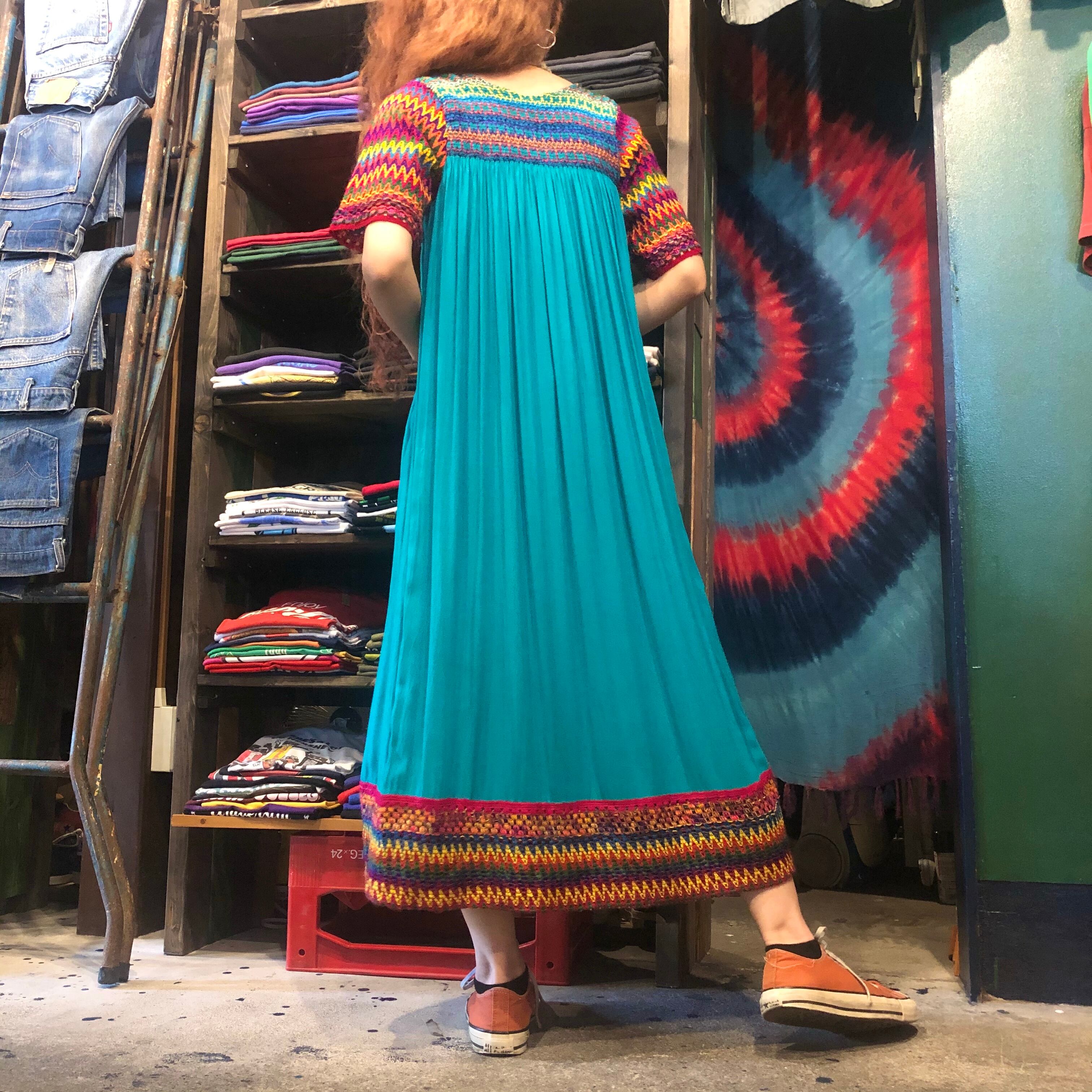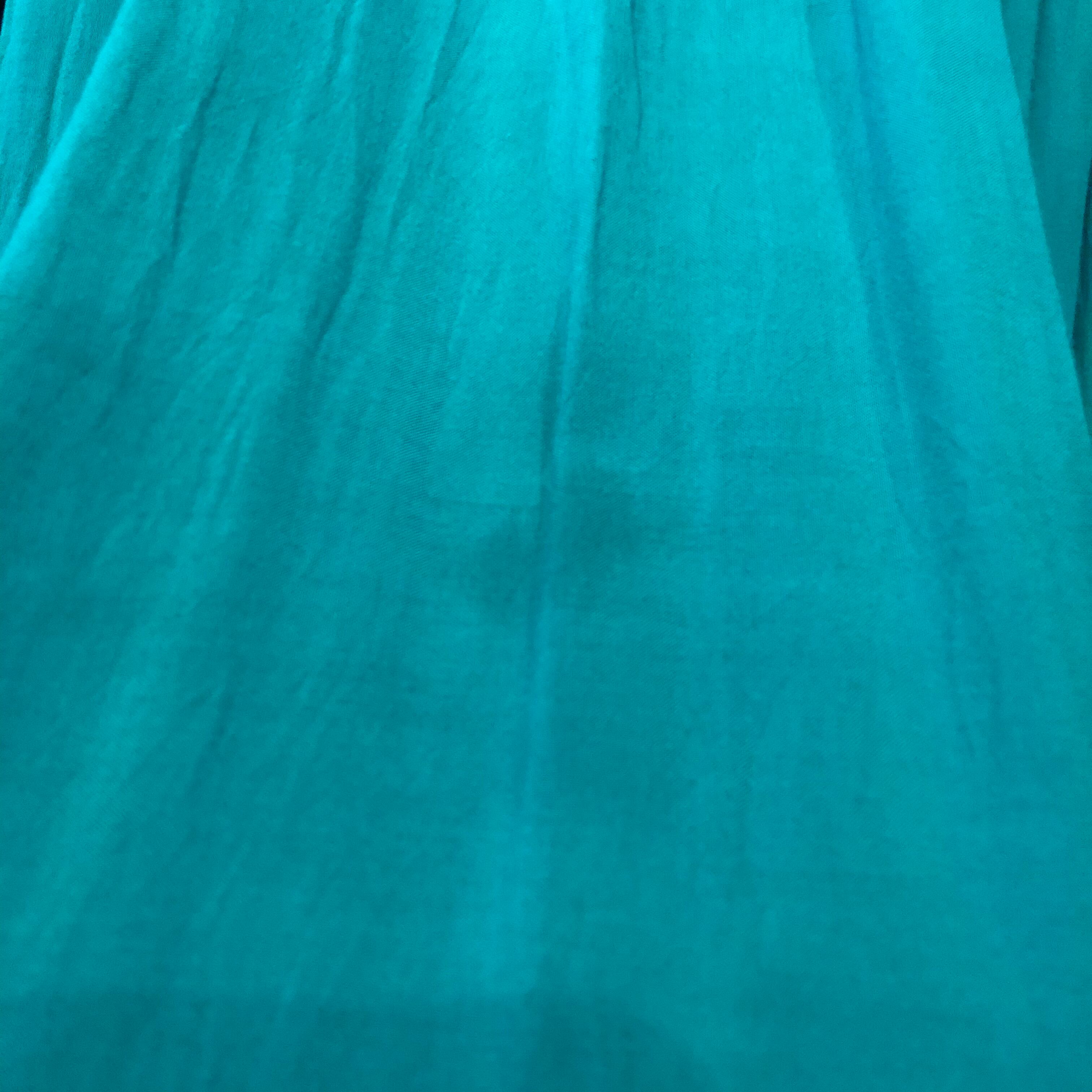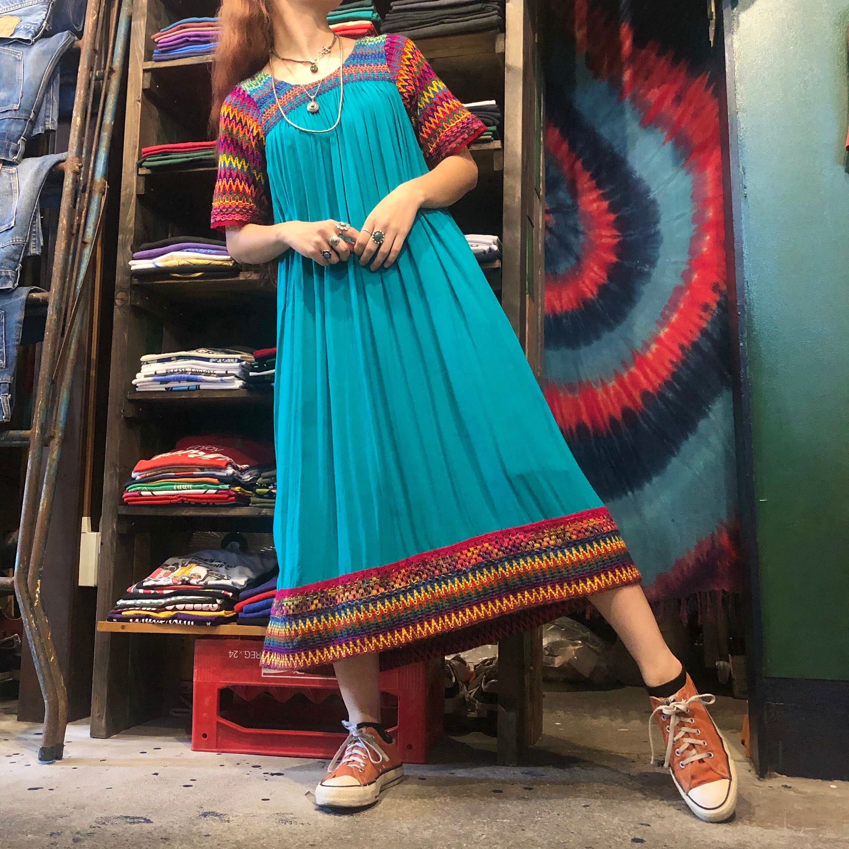 袖と裾のインパクトのあるニット素材や胸元のシャーリングがかわいいワンピースです。その他はシンプルにエメラルドグリーン一色で、暑い日に着たい一着です。若干透けるので、中にデニムやロングスカートを合わせてもかわいいと思います。