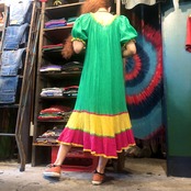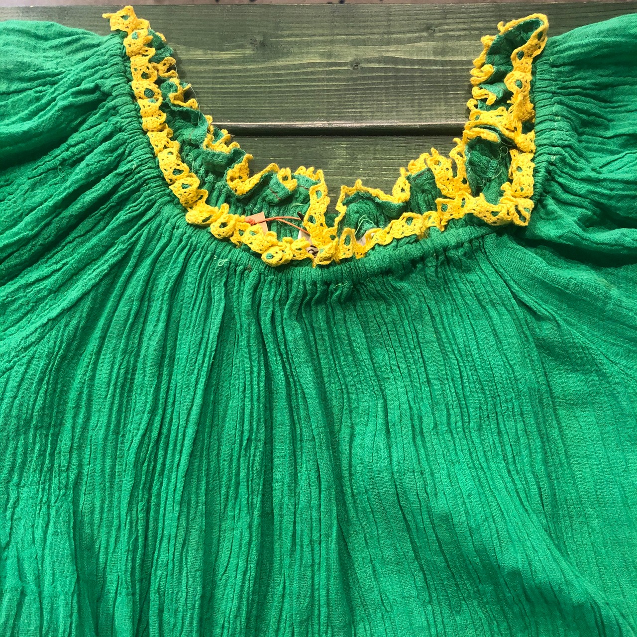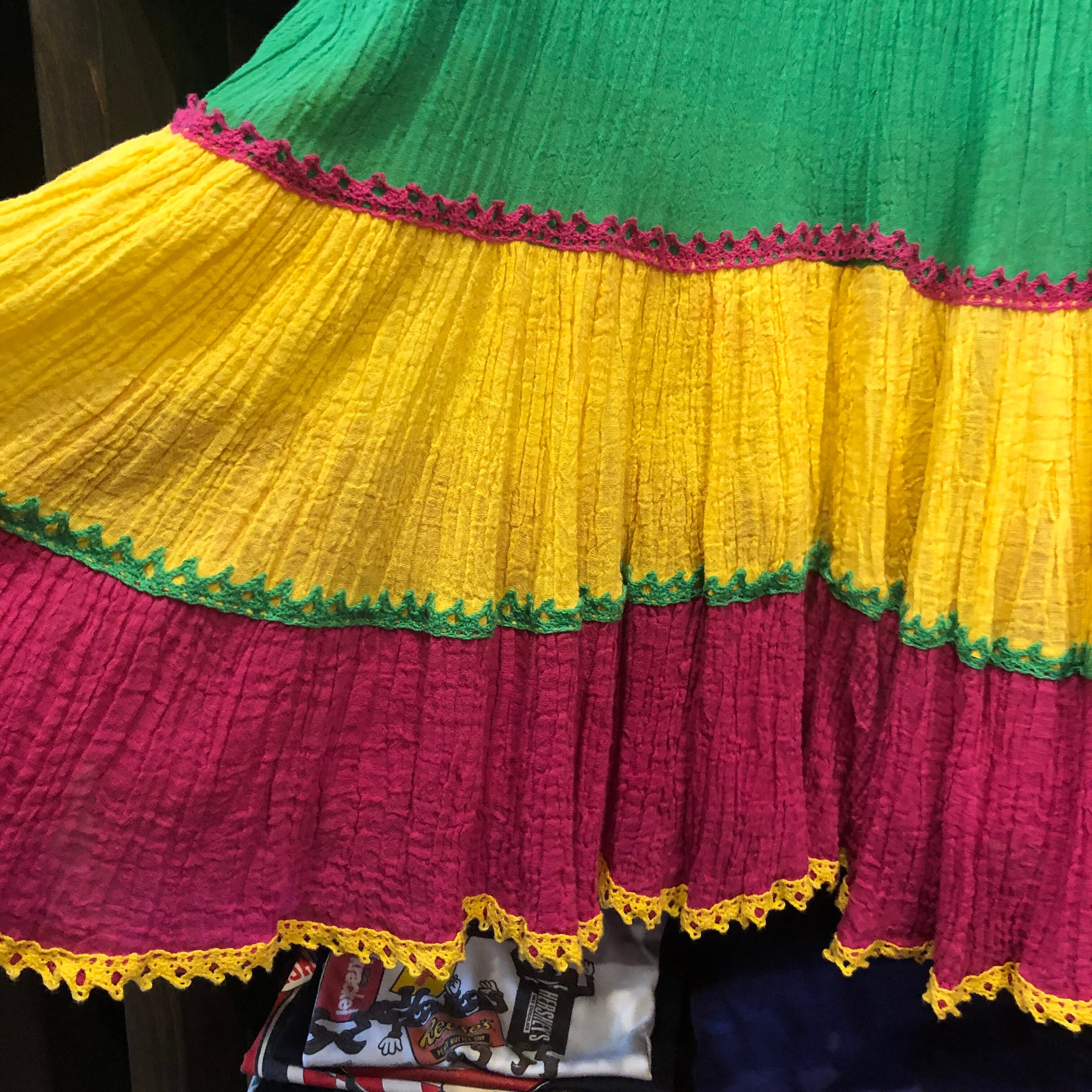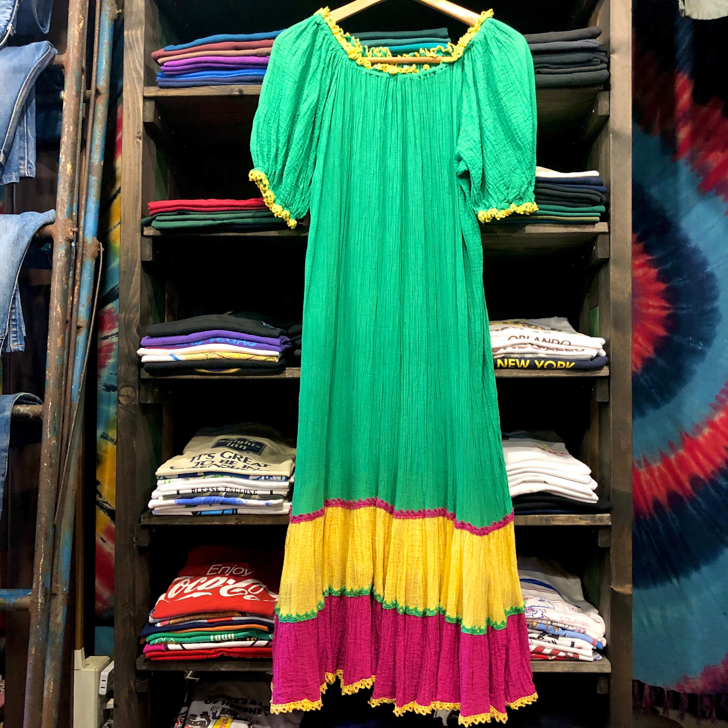 トロピカルなカラーリングがかわいいワンピースです。それぞれのカラーのコットンレースもポイントになってかわいらしいです。ガーゼのような薄手のコットンで、とても涼しくて軽く夏におすすめです。襟ぐりもゴムになっているので、オフショルダーにして肩出してもかわいいです。