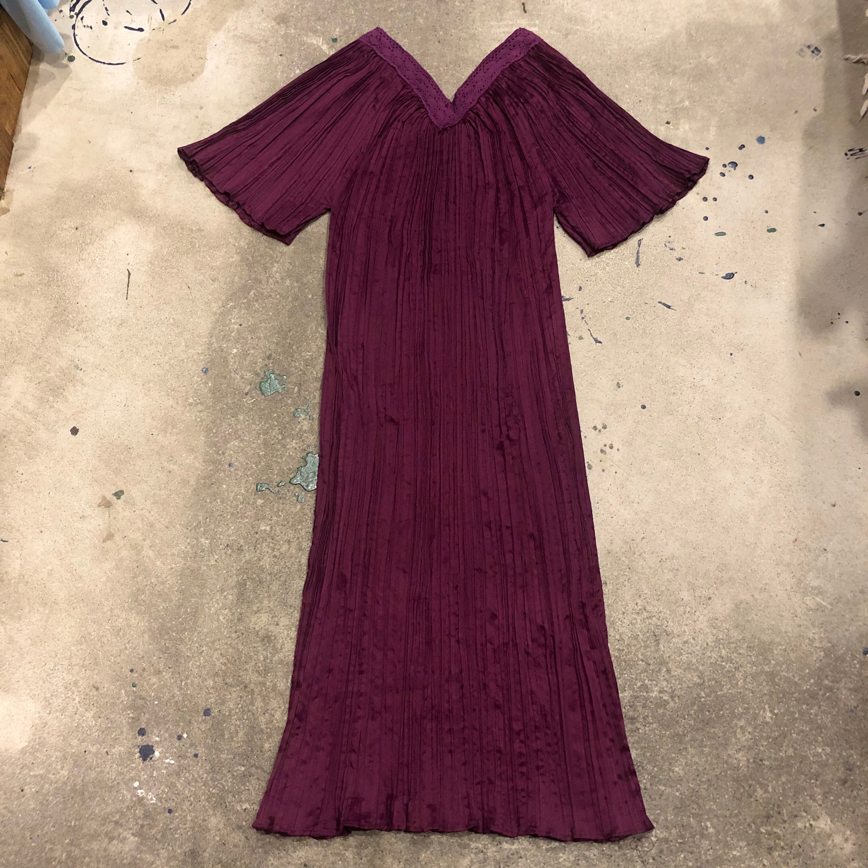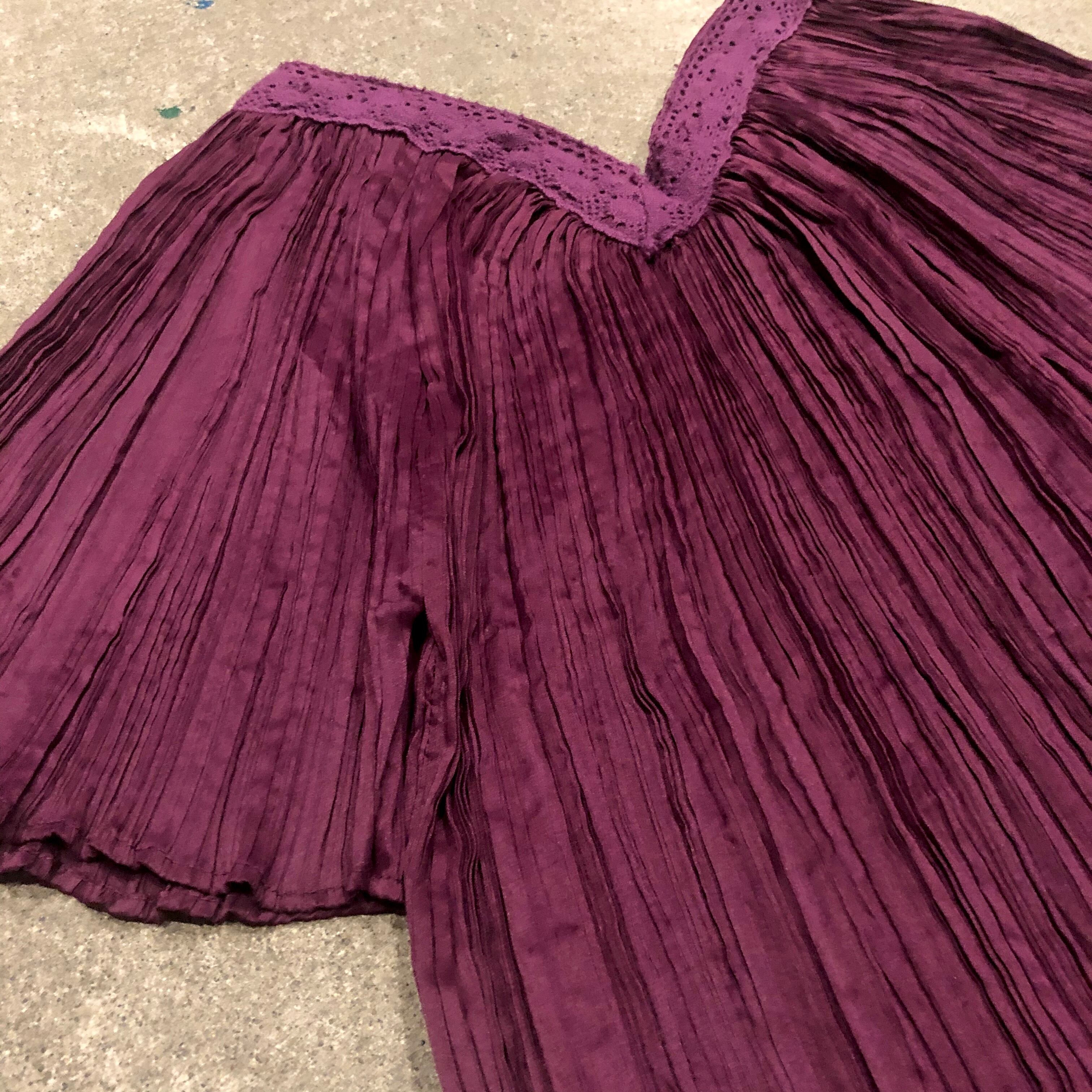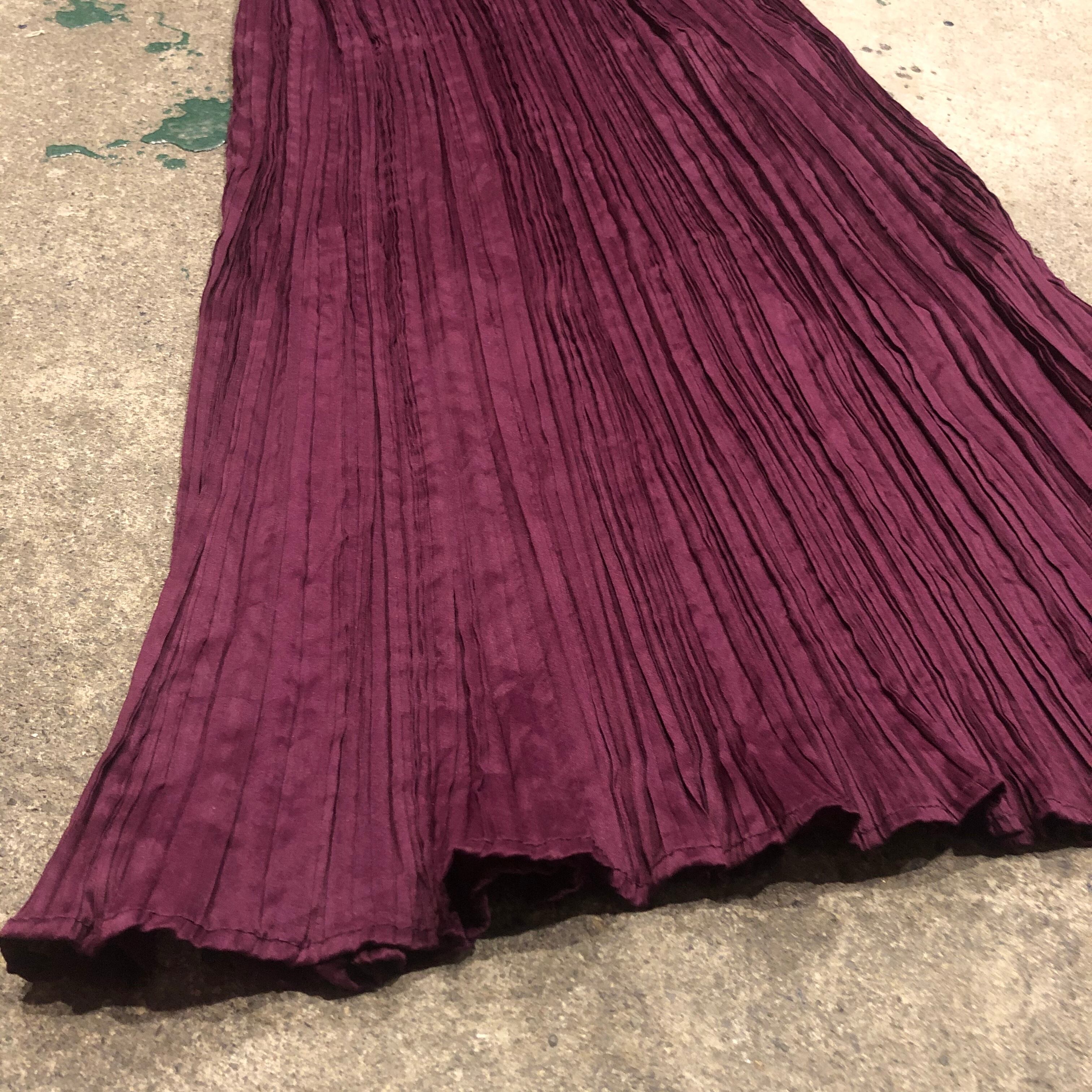 全体がアコーディオンプリーツになっており、光沢のあるポリエステルがさらに大人な雰囲気を出しています。細かいプリーツが閉じた状態なので伸縮性はありますが、着るとシュッとしたシルエットになるところも素敵です。