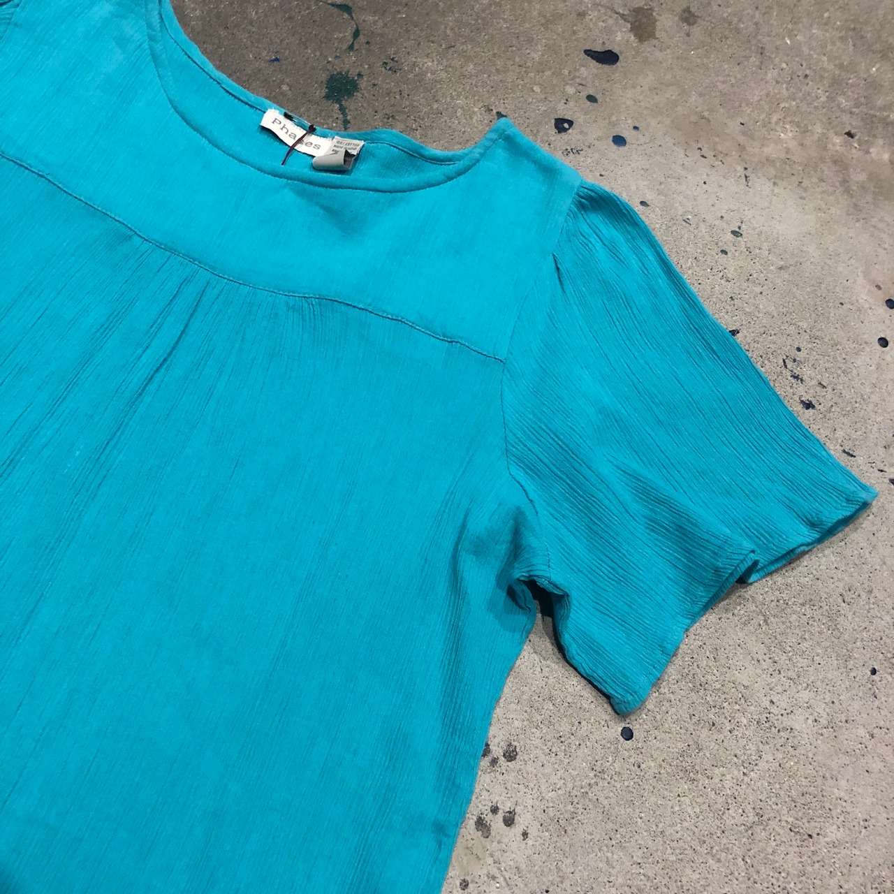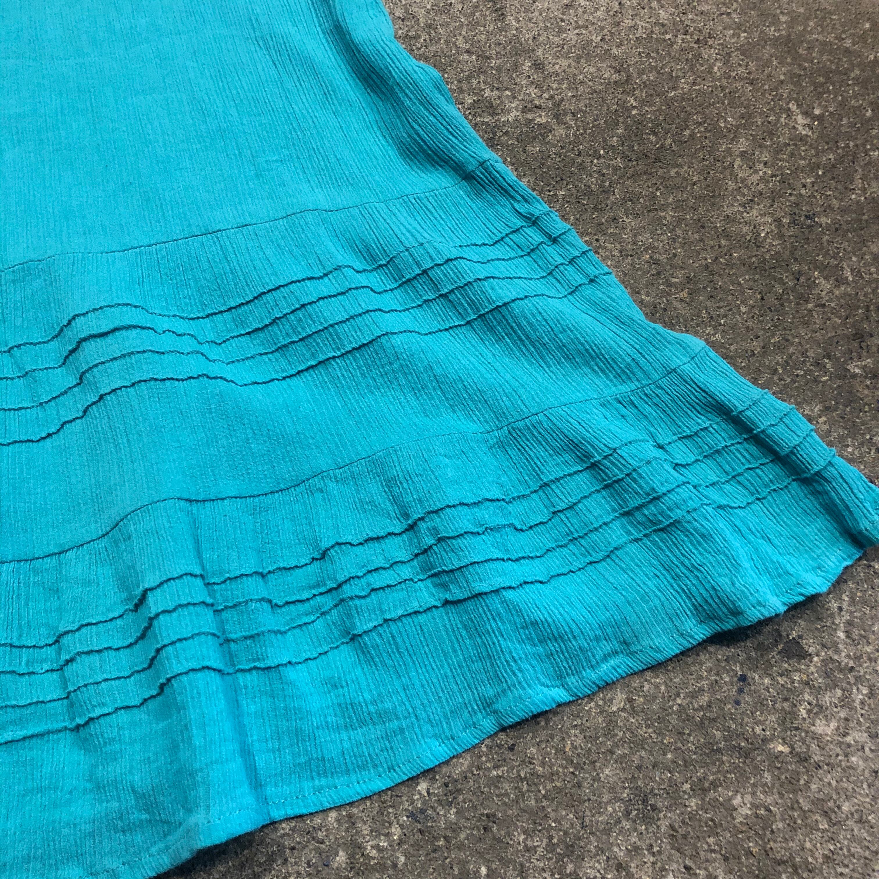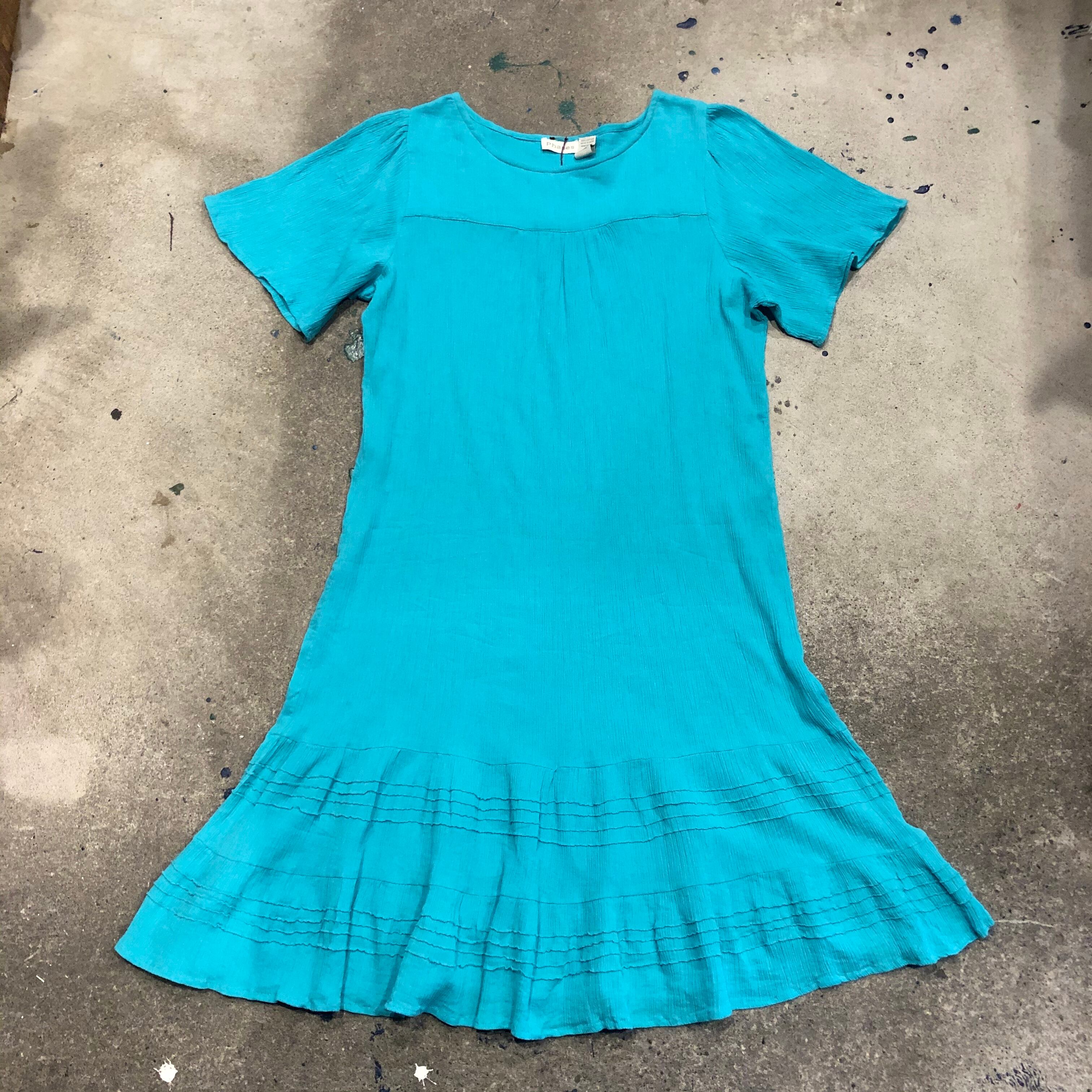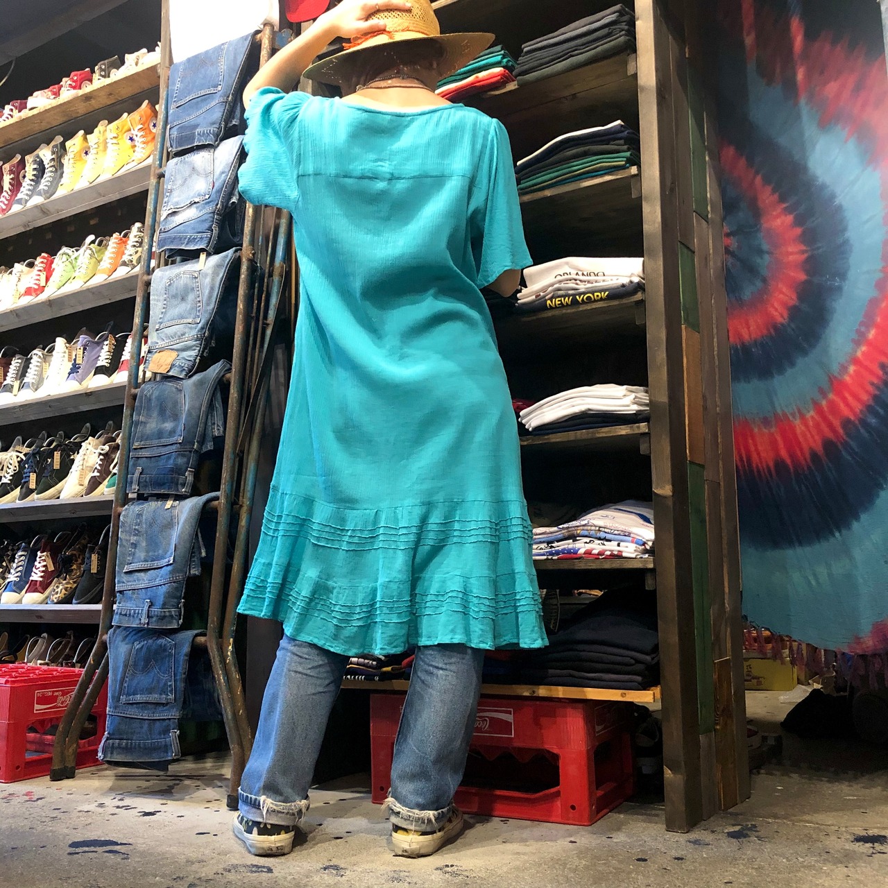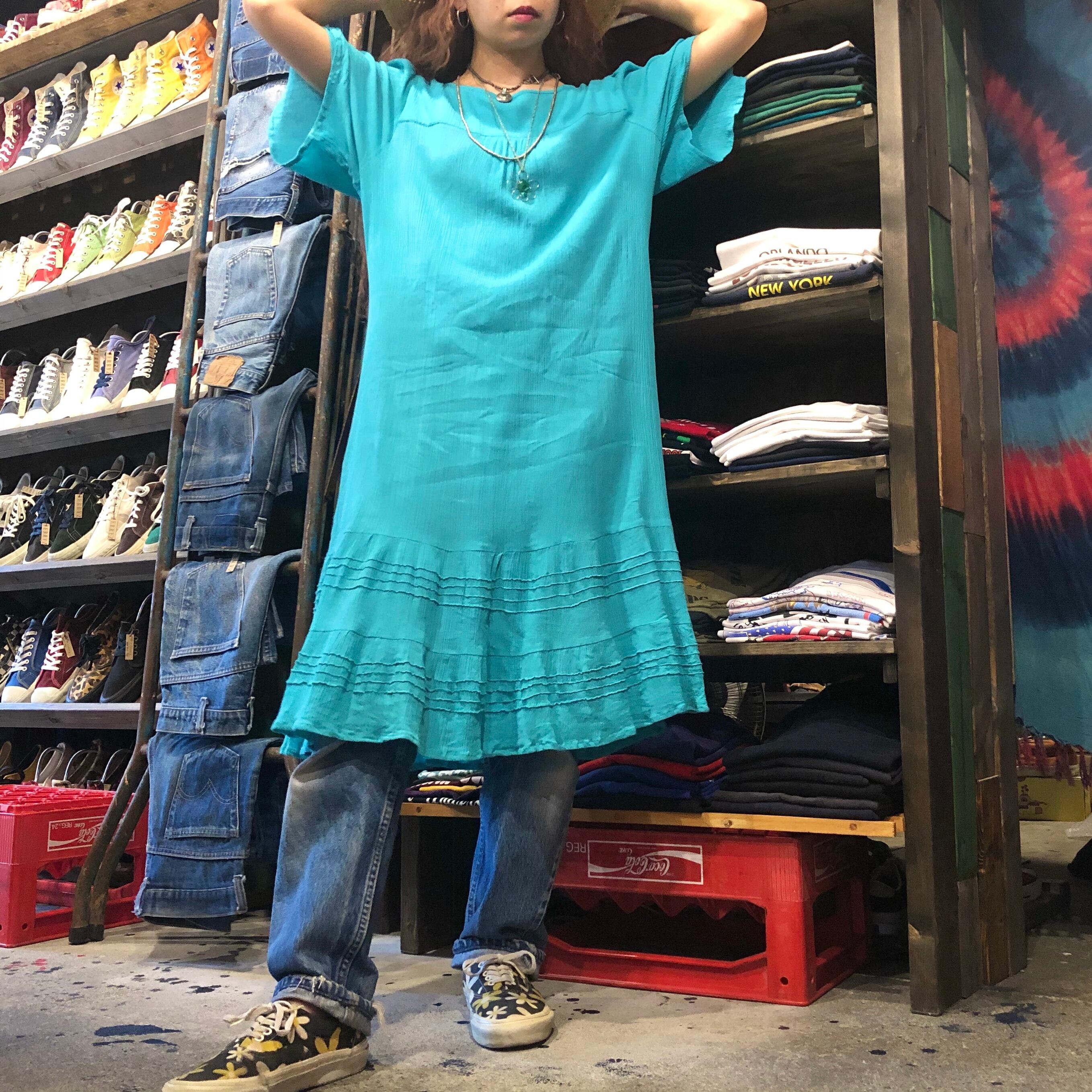 爽やかな水色っぽい緑一色のワンピースです。写真で色が伝わりづらいですが、着用写真の方が実物に近い色味です。