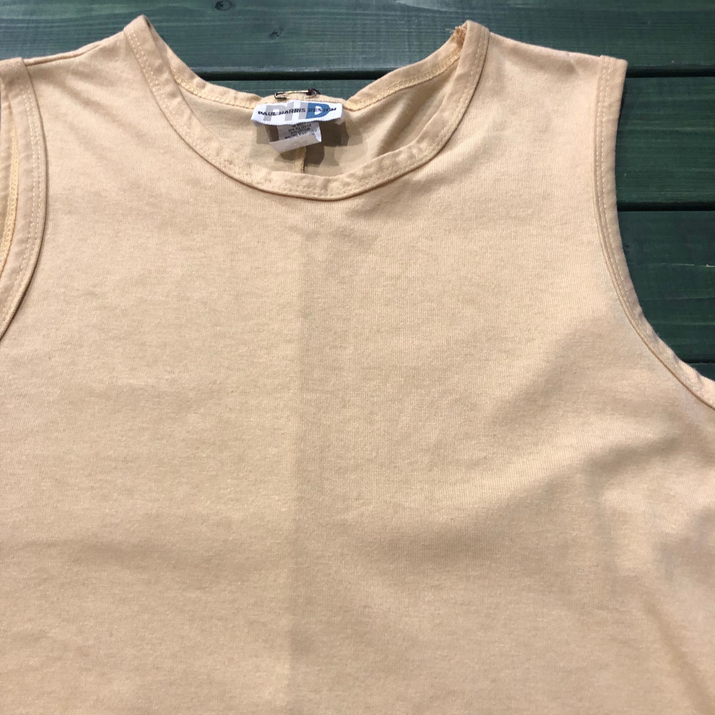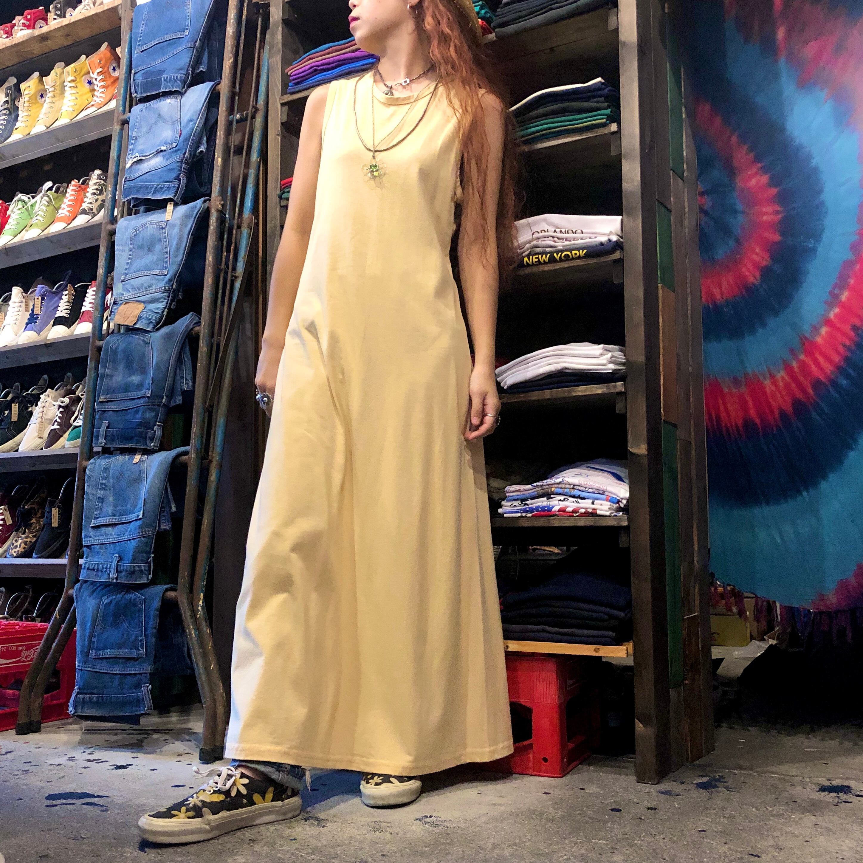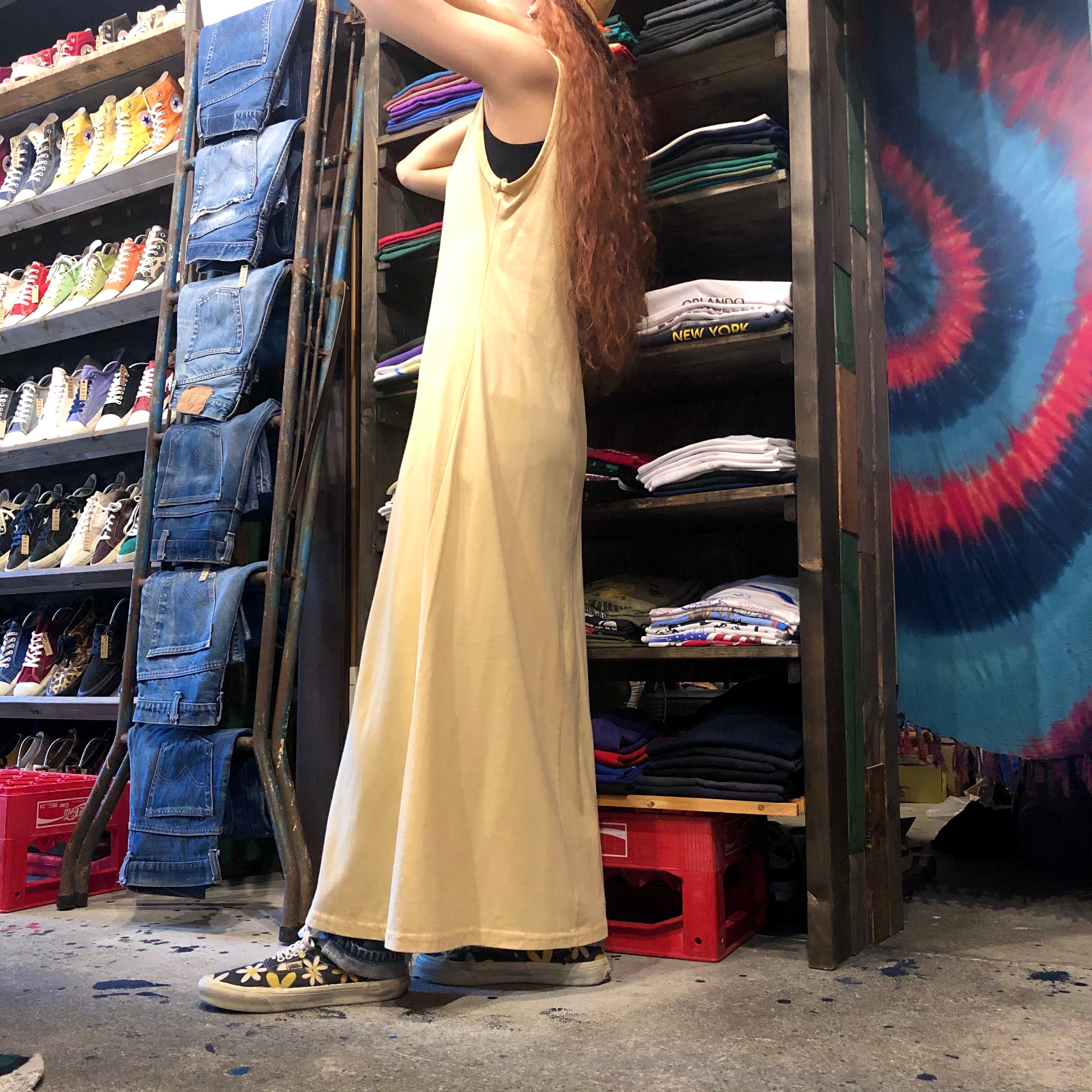 カスタードみたいな色が柔らかい印象のワンピースです。コットンポリで、ある程度伸縮性があってとても楽ちんな一着です。