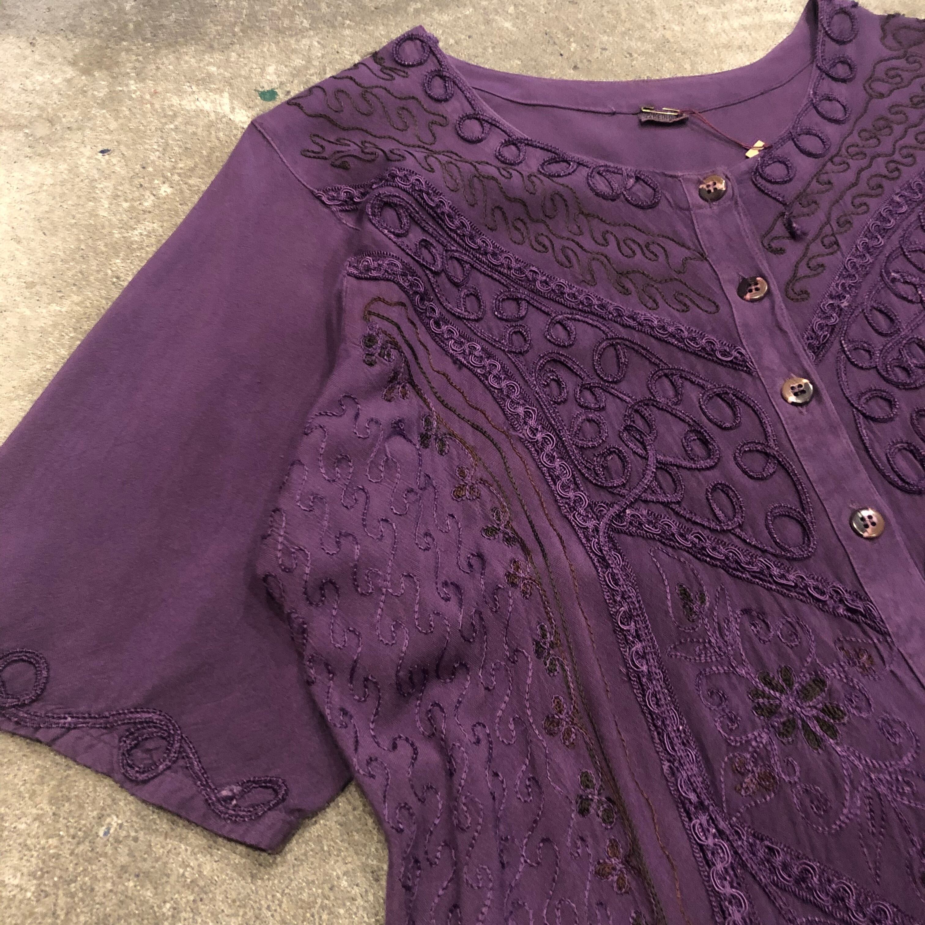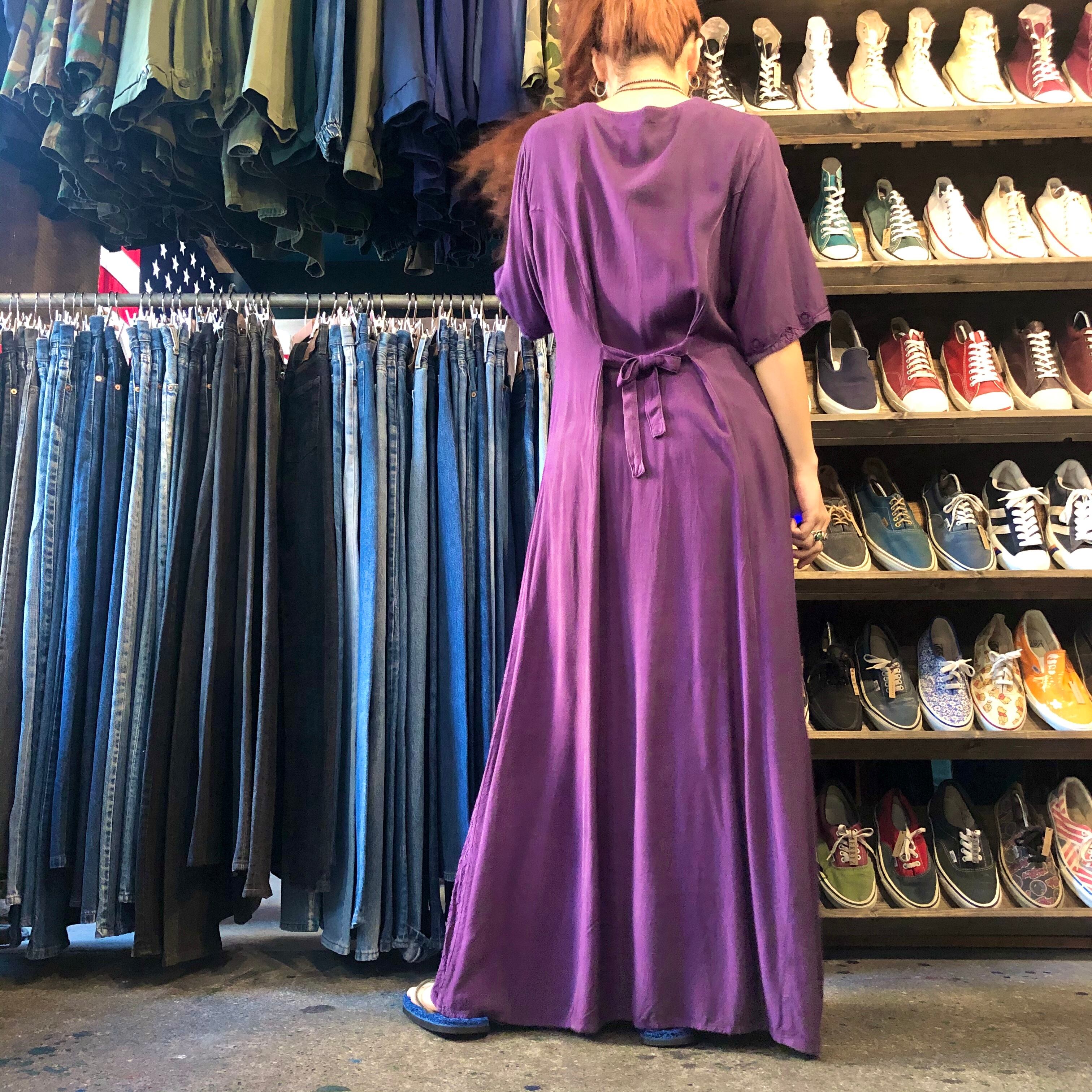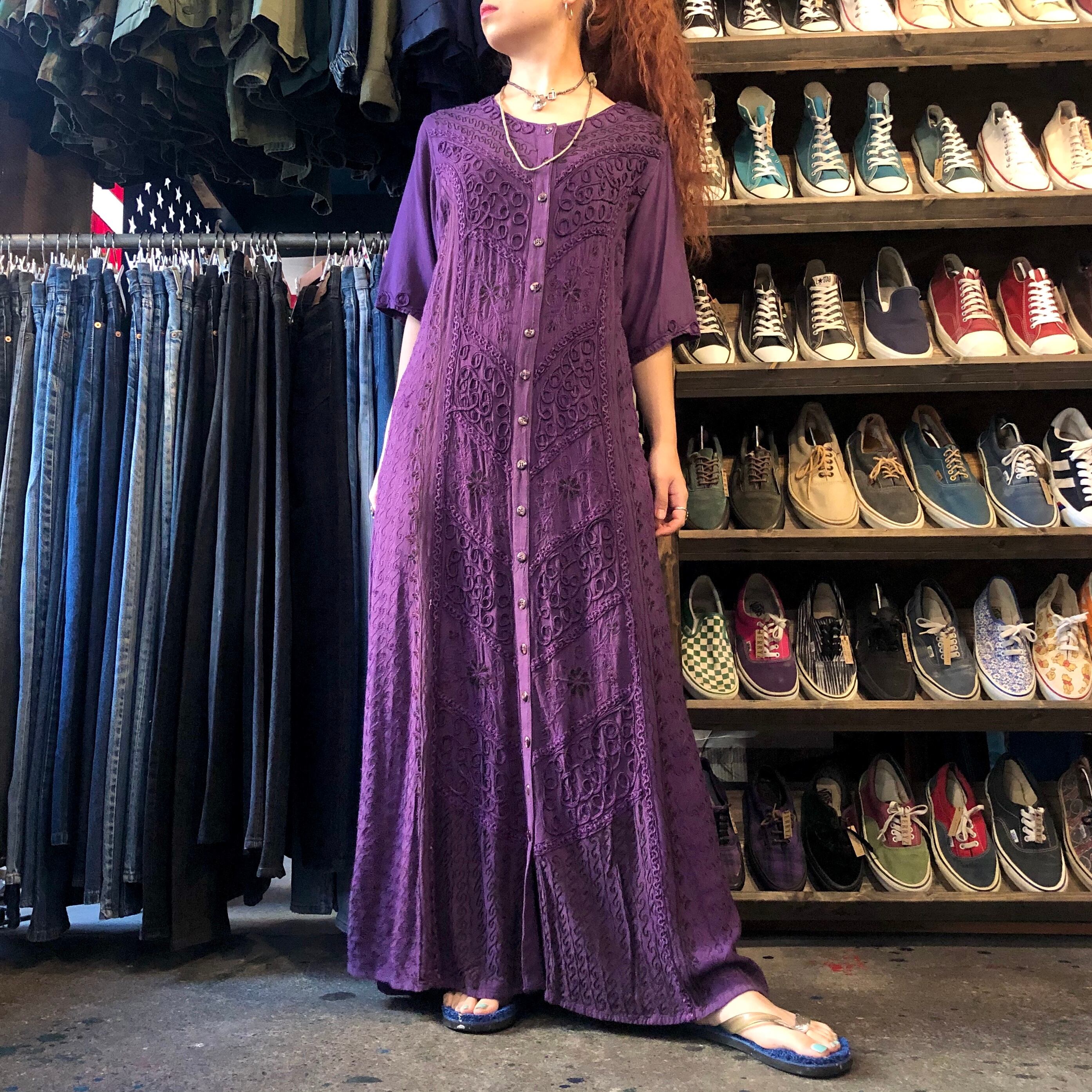 インド製レーヨン素材のワンピースです。前身頃全体にびっしり機械刺繍が施されていて、とてもかわいいです。深い紫もエスニックな雰囲気が際立って素敵です。