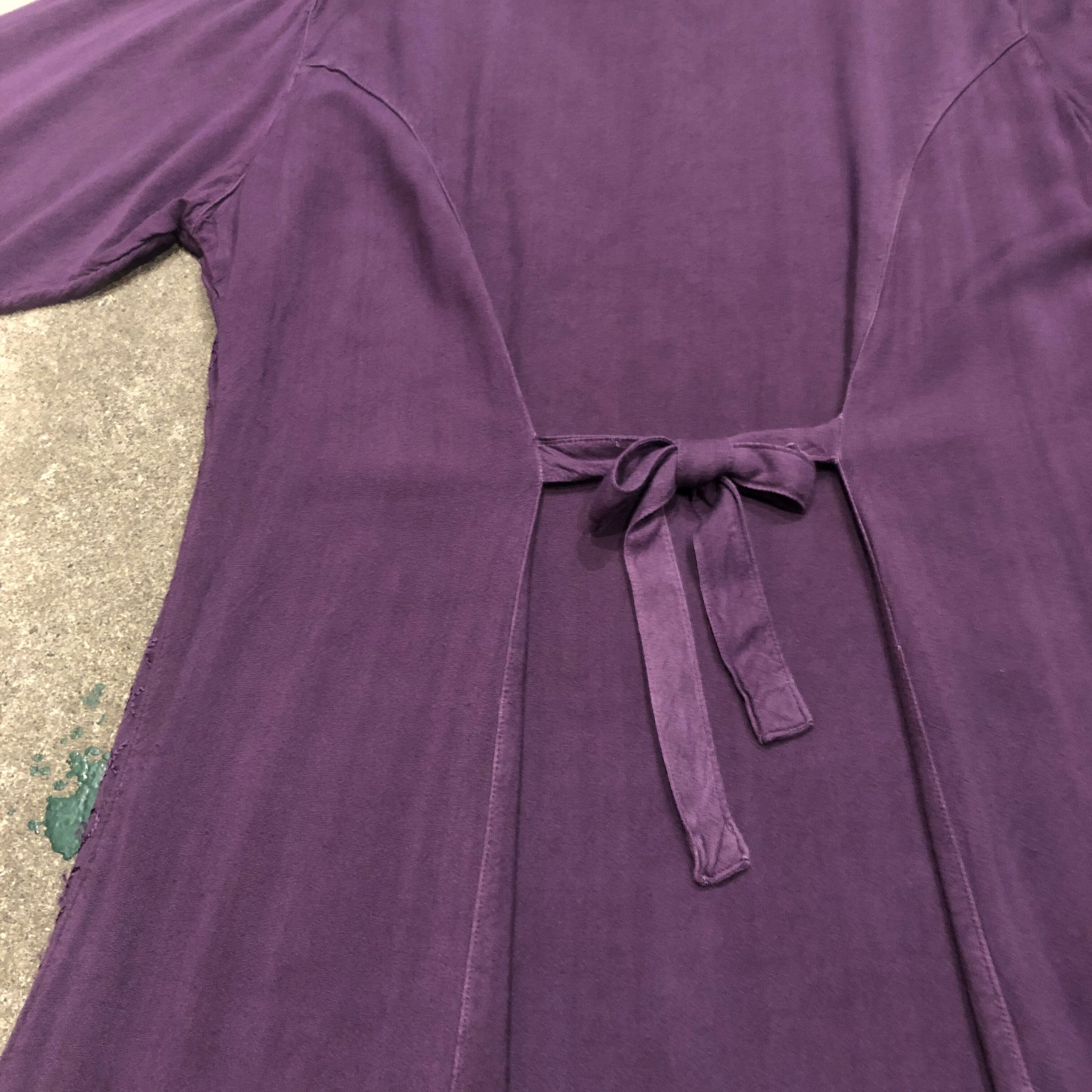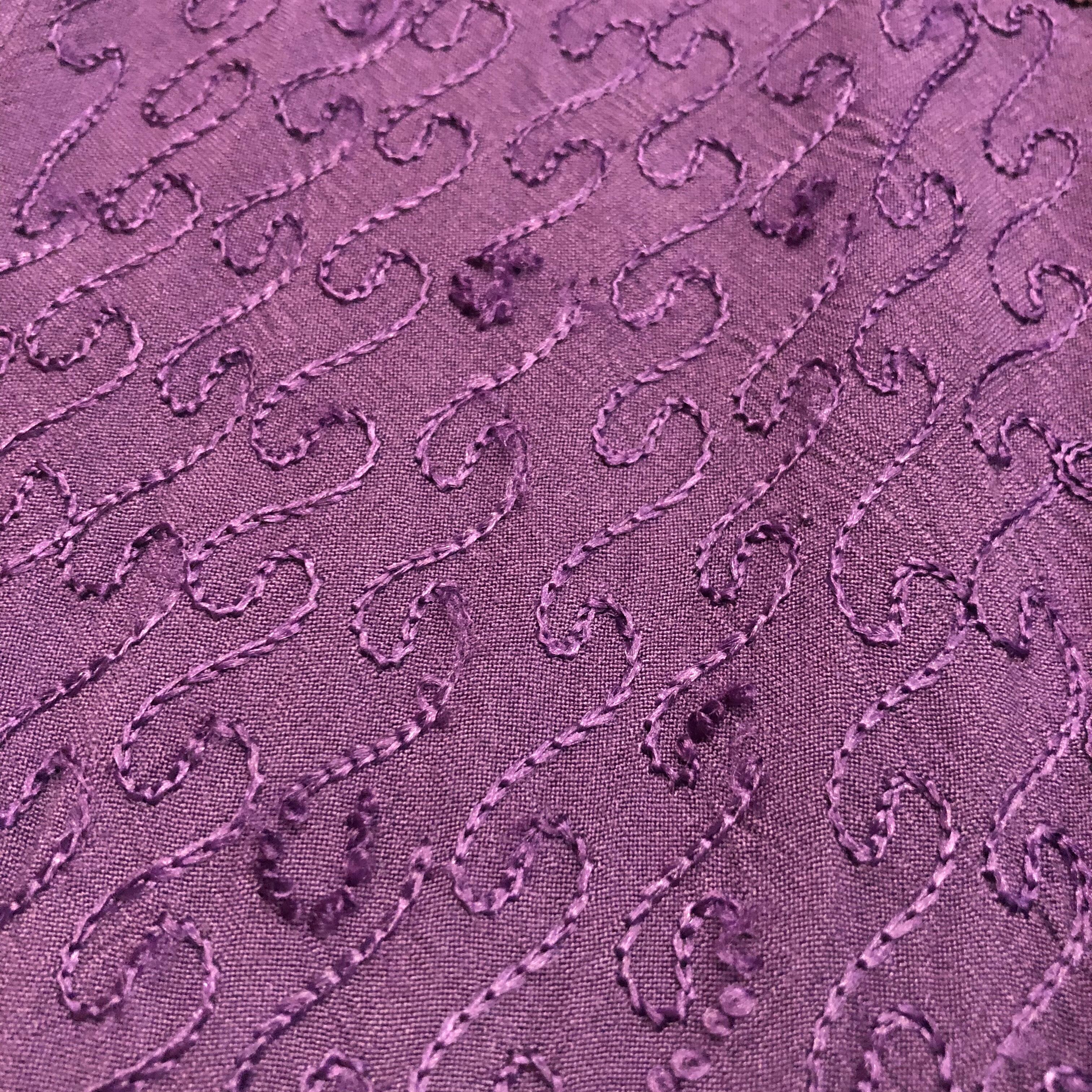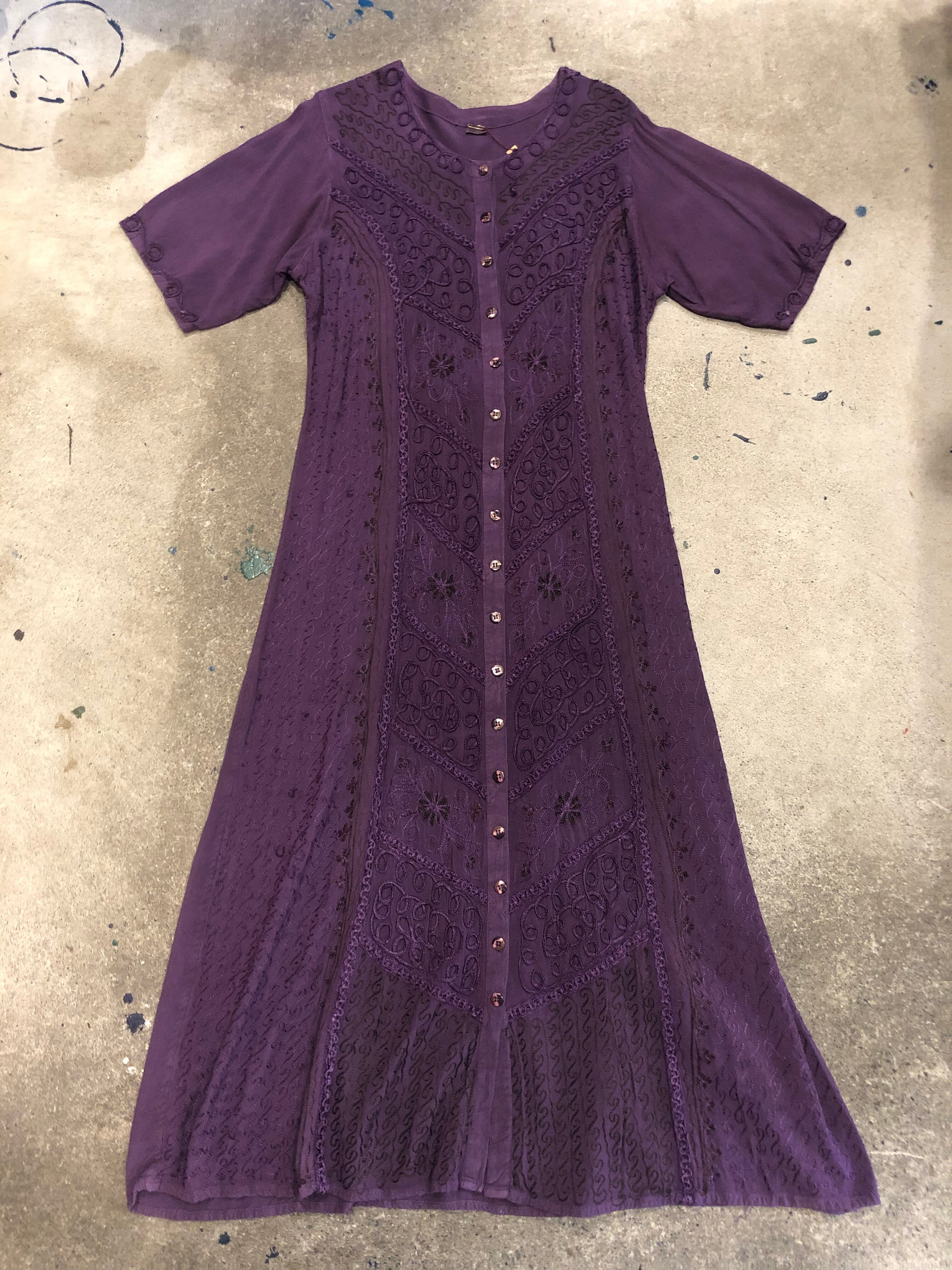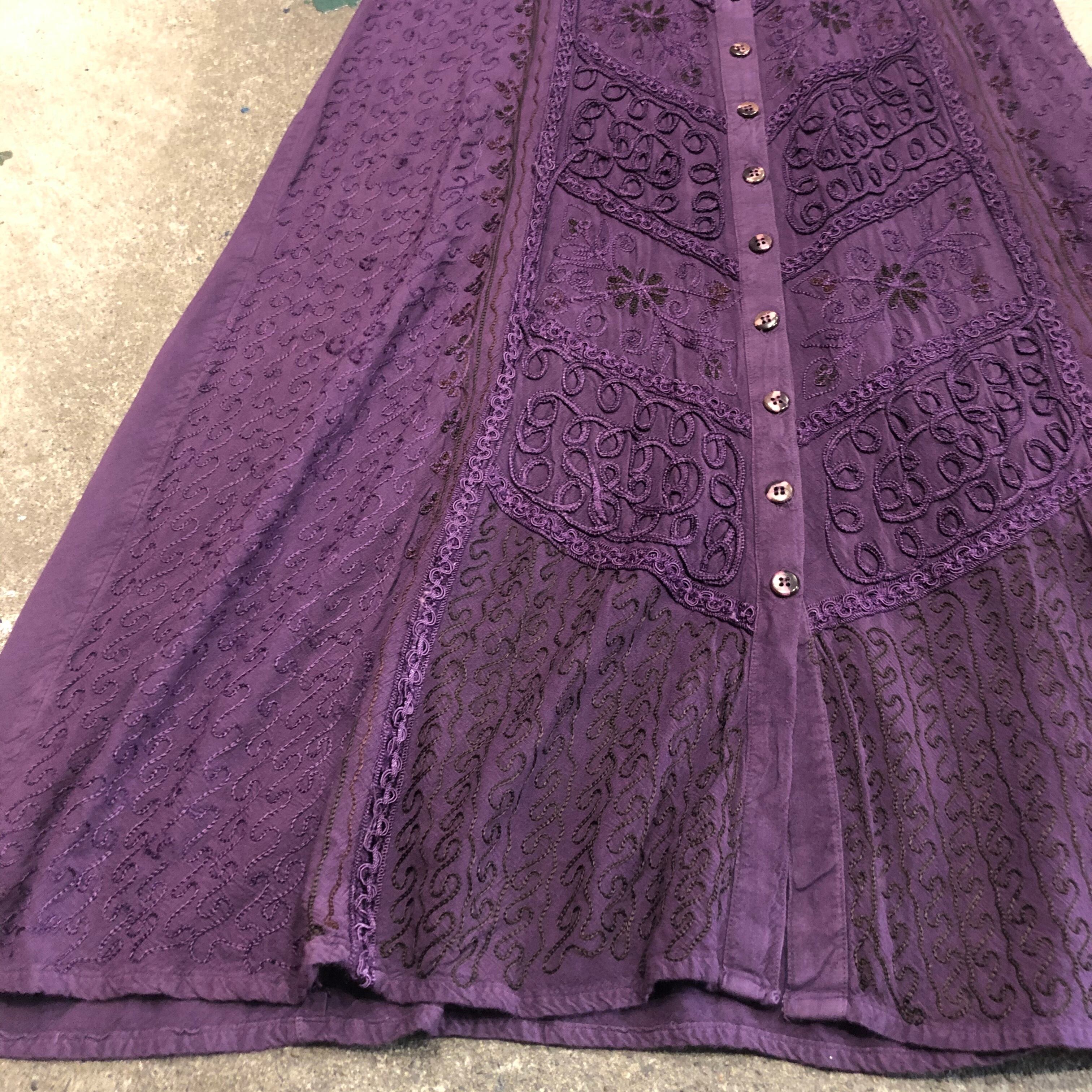 インド製レーヨン素材のワンピースです。前身頃全体にびっしり機械刺繍が施されていて、とてもかわいいです。深い紫もエスニックな雰囲気が際立って素敵です。