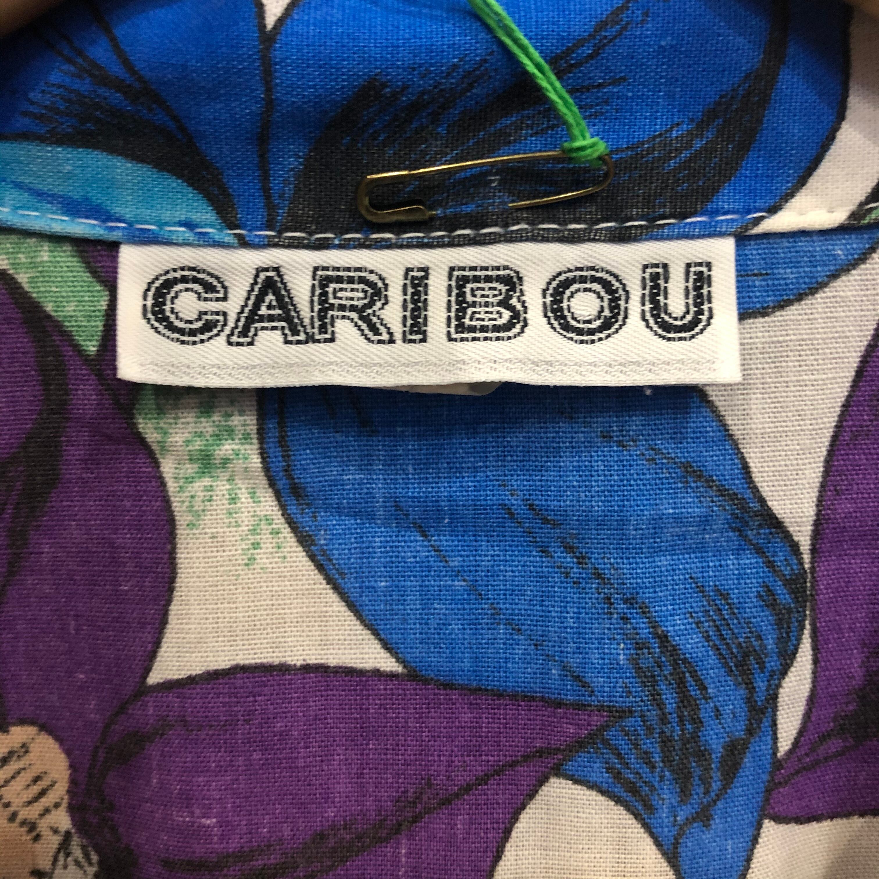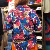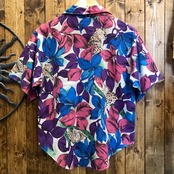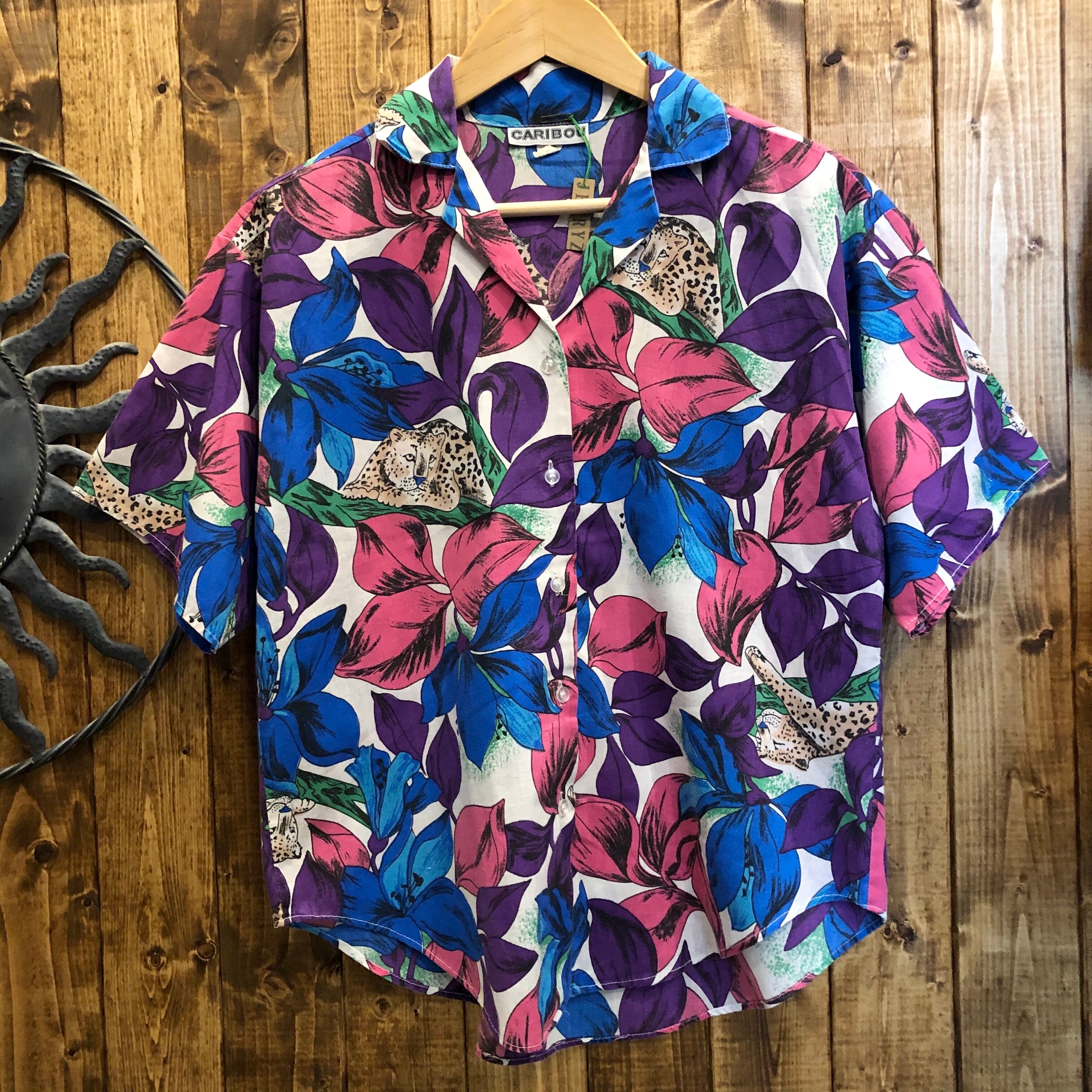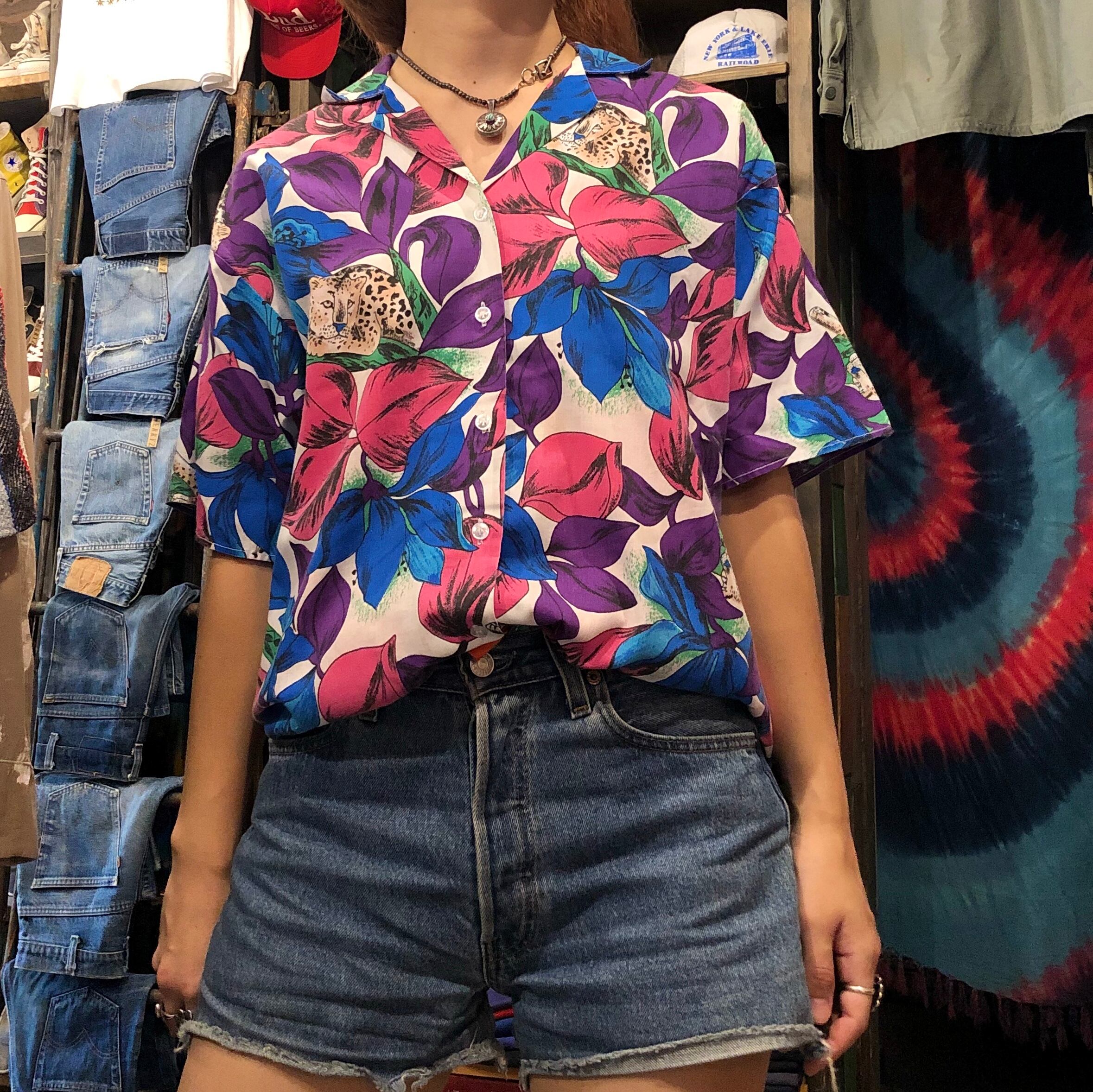 植物の中にちらほら豹がいる不思議な柄ですが、独特なカラーリングが魅力的な開襟シャツです。