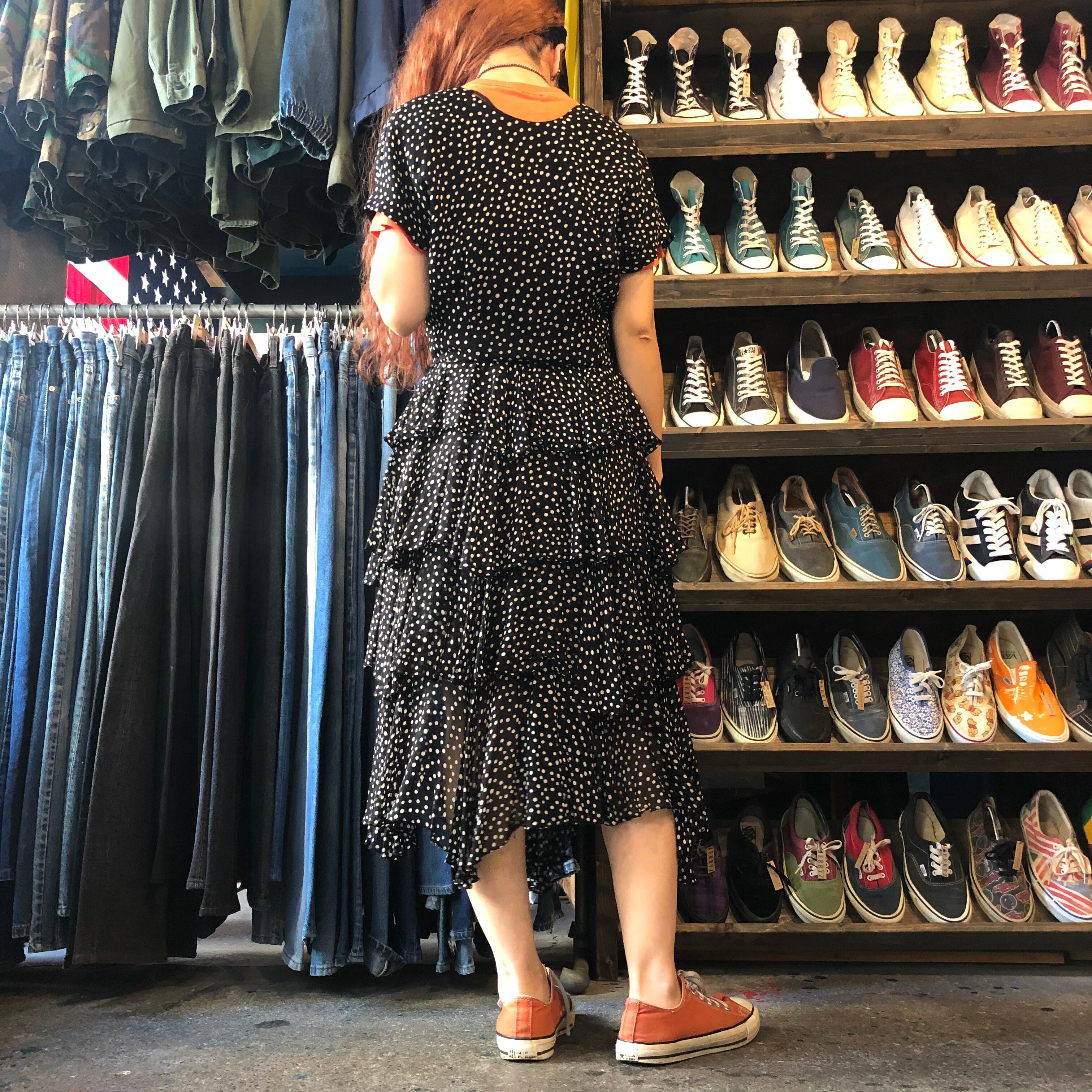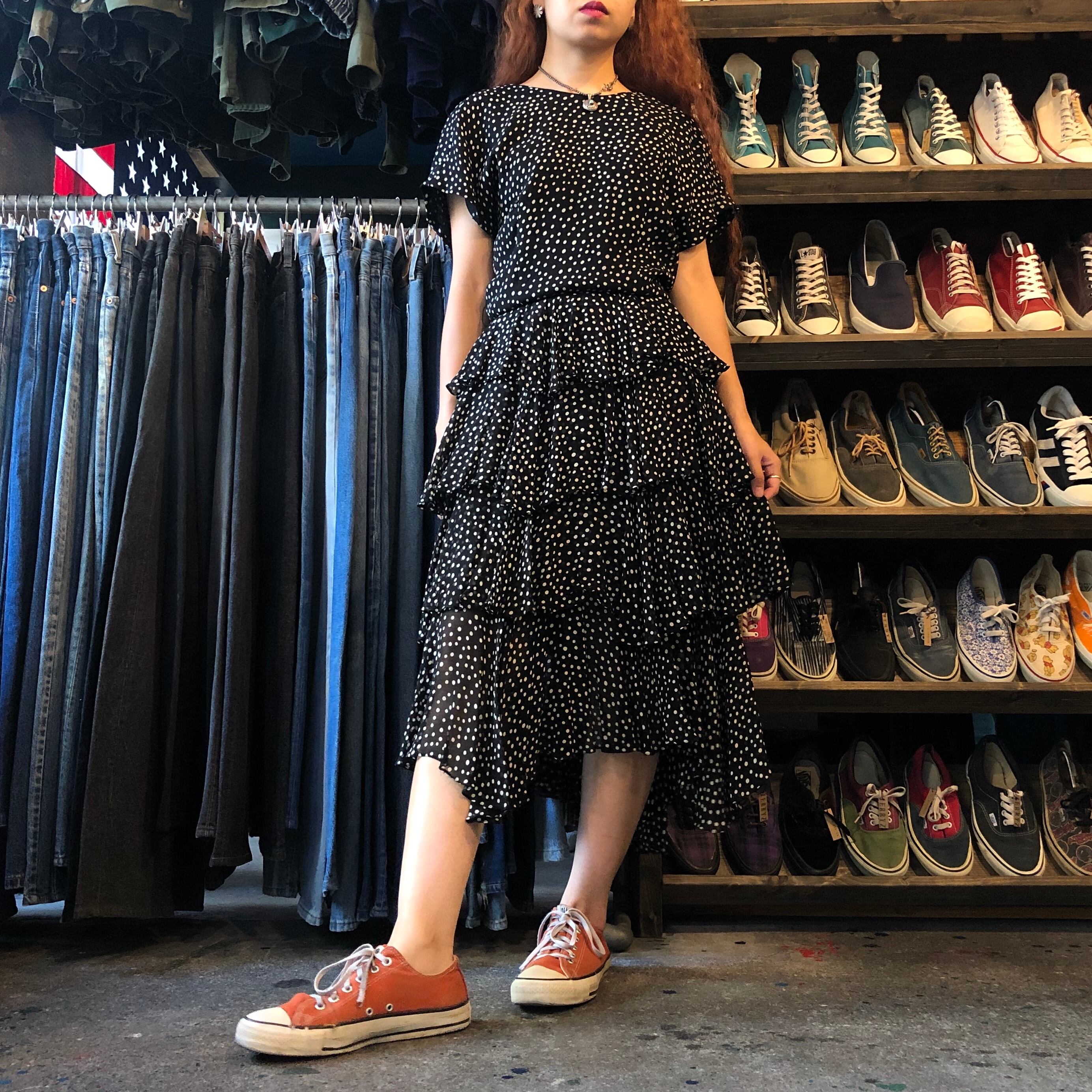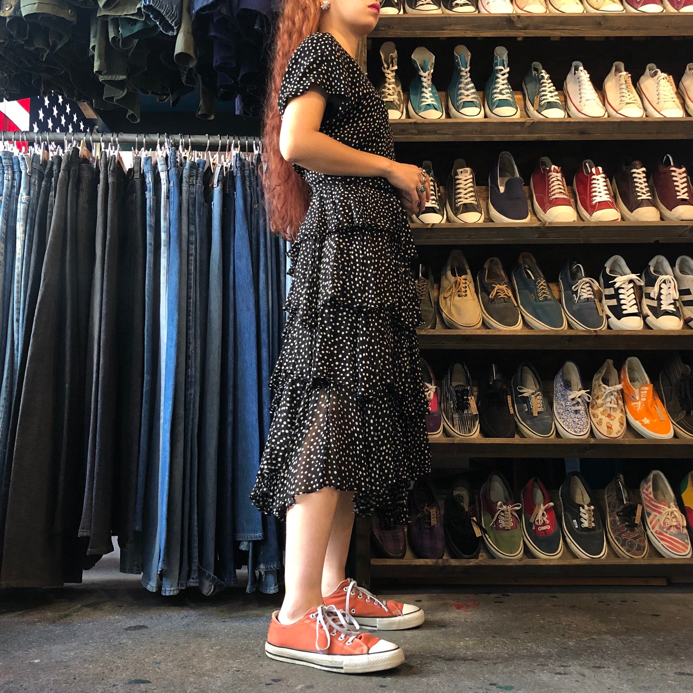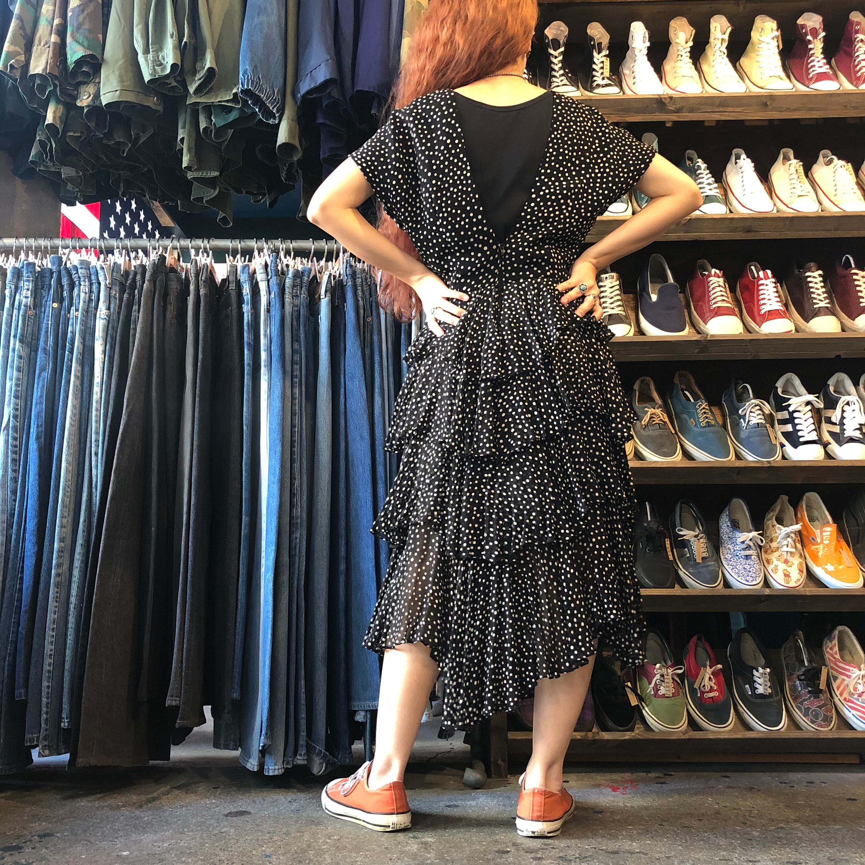 本来はVに開いている方が後ろなのですが、前にして重ね着してもかわいく着られます。裾がアシンメトリーになっていたり、足が透けるシースルーな生地、大人っぽい形が素敵で、ドレスアップして着るのも良いと思います。