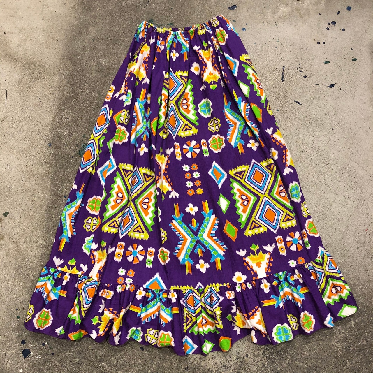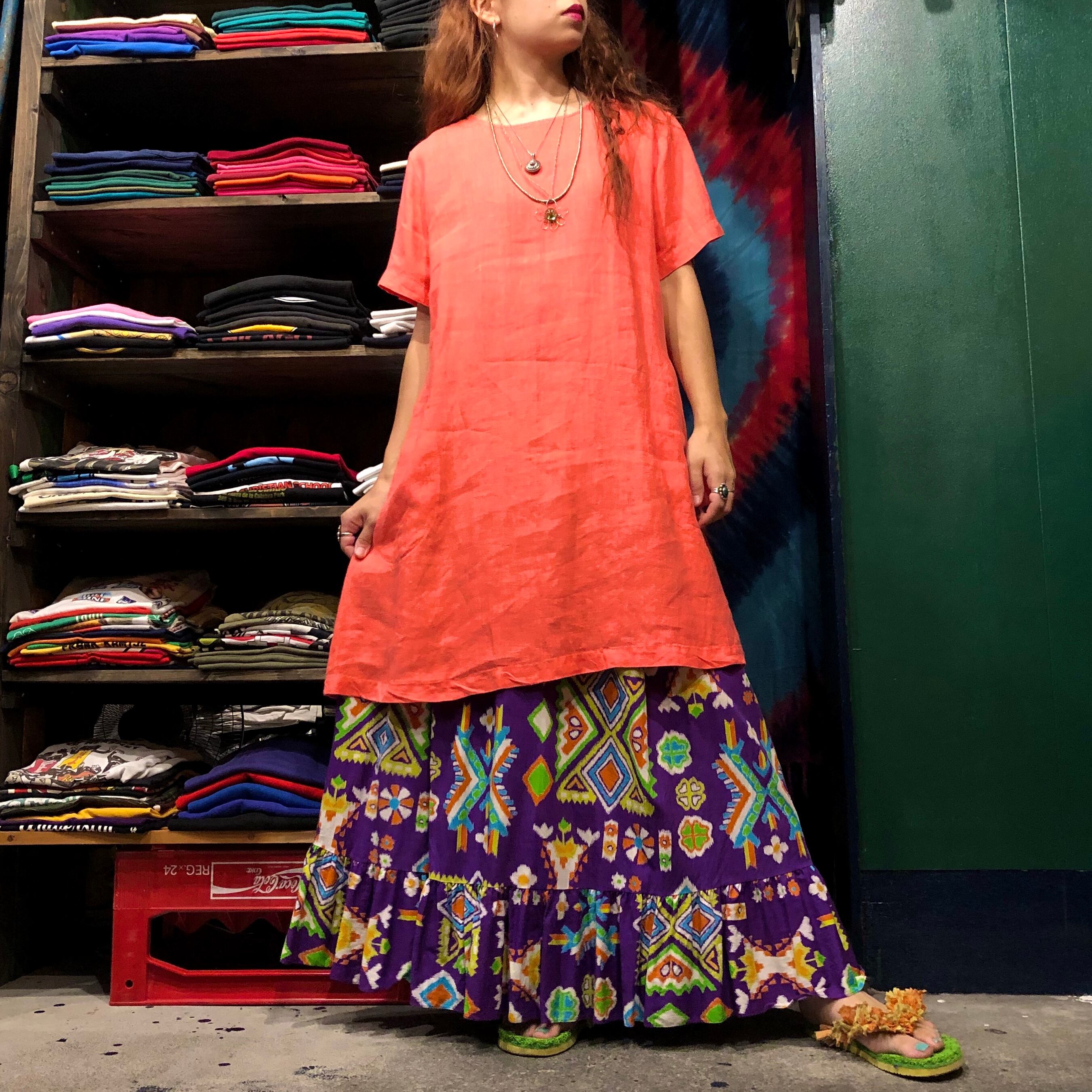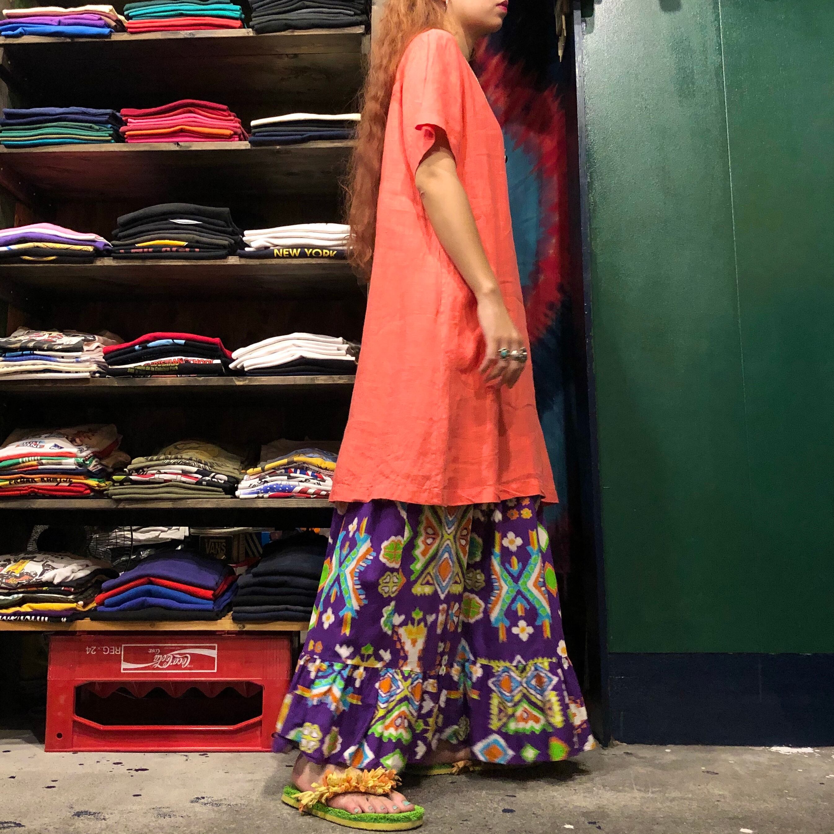 ネイティブ柄っぽい雰囲気の派手めな感じがかわいいロングスカートです。ウエストがゴムなので、胸上まで上げてワンピースのように着たり、シンプルにTシャツやタンクトップと合わせたり、ワンピースの裾からチラッと覗かせる程度に使ったり、いろいろ使えそうです。