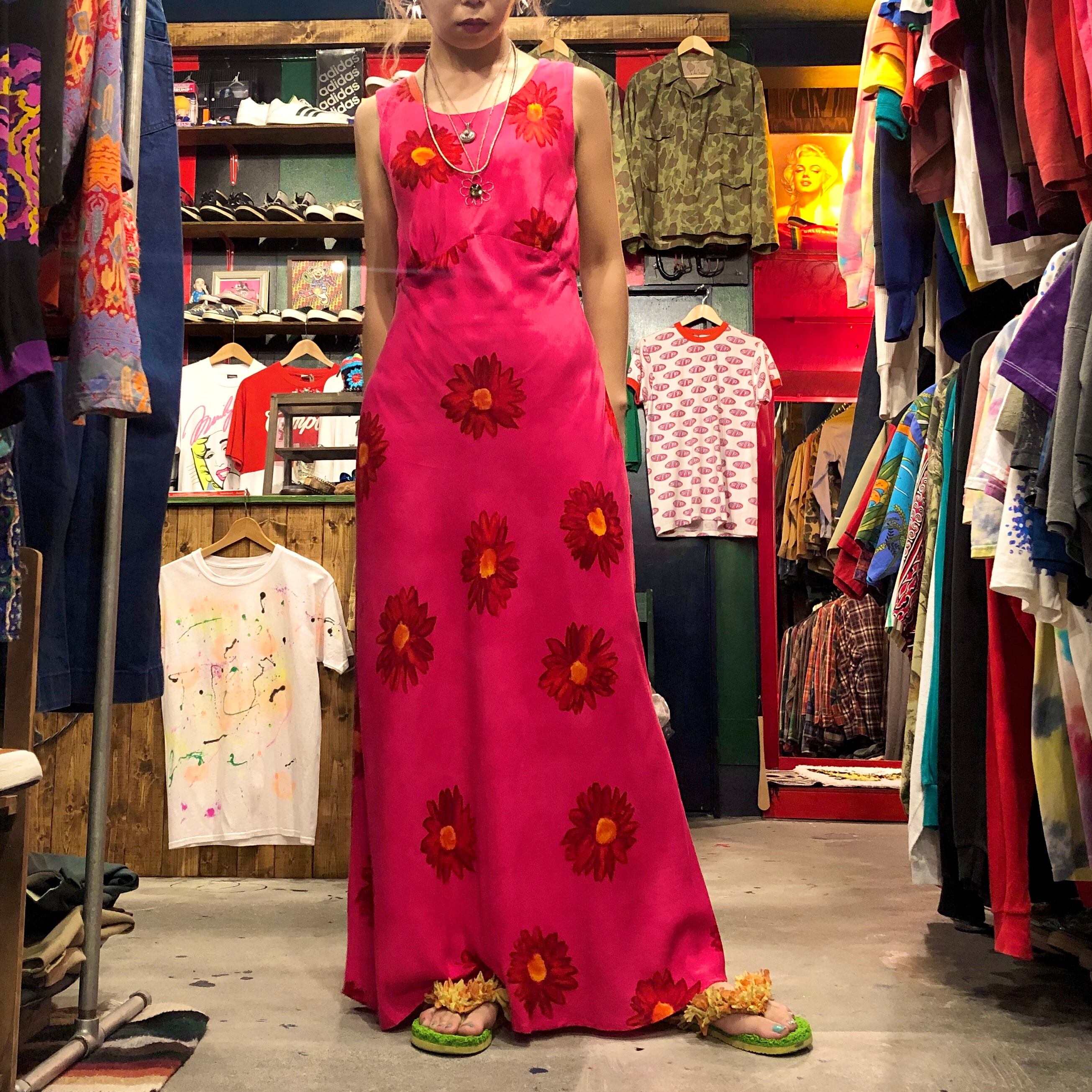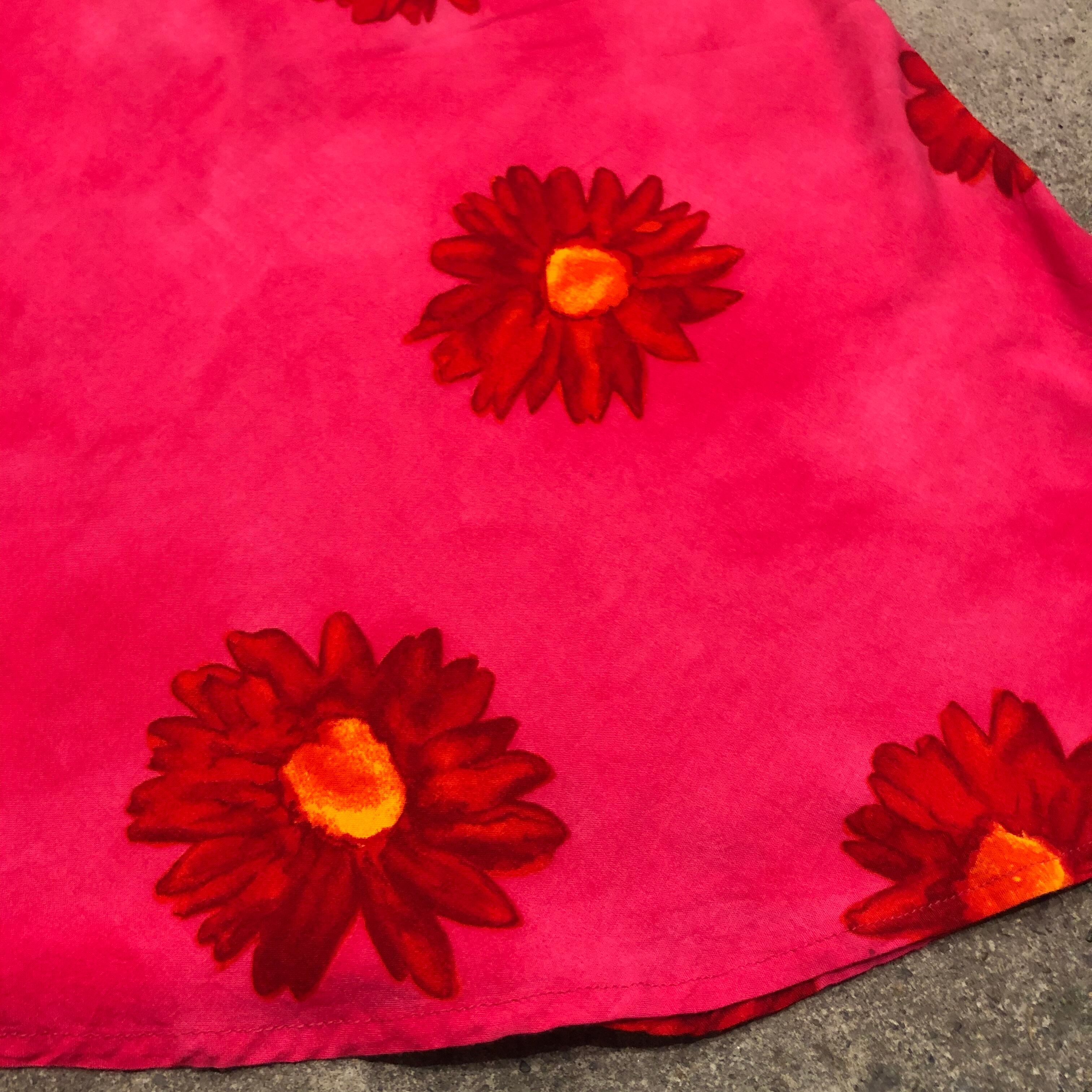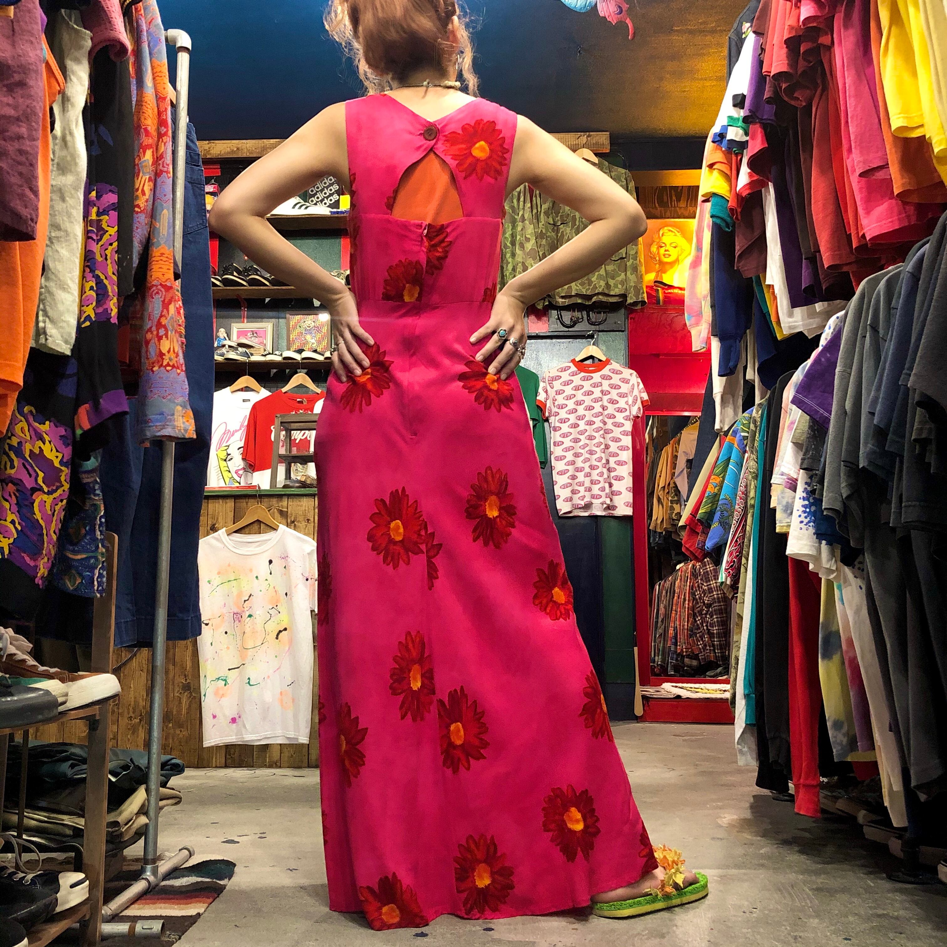 ピンクにブラッドオレンジカラーの手書き風花柄がとってもかわいいワンピースです。