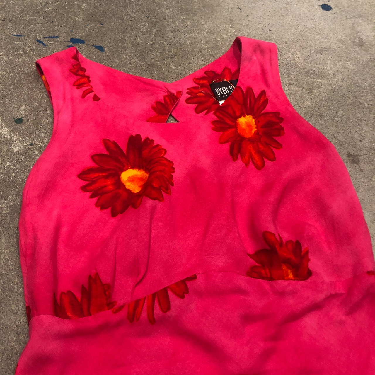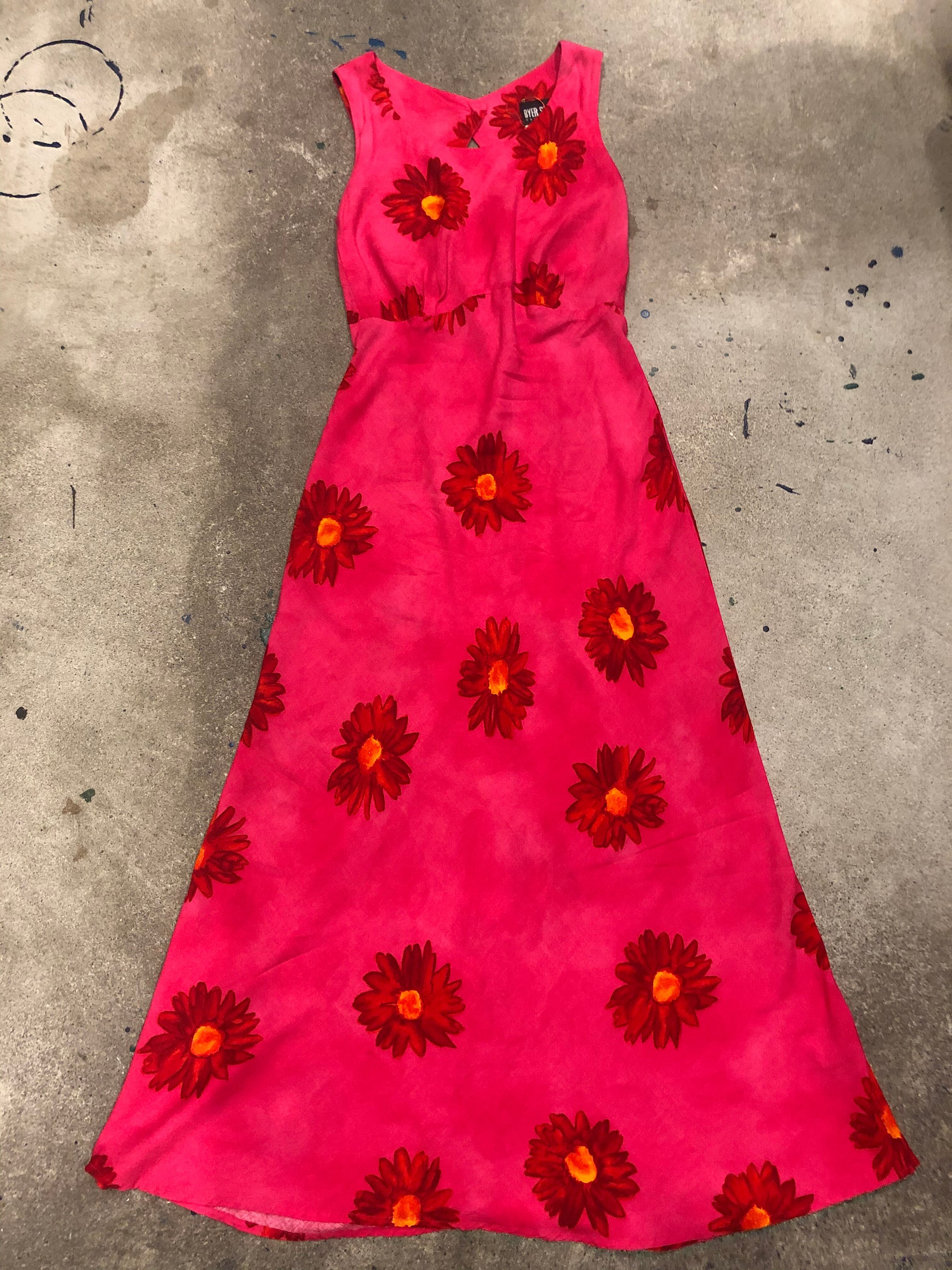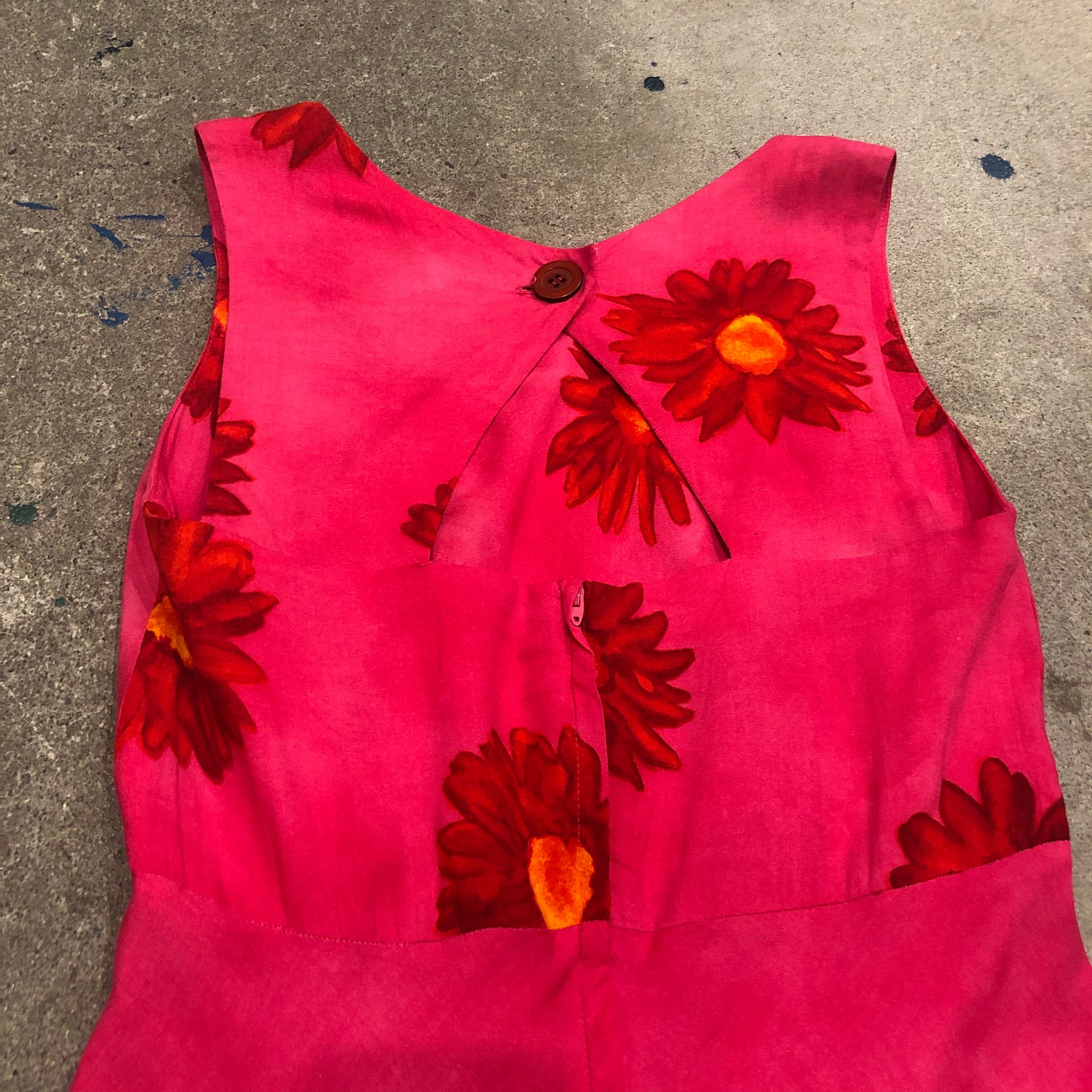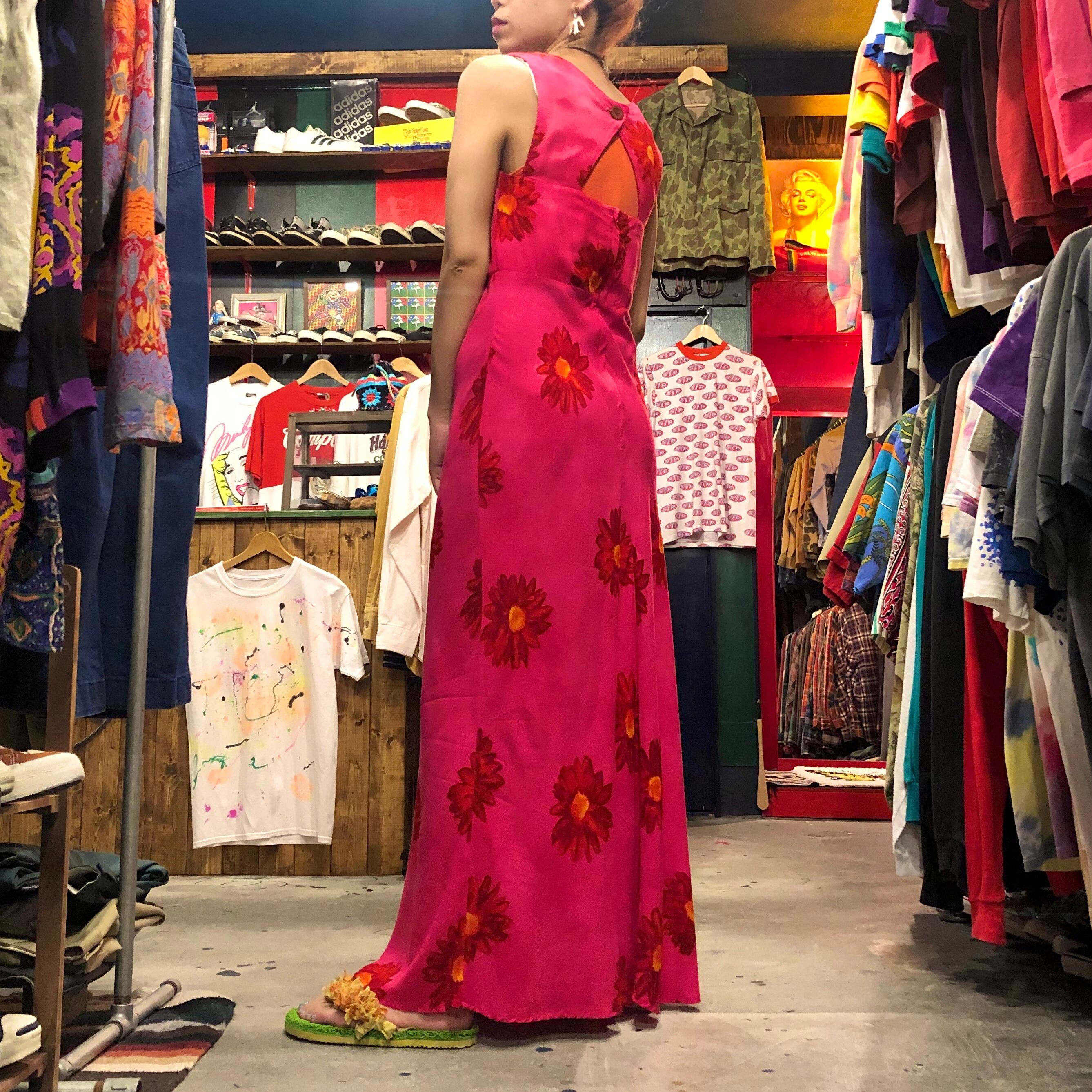 ピンクにブラッドオレンジカラーの手書き風花柄がとってもかわいいワンピースです。