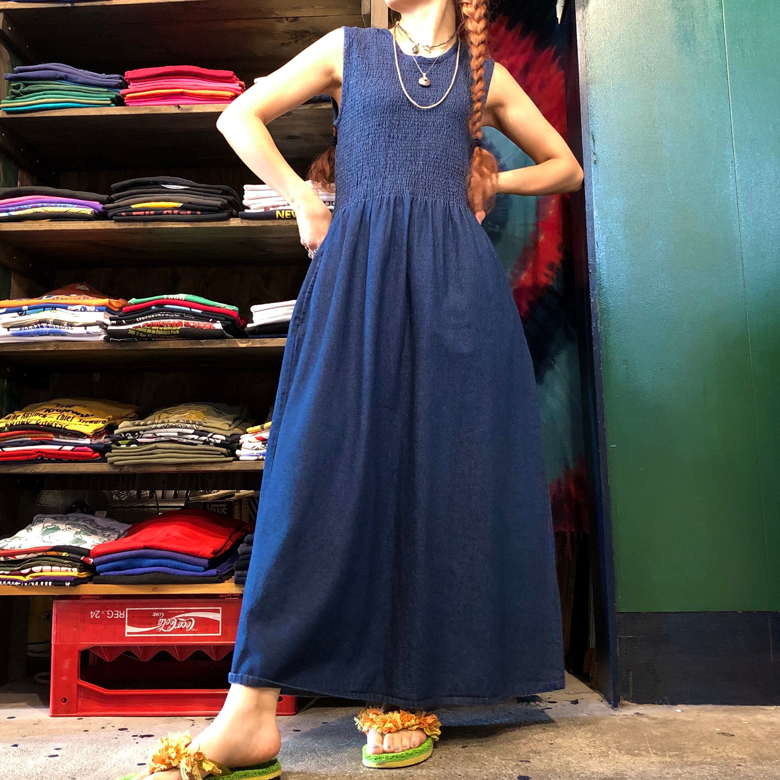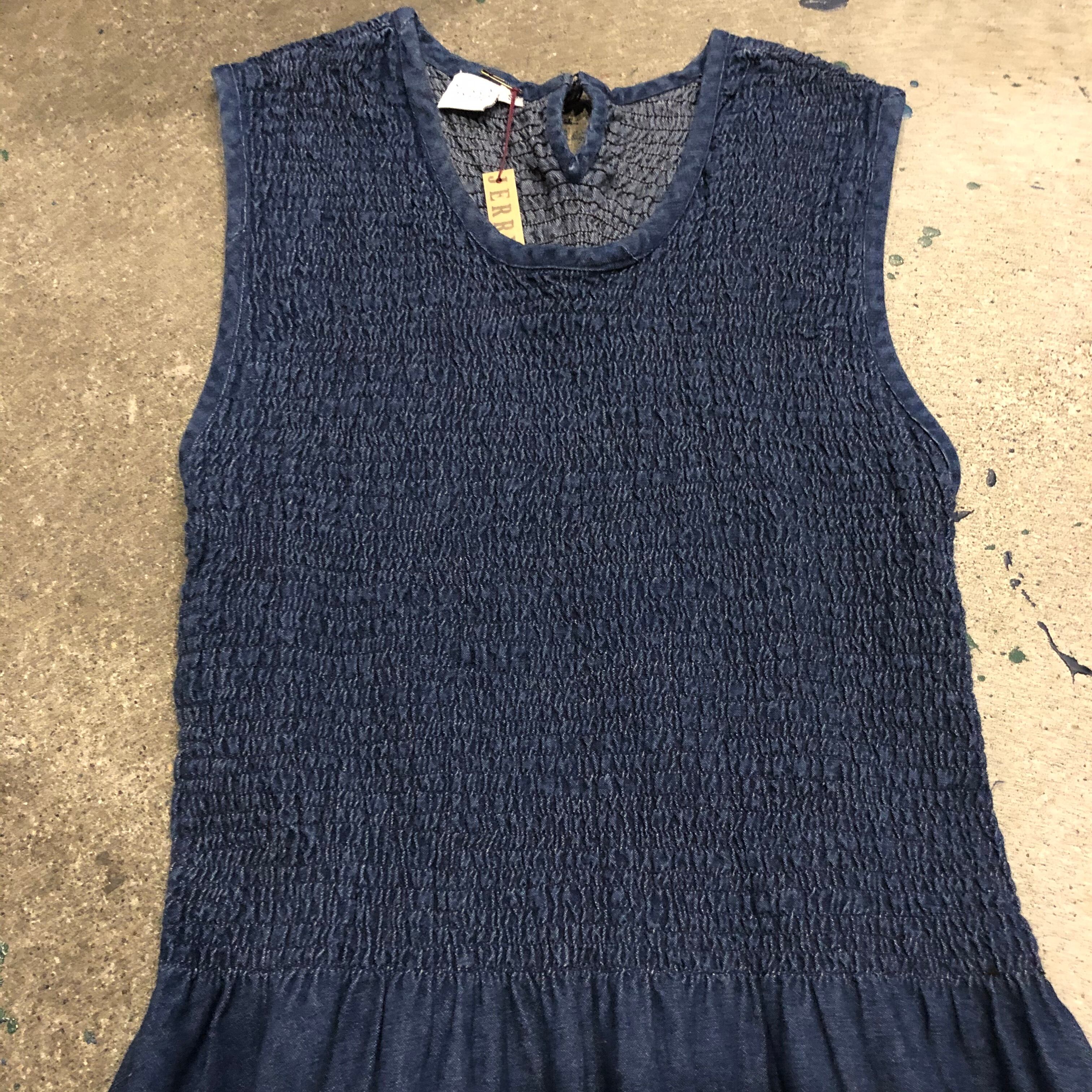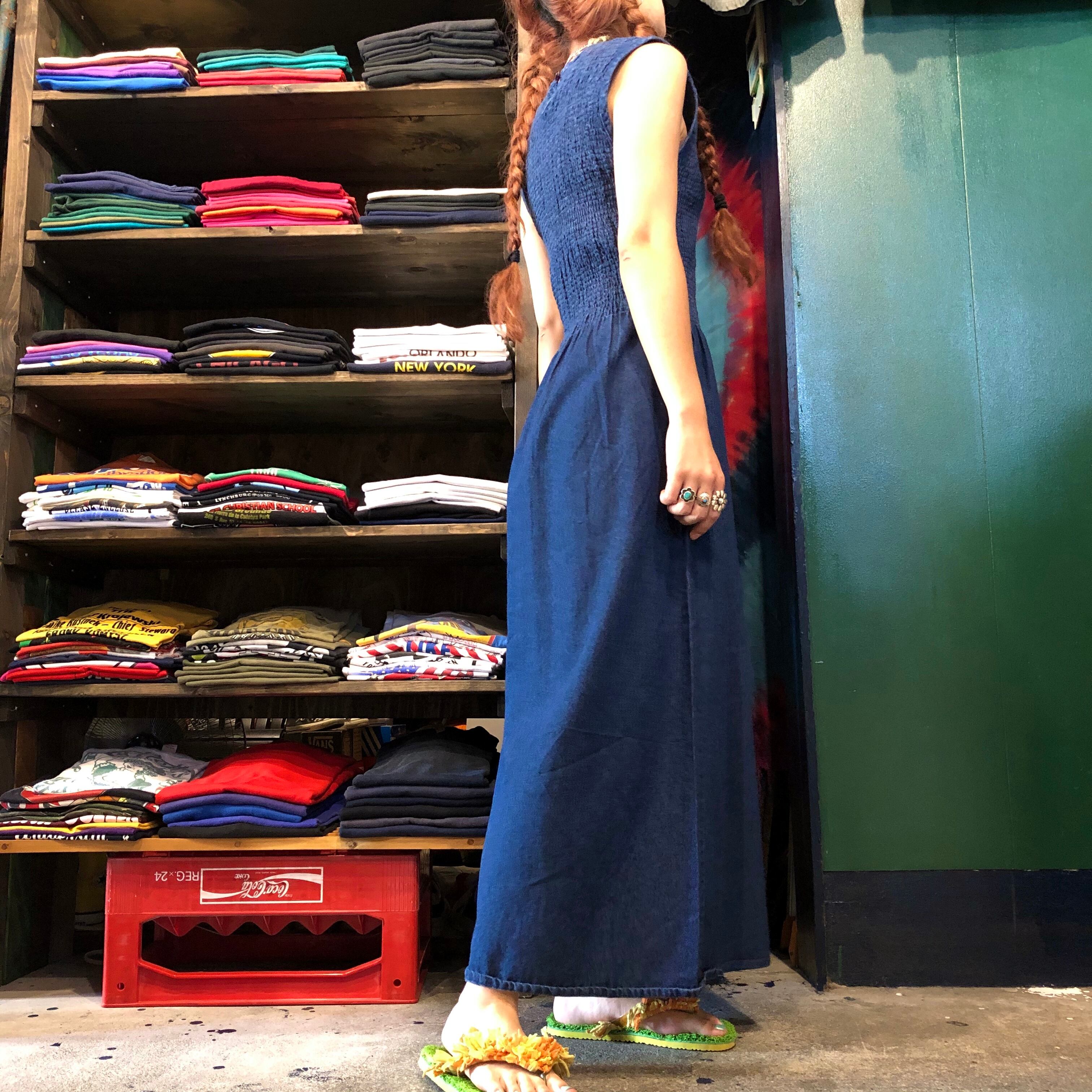 上半身部分が全てシャーリングになっている女性らしいシルエットのデニムワンピースです。