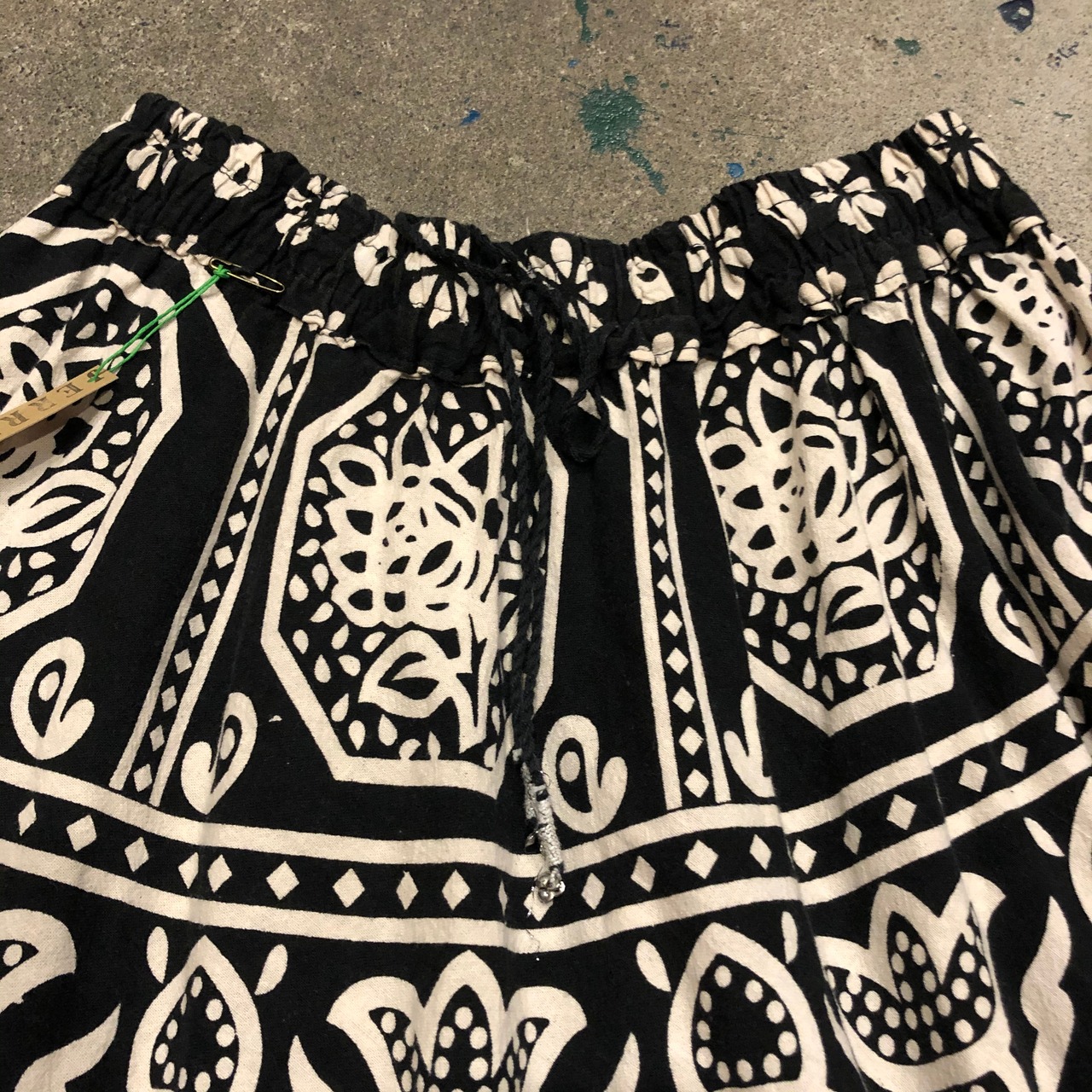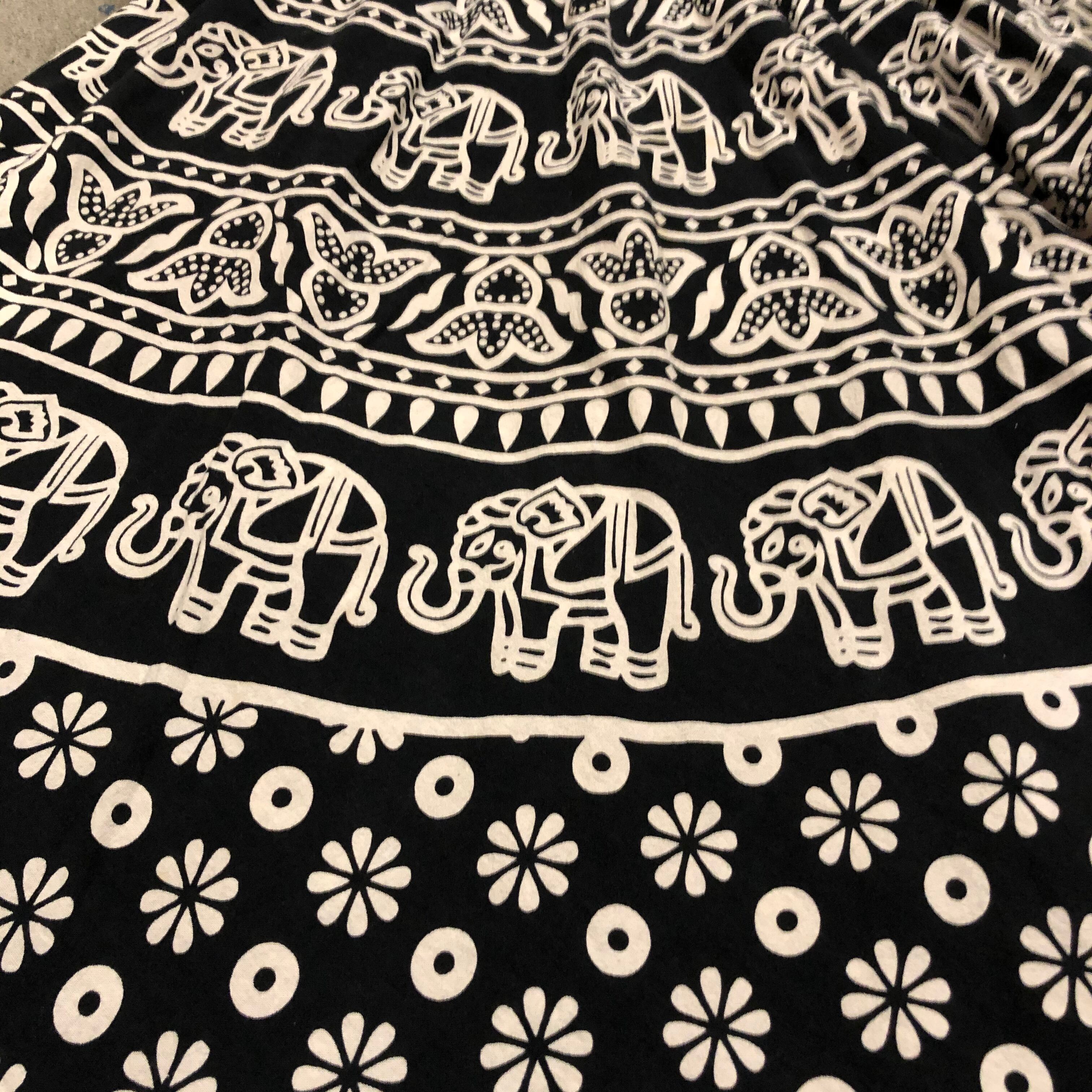 白黒のエスニックな柄がかわいいロングスカートです。裾の花柄がちょっと異色な感じで気に入っています。シンプルにタンクトップやキャミソールに合わせても、ワンピースの下に履くのもおすすめです。透けにくい素材なので一枚で涼しく着られそうです。