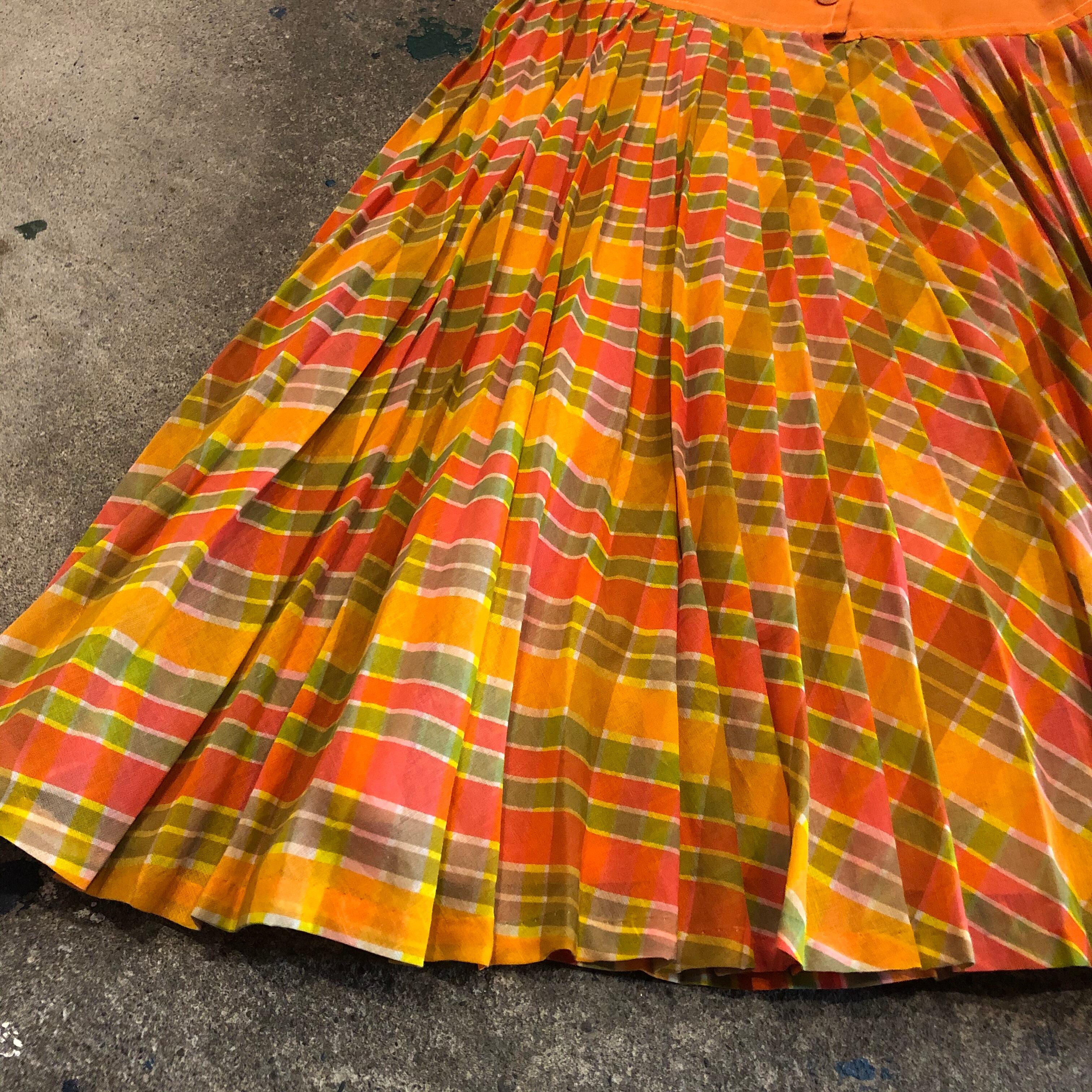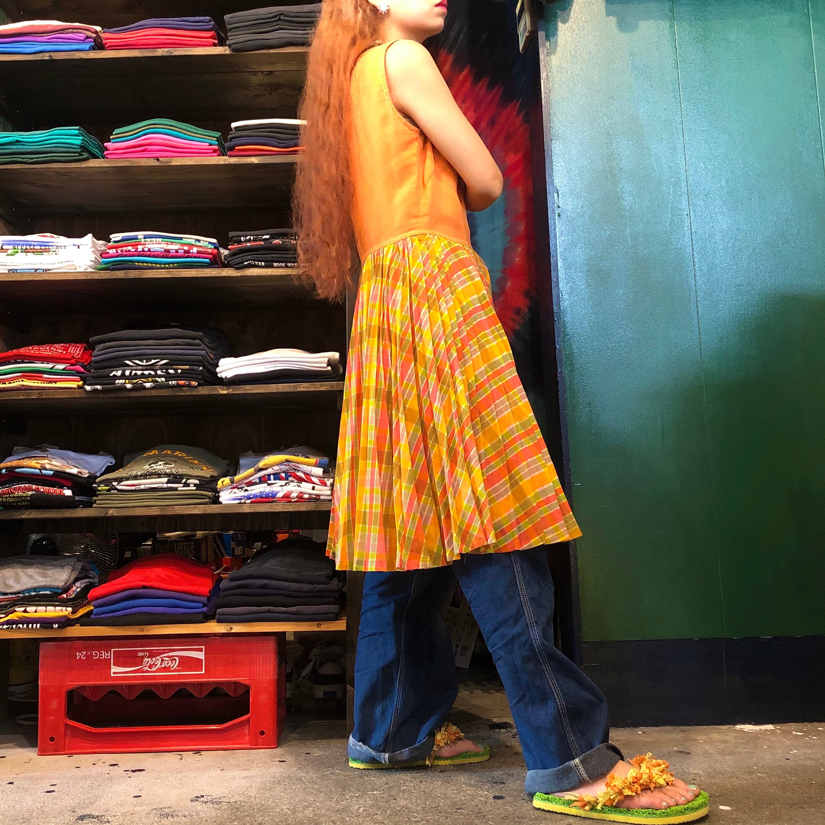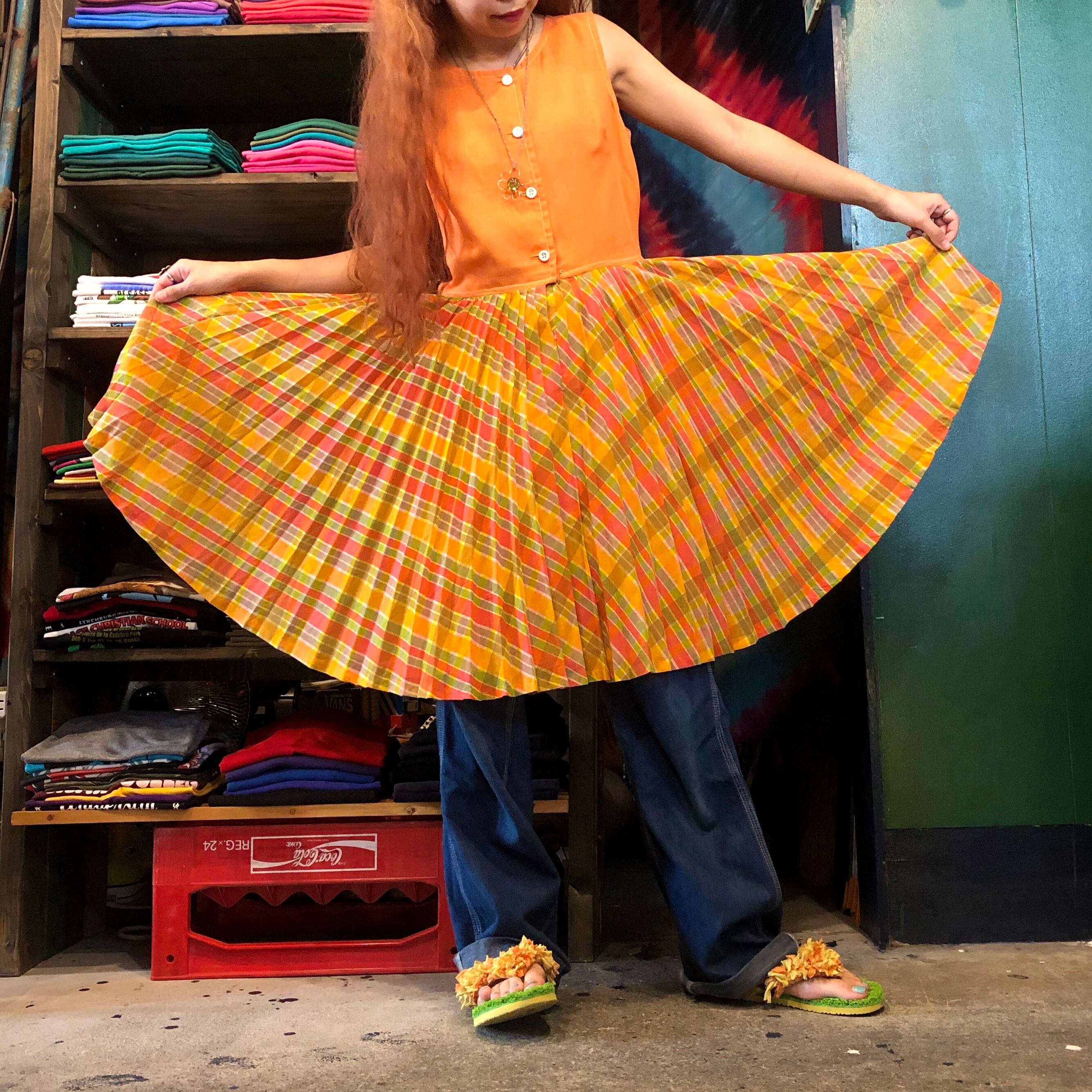 オレンジ×チェックが夏っぽくてかわいいです。プリーツスカート部分はサーキュラーになっておりボリューム感もトキメキます。