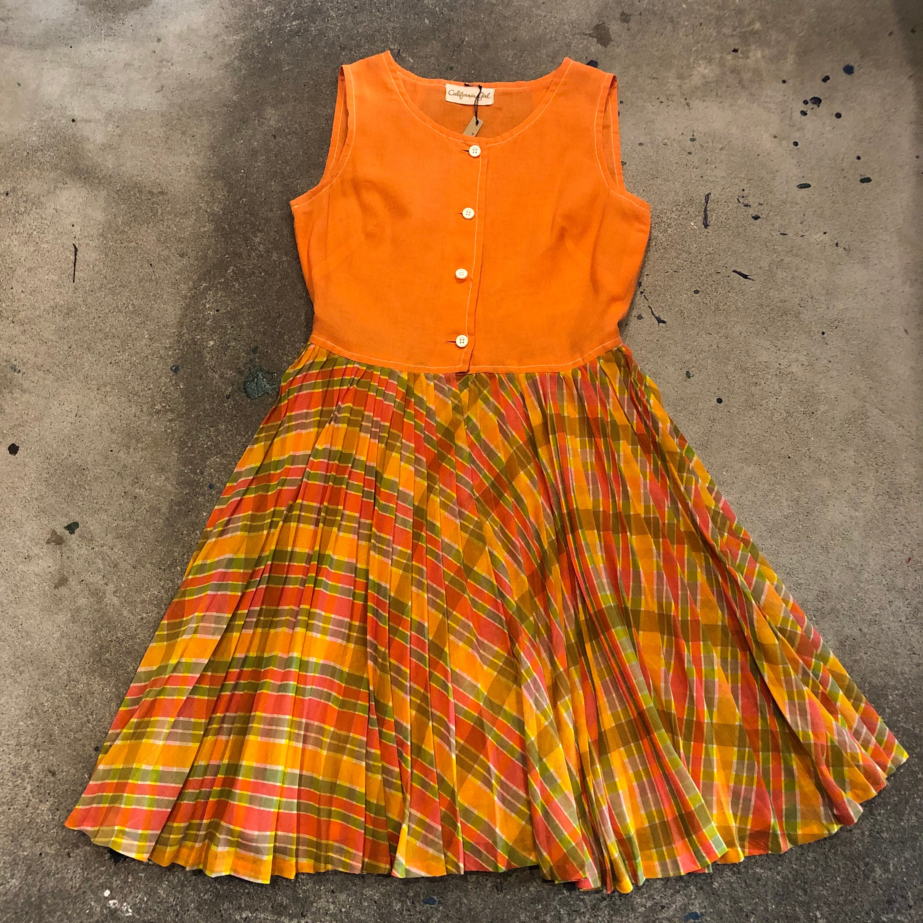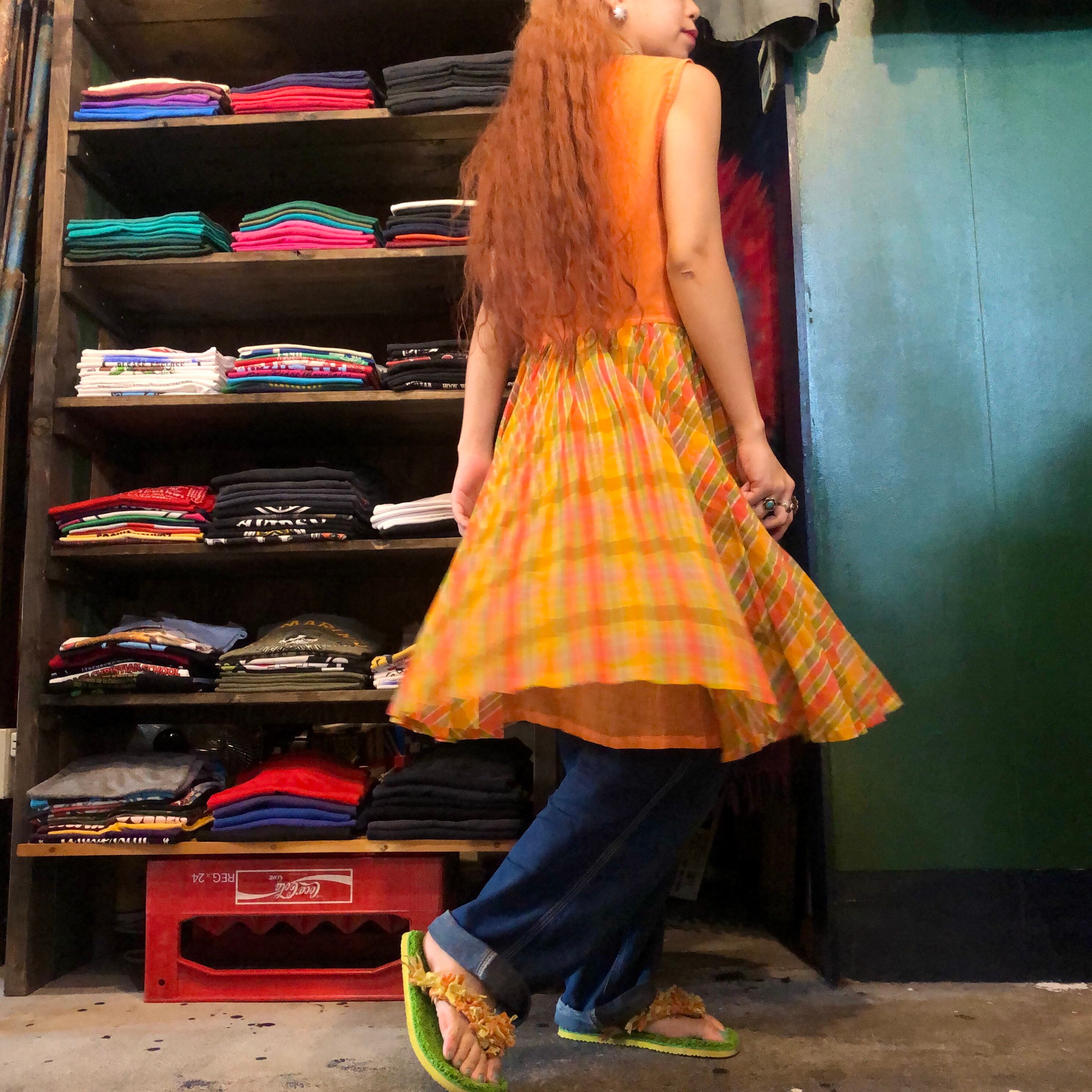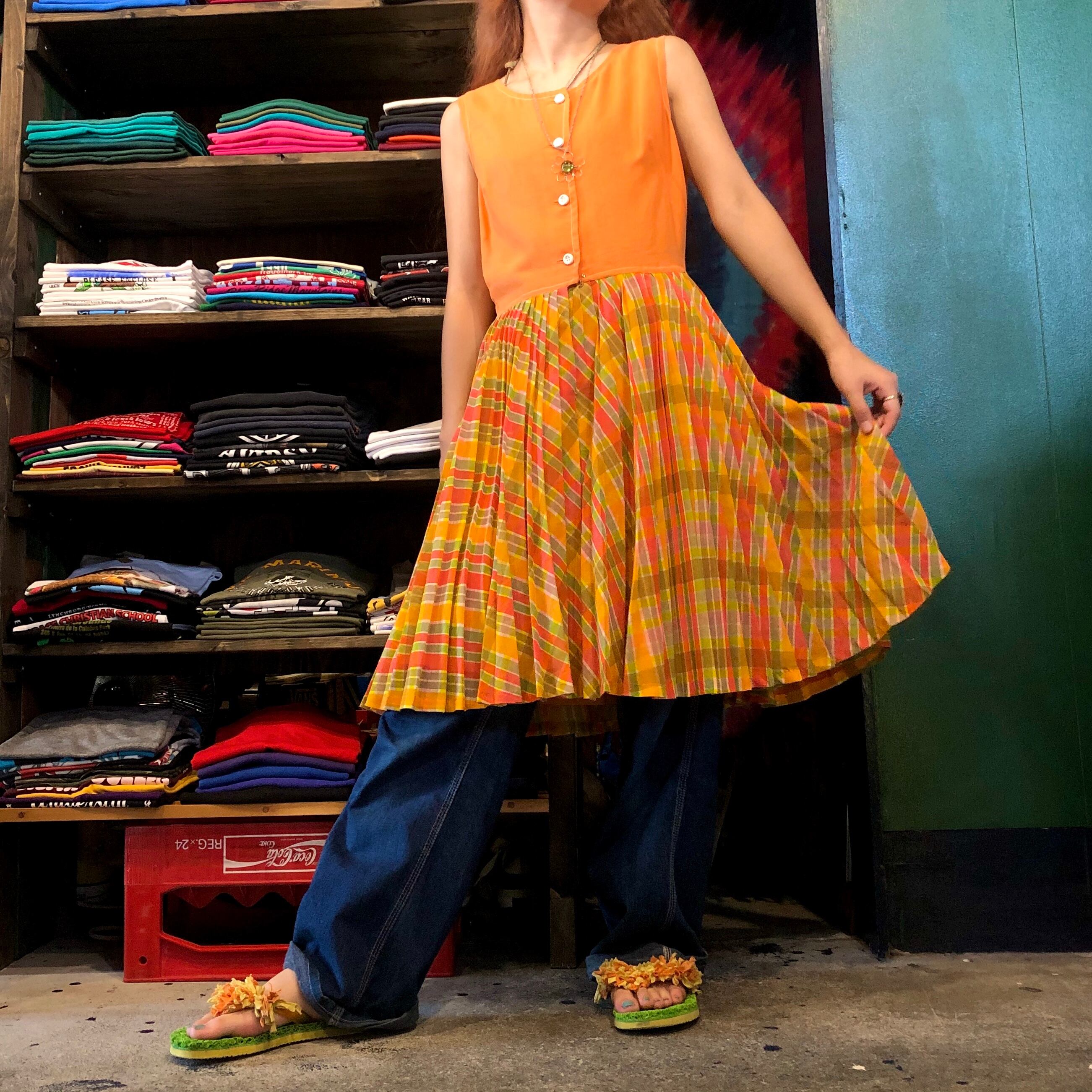 オレンジ×チェックが夏っぽくてかわいいです。プリーツスカート部分はサーキュラーになっておりボリューム感もトキメキます。