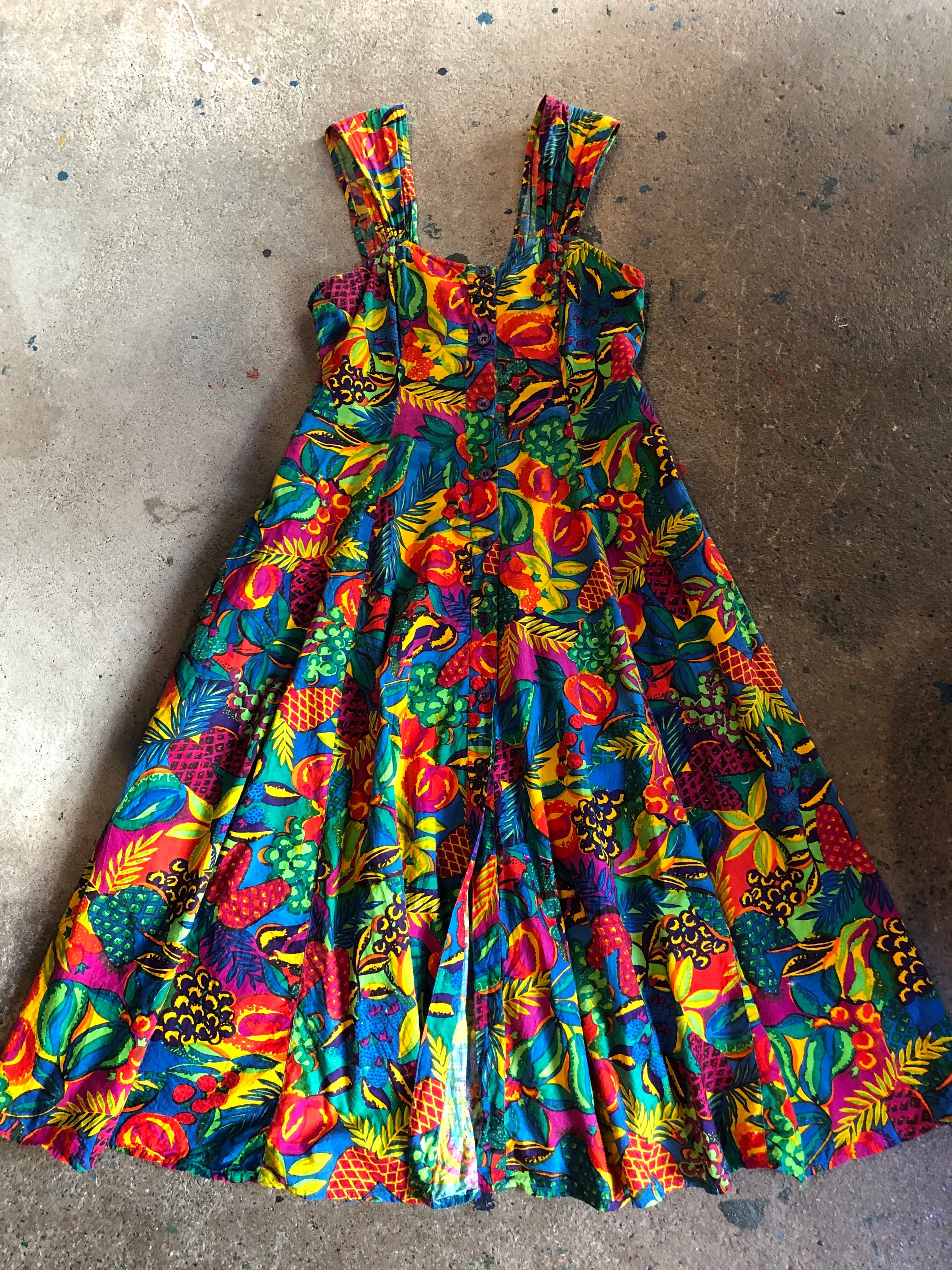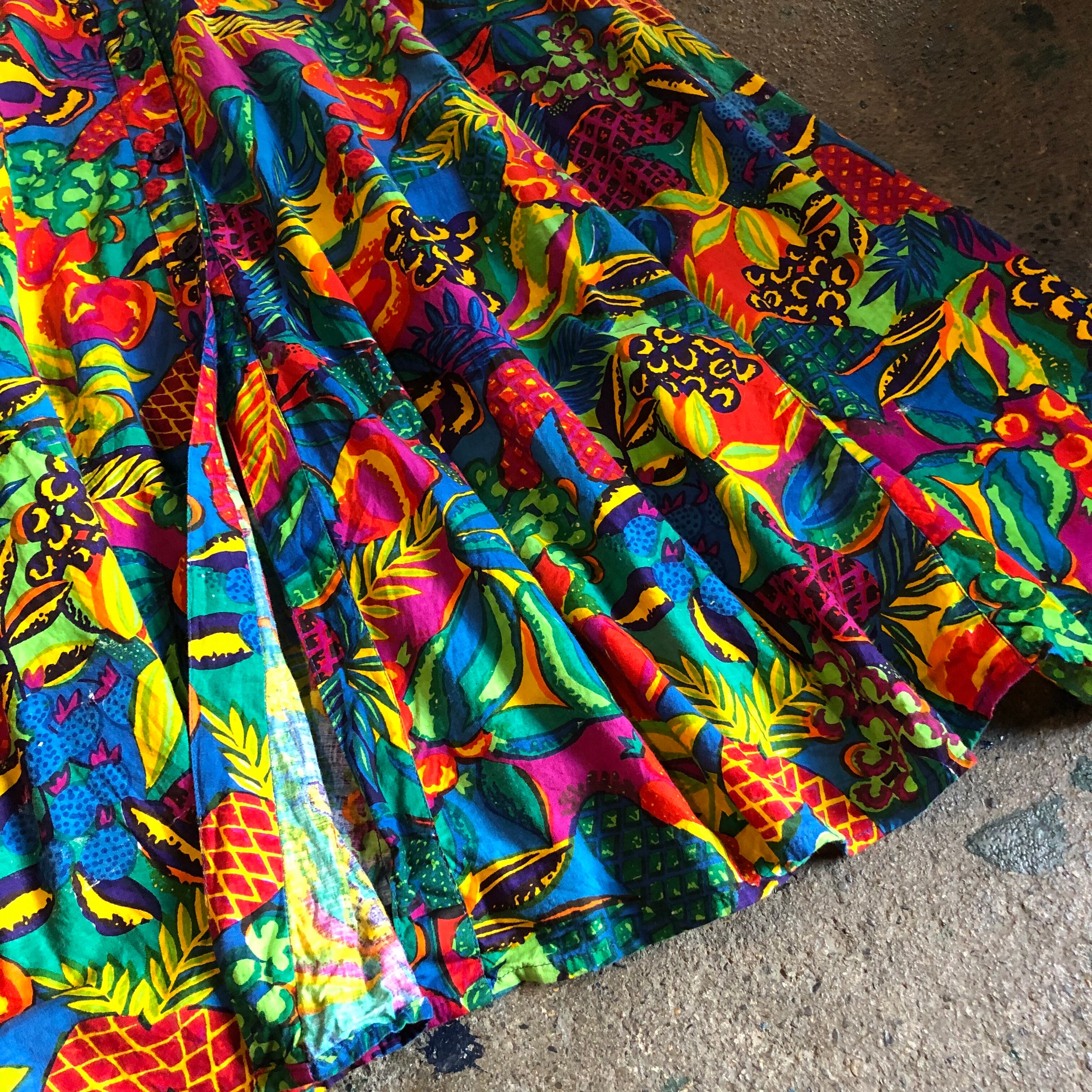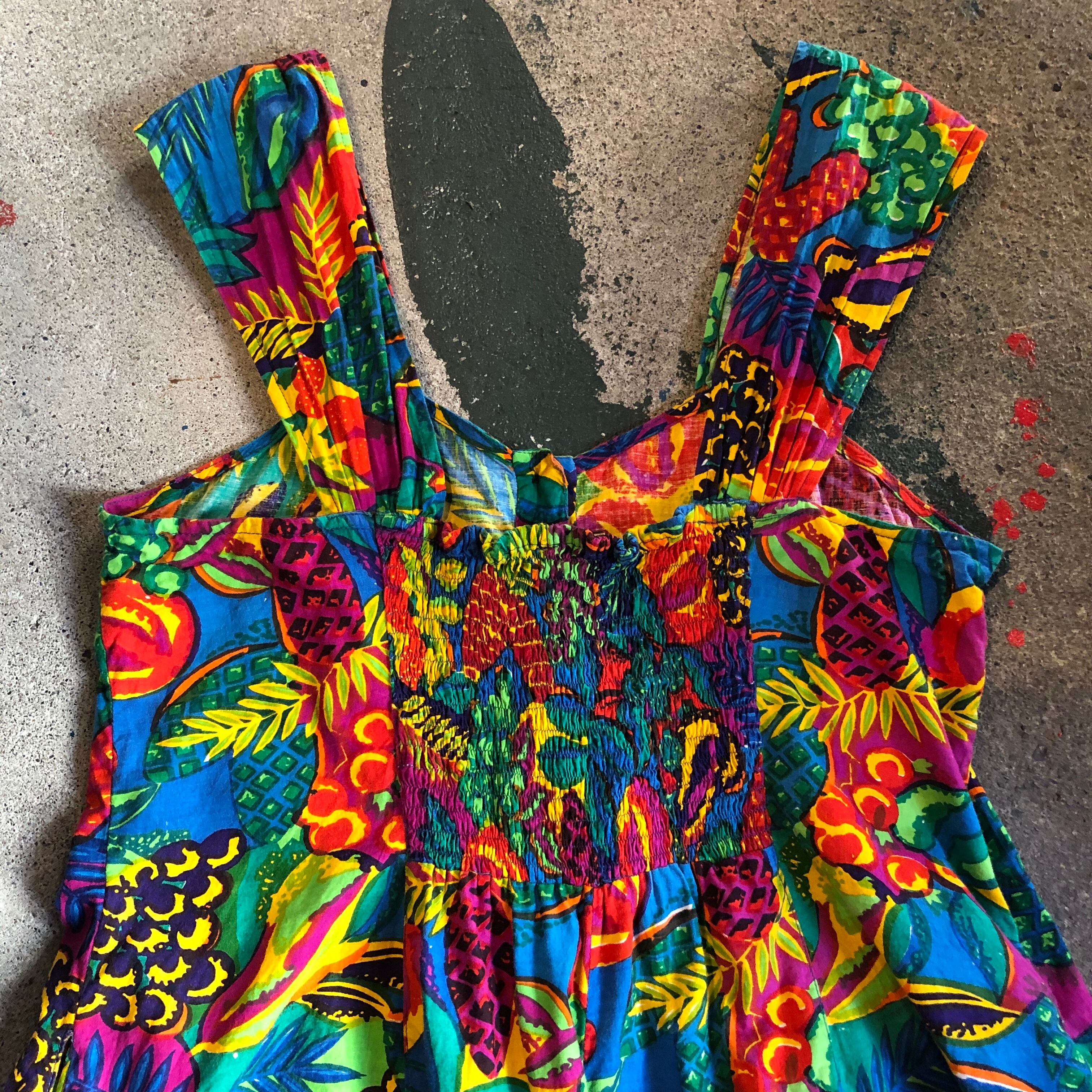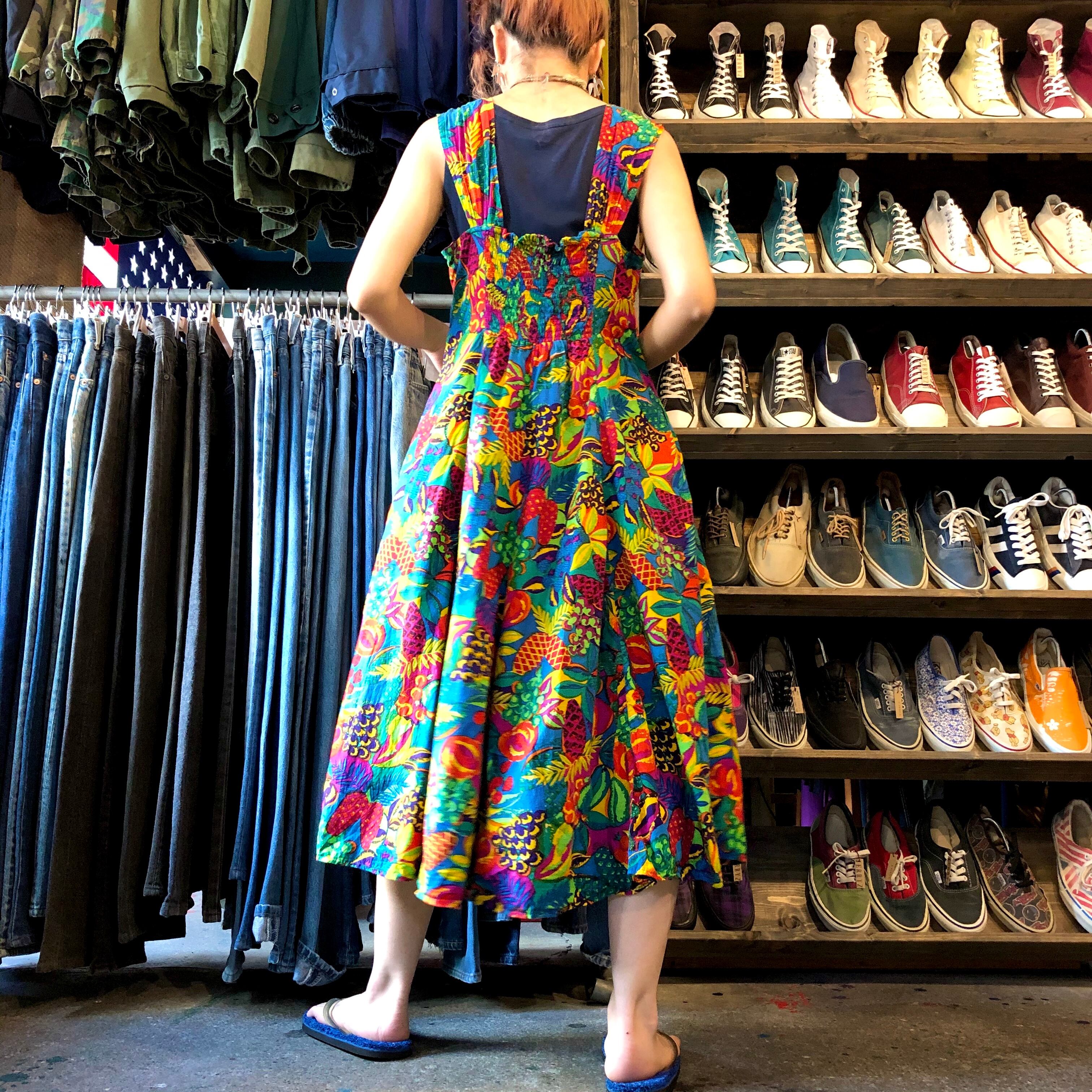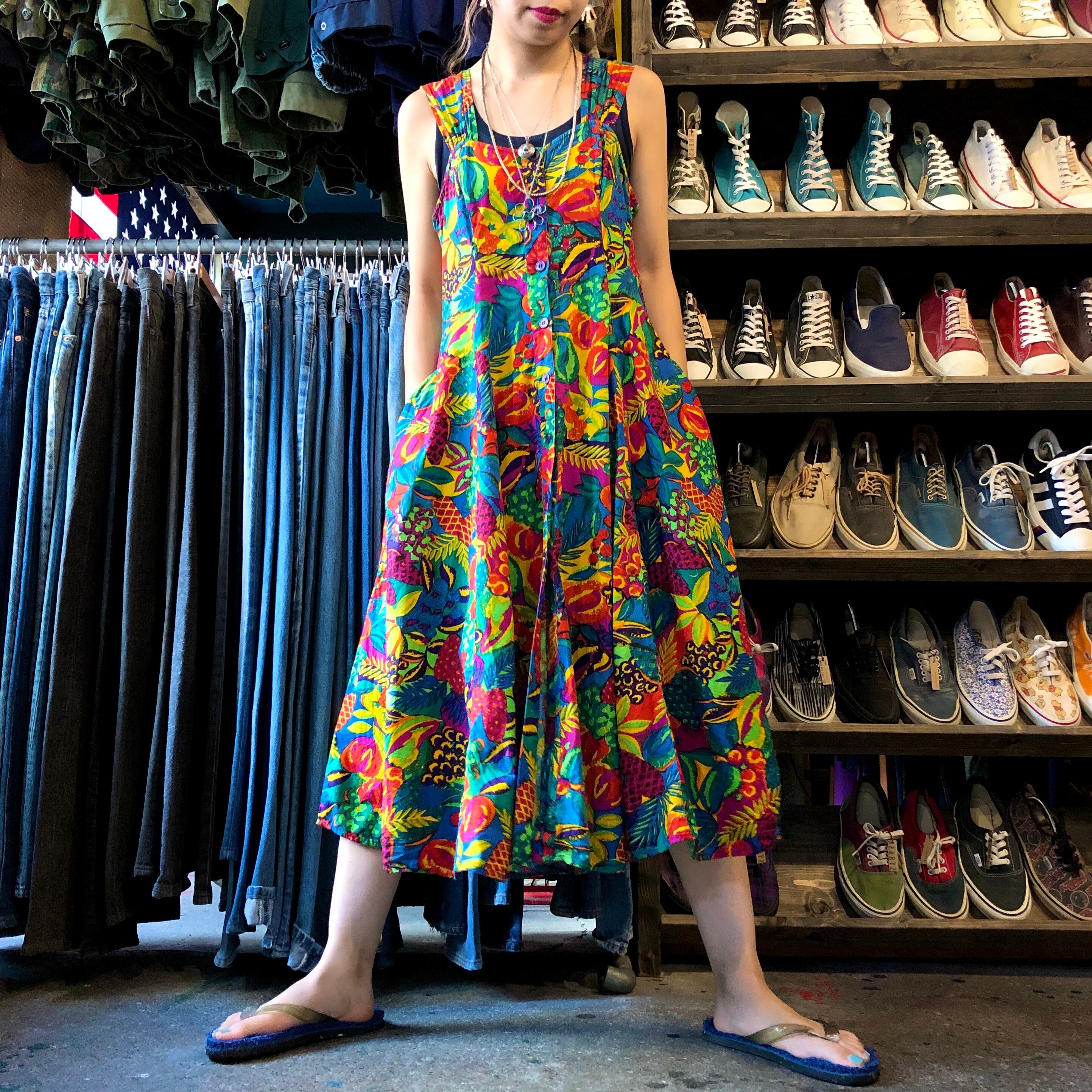 色鮮やかなフルーツの柄がとってもハッピーなワンピースです。夏はぜひタンクトップやキャミソールで肌を出して着るのがかわいいですが、肌寒くなってきたら真っ赤なインナーやカラフルなアイテムを重ねて派手派手に着るのもかわいいと思います。