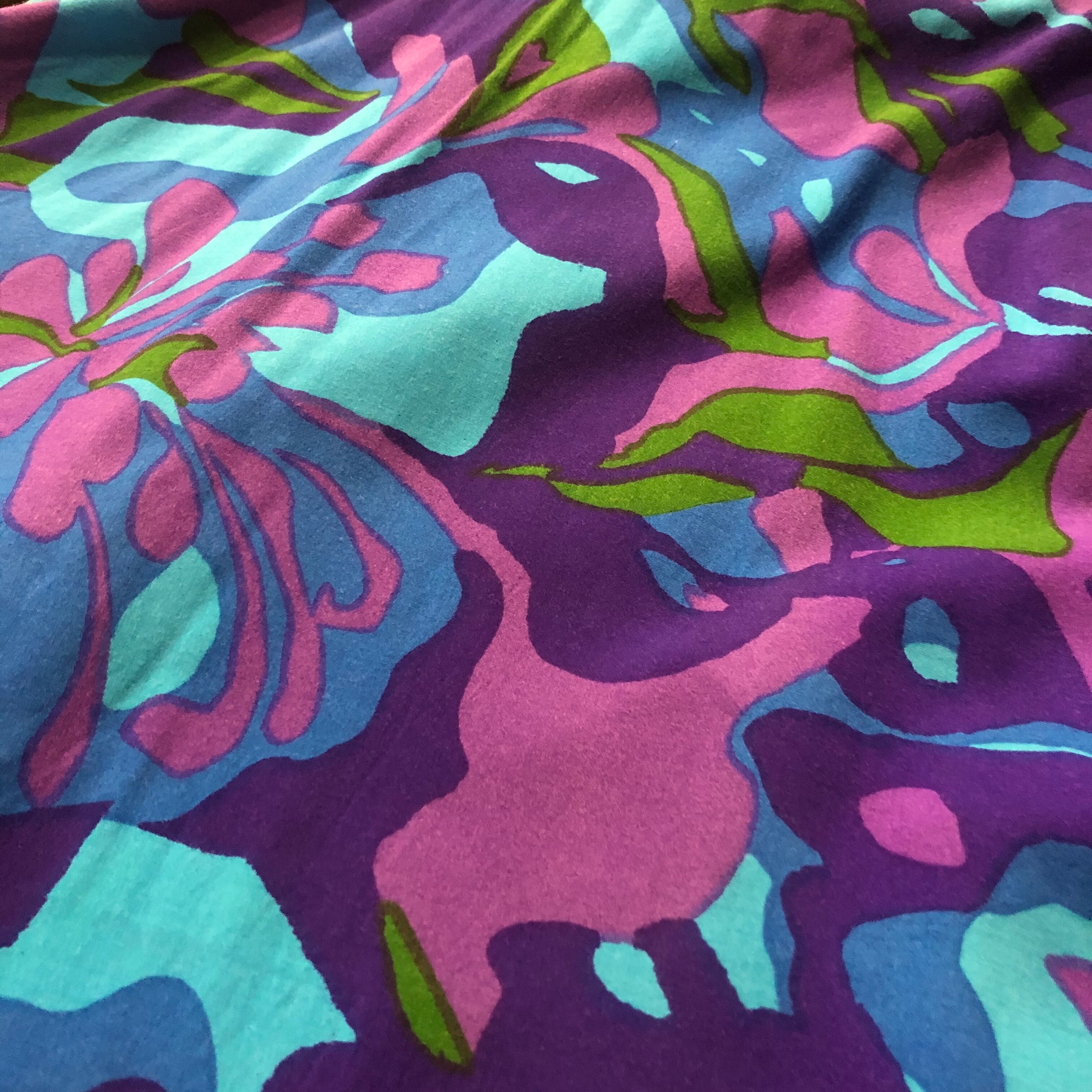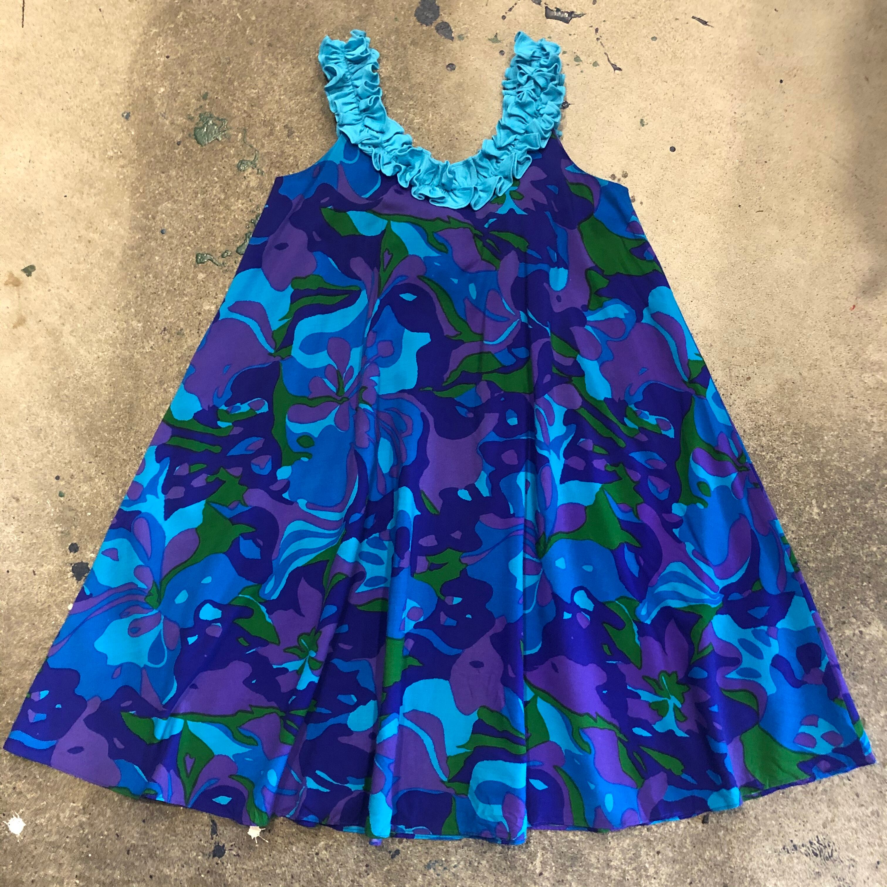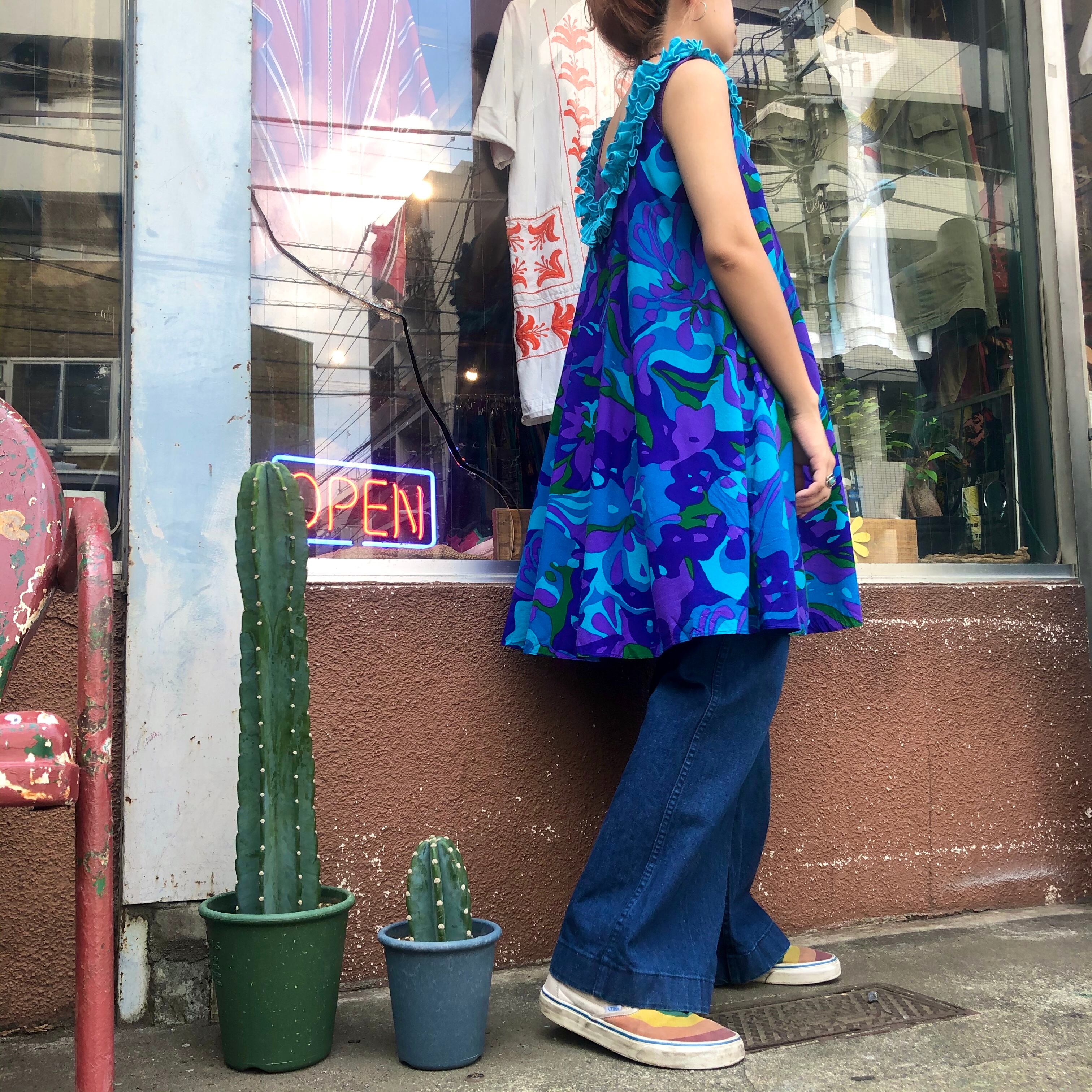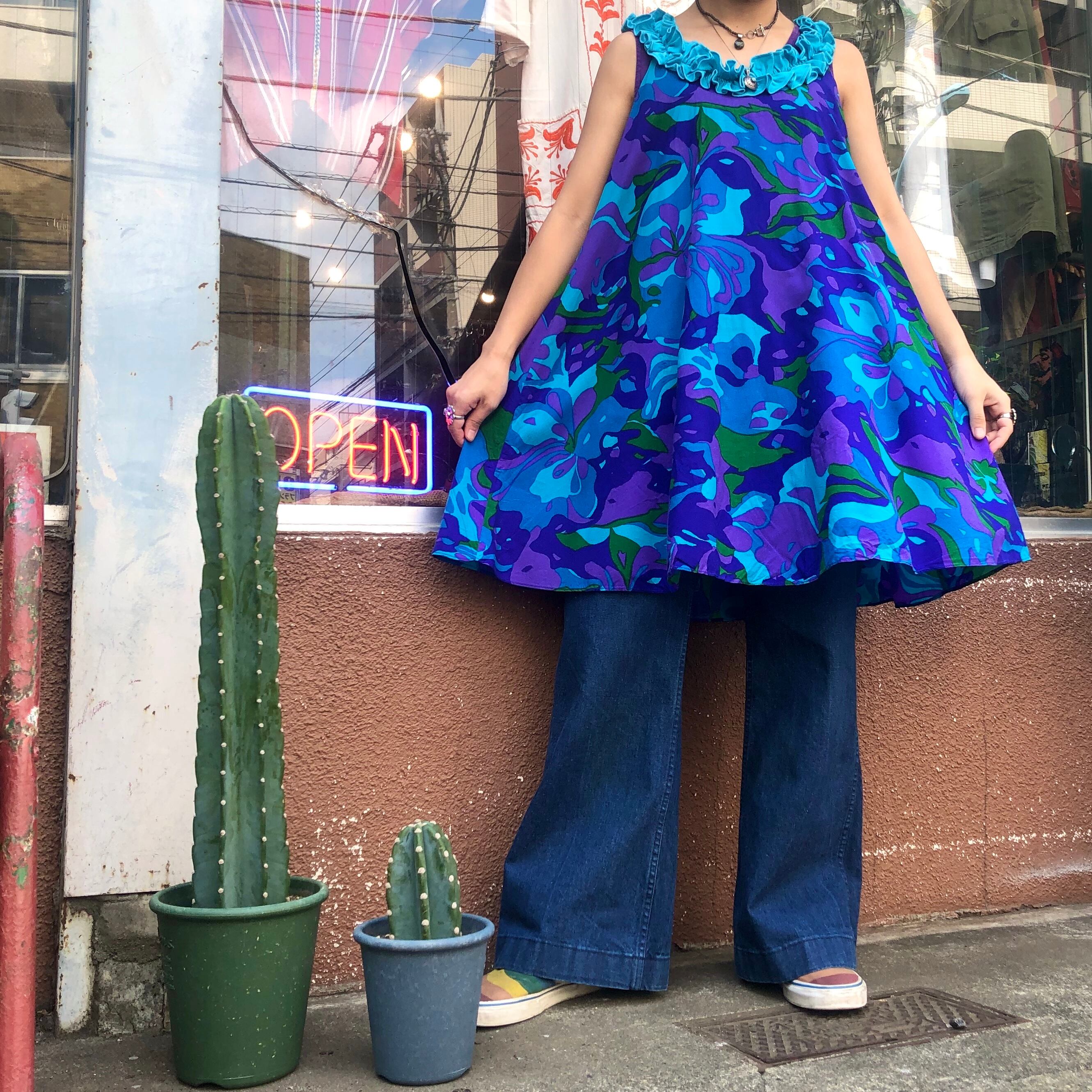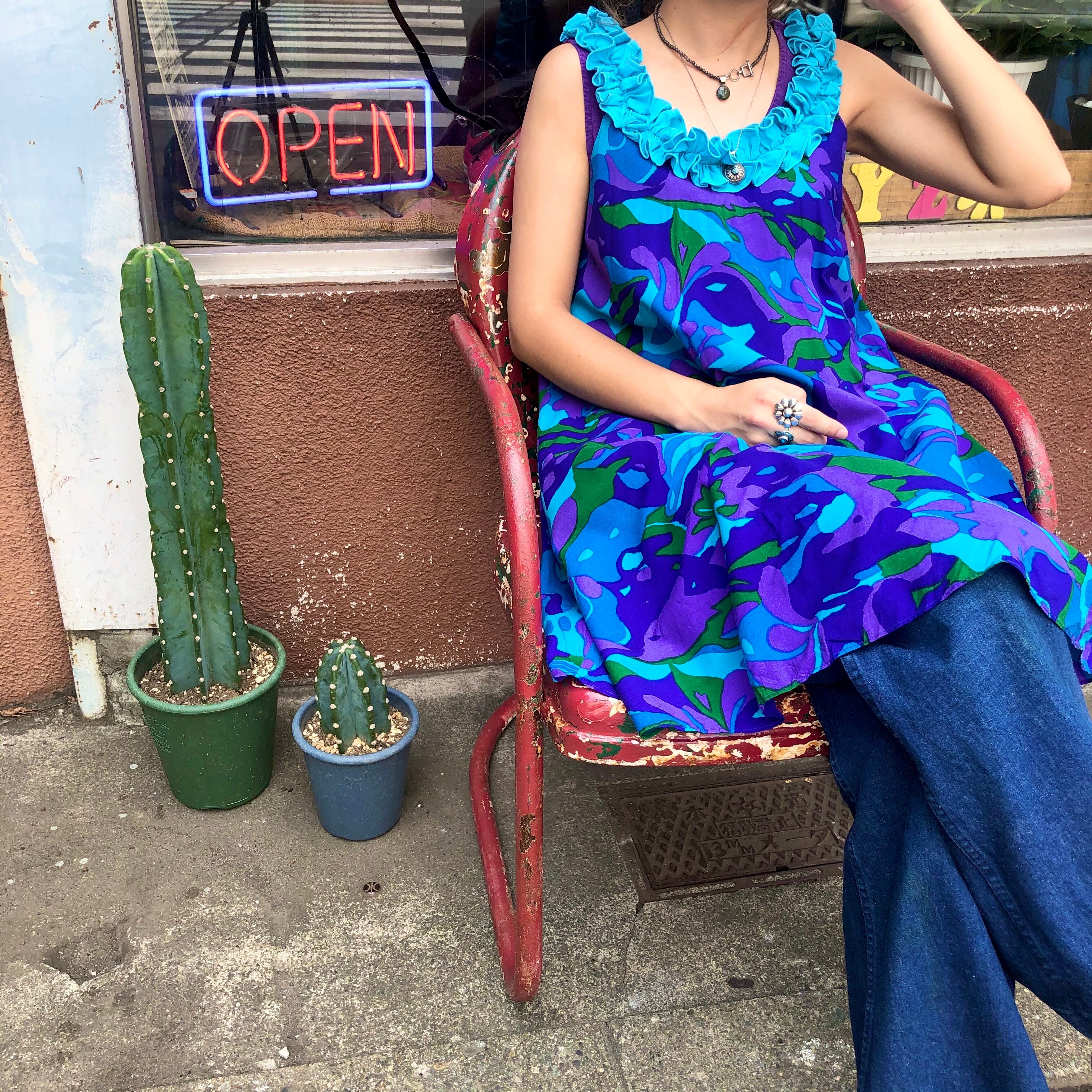 肩紐のフリルがとってもかわいいワンピースです。サイケデリックな花柄が良いですね!