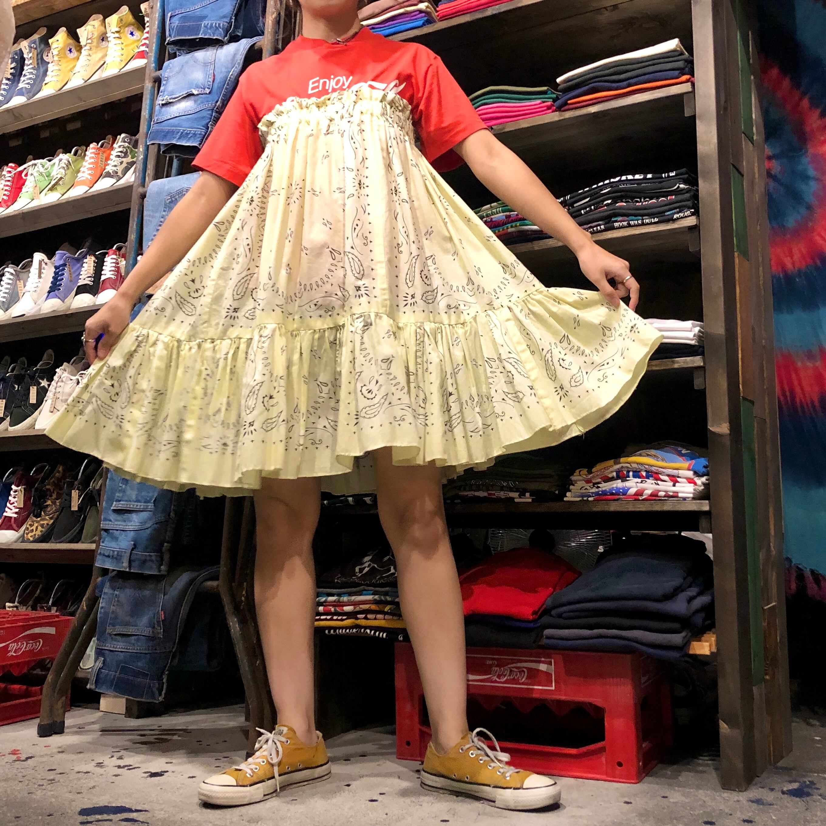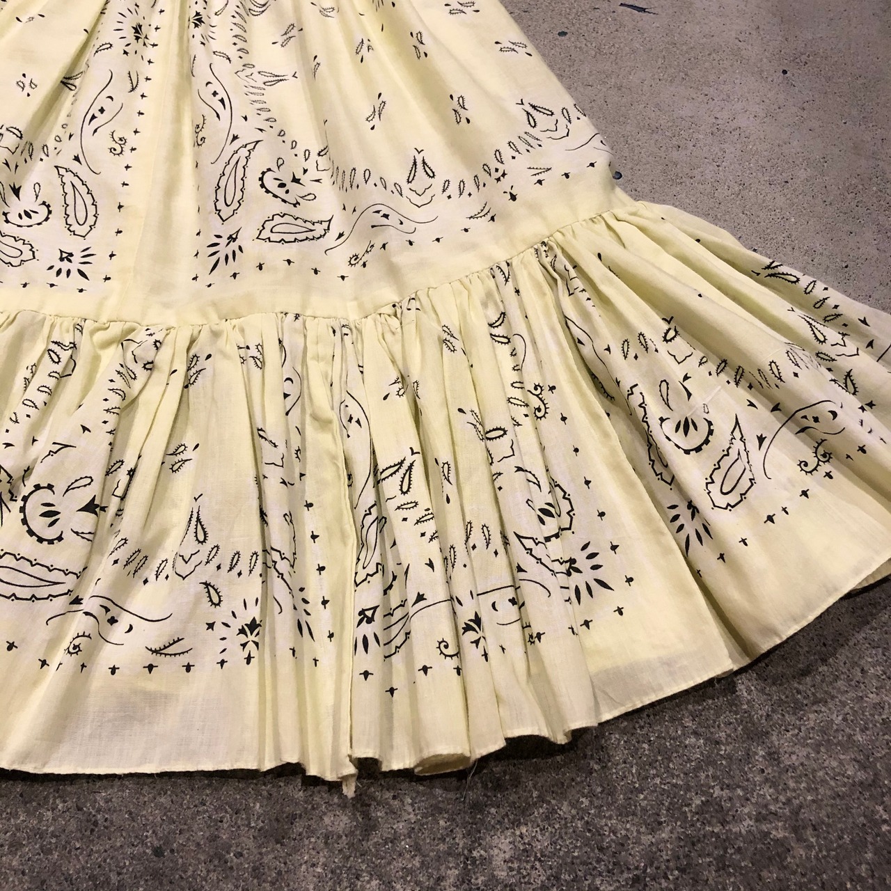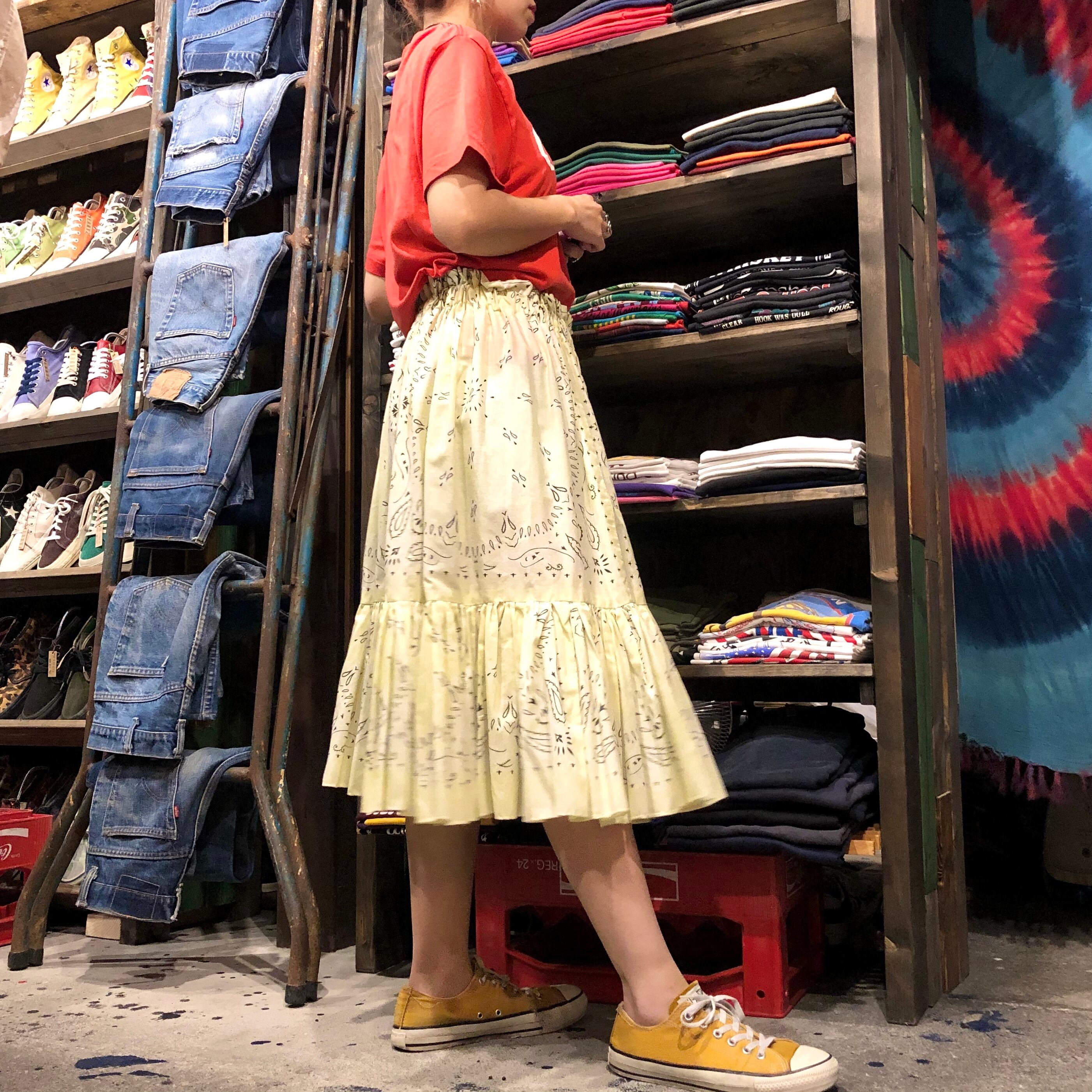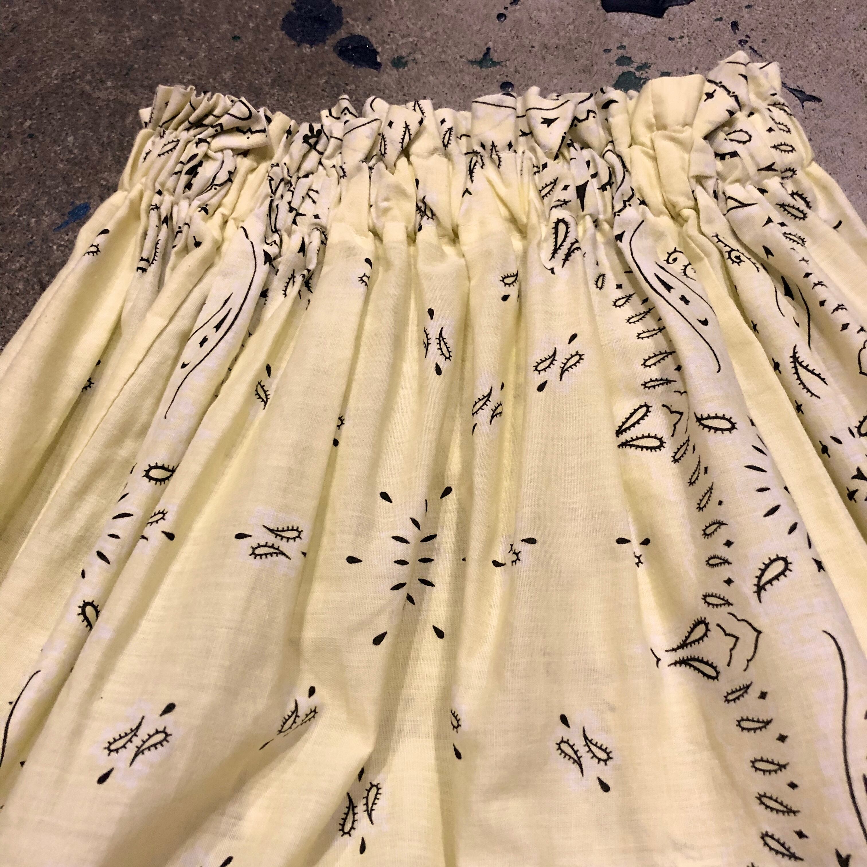バンダナをたくさん使ってハンドメイドでリメイクされたと思われるスカートです。ボリュームがあってかわいいです。薄いクリームイエローが合わせやすく、季節を選ばず着ていただけると思います。