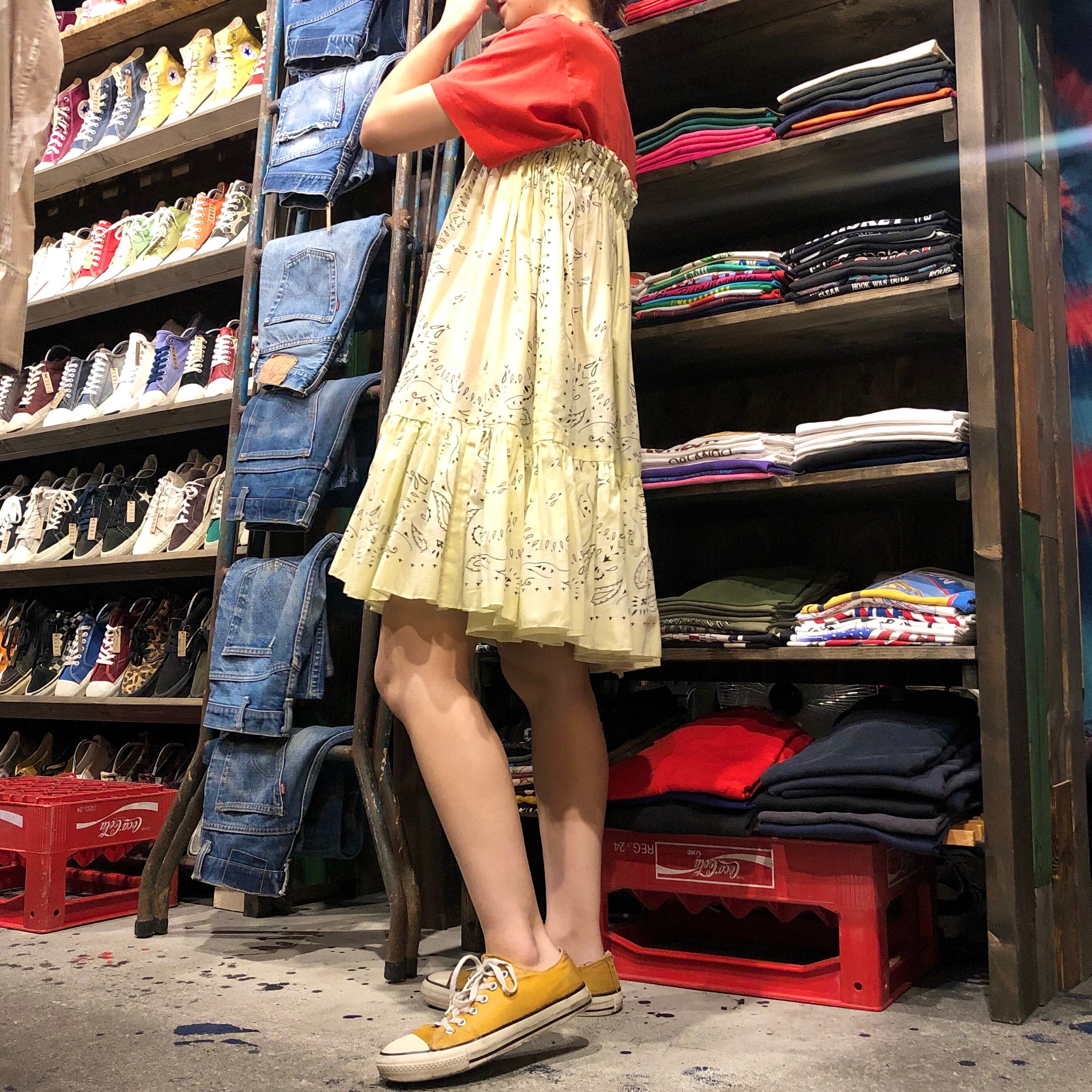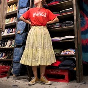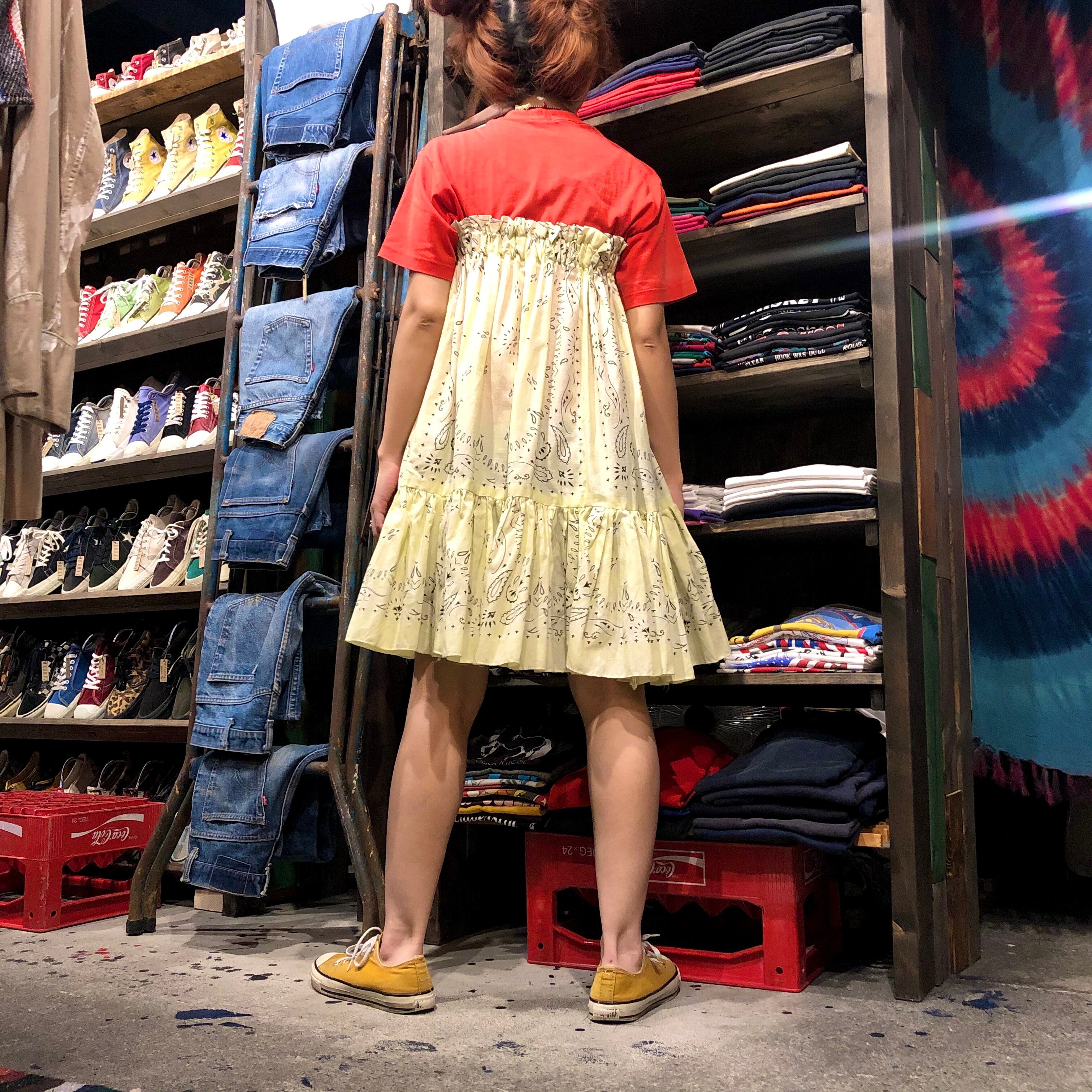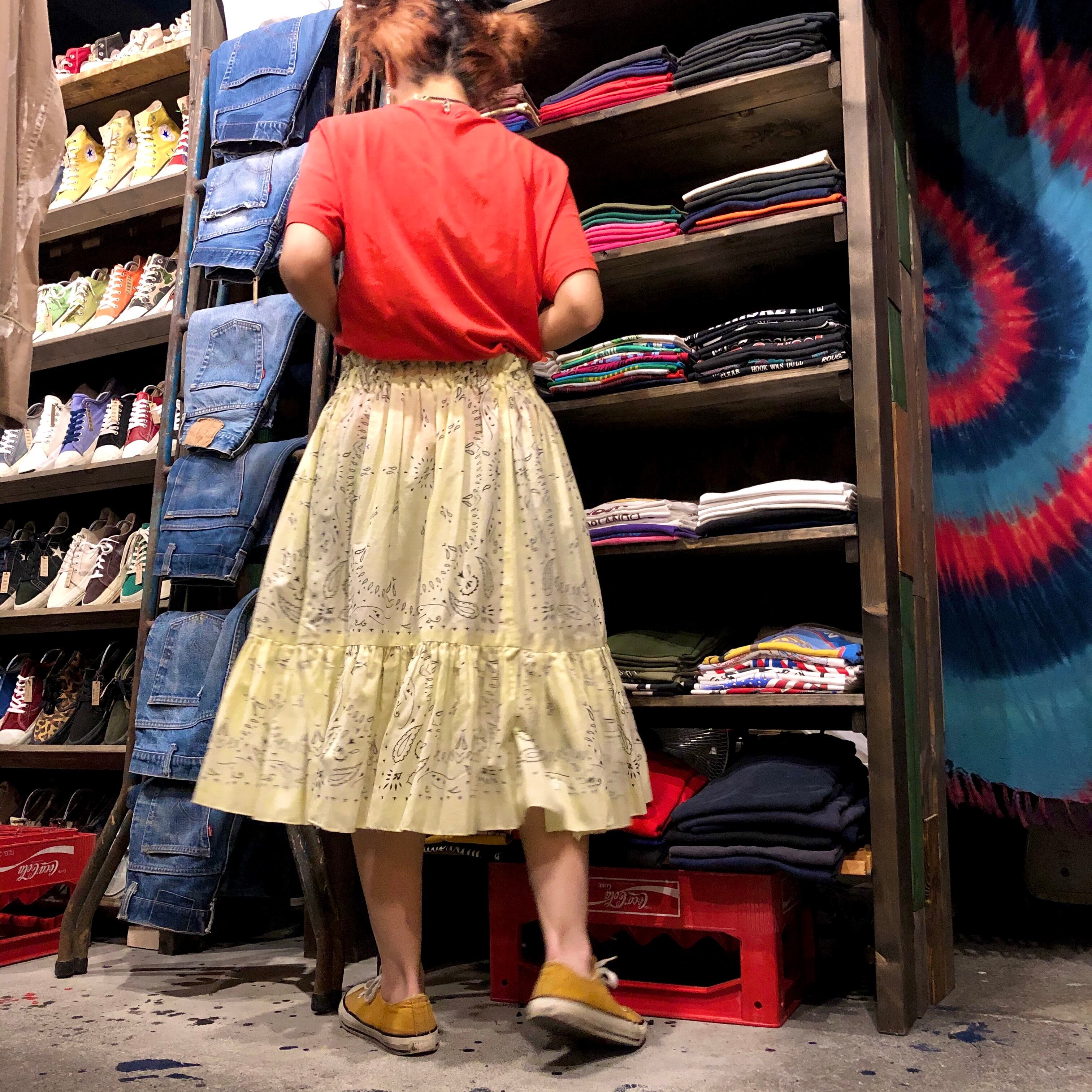バンダナをたくさん使ってハンドメイドでリメイクされたと思われるスカートです。ボリュームがあってかわいいです。薄いクリームイエローが合わせやすく、季節を選ばず着ていただけると思います。