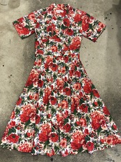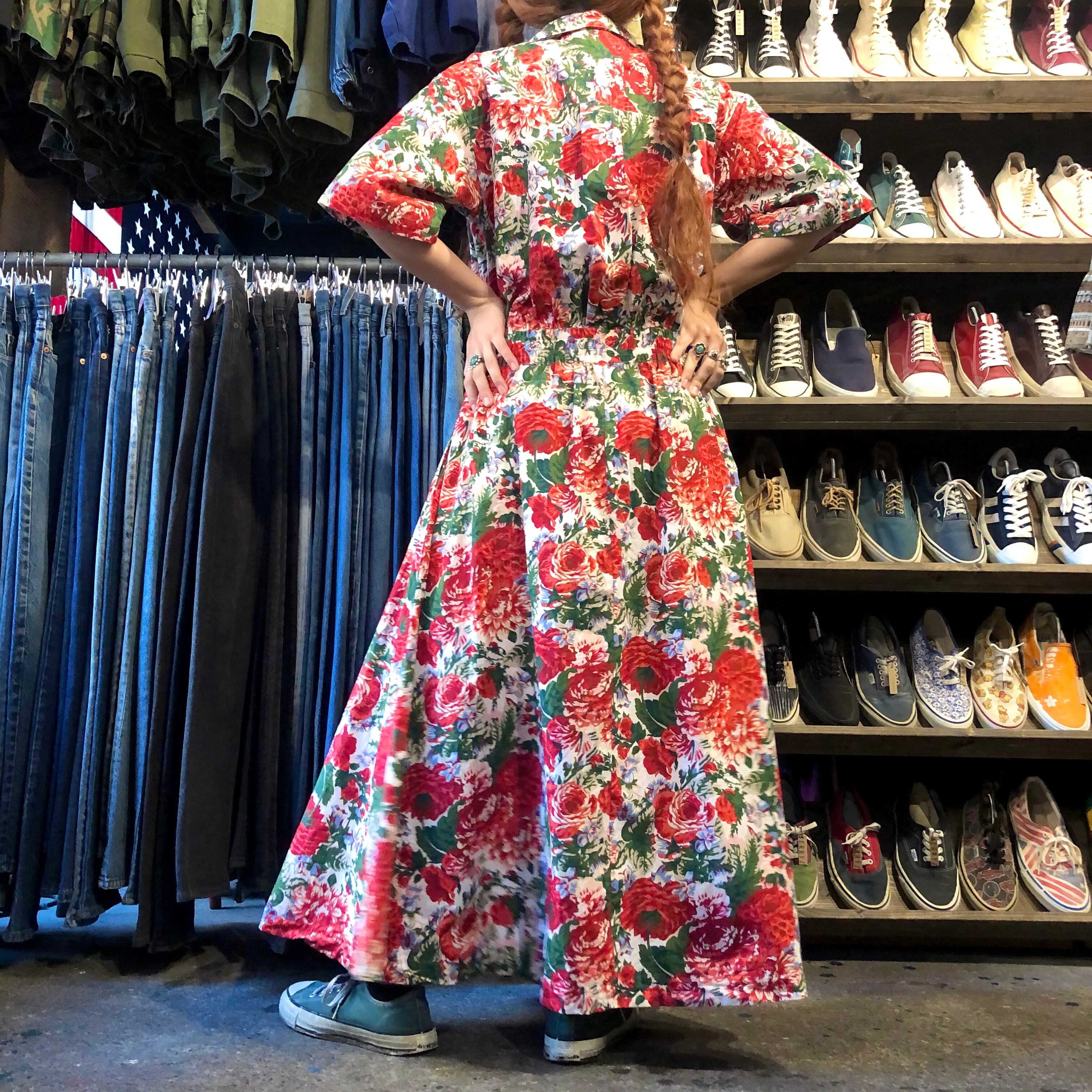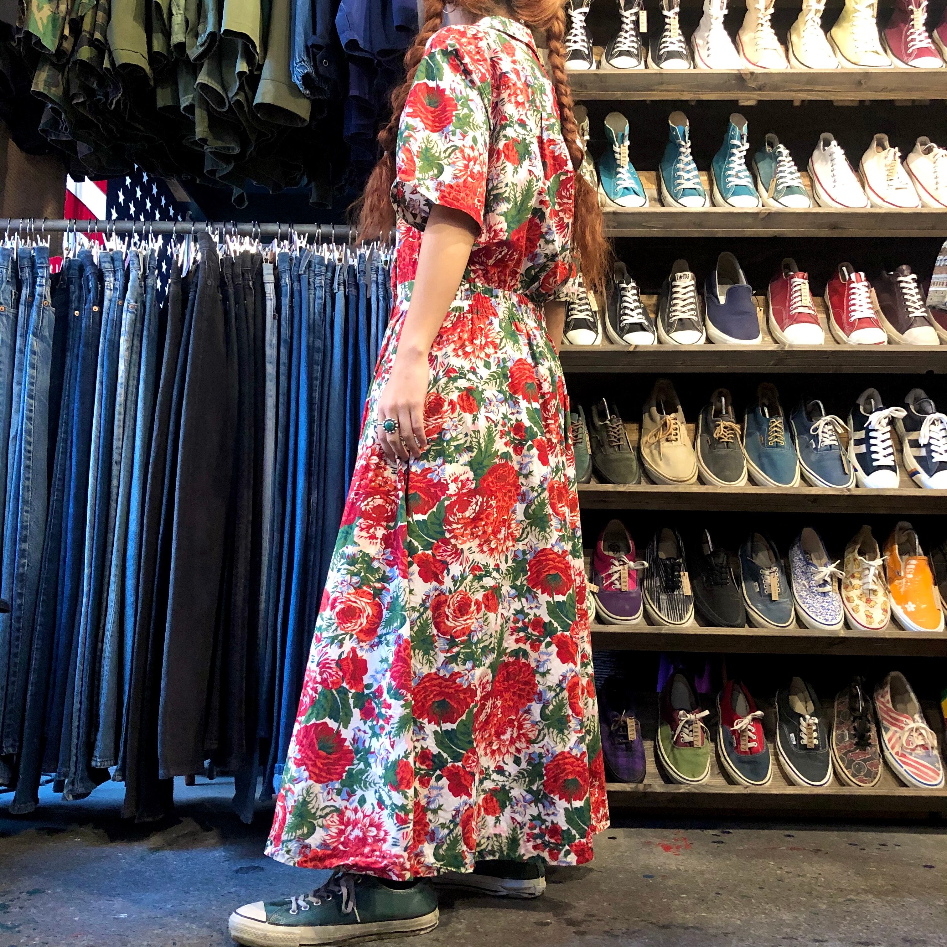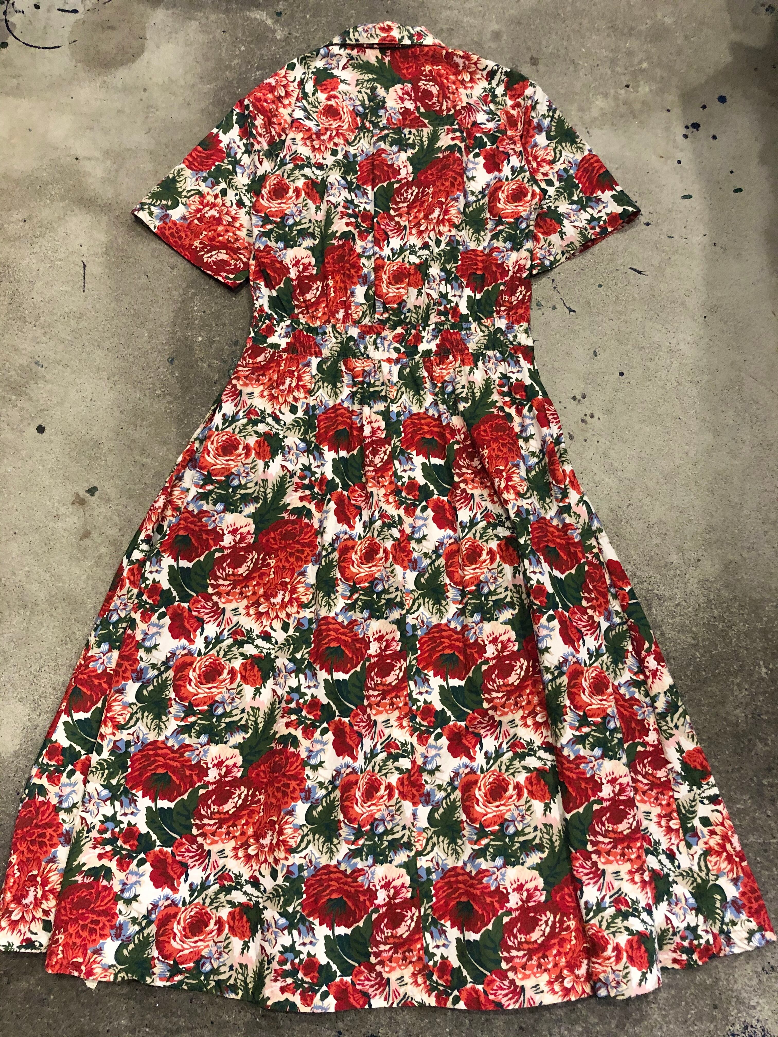 白地を埋め尽くす赤い花柄が素敵なワンピースです。前がカシュクールのような合わせのデザインになっており、背筋が伸びるような雰囲気です。