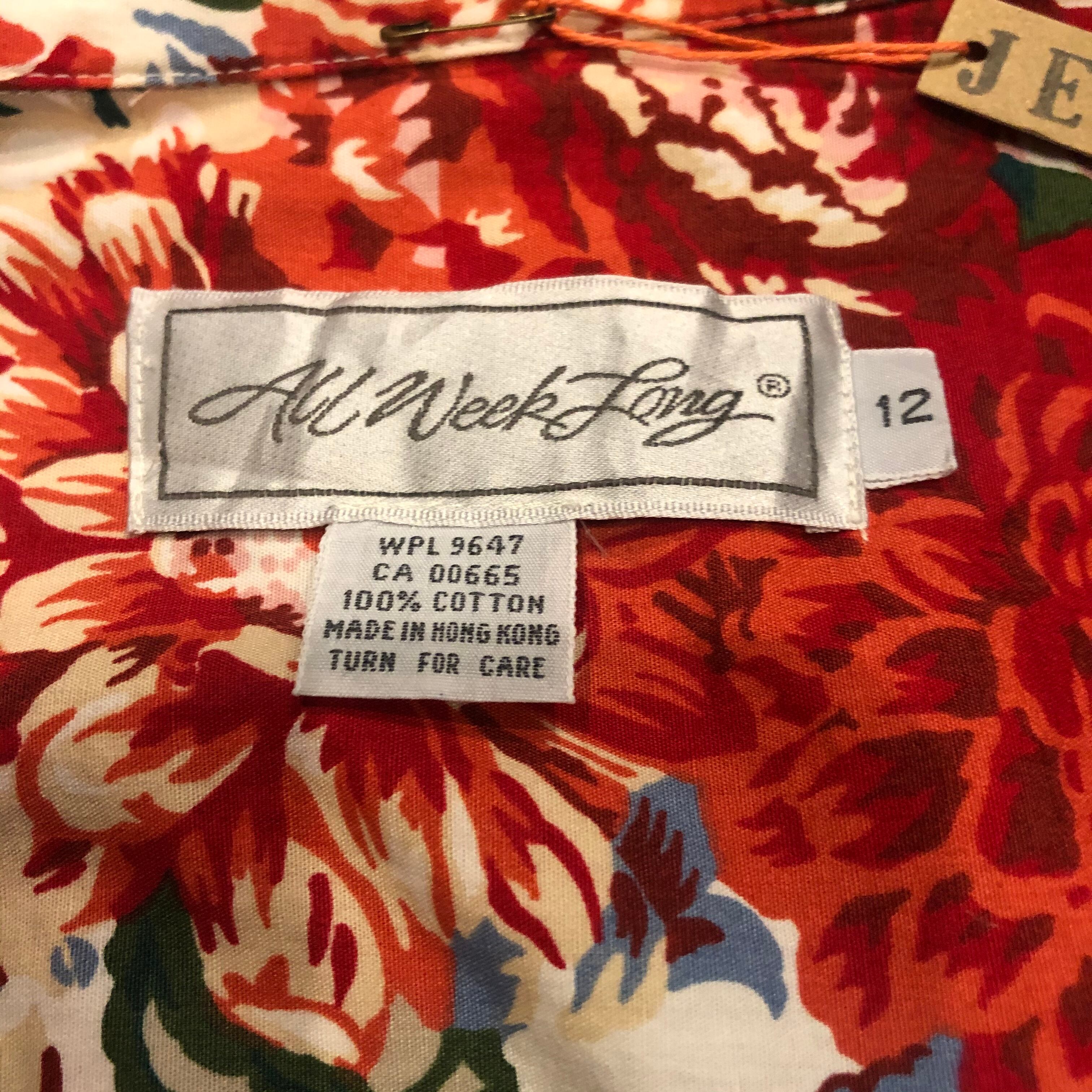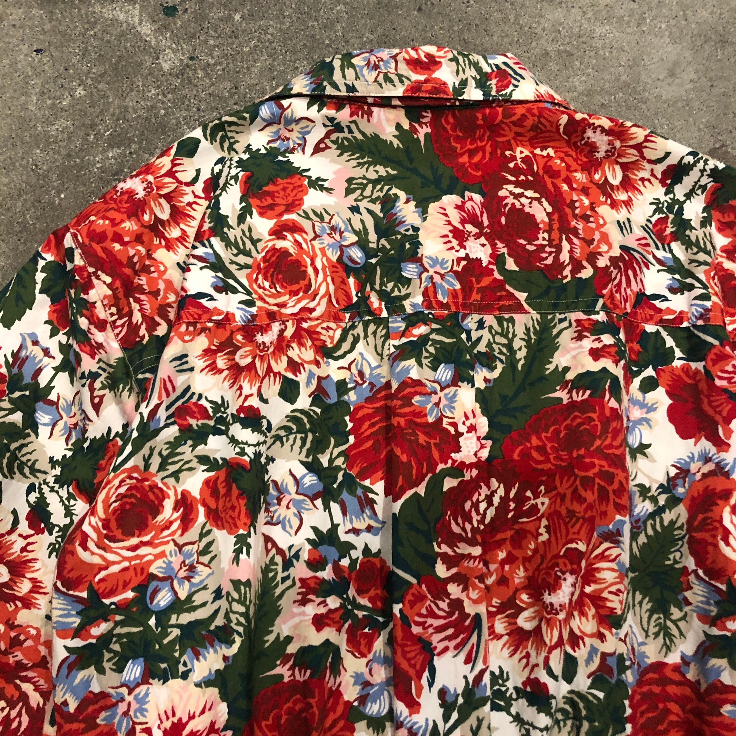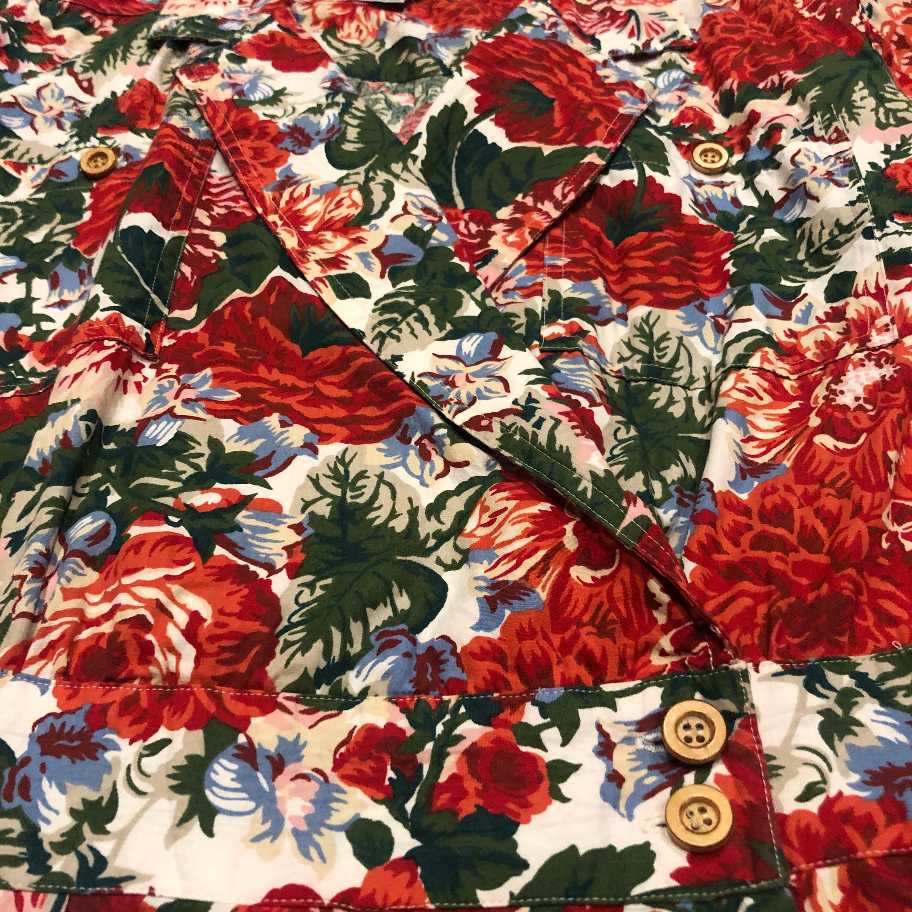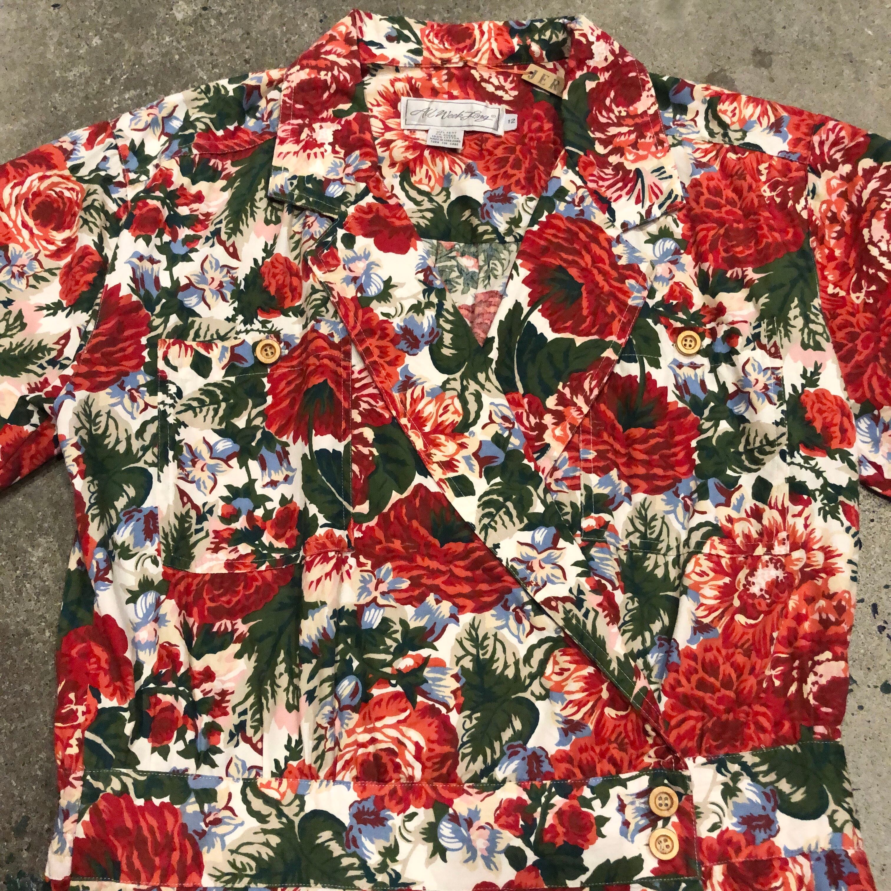 白地を埋め尽くす赤い花柄が素敵なワンピースです。前がカシュクールのような合わせのデザインになっており、背筋が伸びるような雰囲気です。